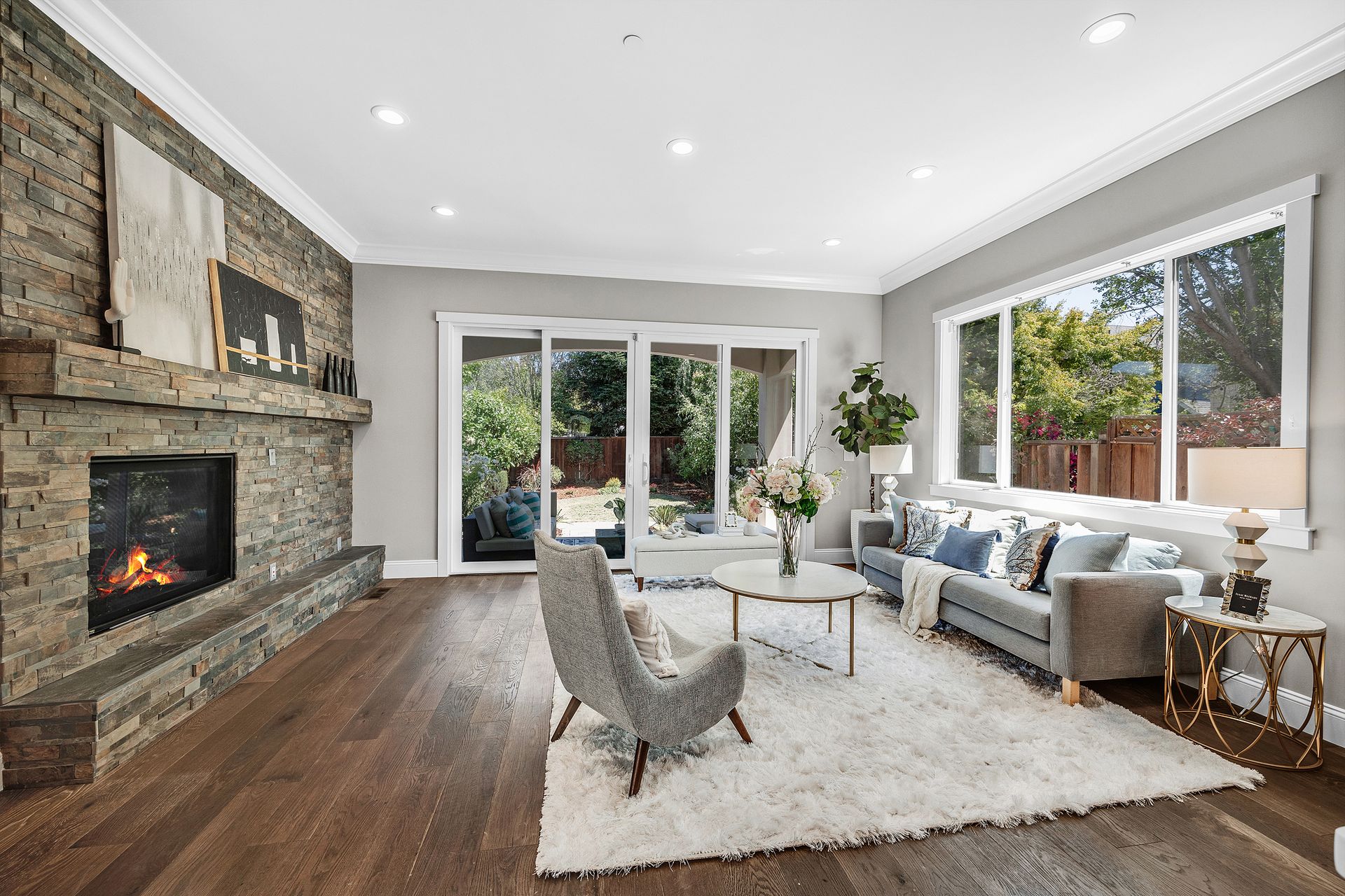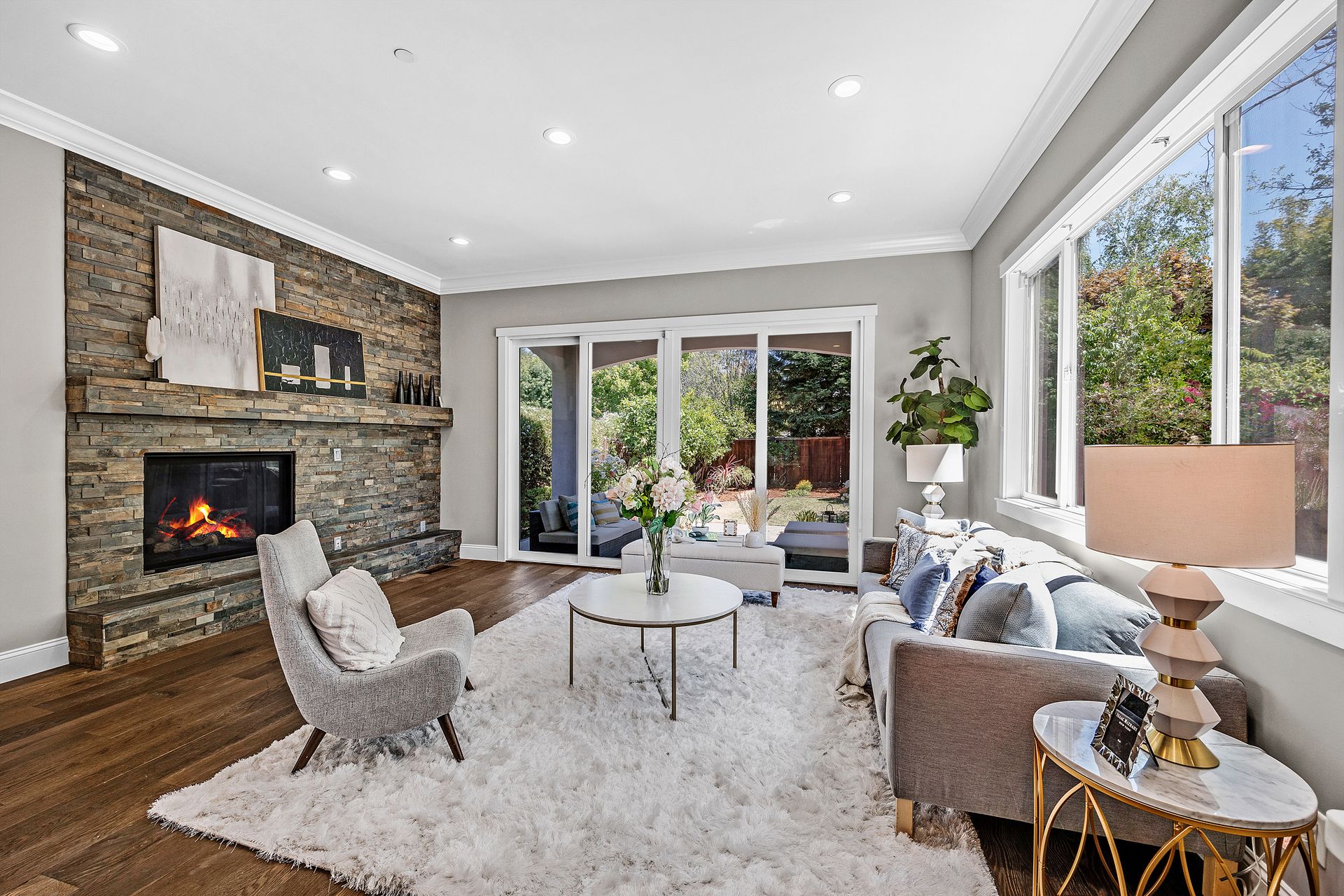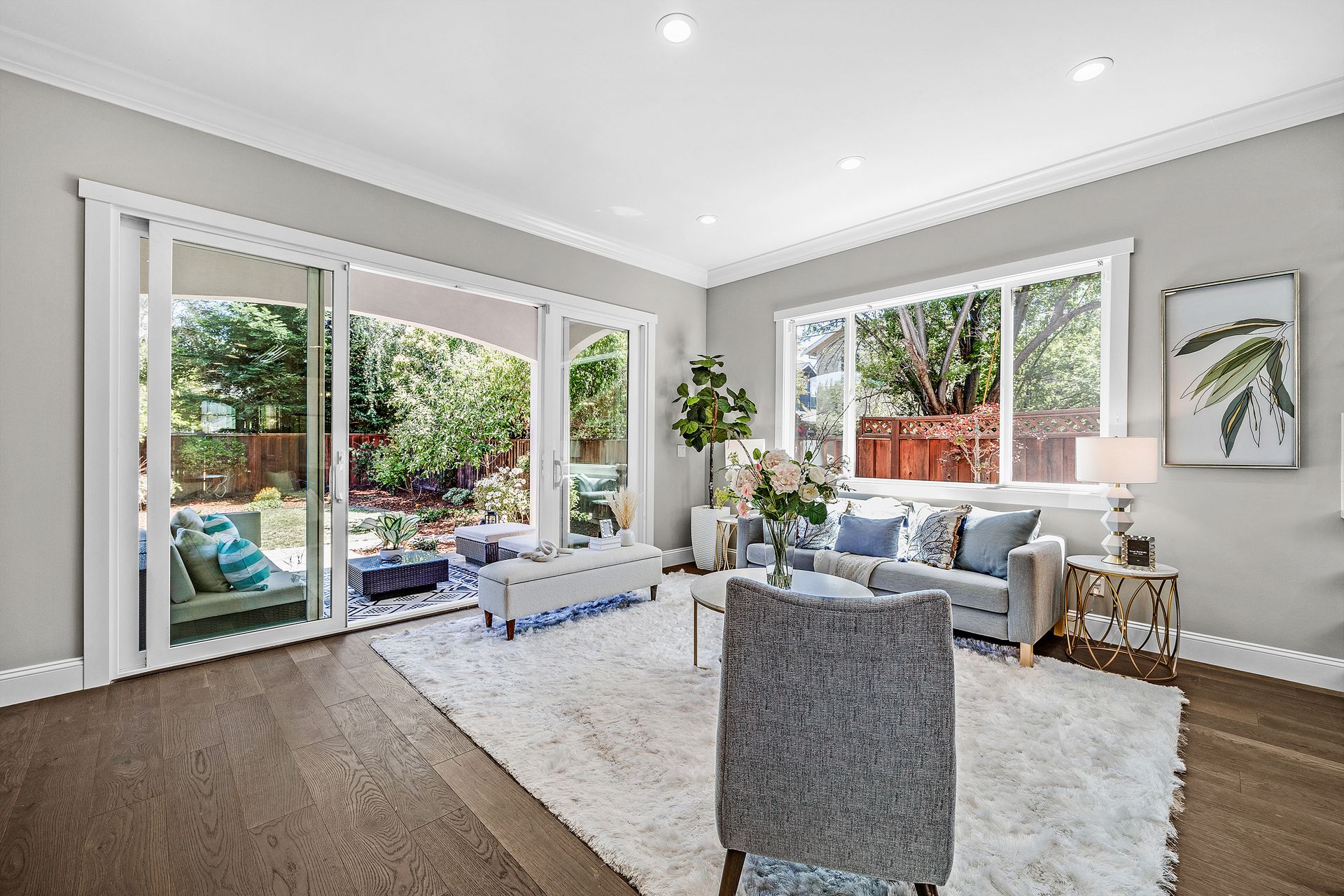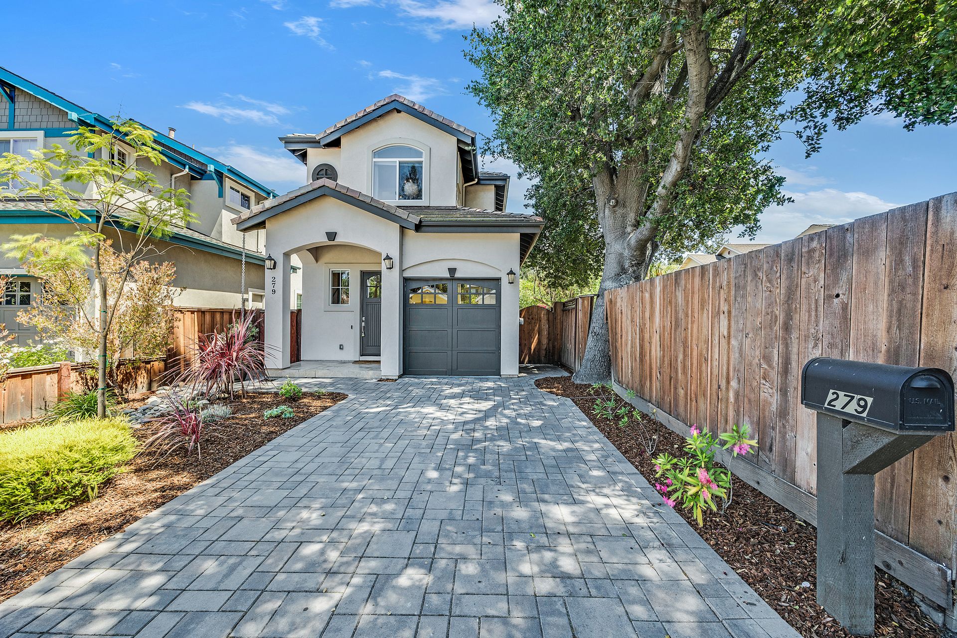 Welcome to this refined and stylish six-year newly constructed home in a prime Mountain View location. Mature oak trees greet you alongside a fresh paver driveway with wrap-around pathways to the rear of the home. The lower level includes a conveniently located one-half bath, beautiful wide-plank oak flooring with high ceilings, crown molding and designer lighting. The open concept kitchen boasts a quartz island with seating, stainless steel appliances, high-end cabinetry and a dining area with a bay window. Enjoy seamless indoor-outdoor living with an expansive double pane slider that takes you out into the private rear yard oasis. The home features a large California room ideal for alfresco dining and entertaining, privacy with mature landscaping and multiple fruit trees. Upstairs find a full hall bath and three well-appointed bedrooms with vaulted ceilings. The large primary bedroom overlooks the rear yard and includes an extensive walk-in closet. The tastefully updated primary bath features a sizeable, tiled step-in shower and dual sinks. This home is conveniently located to nearby downtown Mountain View, major tech employers and commute routes. Schools include the highly sought-after Los Altos High School. Come see it for yourself to experience it all!