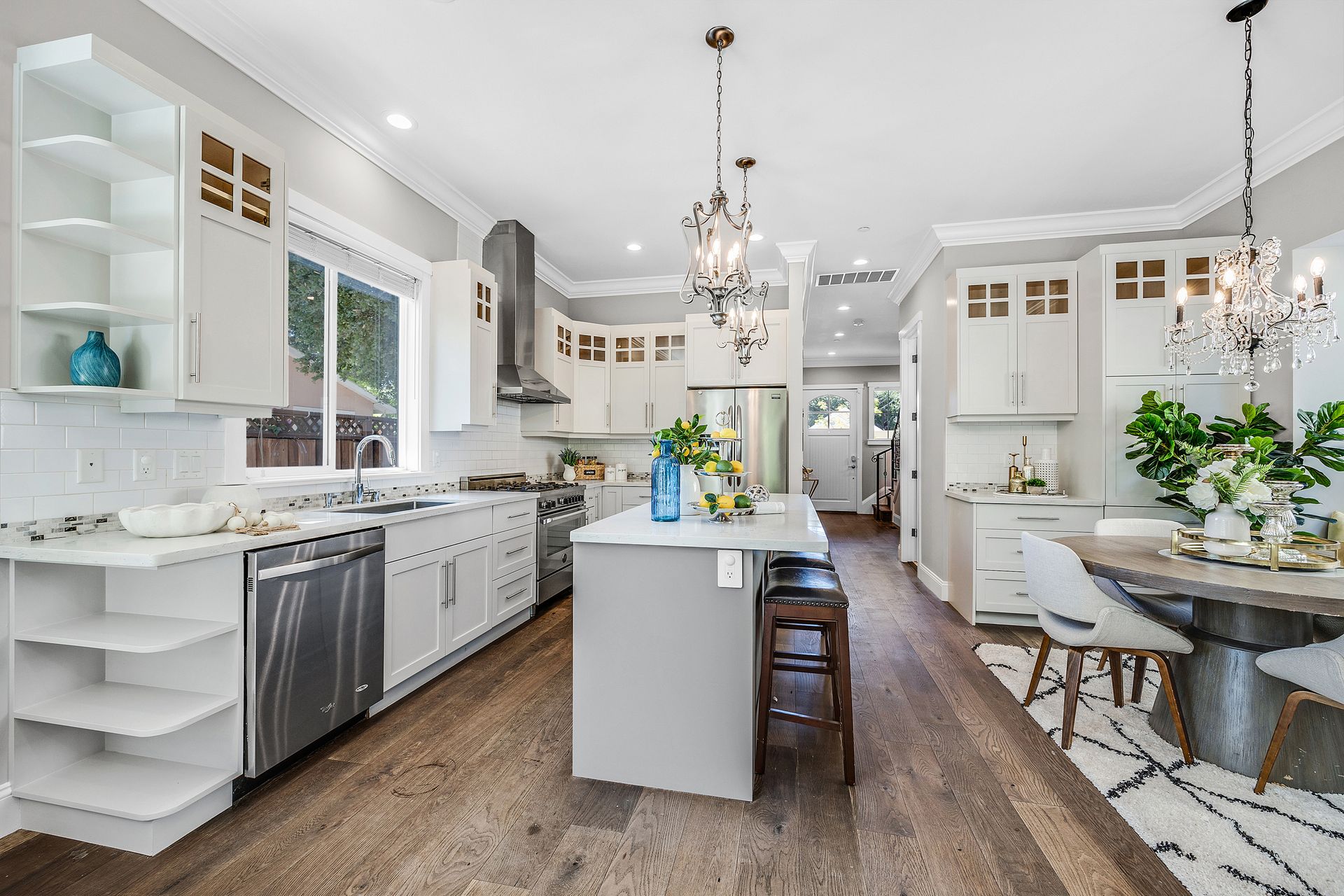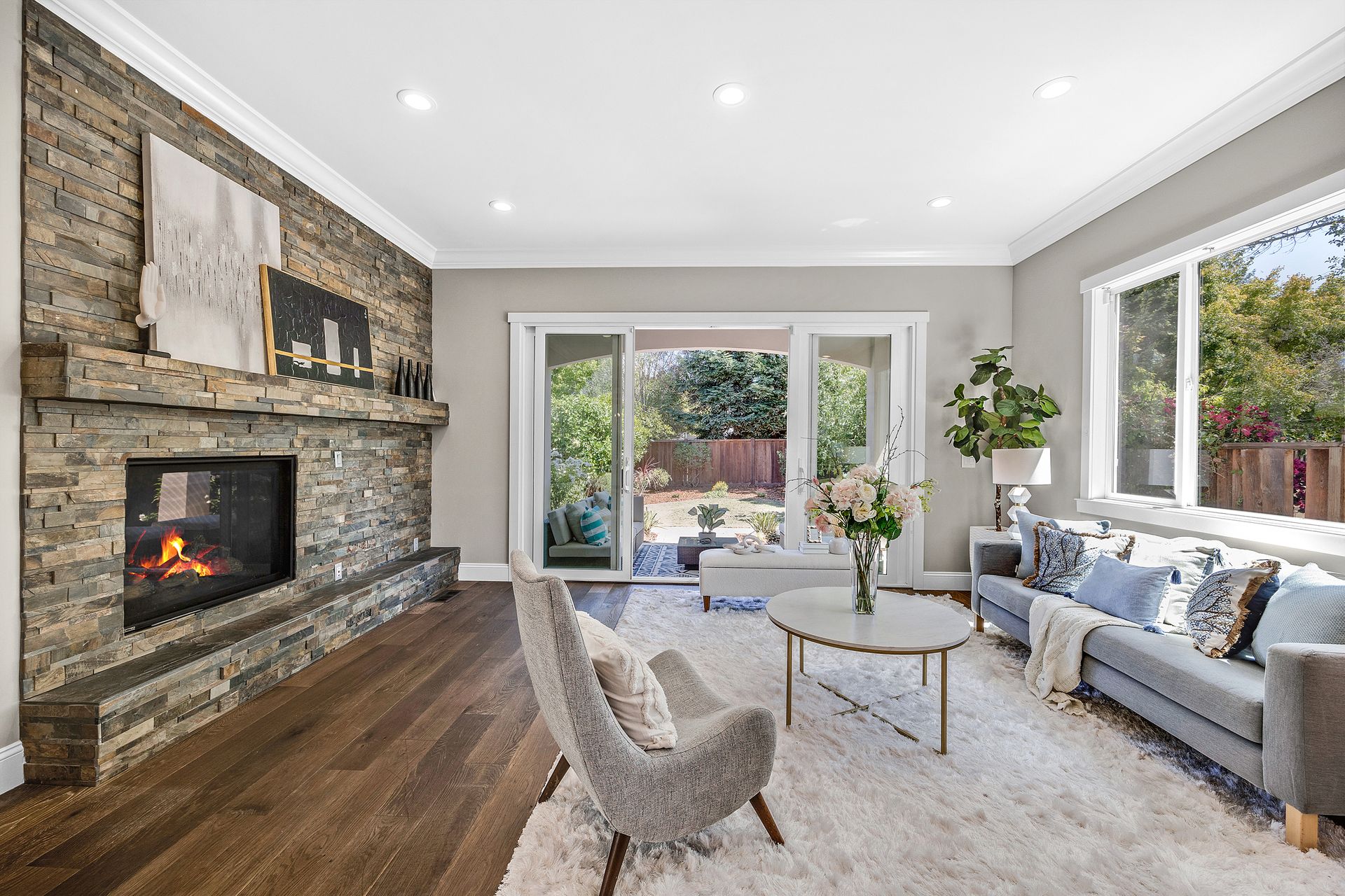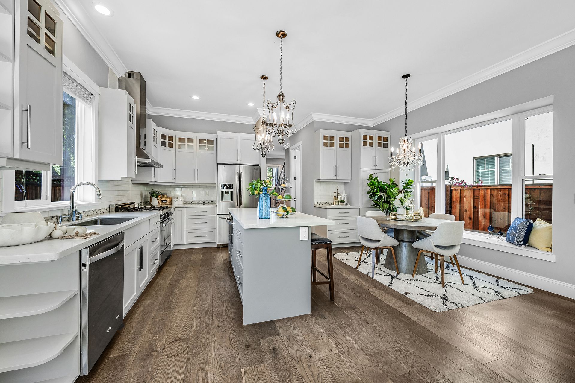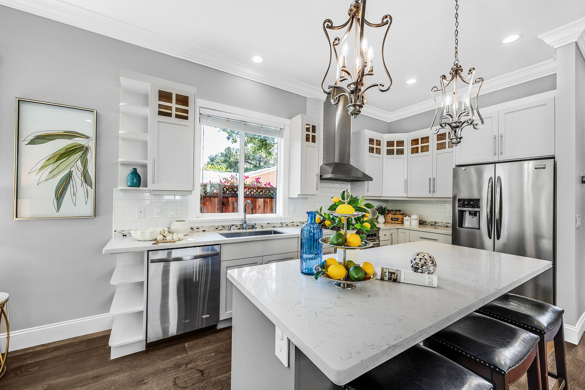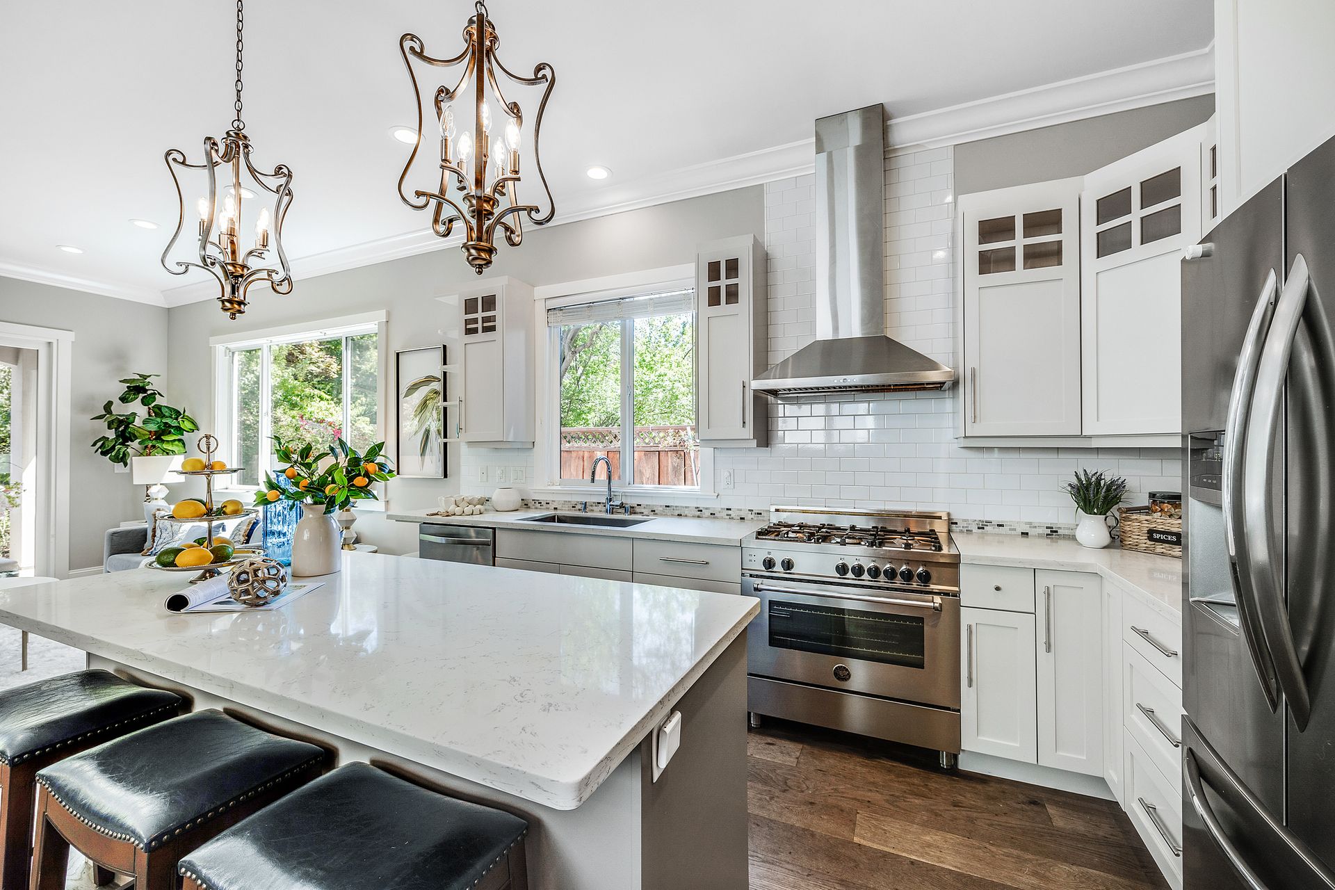 Welcome to this refined and stylish six-year newly constructed home in a prime Mountain View location. Mature oak trees greet you alongside a fresh paver driveway with wrap-around pathways to the rear of the home. The lower level includes a conveniently located one-half bath, beautiful wide-plank oak flooring with high ceilings, crown molding and designer lighting. The open concept kitchen boasts a quartz island with seating, stainless steel appliances, high-end cabinetry and a dining area with a bay window. Enjoy seamless indoor-outdoor living with an expansive double pane slider that takes you out into the private rear yard oasis. The home features a large California room ideal for alfresco dining and entertaining, privacy with mature landscaping and multiple fruit trees. Upstairs find a full hall bath and three well-appointed bedrooms with vaulted ceilings. The large primary bedroom overlooks the rear yard and includes an extensive walk-in closet. The tastefully updated primary bath features a sizeable, tiled step-in shower and dual sinks. This home is conveniently located to nearby downtown Mountain View, major tech employers and commute routes. Schools include the highly sought-after Los Altos High School. Come see it for yourself to experience it all!