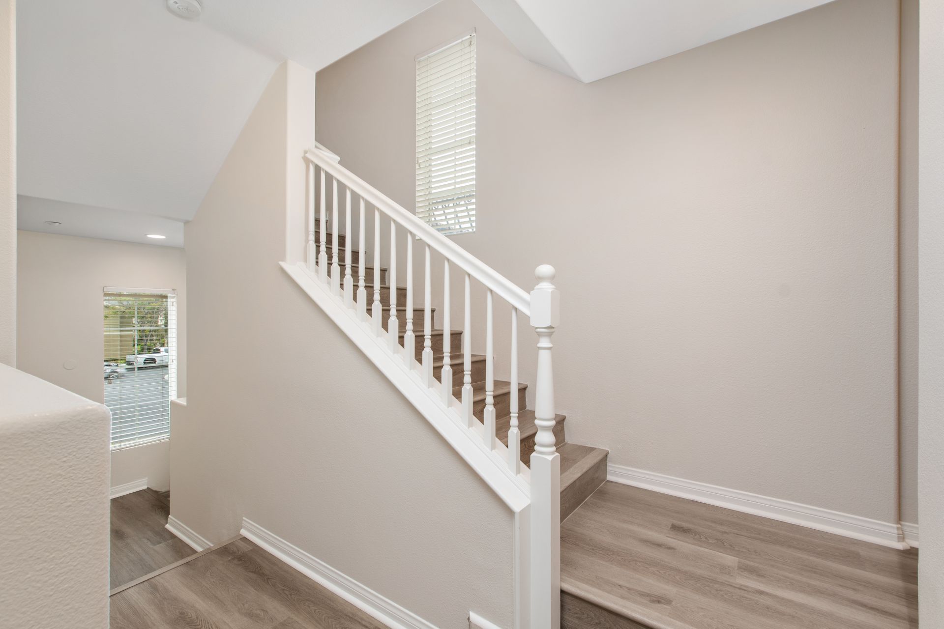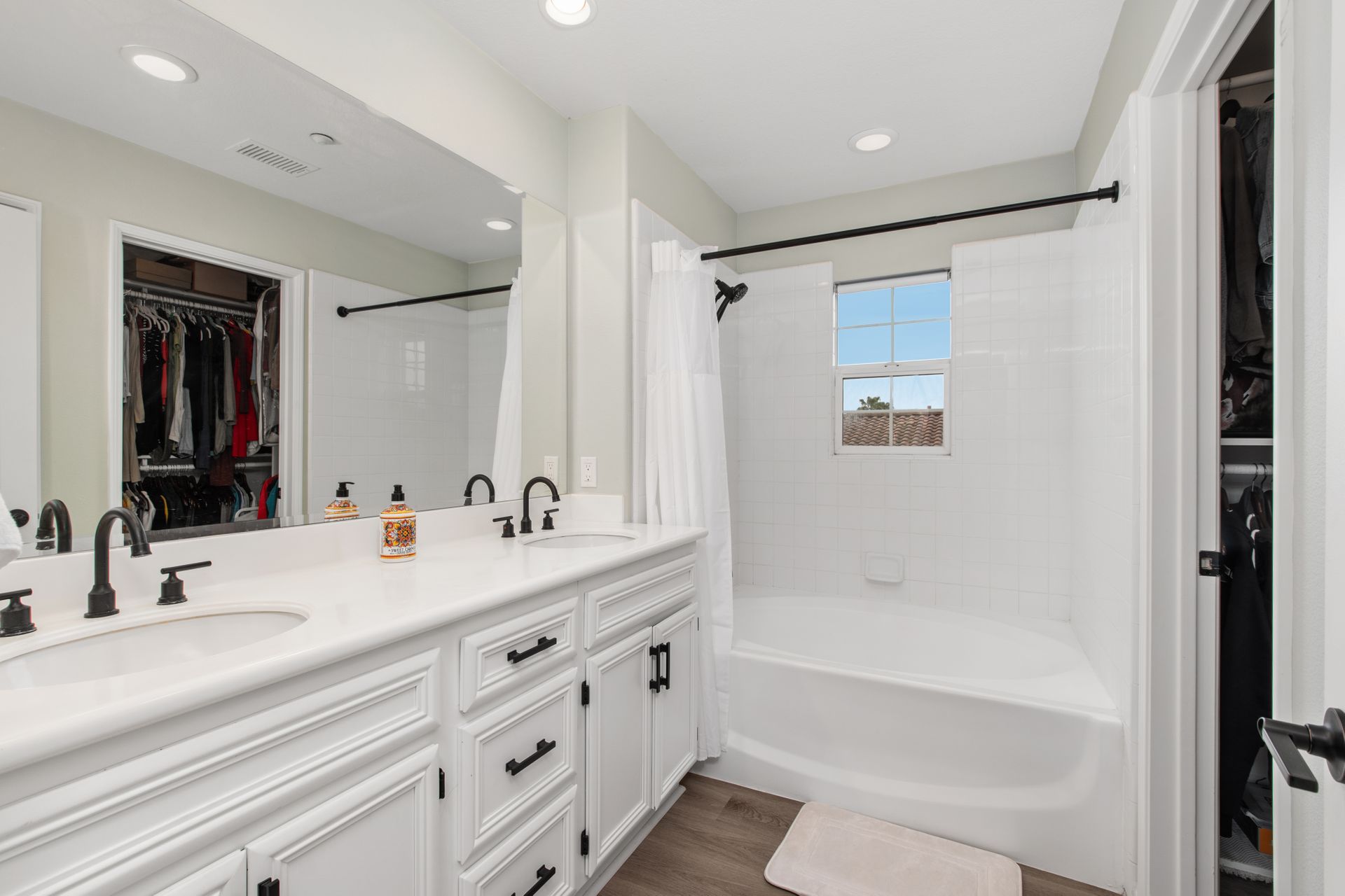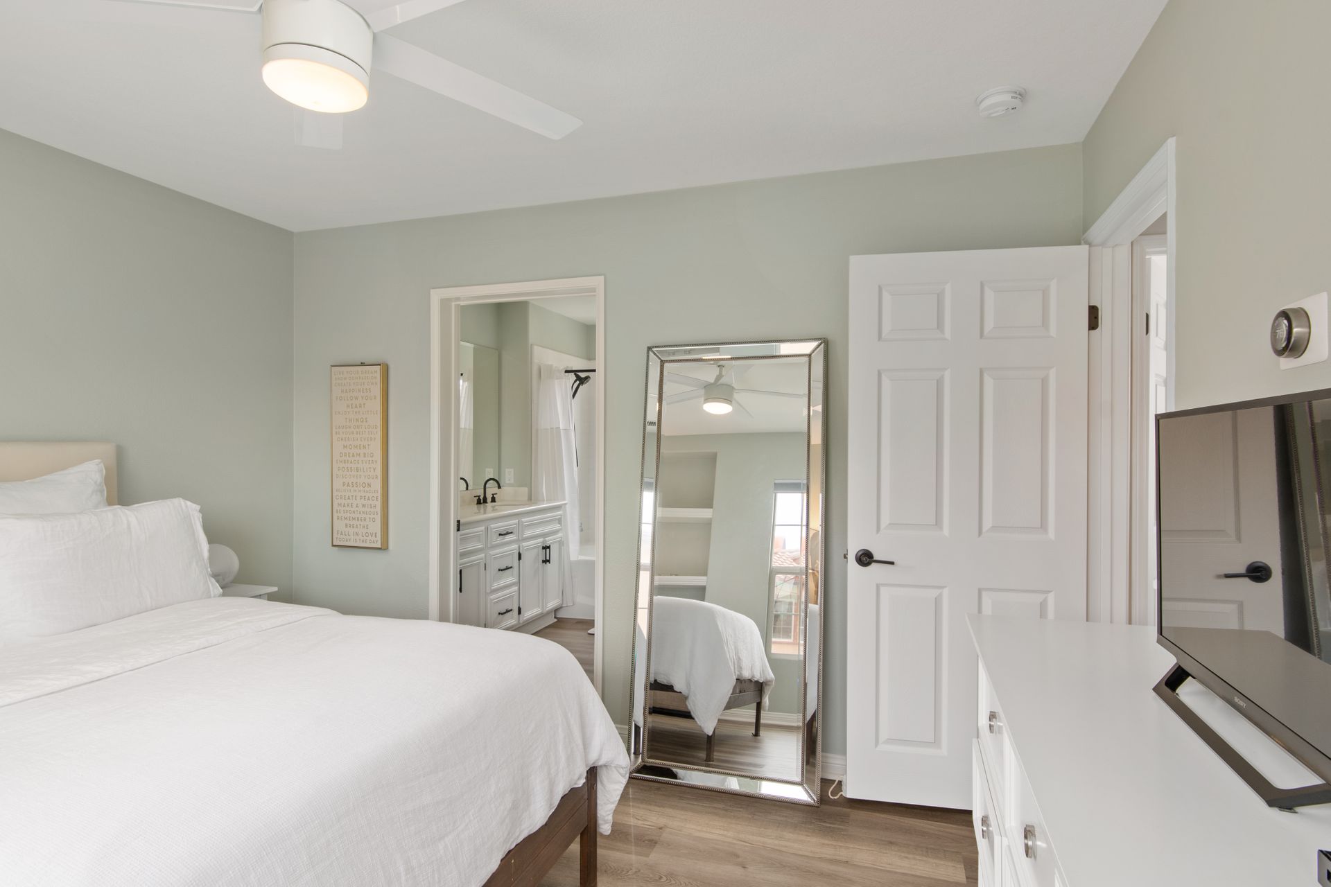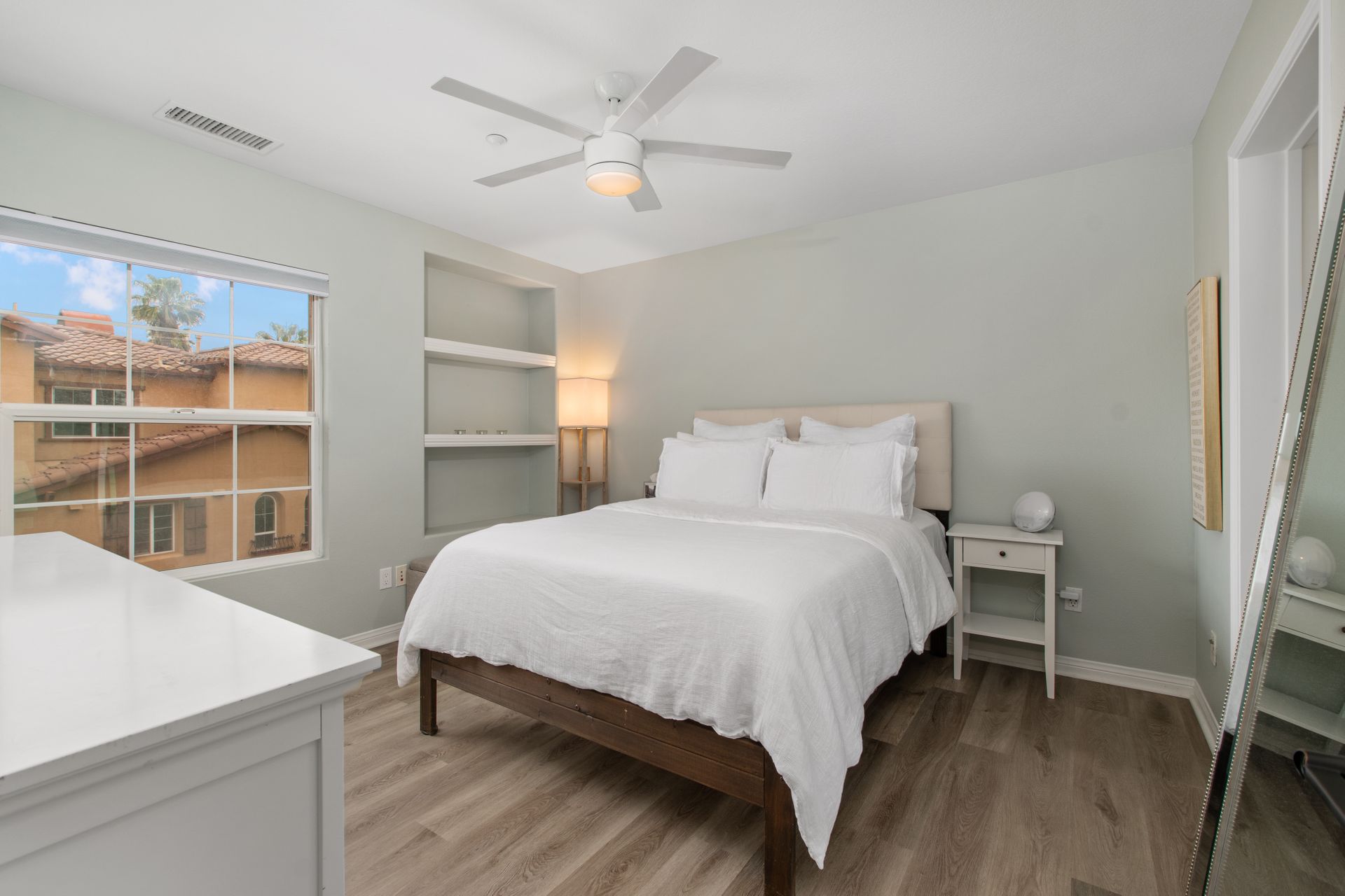 The expansive master suite features tasteful built-in shelves, a walk-in closet, a deep oval bathtub, and double vanities for your convenience. The second bedroom, complete with an en-suite bathroom and generous closet space, is conveniently located on the same floor as the master suite. The home is adorned with stunning vinyl flooring throughout, including the steps, and there's not a trace of carpet in sight. Ceiling fans grace both bedrooms and recessed lighting adds a contemporary touch.