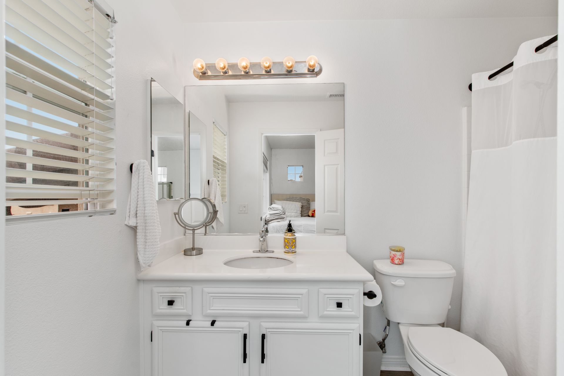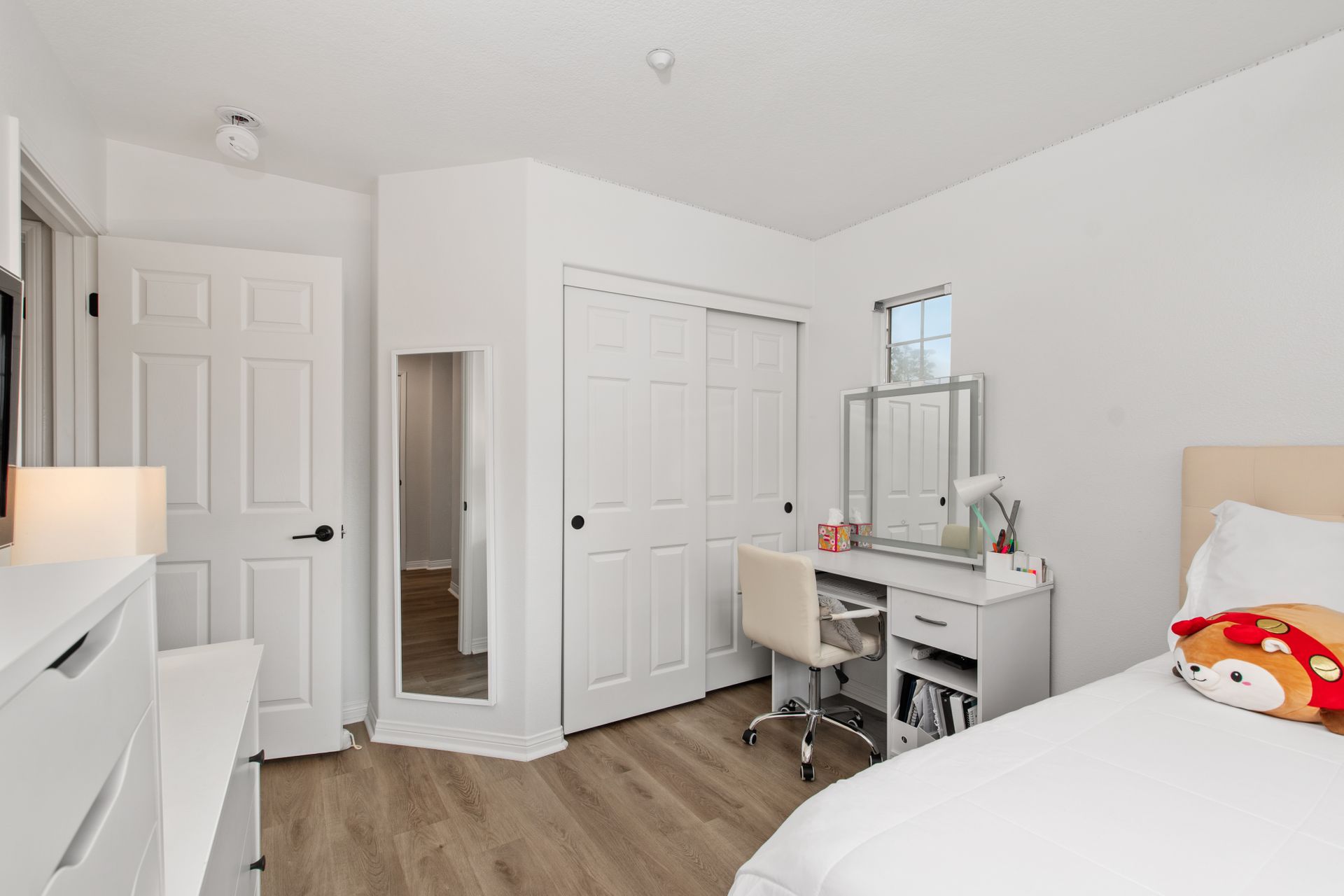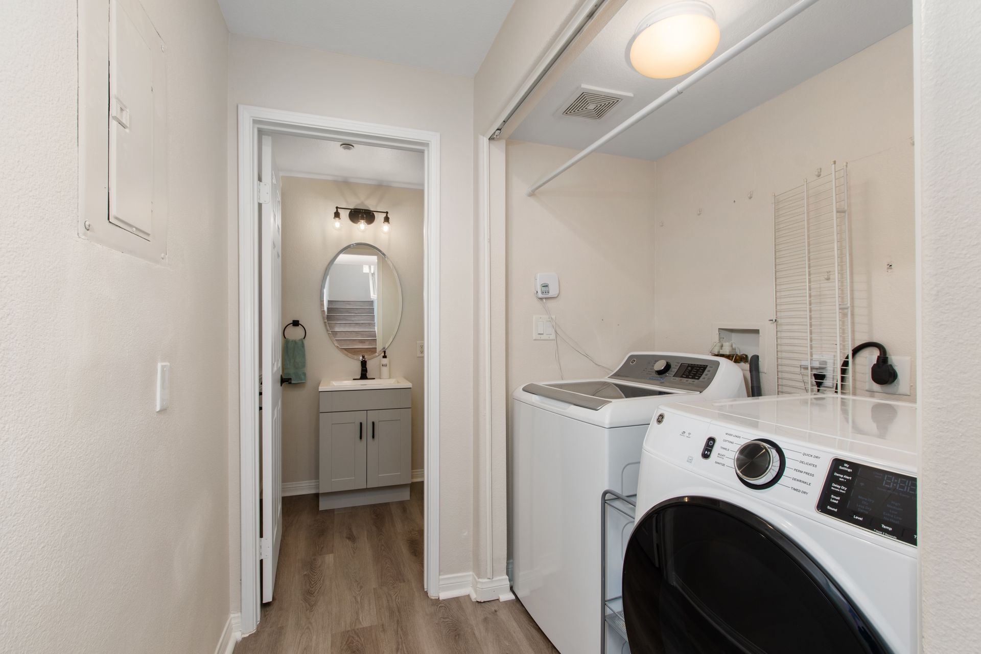 The expansive master suite features tasteful built-in shelves, a walk-in closet, a deep oval bathtub, and double vanities for your convenience. The second bedroom, complete with an en-suite bathroom and generous closet space, is conveniently located on the same floor as the master suite. The home is adorned with stunning vinyl flooring throughout, including the steps, and there's not a trace of carpet in sight. Ceiling fans grace both bedrooms and recessed lighting adds a contemporary touch.