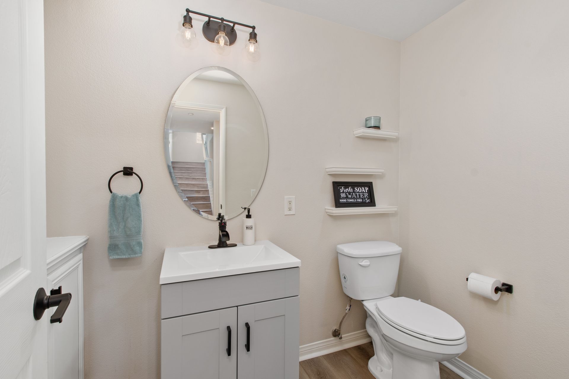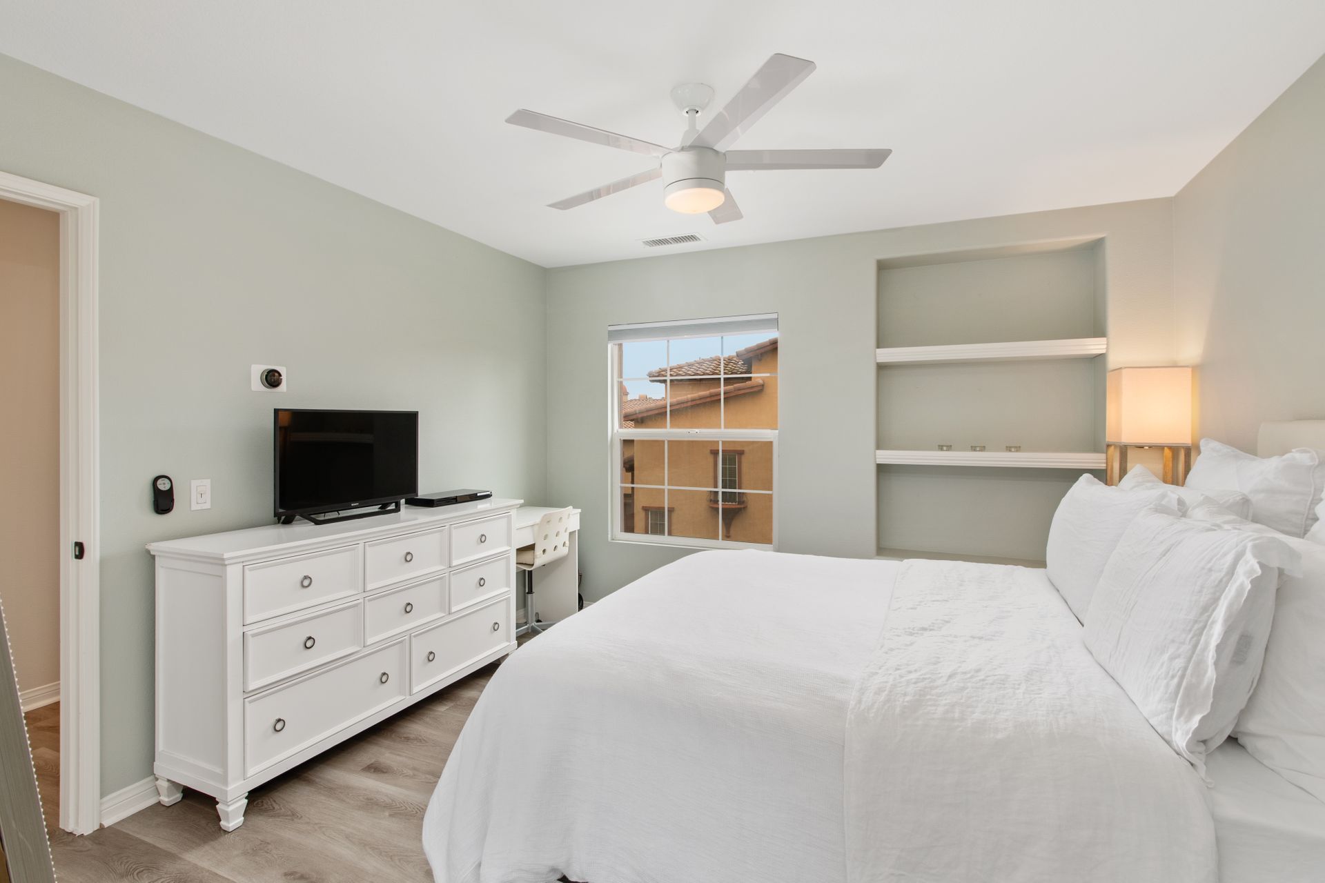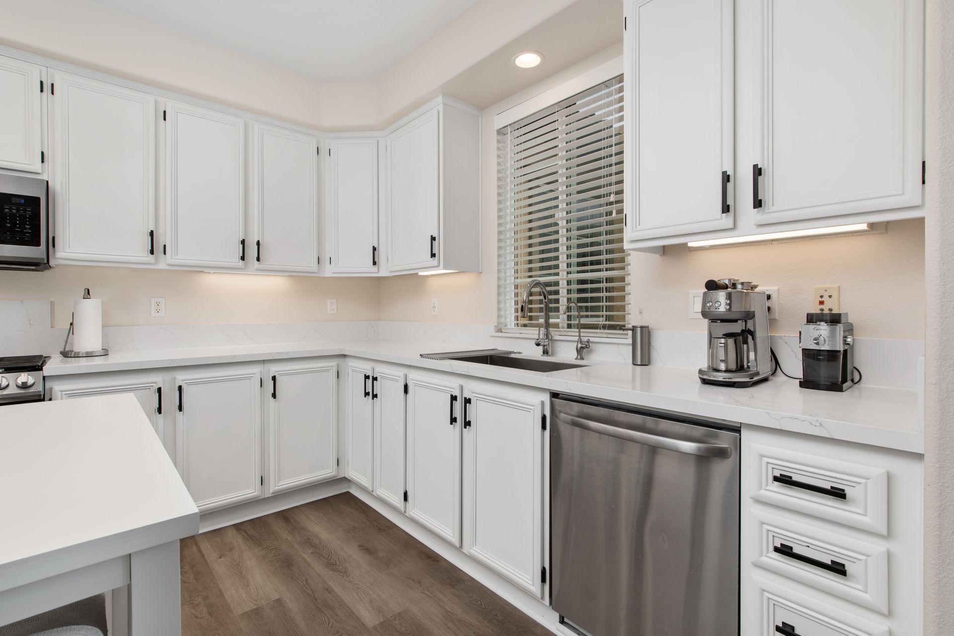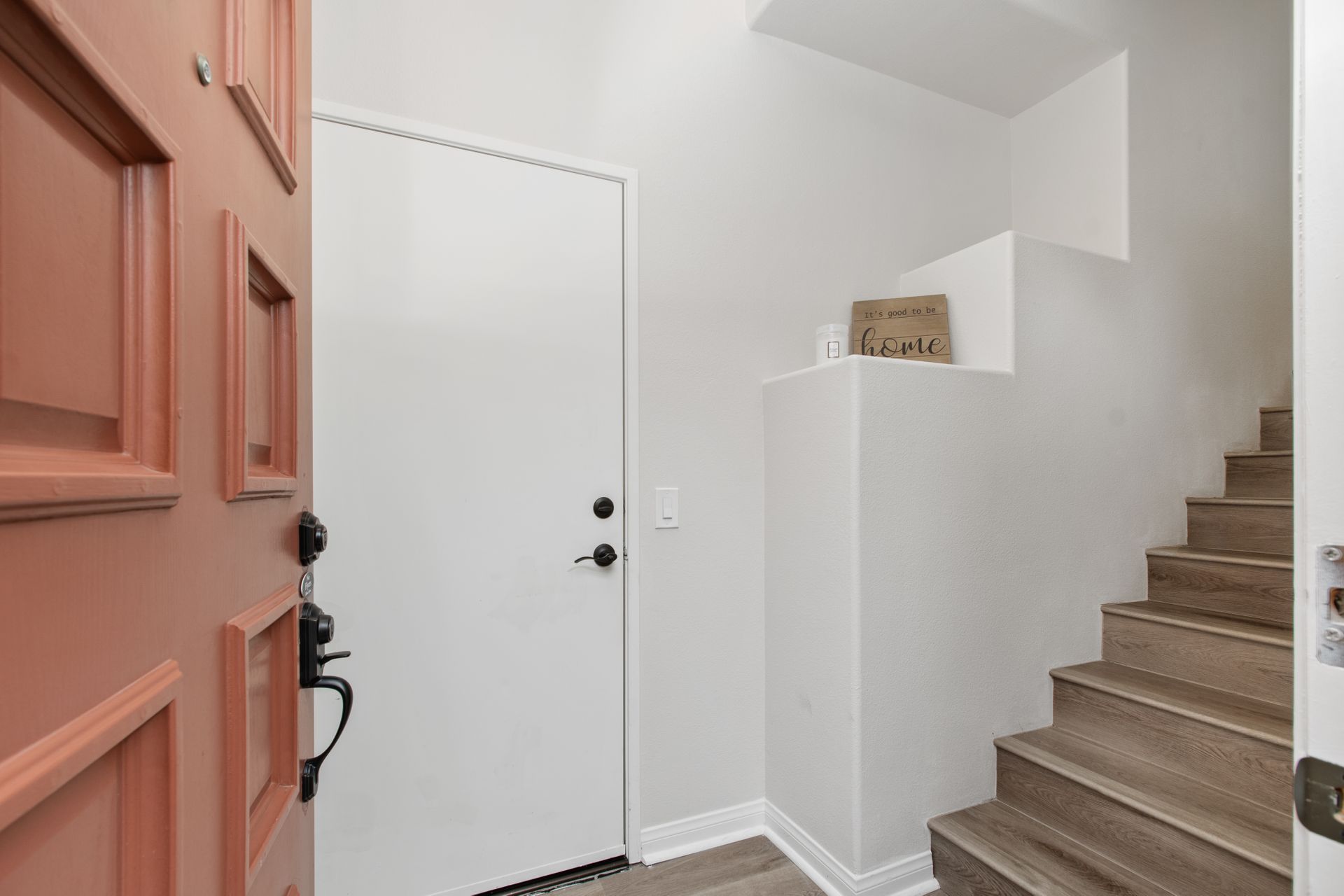 The expansive master suite features tasteful built-in shelves, a walk-in closet, a deep oval bathtub, and double vanities for your convenience. The second bedroom, complete with an en-suite bathroom and generous closet space, is conveniently located on the same floor as the master suite. The home is adorned with stunning vinyl flooring throughout, including the steps, and there's not a trace of carpet in sight. Ceiling fans grace both bedrooms and recessed lighting adds a contemporary touch.