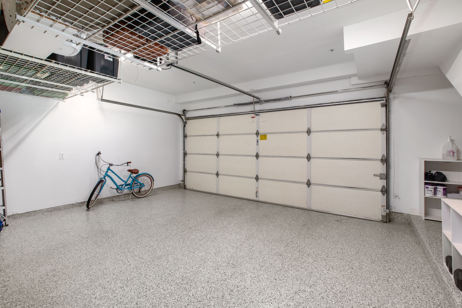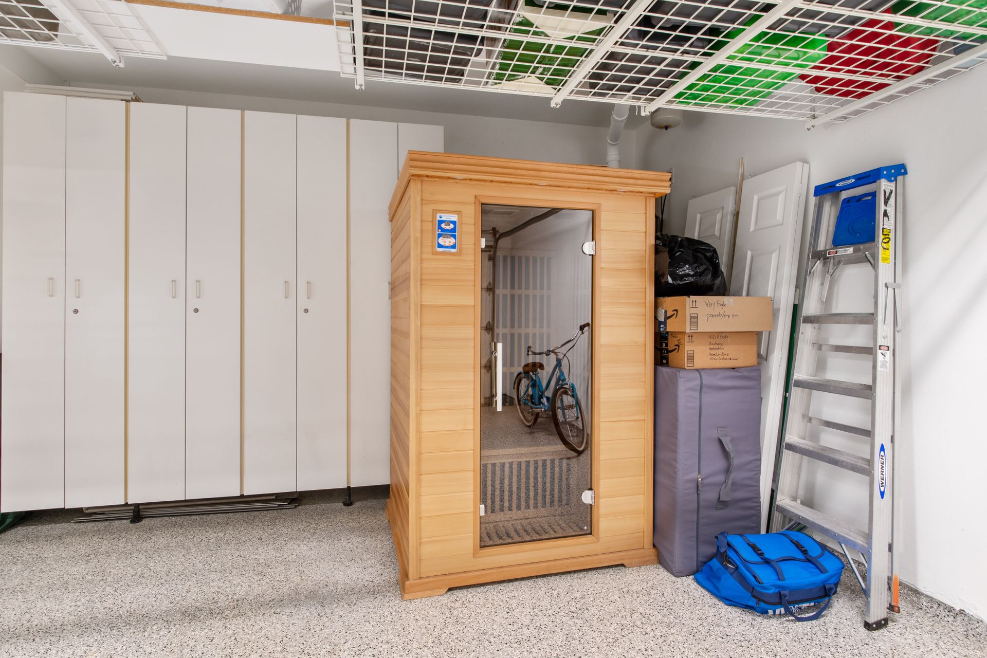 The home also boasts a two-car garage with direct access, epoxy flooring, EV charger, large overhead storage bins, and a wall of closets for your storage needs. A sauna, available for purchase, is situated within the garage, adding to the luxury of the property.
