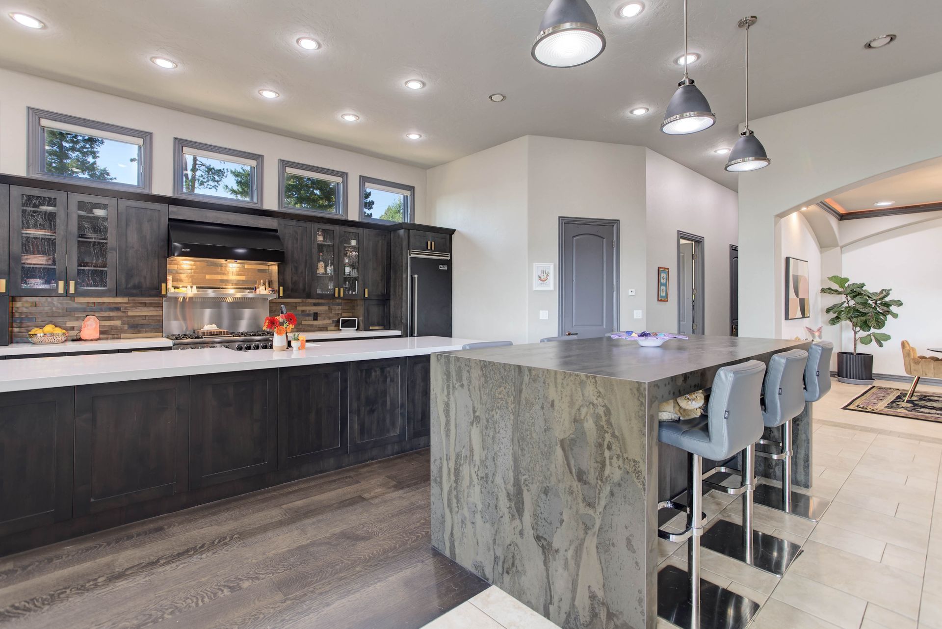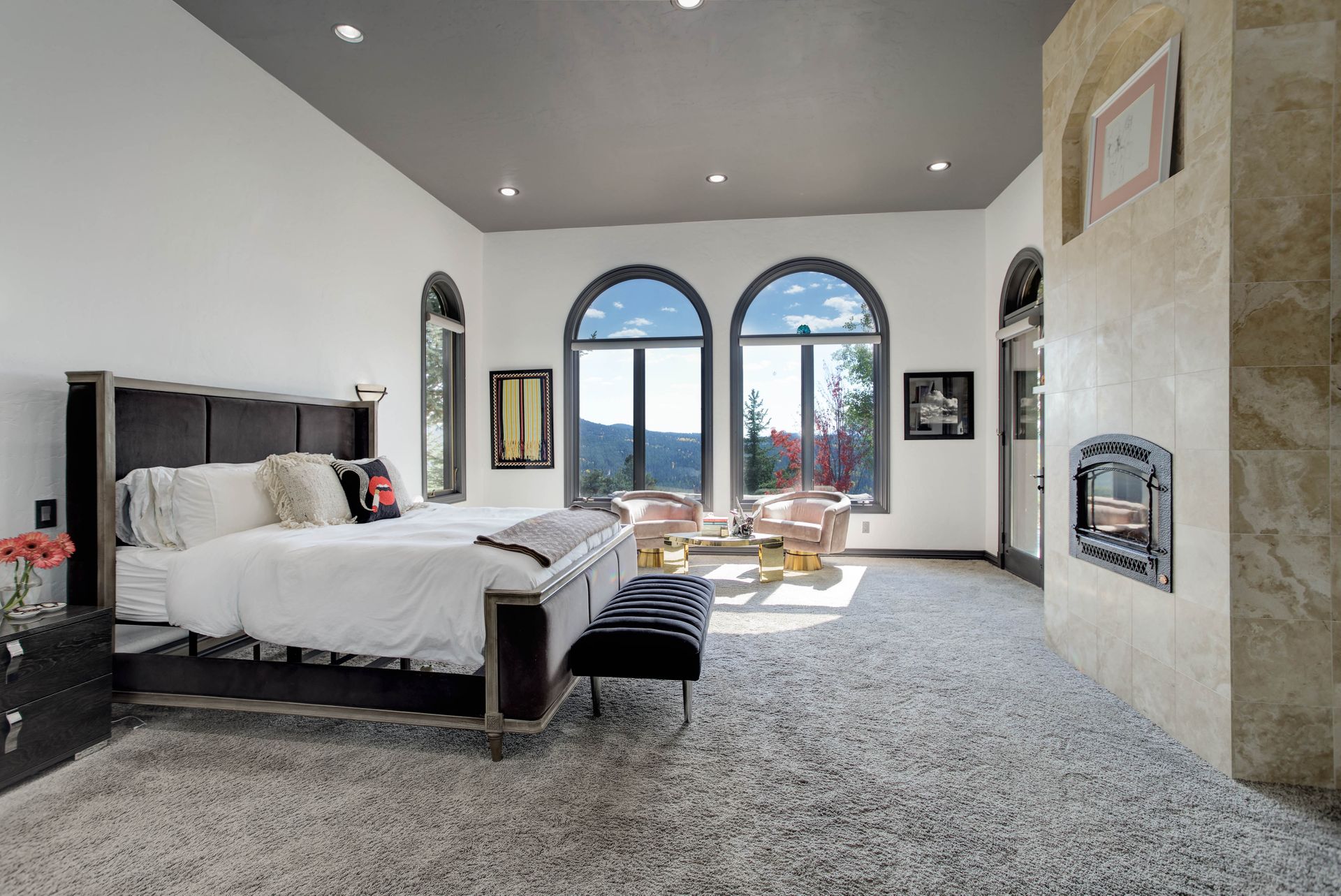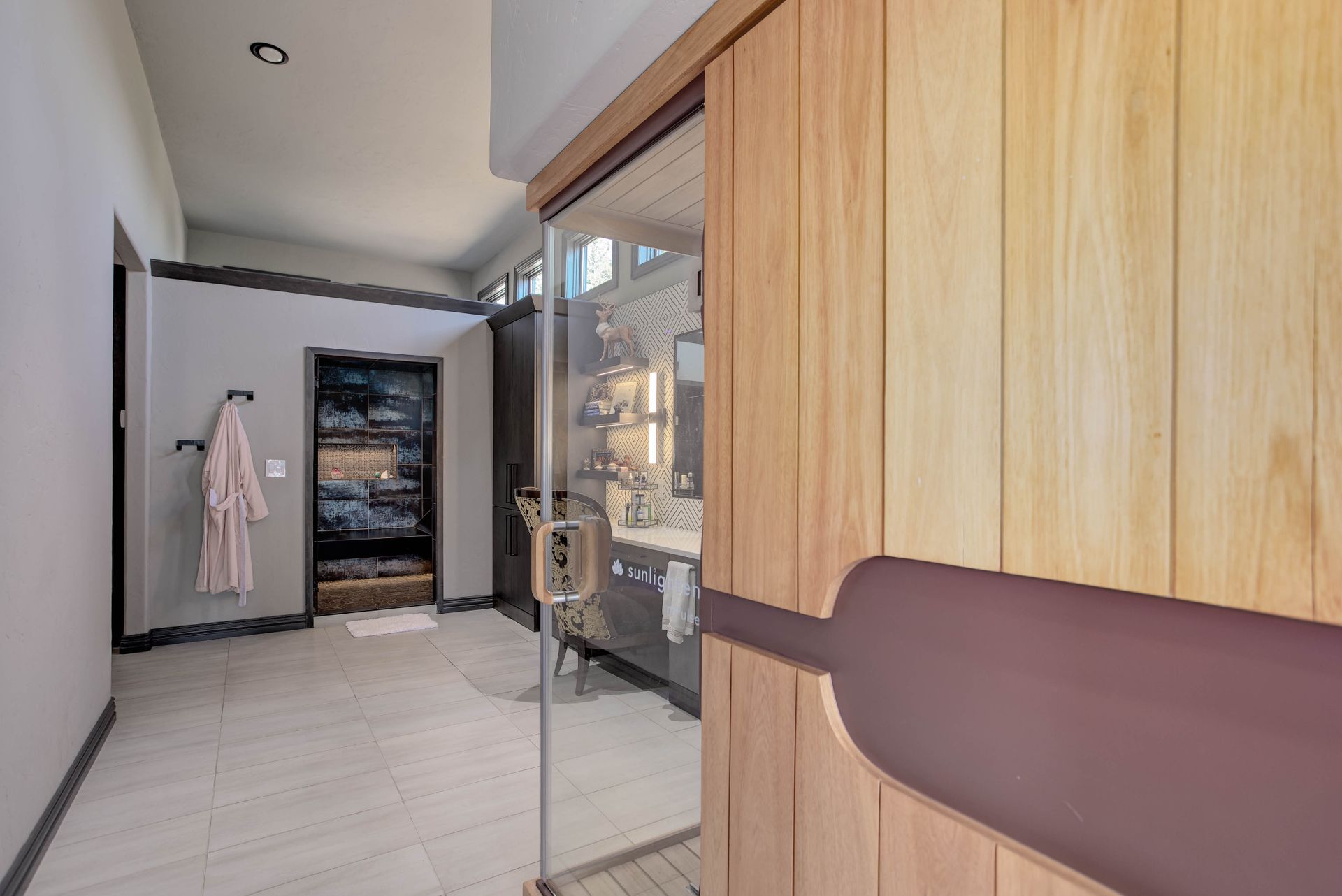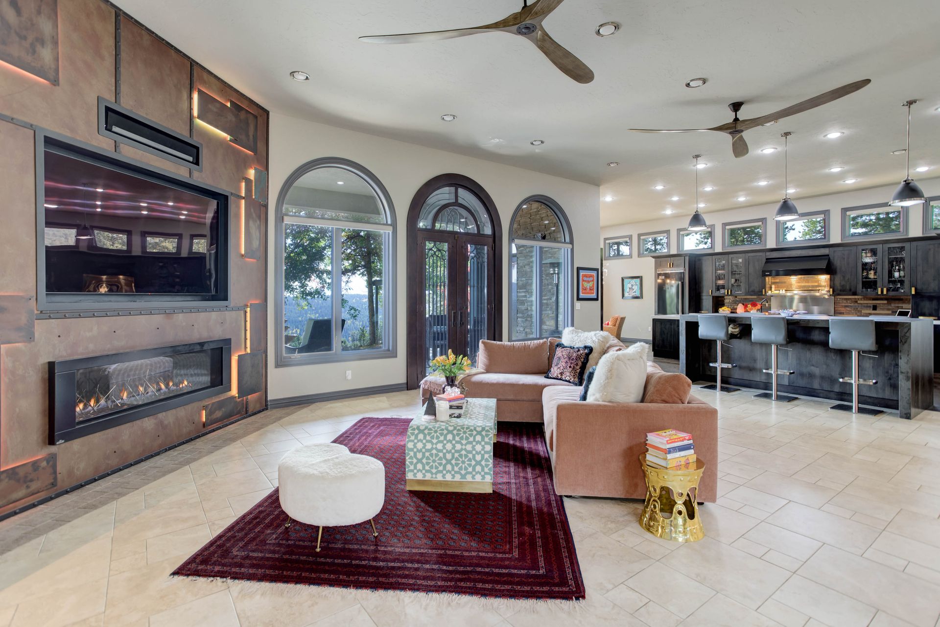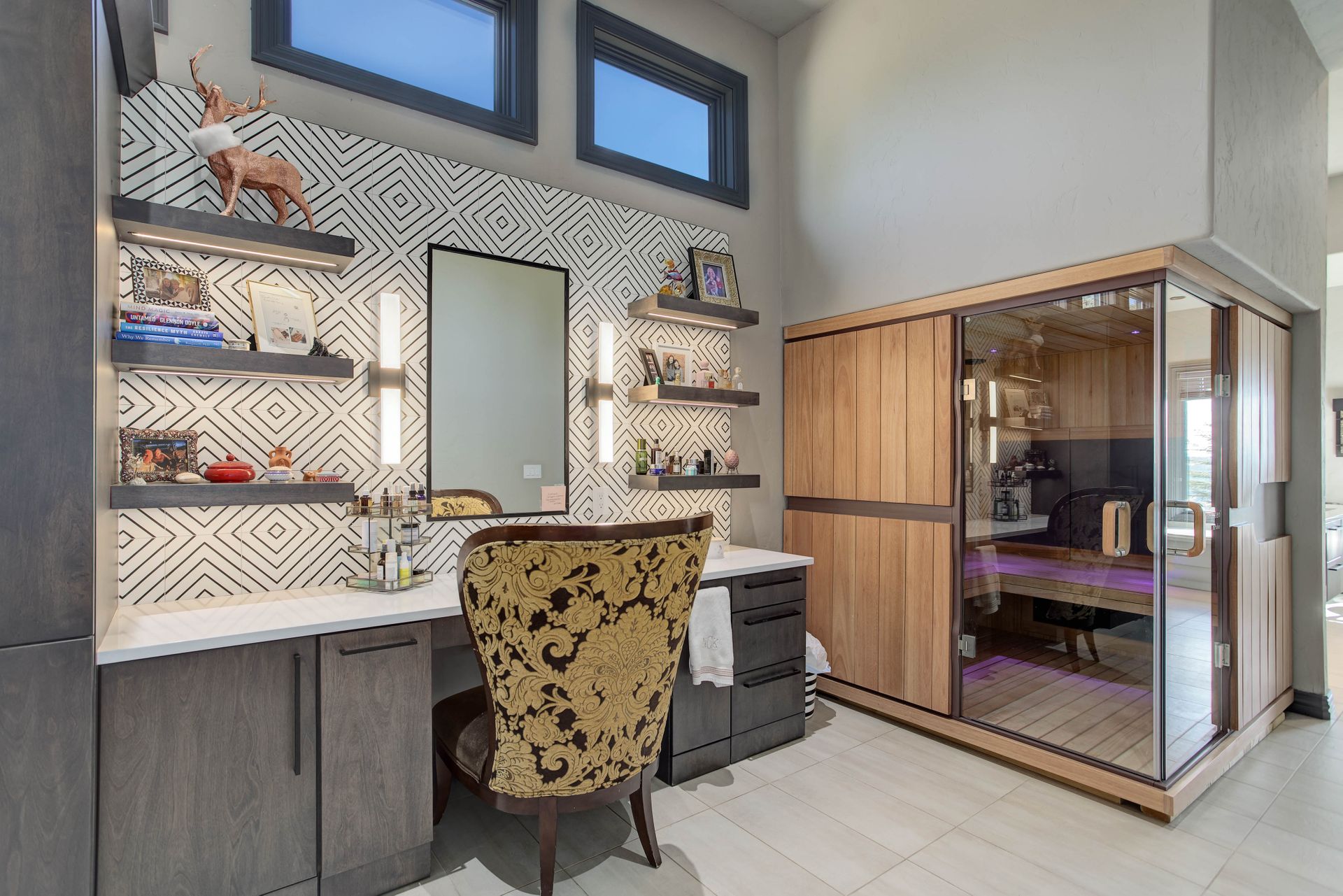The gourmet kitchen is a chef's dream, equipped with top-tier appliances, custom cabinetry, quartz countertops & stunning backsplash. Additional amenities include an ice maker, pantry, beverage station with cappuccino machine & custom seating island. The living room, with vaulted ceilings & striking custom copper fireplace wall, seamlessly connects to a covered back patio, extending the living space to the outdoors. The main floor primary suite has stunning views, gas fireplace & patio access. Enjoy the amazing spa-like ensuite bathroom oasis offering a freestanding jetted tub, dual custom steam shower with lighting & music, large infrared sauna, bidet toilet & urinal. The oversized walk-in closet is reminiscent of a high-end boutique, with lighted showcase area, dual benches & stunning chandelier.