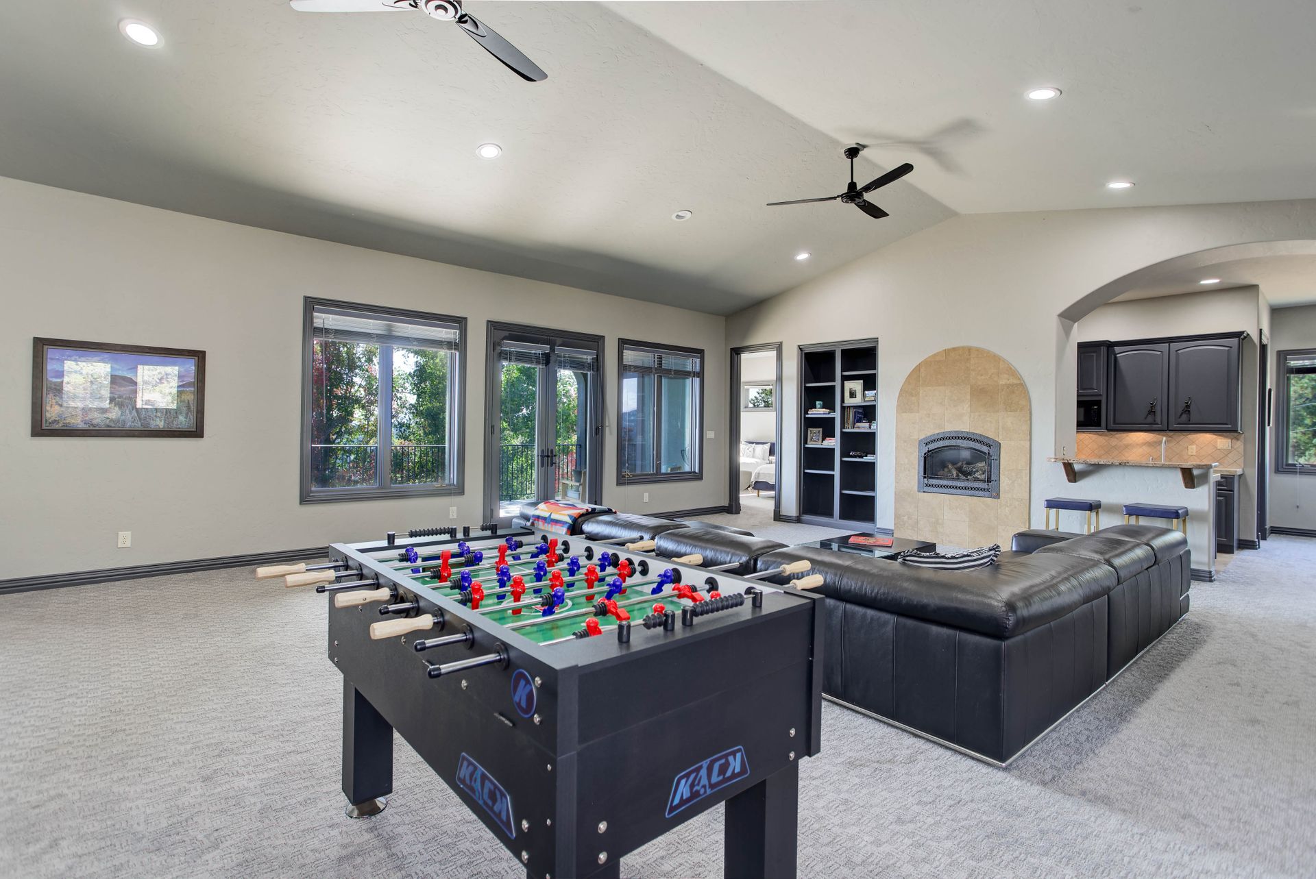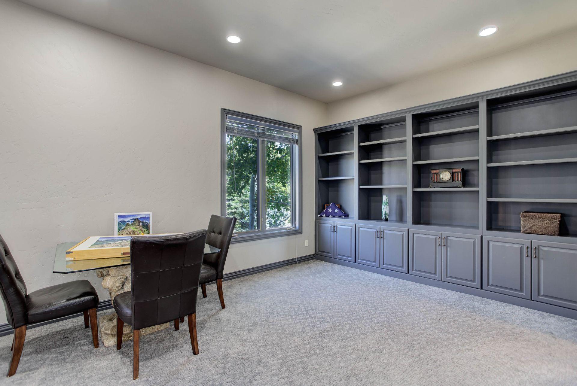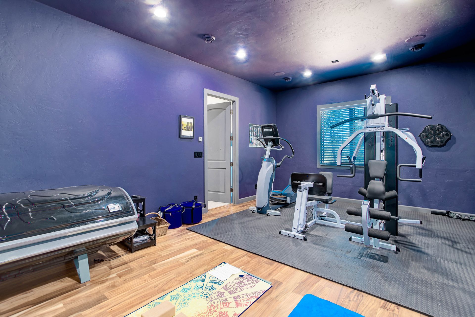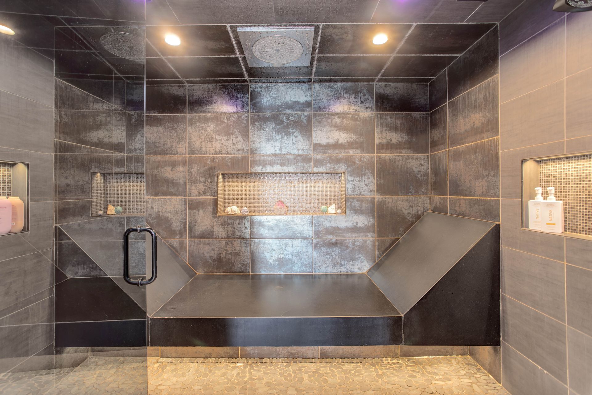 The gourmet kitchen is a chef's dream, equipped with top-tier appliances, custom cabinetry, quartz countertops & stunning backsplash. Additional amenities include an ice maker, pantry, beverage station with cappuccino machine & custom seating island. The living room, with vaulted ceilings & striking custom copper fireplace wall, seamlessly connects to a covered back patio, extending the living space to the outdoors. The main floor primary suite has stunning views, gas fireplace & patio access. Enjoy the amazing spa-like ensuite bathroom oasis offering a freestanding jetted tub, dual custom steam shower with lighting & music, large infrared sauna, bidet toilet & urinal. The oversized walk-in closet is reminiscent of a high-end boutique, with lighted showcase area, dual benches & stunning chandelier.
