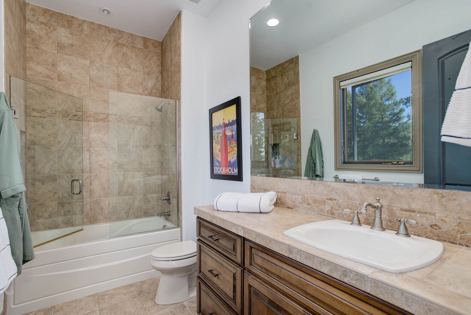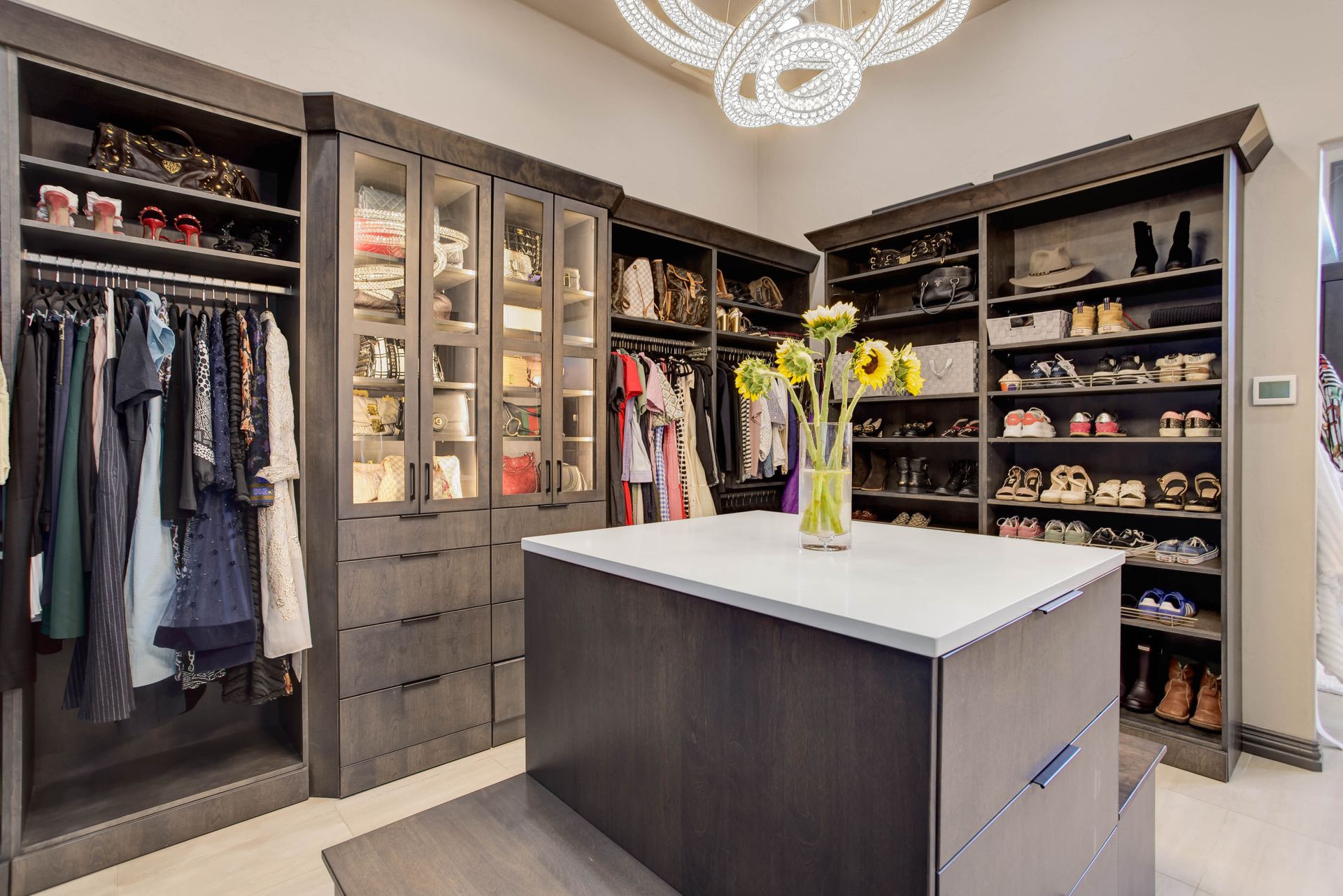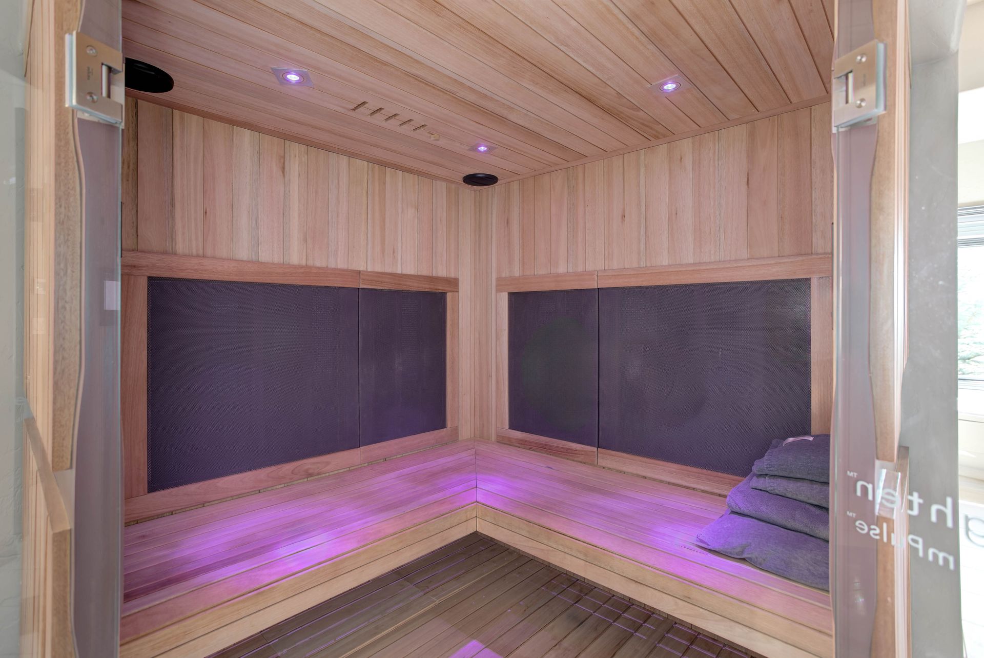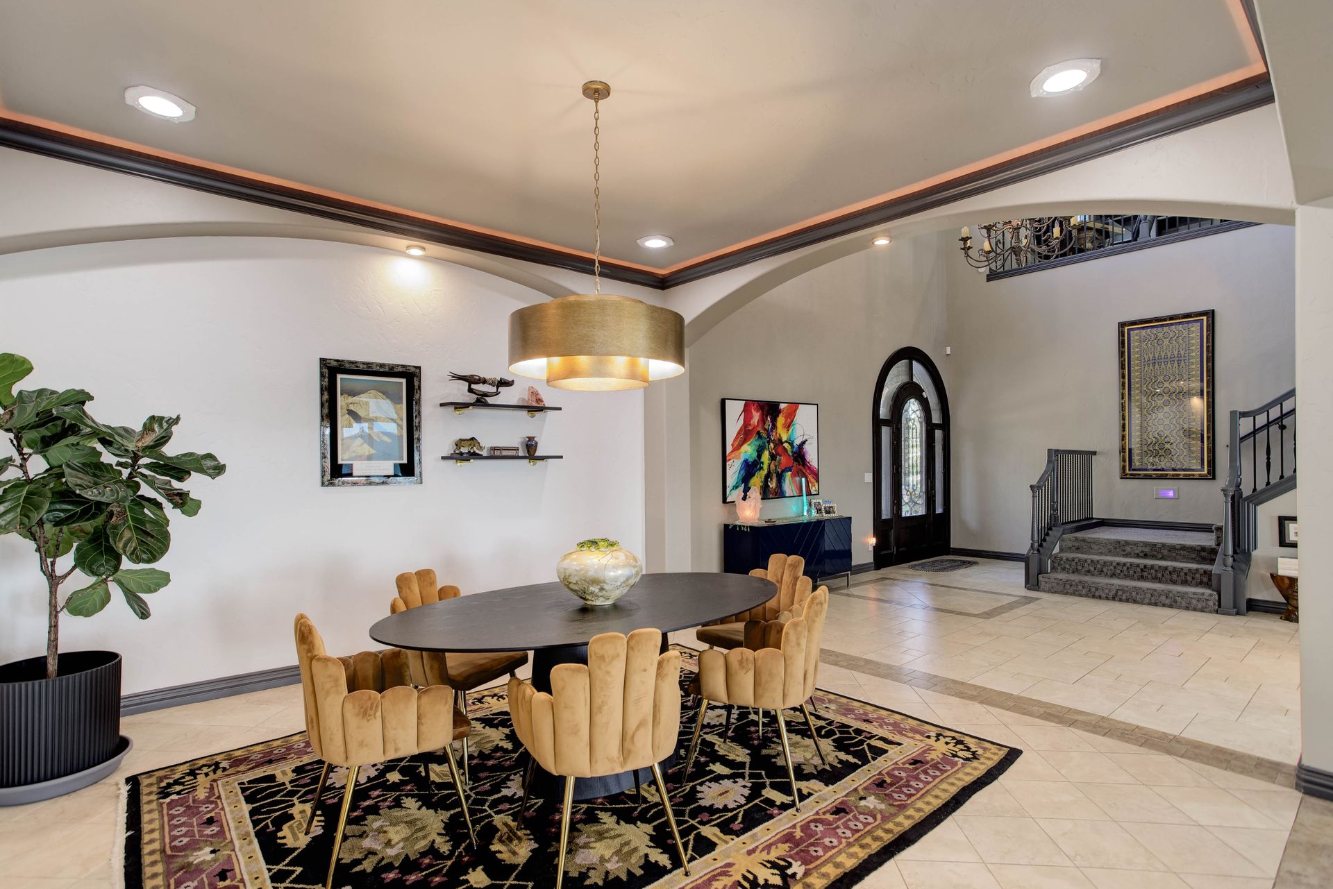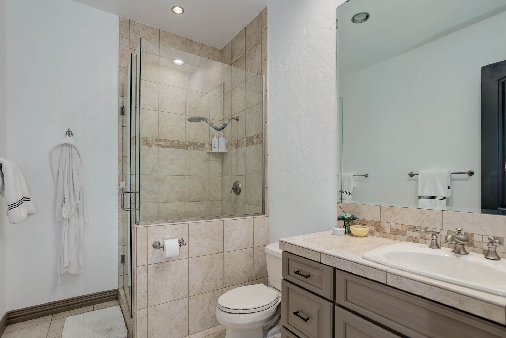 The gourmet kitchen is a chef's dream, equipped with top-tier appliances, custom cabinetry, quartz countertops & stunning backsplash. Additional amenities include an ice maker, pantry, beverage station with cappuccino machine & custom seating island. The living room, with vaulted ceilings & striking custom copper fireplace wall, seamlessly connects to a covered back patio, extending the living space to the outdoors. The main floor primary suite has stunning views, gas fireplace & patio access. Enjoy the amazing spa-like ensuite bathroom oasis offering a freestanding jetted tub, dual custom steam shower with lighting & music, large infrared sauna, bidet toilet & urinal. The oversized walk-in closet is reminiscent of a high-end boutique, with lighted showcase area, dual benches & stunning chandelier.