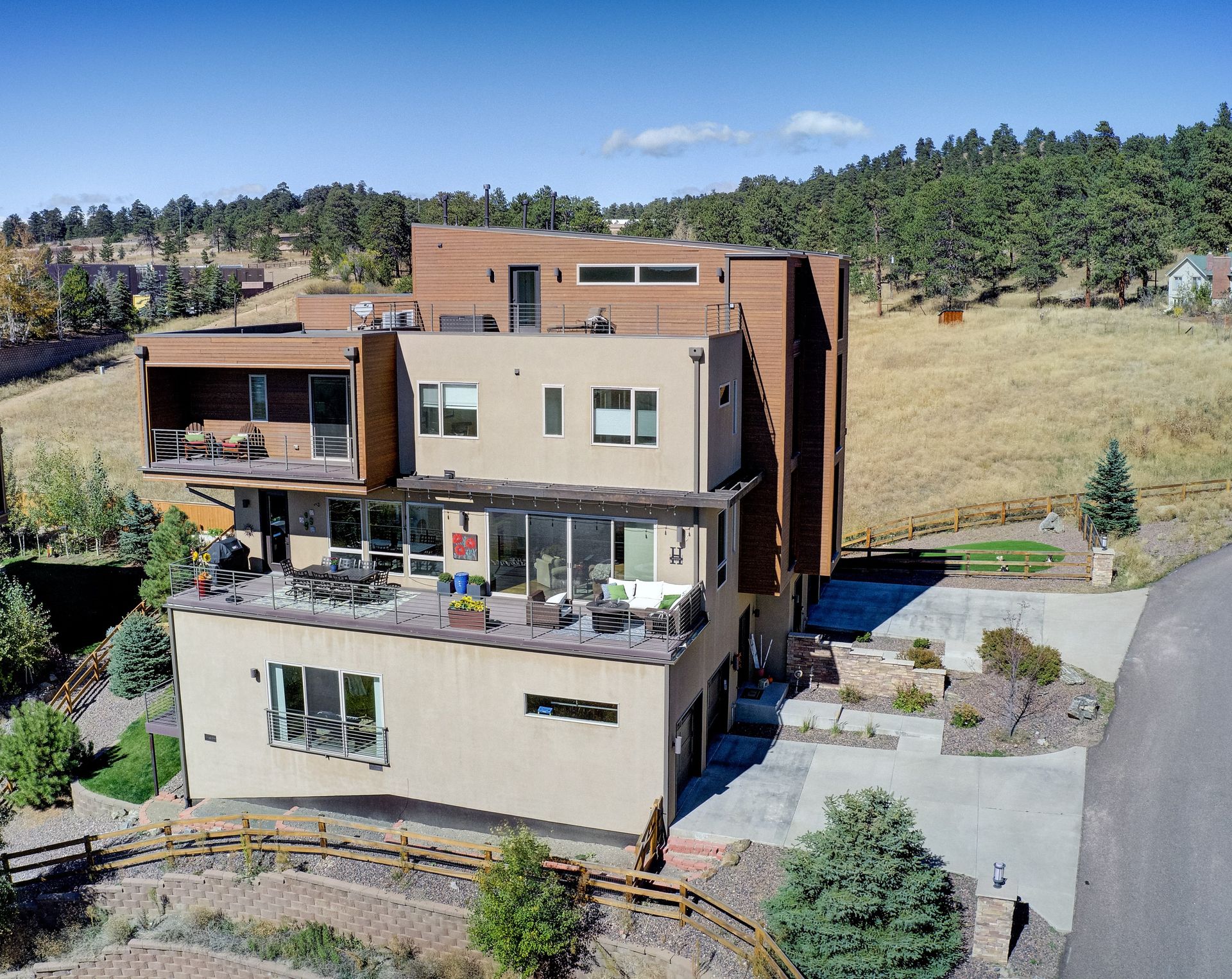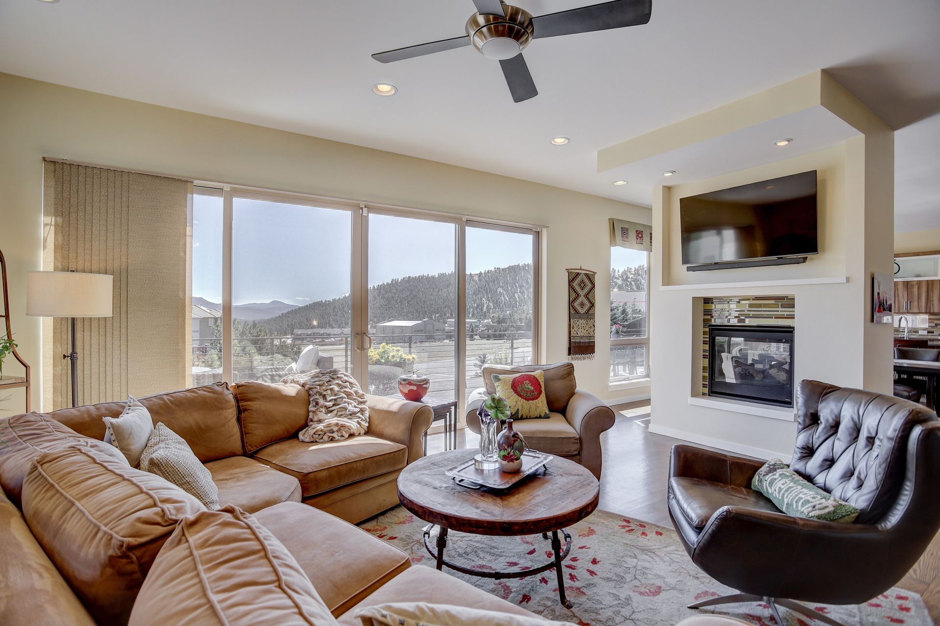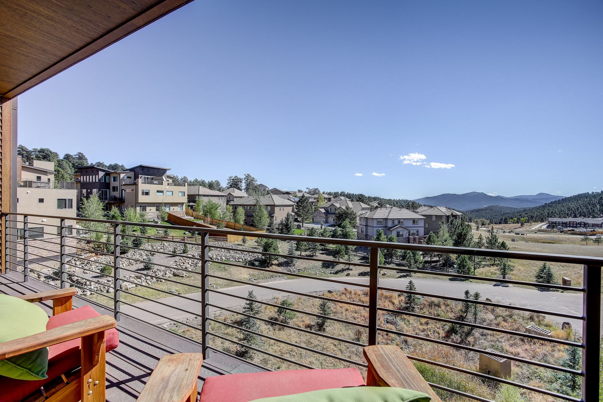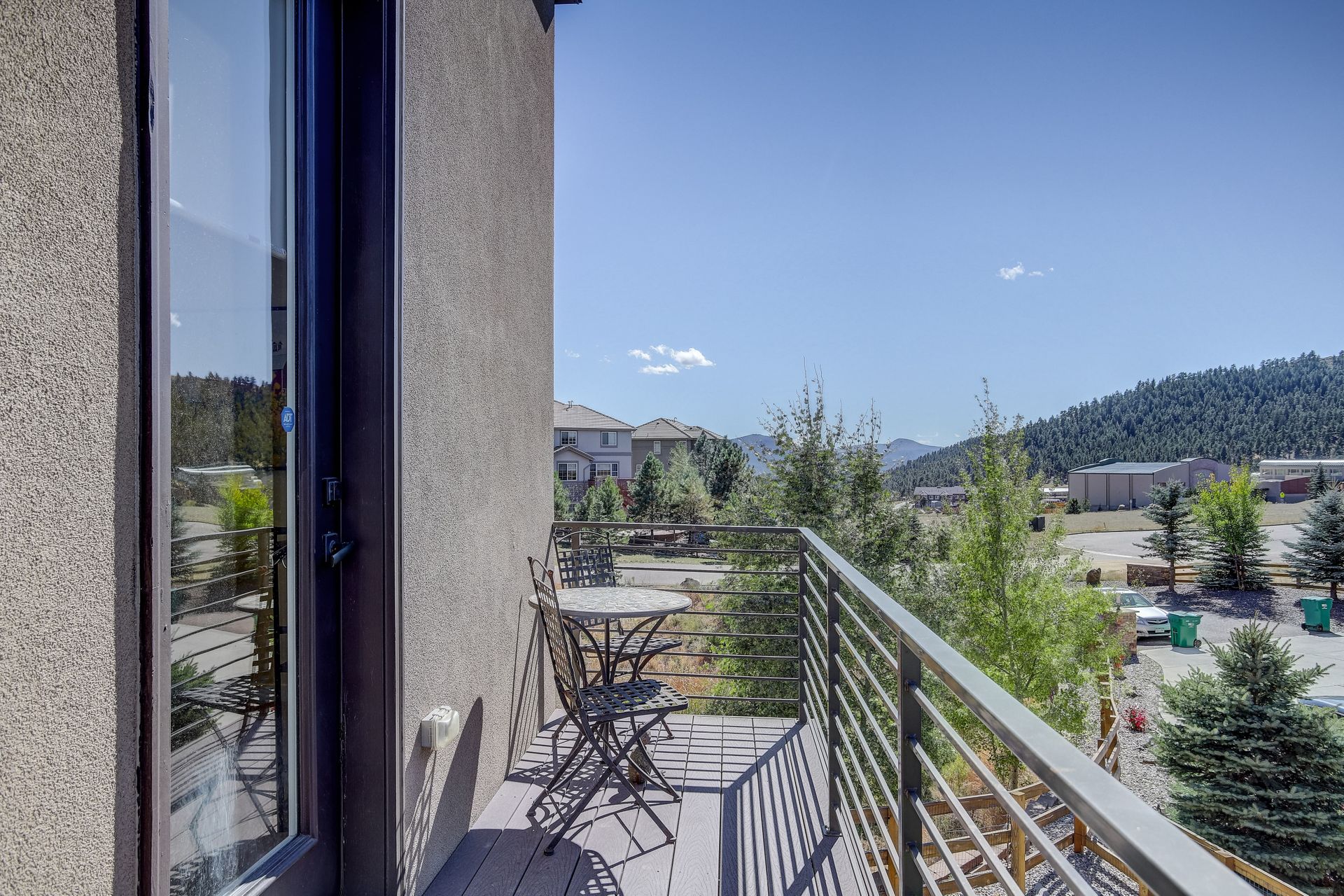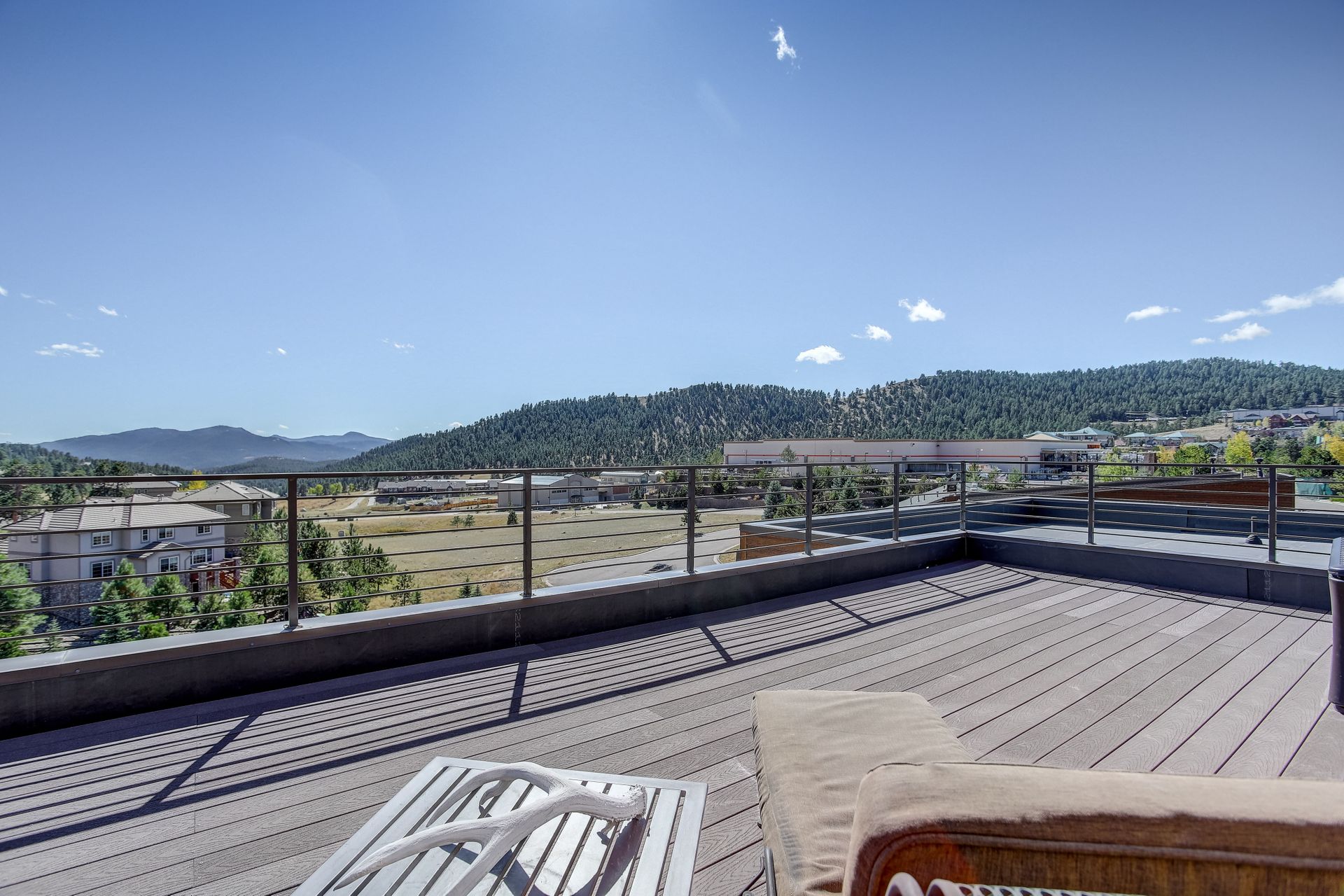 A chic urban townhome with the joys of mountain living–views, easy access to I-70 and all Evergreen has to offer. This exquisitely maintained home has a second story open floor plan featuring hard wood floors, floor to ceiling windows with mountain views and a gorgeous modern kitchen with stainless appliances and quartz countertops. Experience the sunrise and mountain breezes when you exit out onto the outstanding deck to dine or relax. On the third level, a gracious primary suite with a private deck and a spa-like bath including a free-standing tub and two separate vanities and closets. Two bedrooms–one presently an office showcasing the fabulous view, custom office built-ins– a shared bath and a laundry closet complete this floor. Take the stairs to the fourth level deck for peace, quiet and 180° views of the stars-wired and structured for a hot tub. The first floor has a welcoming entry, a fourth bedroom, a beautiful, updated bath and an additional living space with great views, perfect for TV, exercise, music, whatever you want or need. You can head out to a fenced-in, just the right size landscaped yard. This level has newly installed heated tile floors in the entry and bath and new elegant, forced air registers in the living space.