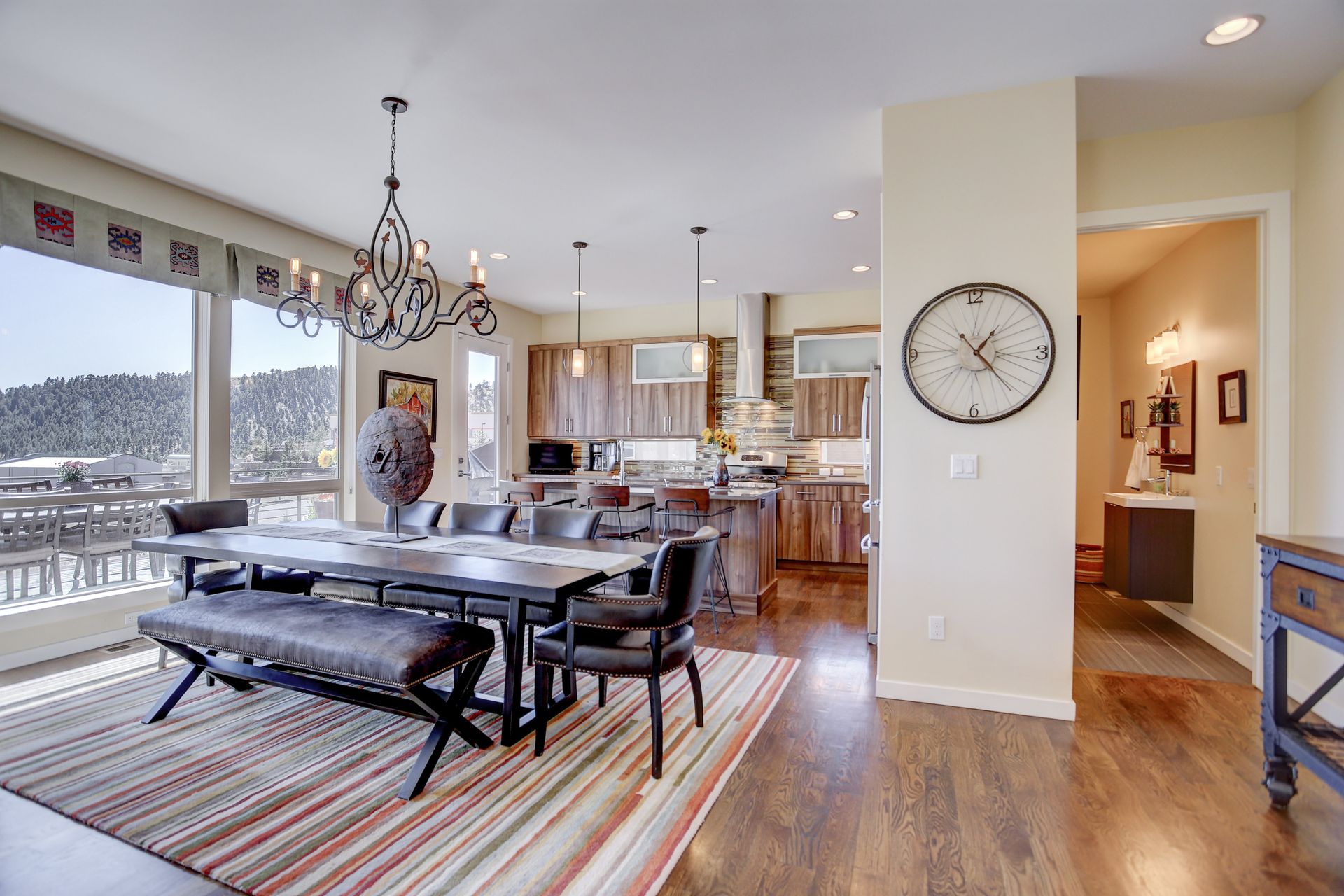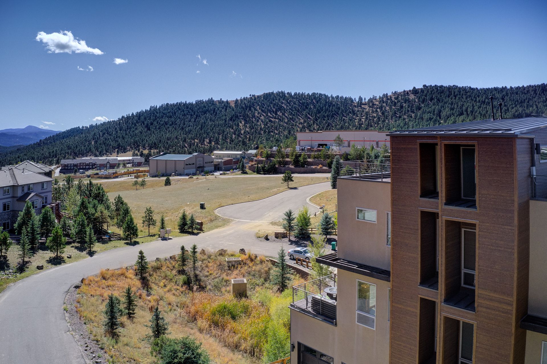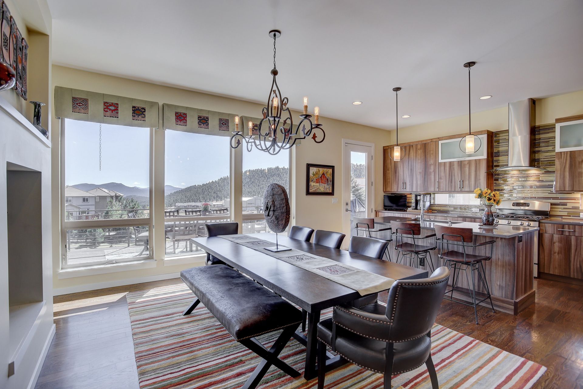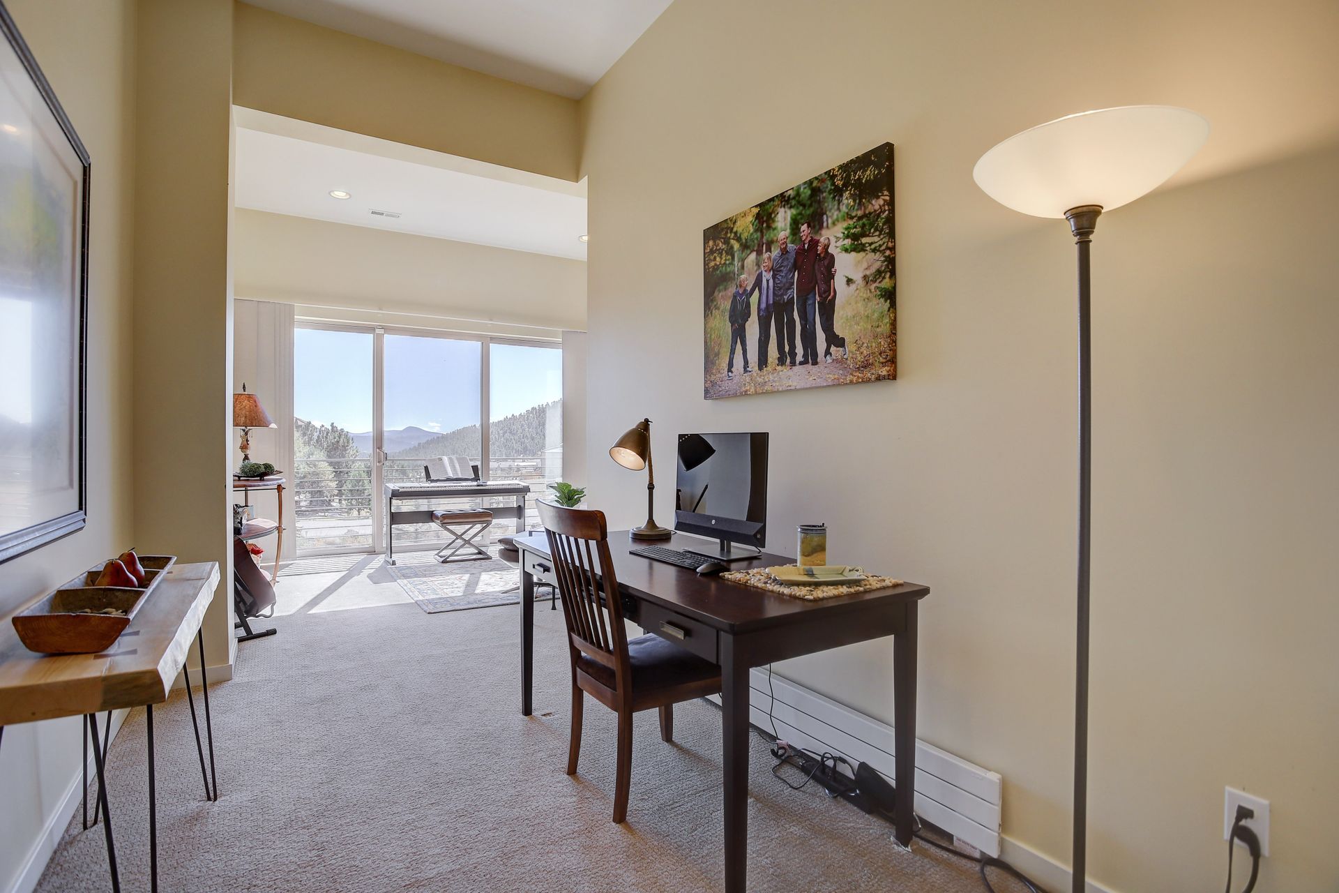 A chic urban townhome with the joys of mountain living–views, easy access to I-70 and all Evergreen has to offer. This exquisitely maintained home has a second story open floor plan featuring hard wood floors, floor to ceiling windows with mountain views and a gorgeous modern kitchen with stainless appliances and quartz countertops. Experience the sunrise and mountain breezes when you exit out onto the outstanding deck to dine or relax. On the third level, a gracious primary suite with a private deck and a spa-like bath including a free-standing tub and two separate vanities and closets. Two bedrooms–one presently an office showcasing the fabulous view, custom office built-ins– a shared bath and a laundry closet complete this floor. Take the stairs to the fourth level deck for peace, quiet and 180° views of the stars-wired and structured for a hot tub. The first floor has a welcoming entry, a fourth bedroom, a beautiful, updated bath and an additional living space with great views, perfect for TV, exercise, music, whatever you want or need. You can head out to a fenced-in, just the right size landscaped yard. This level has newly installed heated tile floors in the entry and bath and new elegant, forced air registers in the living space.