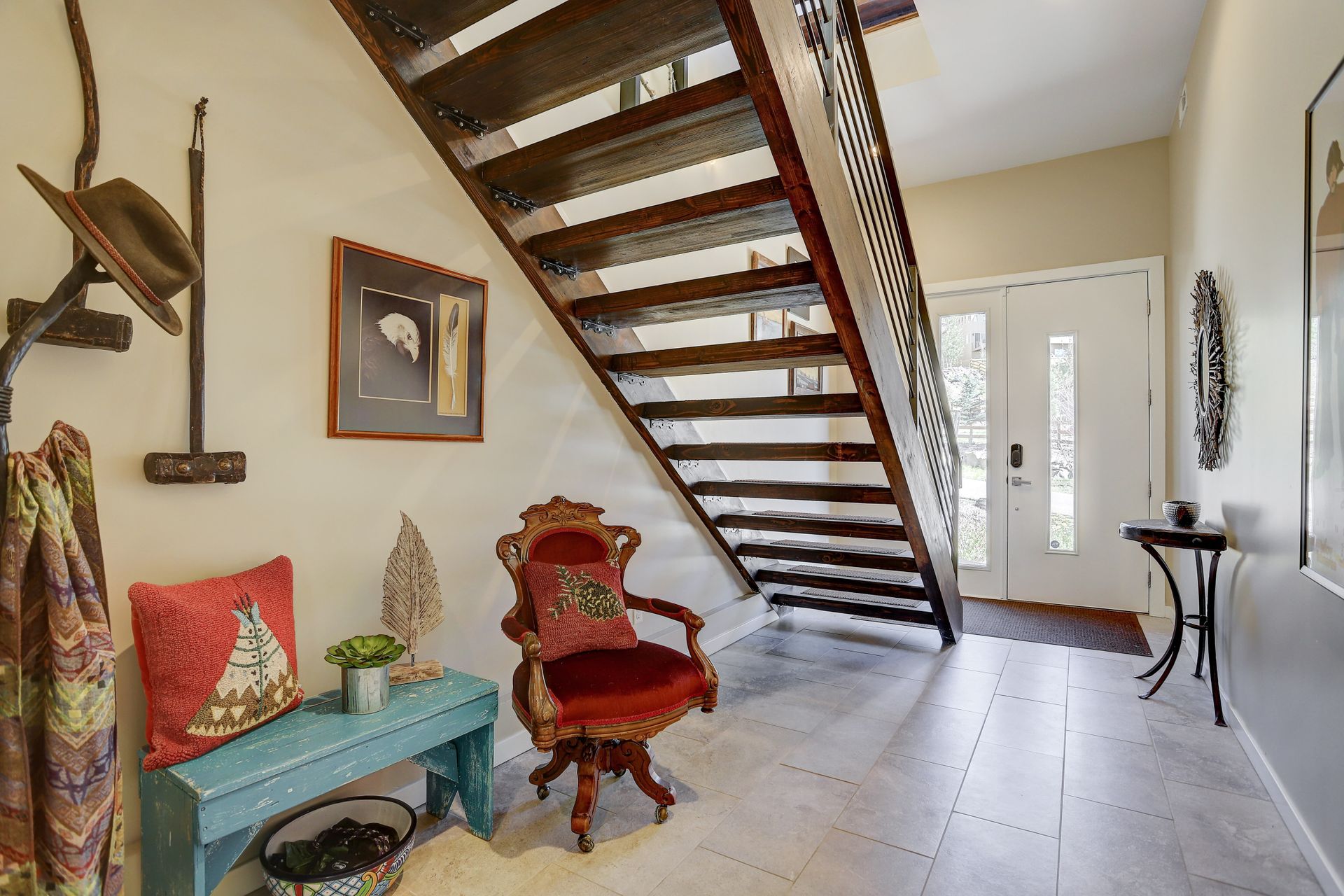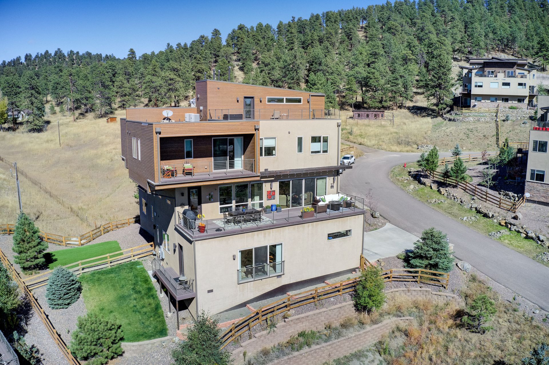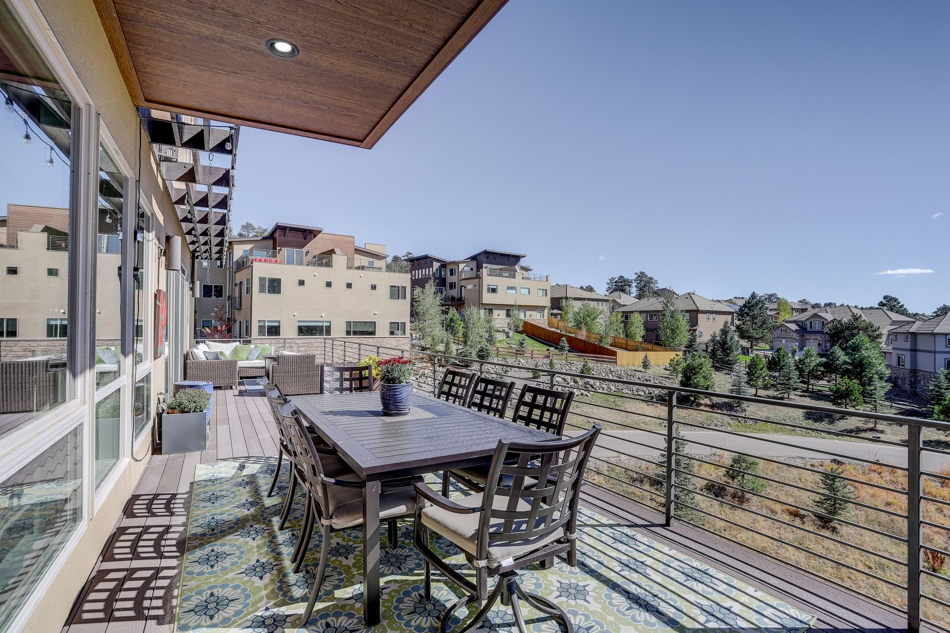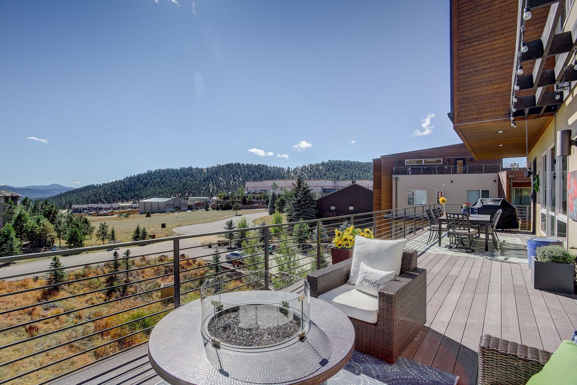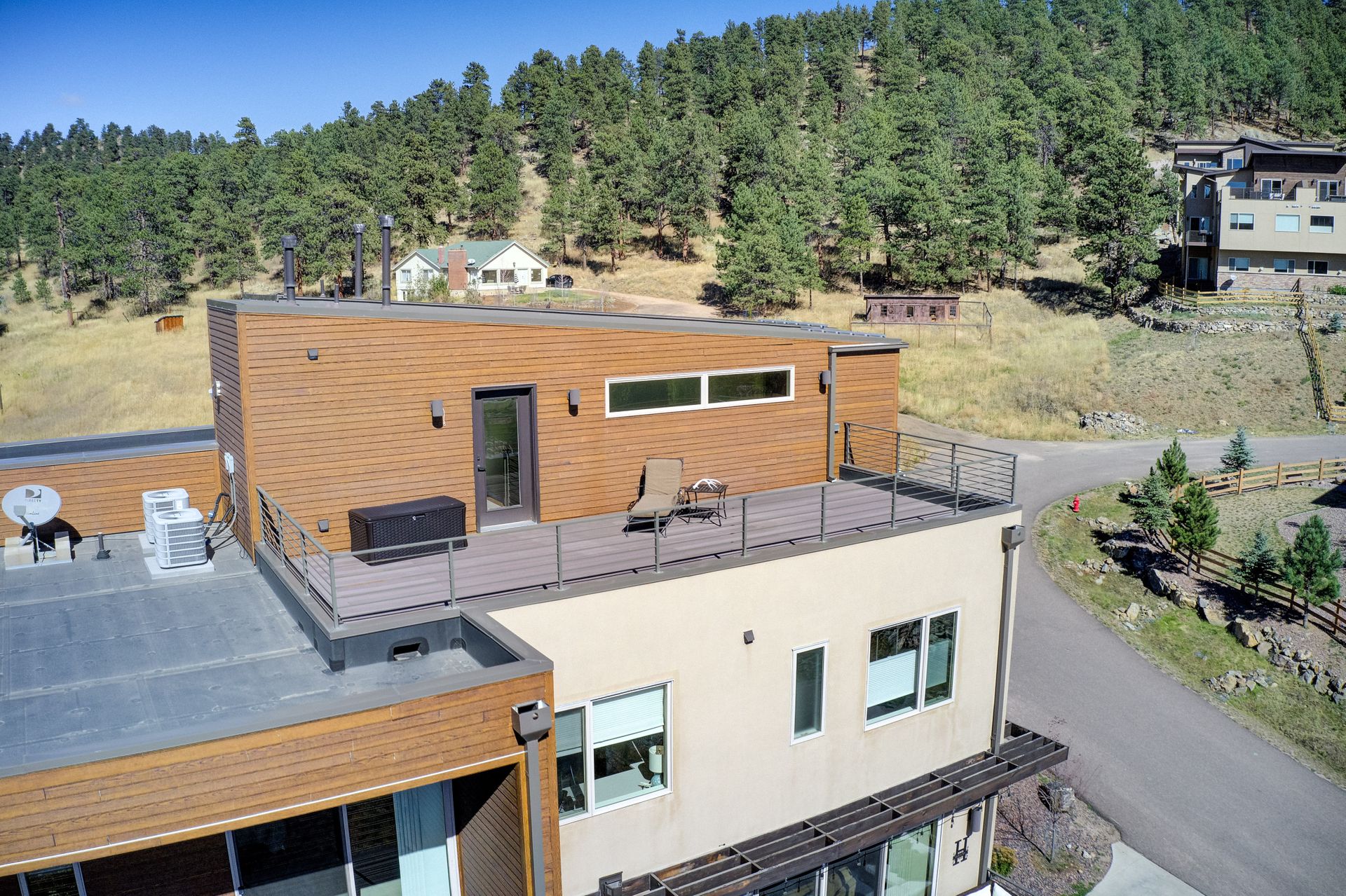 A chic urban townhome with the joys of mountain living–views, easy access to I-70 and all Evergreen has to offer. This exquisitely maintained home has a second story open floor plan featuring hard wood floors, floor to ceiling windows with mountain views and a gorgeous modern kitchen with stainless appliances and quartz countertops. Experience the sunrise and mountain breezes when you exit out onto the outstanding deck to dine or relax. On the third level, a gracious primary suite with a private deck and a spa-like bath including a free-standing tub and two separate vanities and closets. Two bedrooms–one presently an office showcasing the fabulous view, custom office built-ins– a shared bath and a laundry closet complete this floor. Take the stairs to the fourth level deck for peace, quiet and 180° views of the stars-wired and structured for a hot tub. The first floor has a welcoming entry, a fourth bedroom, a beautiful, updated bath and an additional living space with great views, perfect for TV, exercise, music, whatever you want or need. You can head out to a fenced-in, just the right size landscaped yard. This level has newly installed heated tile floors in the entry and bath and new elegant, forced air registers in the living space.