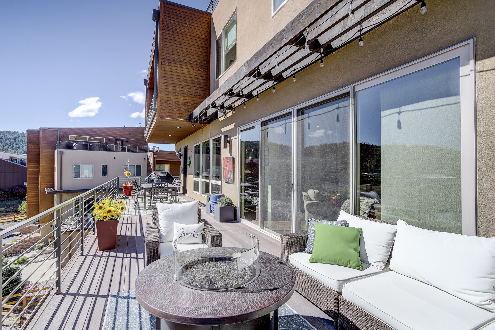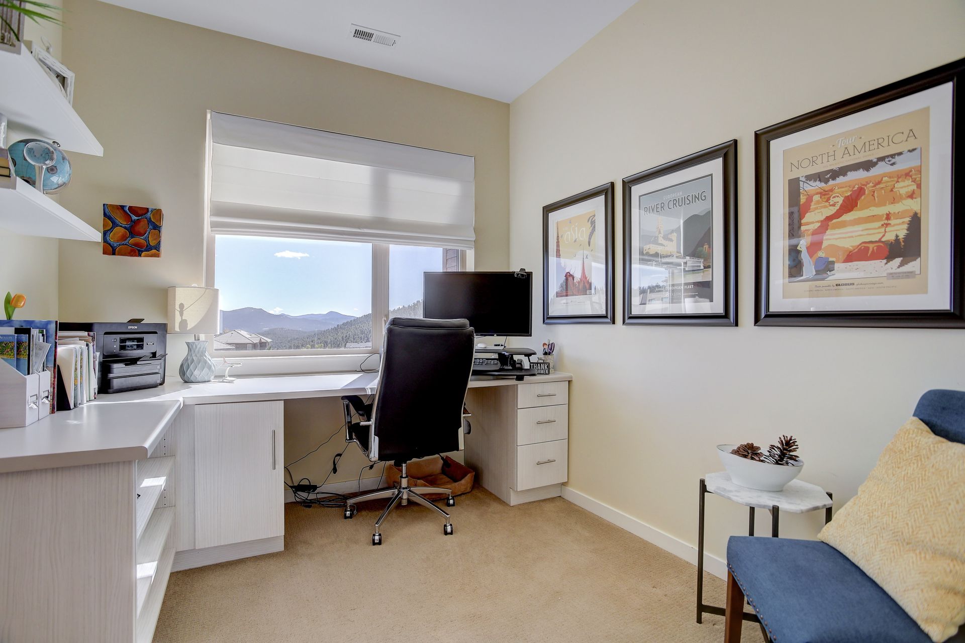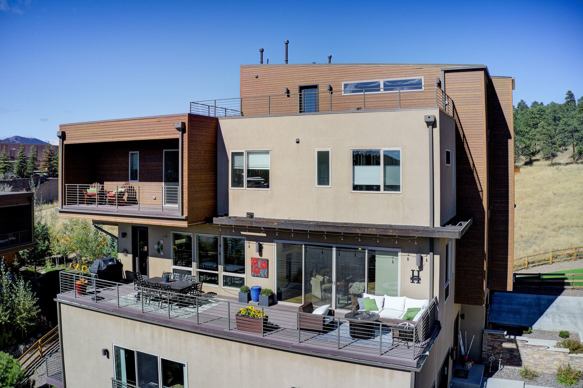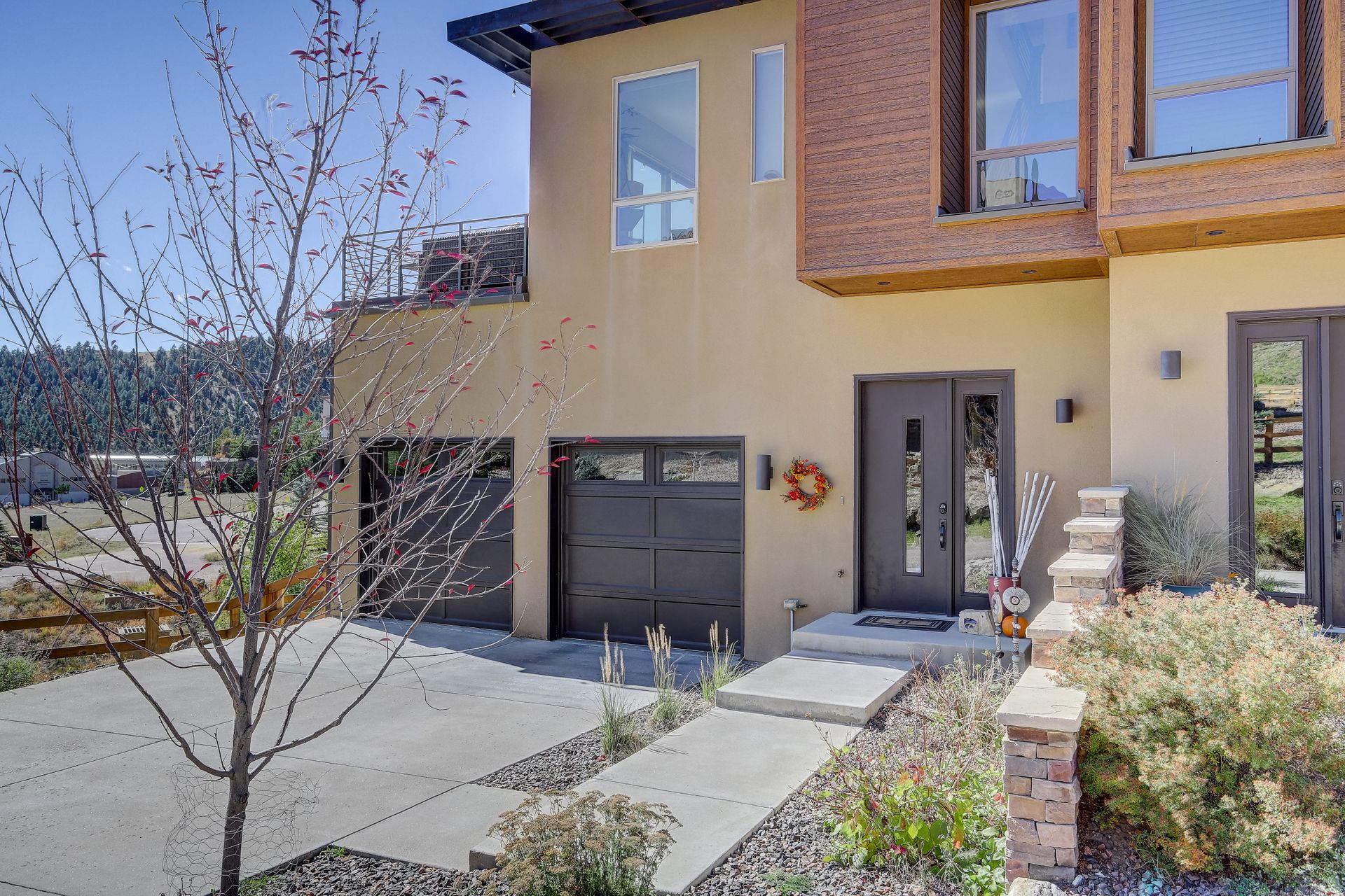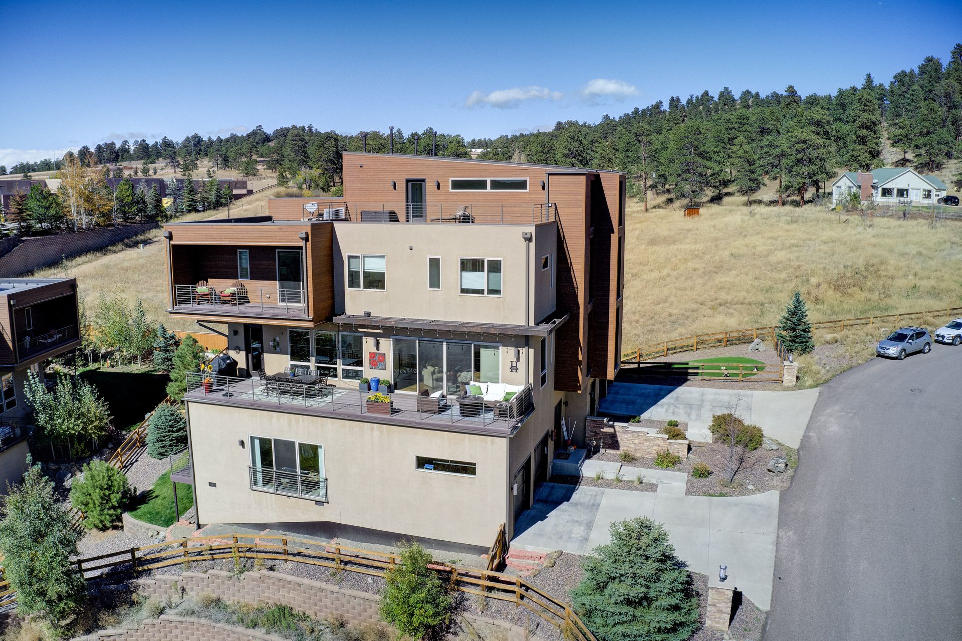 A chic urban townhome with the joys of mountain living–views, easy access to I-70 and all Evergreen has to offer. This exquisitely maintained home has a second story open floor plan featuring hard wood floors, floor to ceiling windows with mountain views and a gorgeous modern kitchen with stainless appliances and quartz countertops. Experience the sunrise and mountain breezes when you exit out onto the outstanding deck to dine or relax. On the third level, a gracious primary suite with a private deck and a spa-like bath including a free-standing tub and two separate vanities and closets. Two bedrooms–one presently an office showcasing the fabulous view, custom office built-ins– a shared bath and a laundry closet complete this floor. Take the stairs to the fourth level deck for peace, quiet and 180° views of the stars-wired and structured for a hot tub. The first floor has a welcoming entry, a fourth bedroom, a beautiful, updated bath and an additional living space with great views, perfect for TV, exercise, music, whatever you want or need. You can head out to a fenced-in, just the right size landscaped yard. This level has newly installed heated tile floors in the entry and bath and new elegant, forced air registers in the living space.