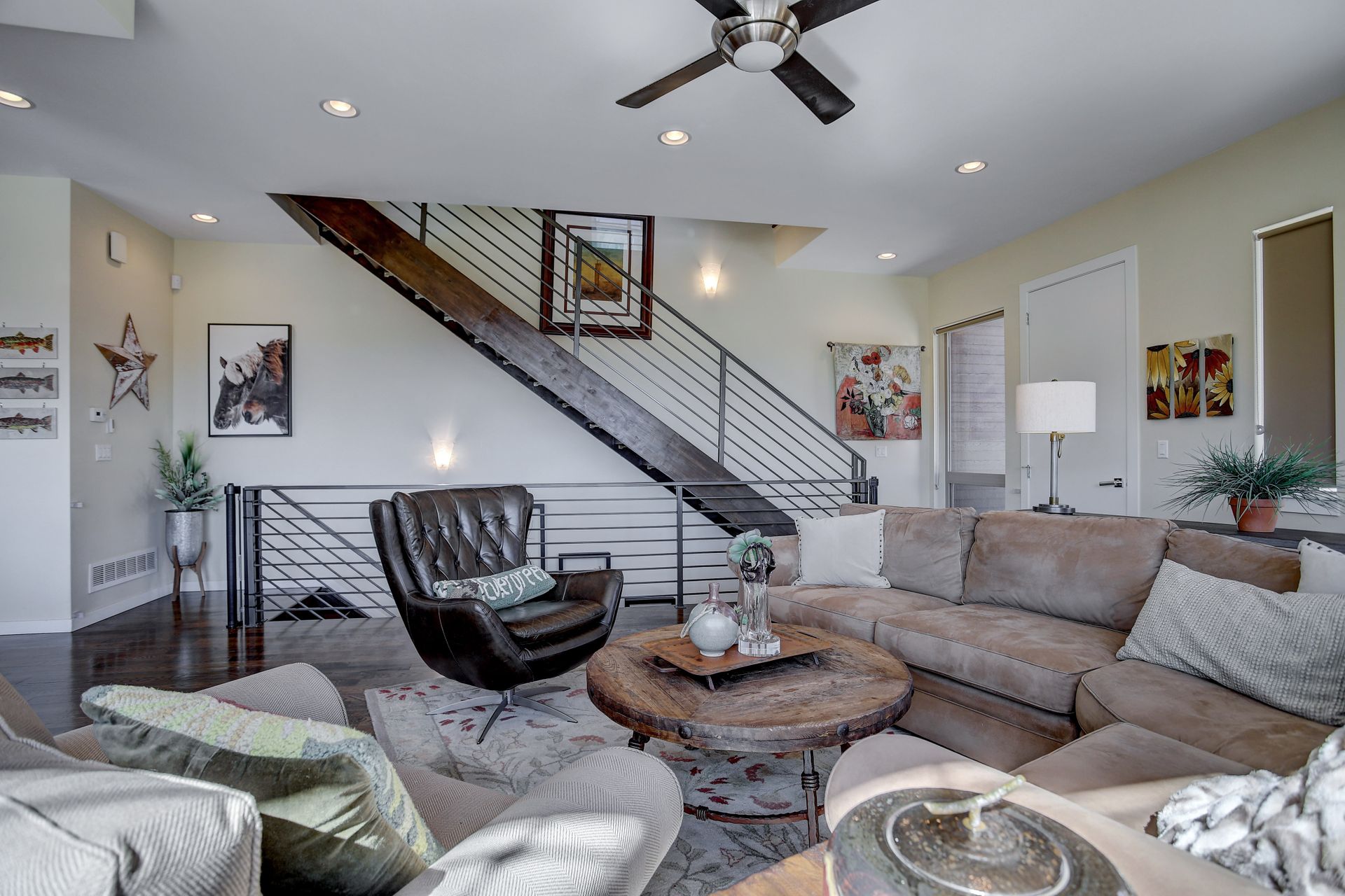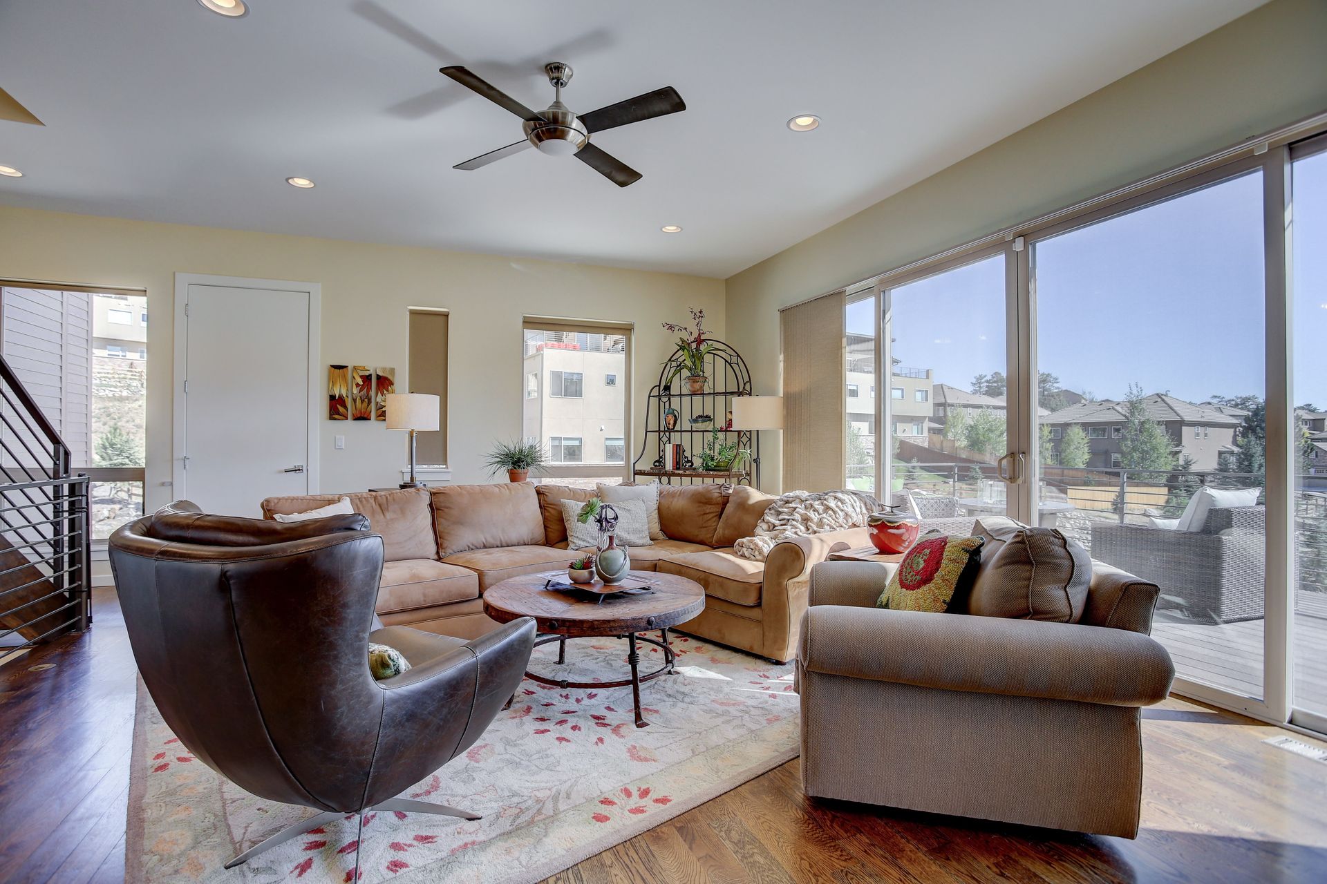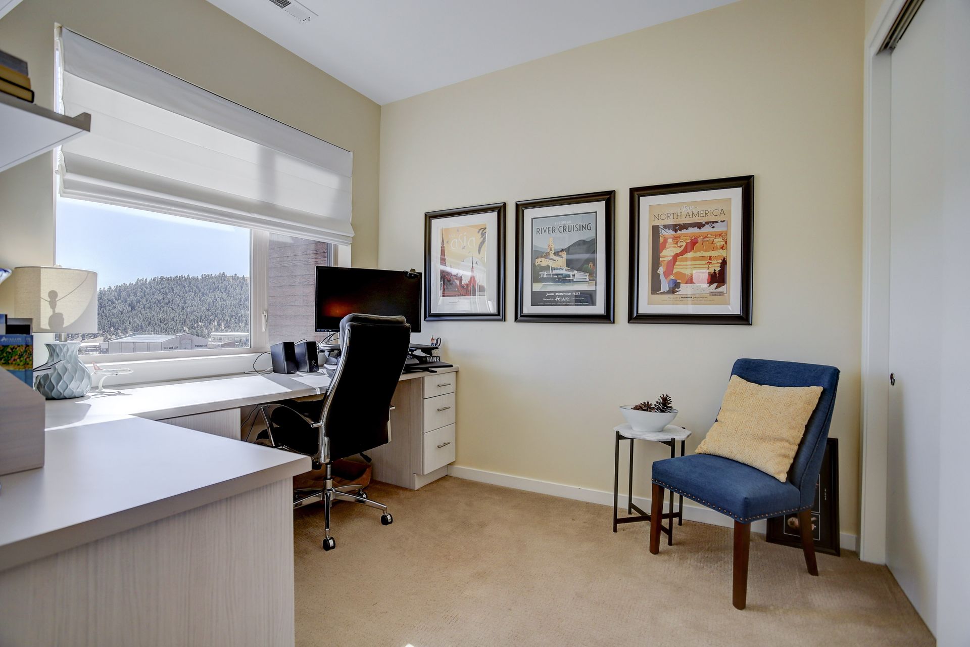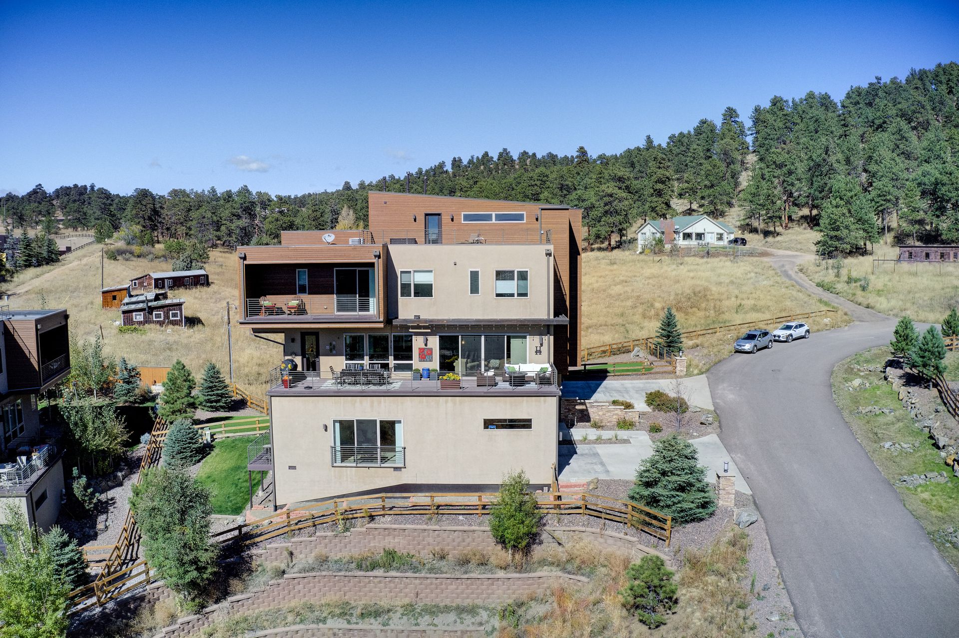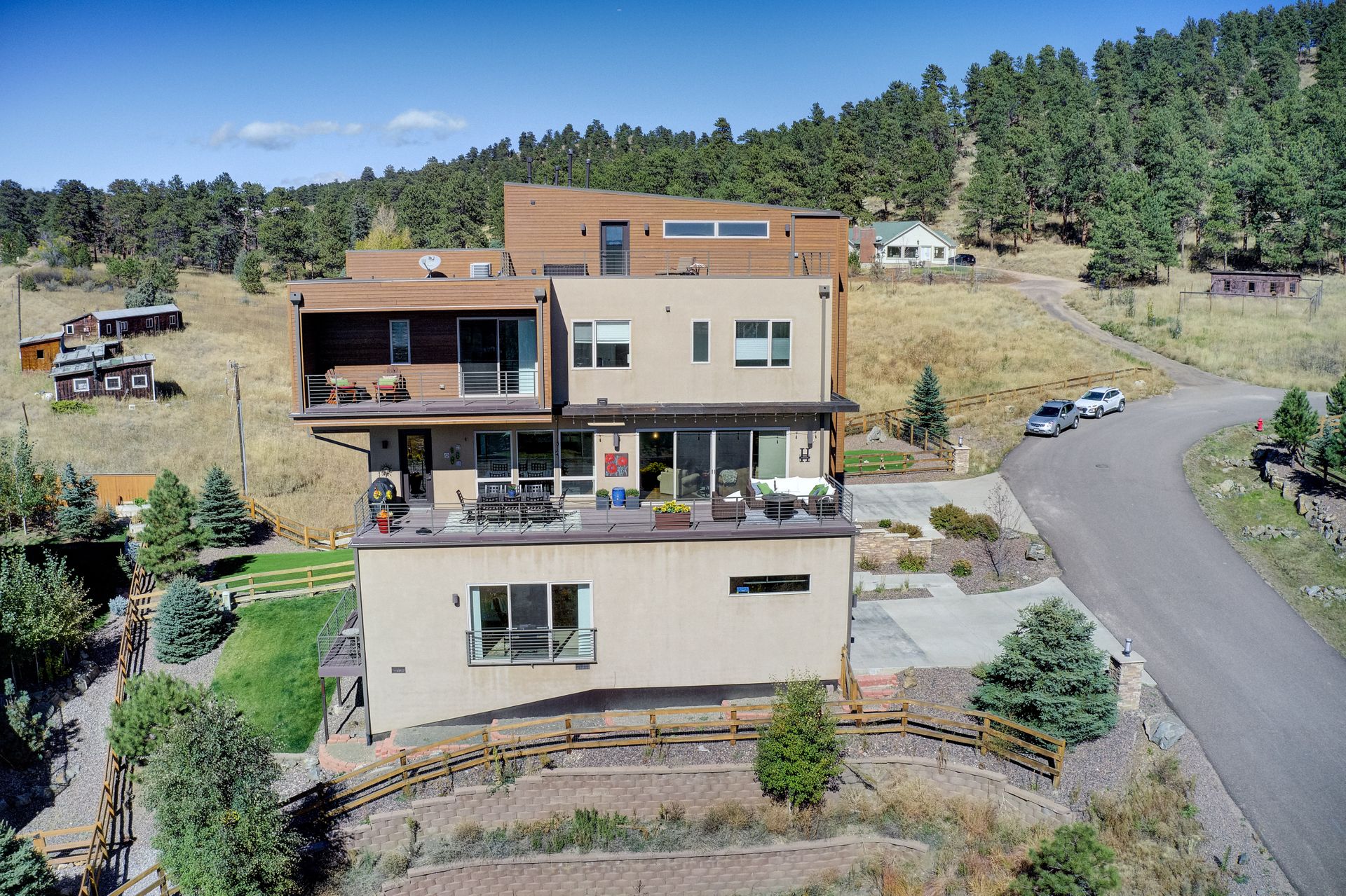 A chic urban townhome with the joys of mountain living–views, easy access to I-70 and all Evergreen has to offer. This exquisitely maintained home has a second story open floor plan featuring hard wood floors, floor to ceiling windows with mountain views and a gorgeous modern kitchen with stainless appliances and quartz countertops. Experience the sunrise and mountain breezes when you exit out onto the outstanding deck to dine or relax. On the third level, a gracious primary suite with a private deck and a spa-like bath including a free-standing tub and two separate vanities and closets. Two bedrooms–one presently an office showcasing the fabulous view, custom office built-ins– a shared bath and a laundry closet complete this floor. Take the stairs to the fourth level deck for peace, quiet and 180° views of the stars-wired and structured for a hot tub. The first floor has a welcoming entry, a fourth bedroom, a beautiful, updated bath and an additional living space with great views, perfect for TV, exercise, music, whatever you want or need. You can head out to a fenced-in, just the right size landscaped yard. This level has newly installed heated tile floors in the entry and bath and new elegant, forced air registers in the living space.