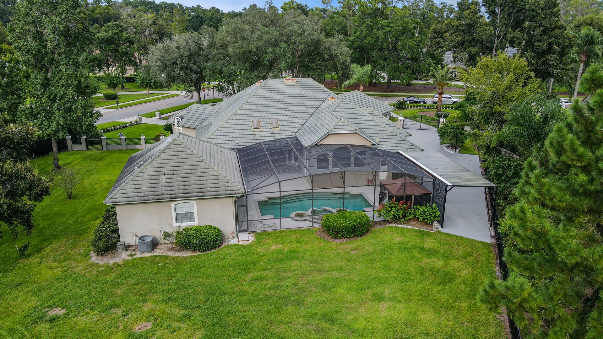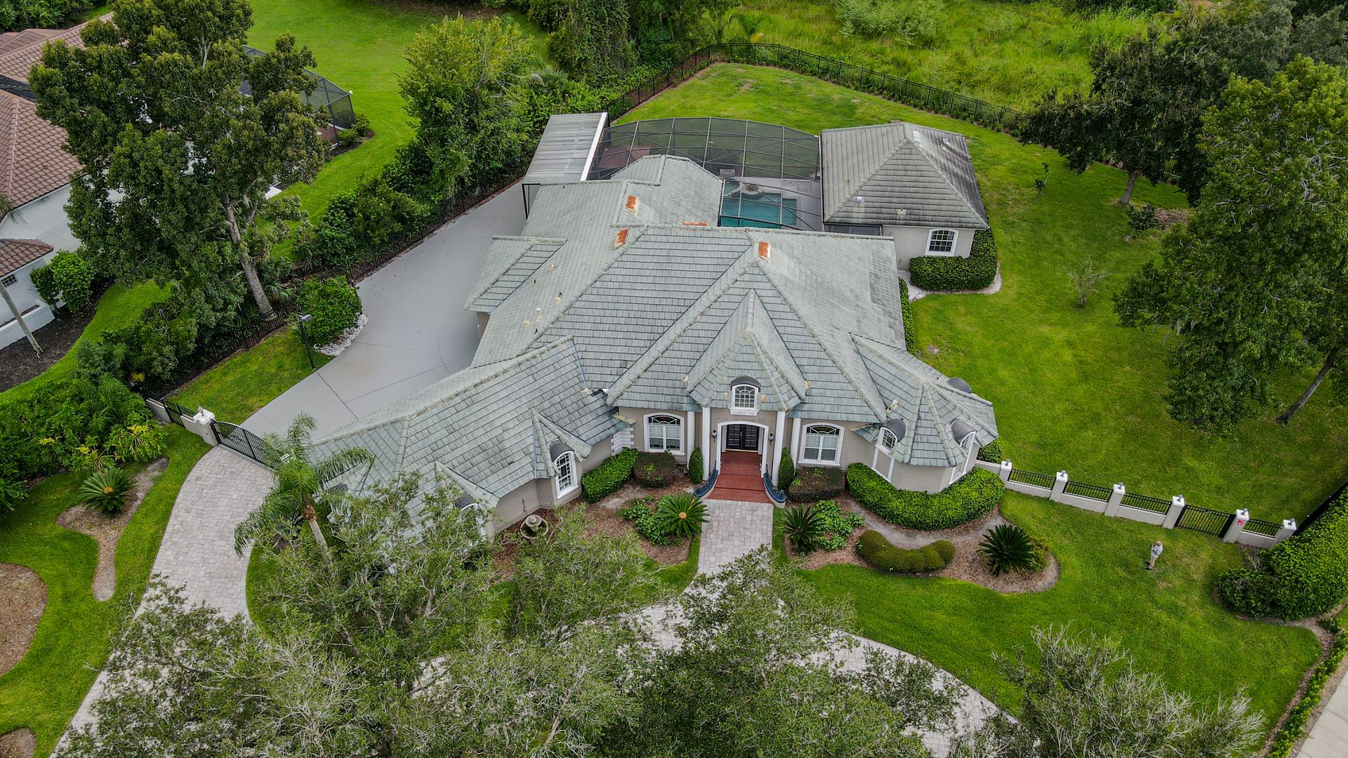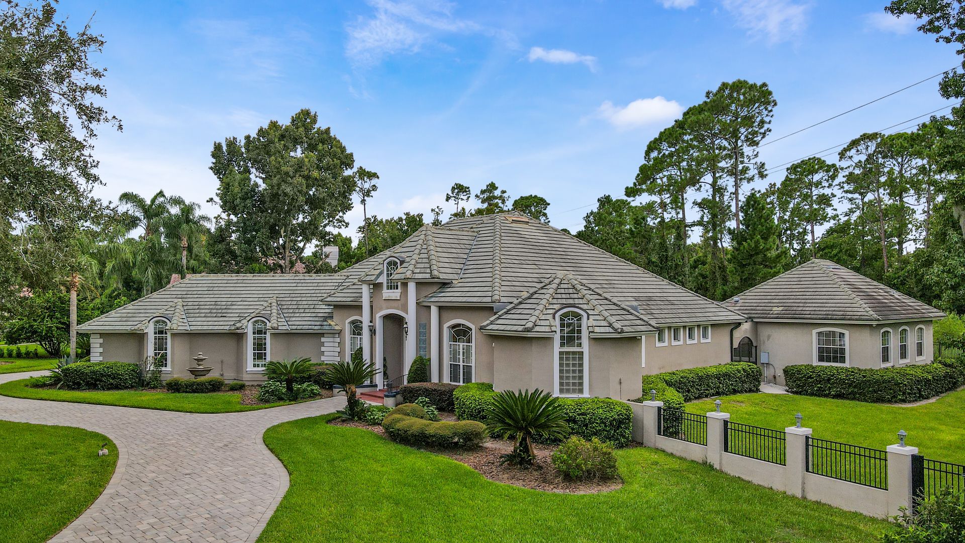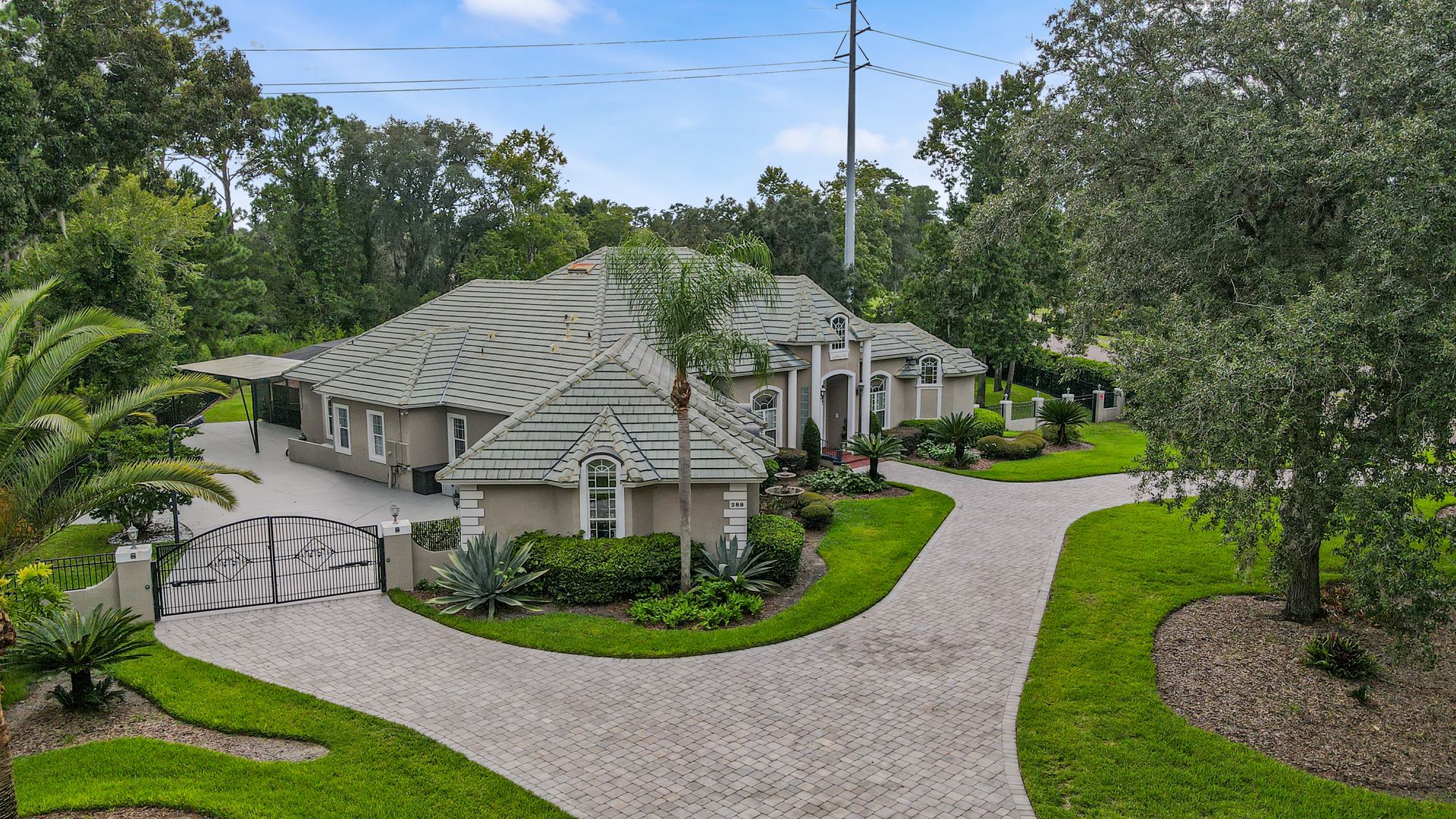 Welcome to Heathrow Woods and this Private Custom Estate located on an Acre Lot. Featuring 5 Bedrooms and 6 Baths with 4,244 SF. Executive Office with custom woodwork to the right as you enter the foyer. Fully fenced backyard and corner lot with tree line views. Well maintained main home with newer guest house added. Marble and hardwood flooring. Split floorplan. Main house has 4 Bedrooms plus an executive office. Guest house has bedroom with full bath including a steam room and a bonus room with a kitchenette and half bath. Gourmet kitchen with granite countertops, white cabinetry, and separate kitchen nook with additional counter space. Kitchen opens to the family room with large windows, gas fireplace, and doors to the lanai. Relax in the screened lanai with pool, fountain, and a separate spa with covered and tiled seating areas. Plenty of parking space with a circular driveway and a private motorized gated 3 car side entry garage. Additional electrical outlets for RV and boat. Extended polycarbonate roof cover off the pool area for shaded parking or entertaining. Walk in attic with lighting for storage above the garage.  Heathrow is a highly desired gated golf course community with an exclusive Country Club. 18 hole Golf course designed by Ron Garl just minutes from your front door. Highly rated School System. Heathrow Woods is a private 24 hour guard gated community with all homes on at least one acre lots.