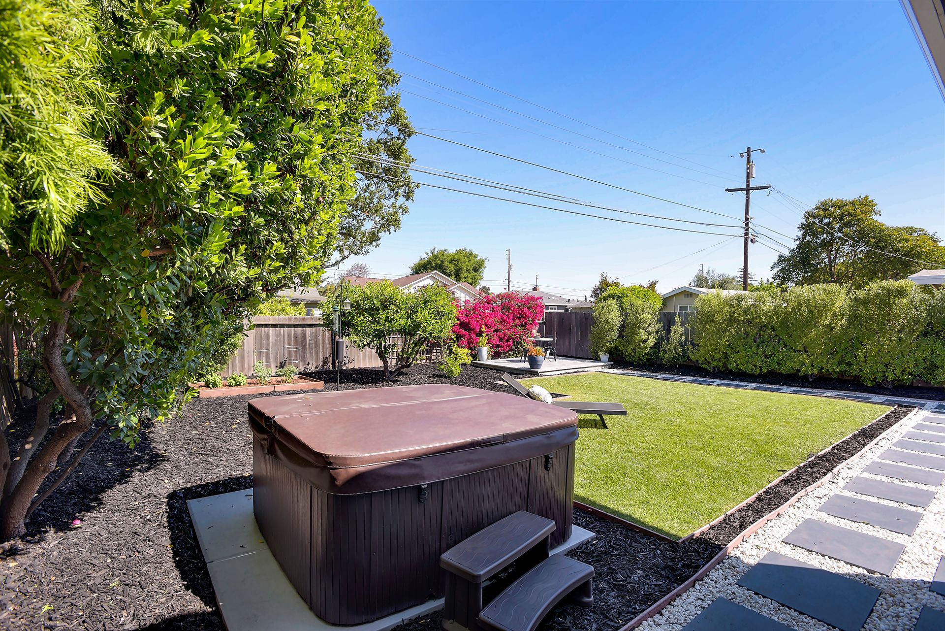 A sliding glass door opens from the living room leading to one of the most inviting and well-appointed flat backyards around, providing zen and relaxation after a busy day. There are multiple patio seating areas, a neatly manicured grass section set up with a Rachio smart sprinkler/drip line system on the spacious 6k square feet lot. Unwind in your therapeutic hot tub or enjoy a glass of lemonade around the fire pit, appreciating the visuals and aroma of plants, flowers, vegetable garden, and even your own mature lemon tree!