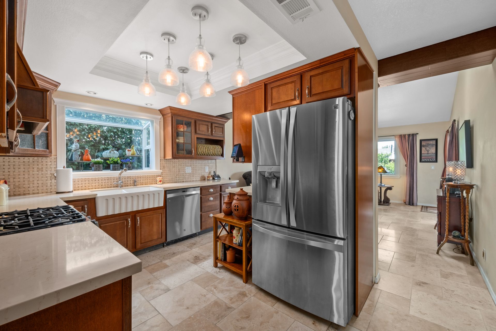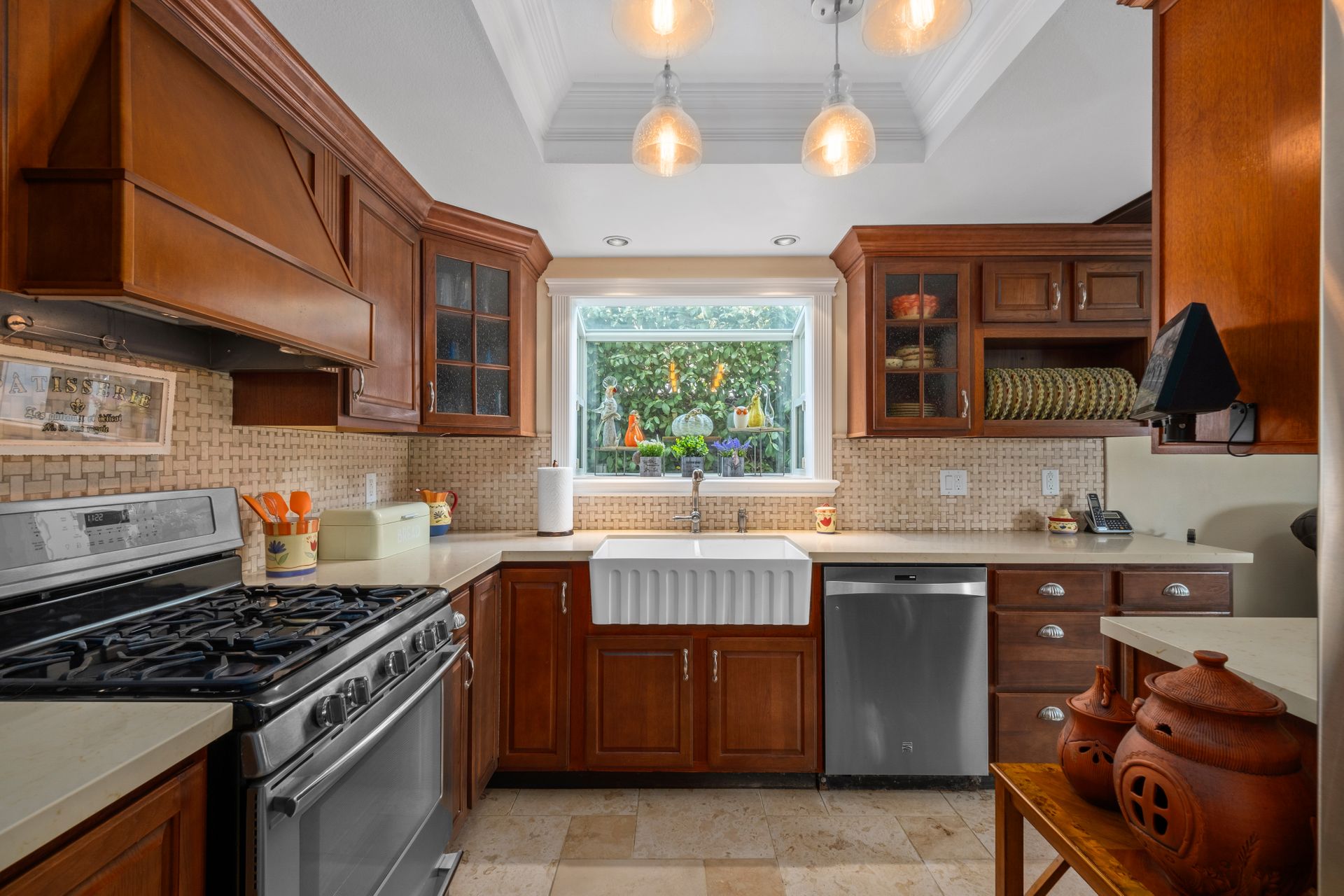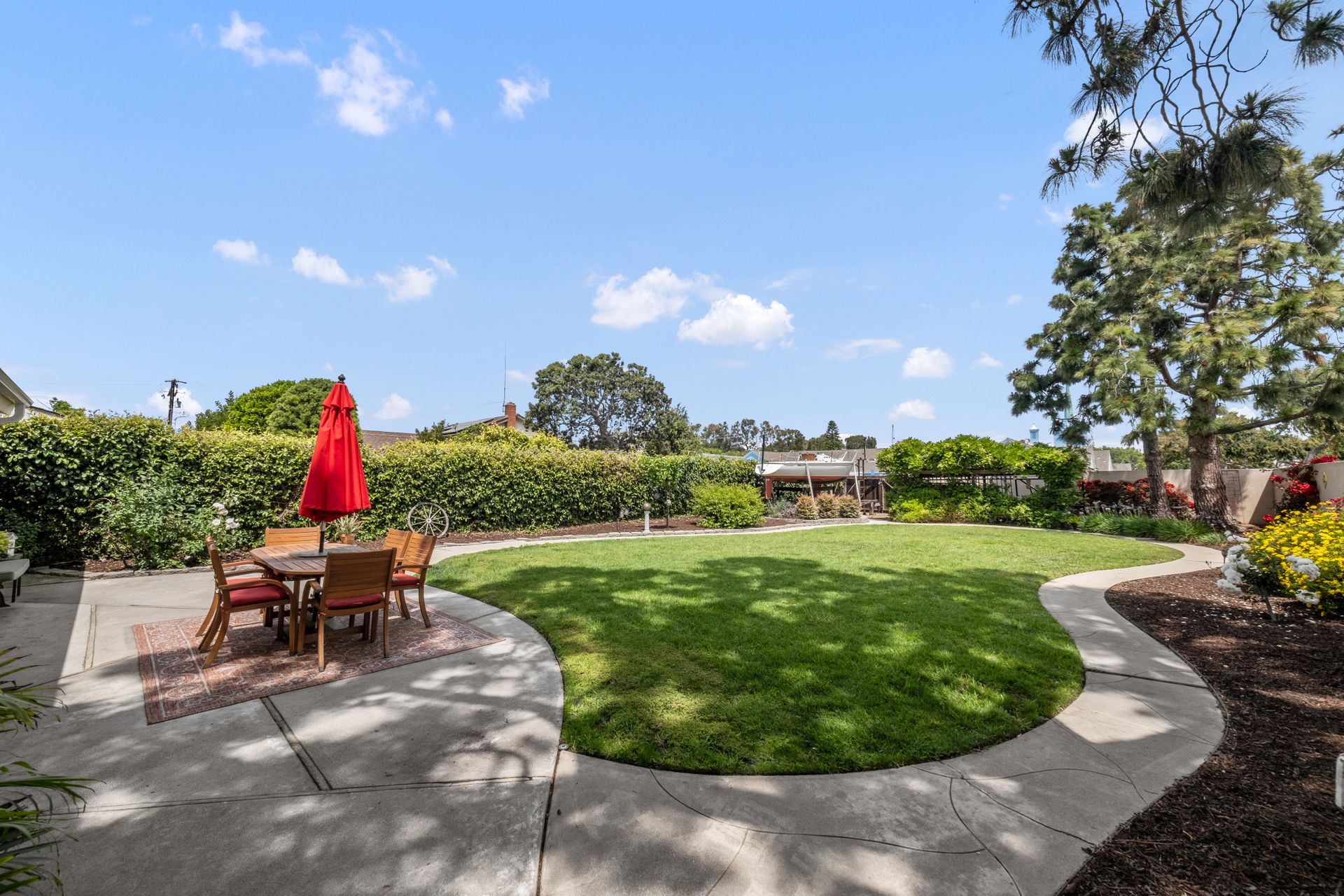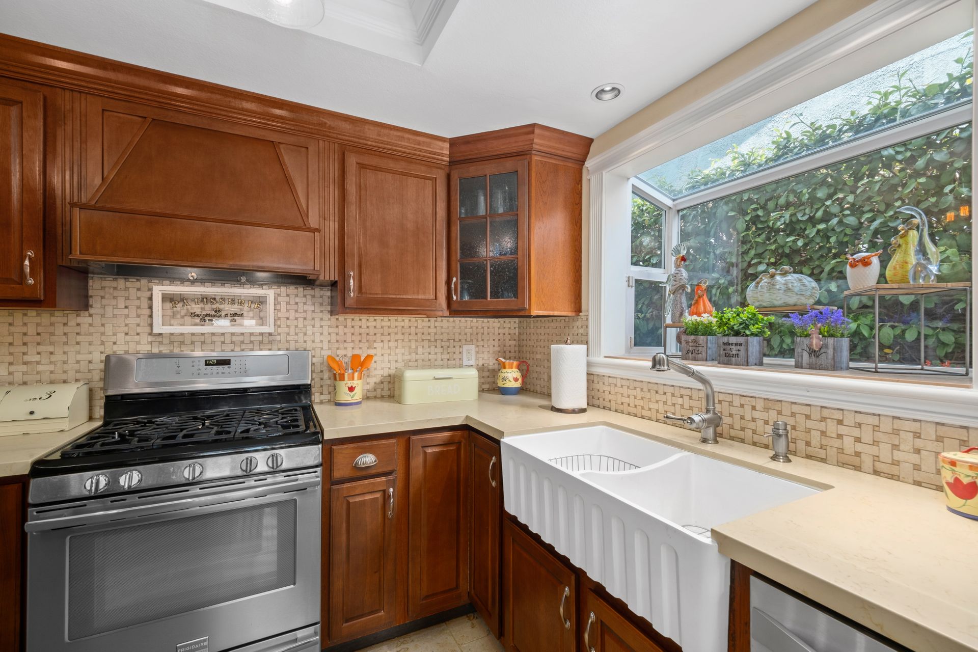 Welcome to this lovingly cared for four bedroom, two bath home in desirable Torrance Gardens! Direct access from the primary bedroom, family room and additional bedroom to an exceptional and huge backyard (approximately 8,600 square feet). It will be your own private sanctuary. The kitchen was stylishly remodeled a few years ago with hickory cabinets, pull-out drawers, quartz counters and stainless steel appliances, plus a custom four-foot wide pantry, a quartz farmhouse sink and a garden window. The kitchen is adjacent to the family room which shares natural stone travertine tile and showcases a vaulted ceiling and bar. The open living room has a gas fireplace, a vaulted beamed ceiling and is integrated with the dining area which features a lovely alcove wet bar with matching hickory cabinets and a quartz countertop. The primary bath and second bathroom include radiant heat travertine floors, hardwood cabinets with marble counter tops and unique custom wall tile. Beautiful flooring throughout the entire house in either travertine or birch hardwood. The roof was recently replaced and provides skylights! Most windows are Pella dual pane casement windows. Lots of extra storage in attic. Don't miss out on this fabulous opportunity!