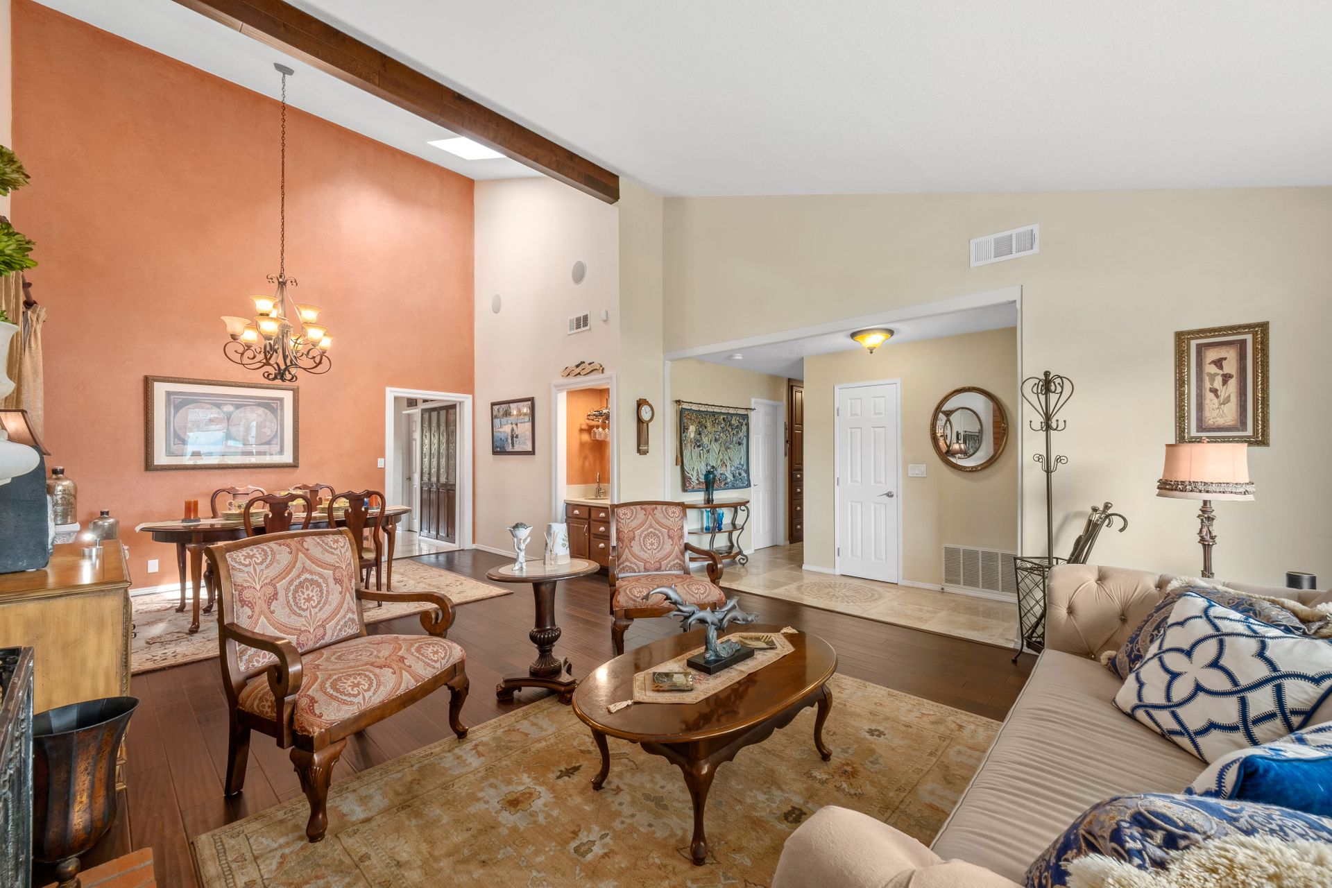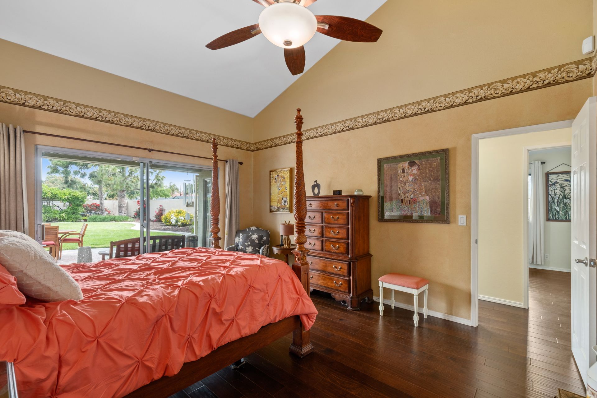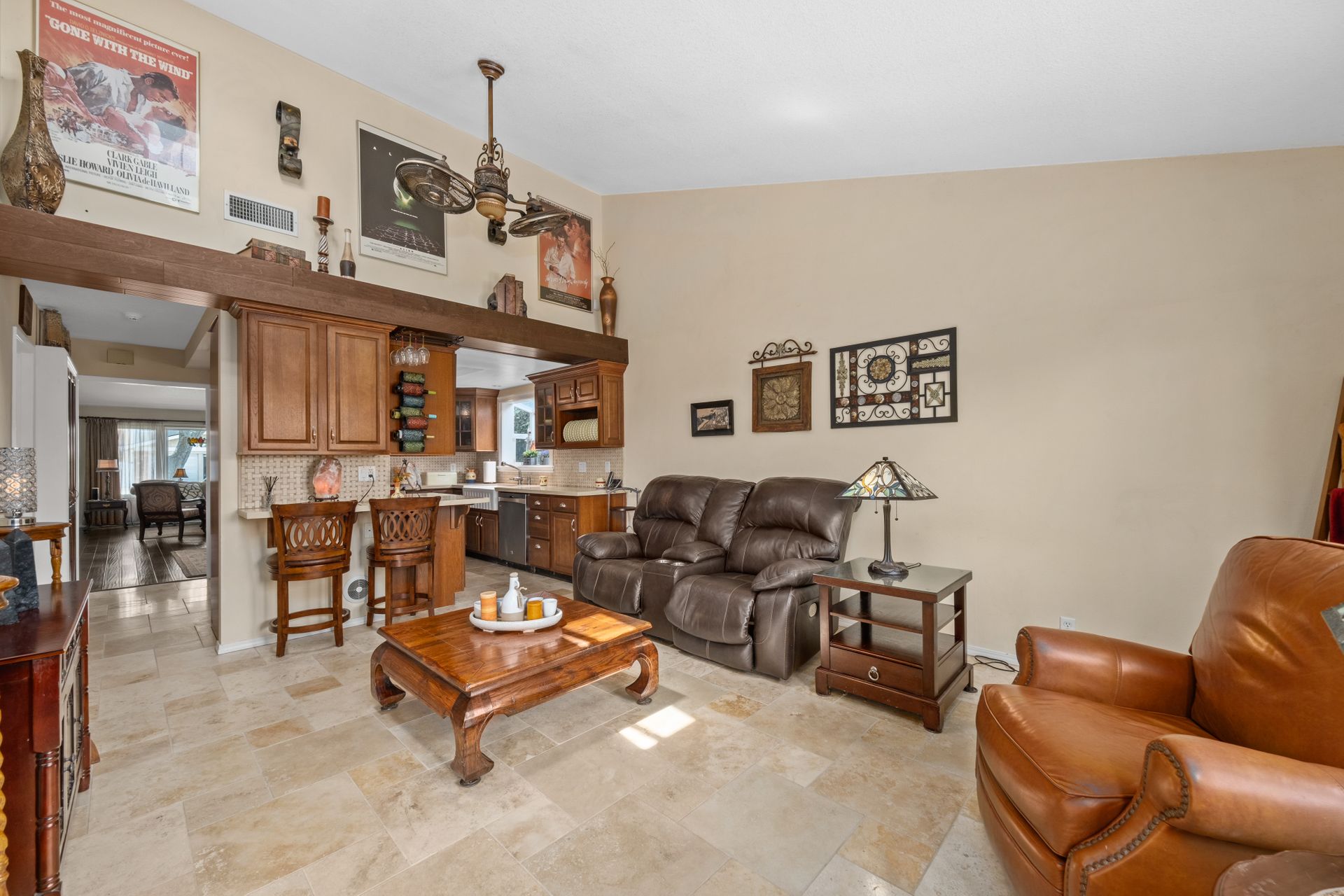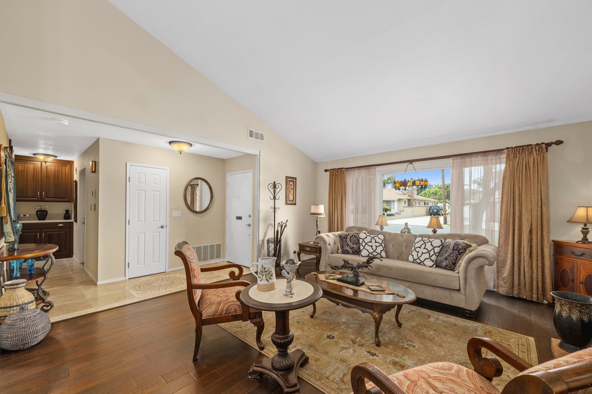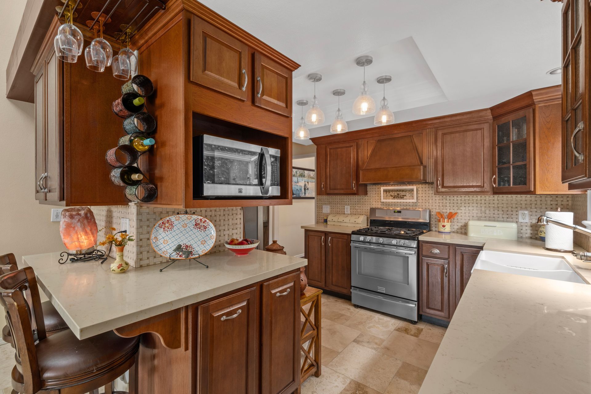 Welcome to this lovingly cared for four bedroom, two bath home in desirable Torrance Gardens! Direct access from the primary bedroom, family room and additional bedroom to an exceptional and huge backyard (approximately 8,600 square feet). It will be your own private sanctuary. The kitchen was stylishly remodeled a few years ago with hickory cabinets, pull-out drawers, quartz counters and stainless steel appliances, plus a custom four-foot wide pantry, a quartz farmhouse sink and a garden window. The kitchen is adjacent to the family room which shares natural stone travertine tile and showcases a vaulted ceiling and bar. The open living room has a gas fireplace, a vaulted beamed ceiling and is integrated with the dining area which features a lovely alcove wet bar with matching hickory cabinets and a quartz countertop. The primary bath and second bathroom include radiant heat travertine floors, hardwood cabinets with marble counter tops and unique custom wall tile. Beautiful flooring throughout the entire house in either travertine or birch hardwood. The roof was recently replaced and provides skylights! Most windows are Pella dual pane casement windows. Lots of extra storage in attic. Don't miss out on this fabulous opportunity!