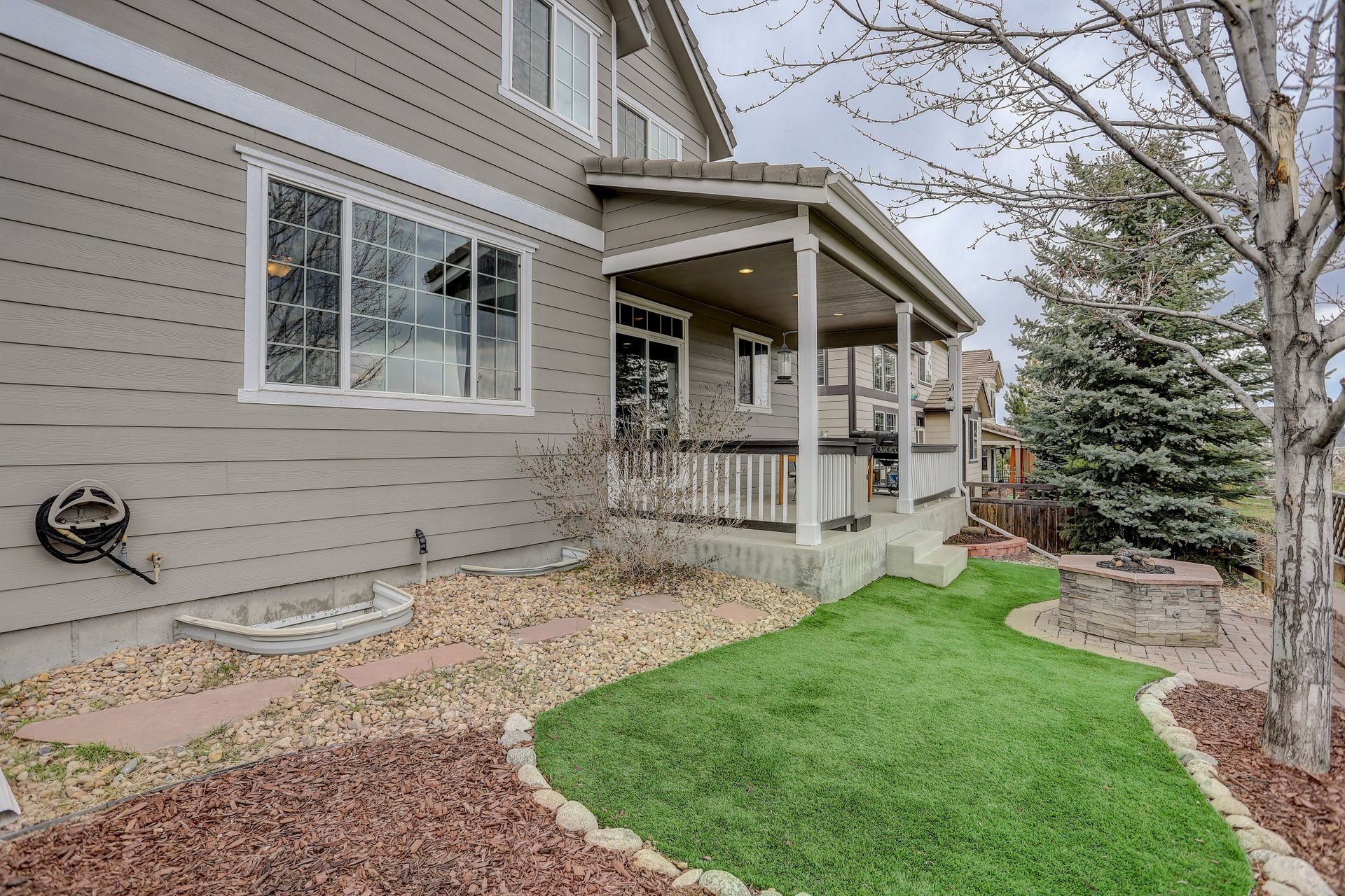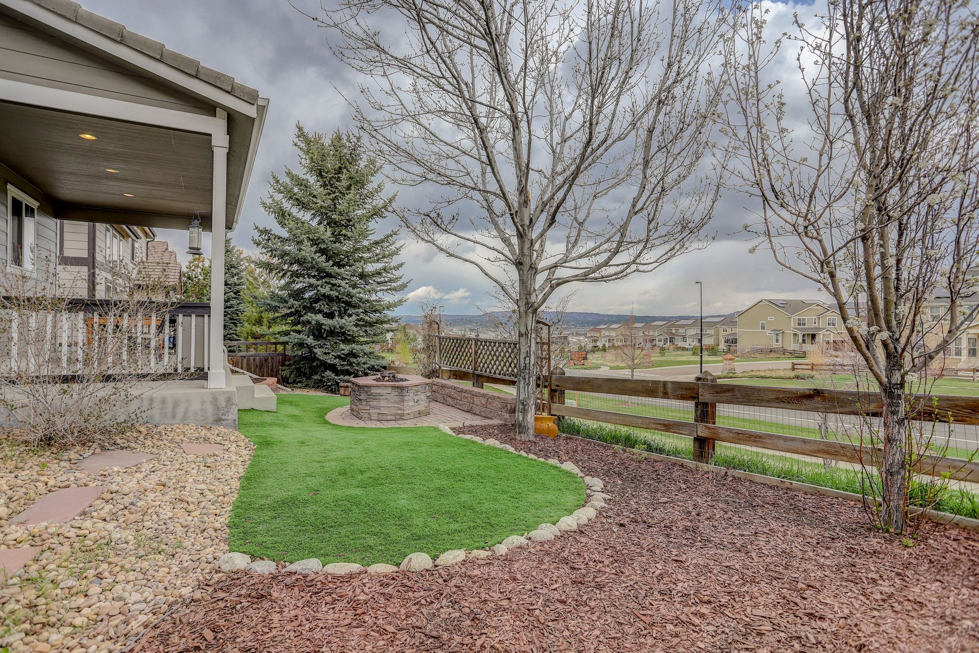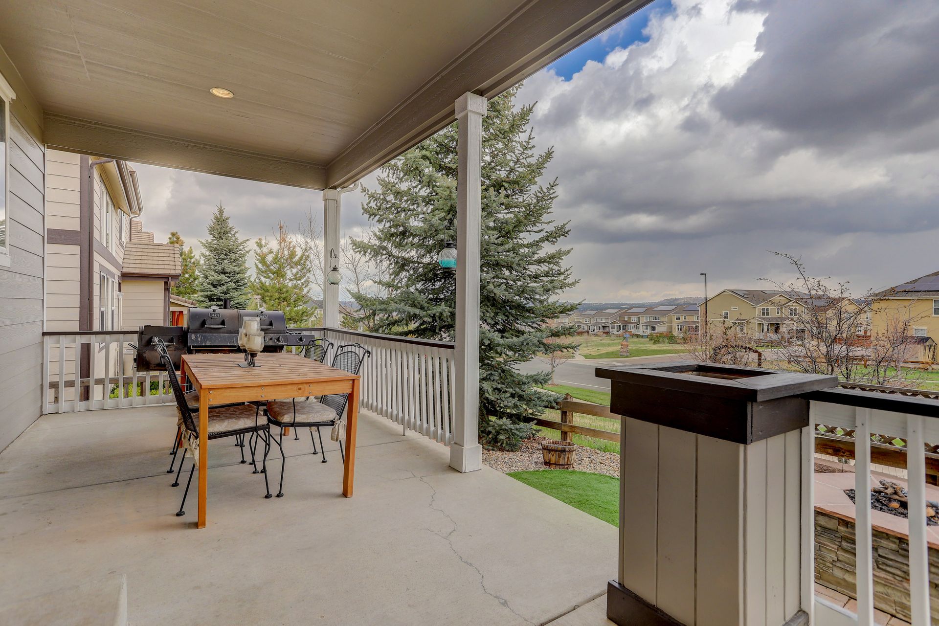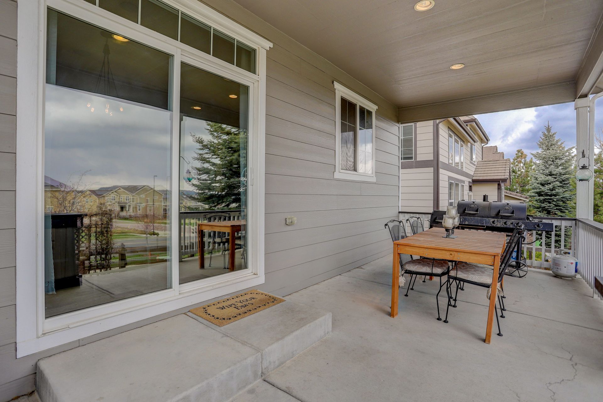 This dazzling home in The Meadows greets you with a charming, covered front porch, designer upgrades, hand-scraped wood floors throughout the main level and an open floor plan. Host dinners in style in this formal dining room featuring a tray ceiling with crown molding, a large bay window and a butler’s pantry that offers a sink, wine storage, walk-in pantry and beverage fridge. The chef’s kitchen features 42-inch cherry cabinets, double ovens, an oversized center island, slab granite and a casual dining area that flows out to the covered back patio. This home features an A-Bus home audio system with speakers and controls in the family room, breakfast area, dining room, office and primary bedroom. Your new home office boasts glass French doors and an entire wall of built-in bookshelves. The upper level offers three bedrooms and a full bathroom along with the primary suite. The primary bedroom has tray ceilings with crown molding and a five-piece en-suite bathroom with soaking tub and glass-enclosed Euro shower with rainfall head accented with marble tile. The basement is ideal for entertaining with a large wet bar with a beverage fridge. Enjoy watching movies or gaming in the comfy recreation room. Your guests will love the luxury of the private fifth bedroom and three-quarter bathroom. There is also a large unfinished room (18.5-foot by 15.5-foot) just waiting to be another bedroom, an exercise room, wine cellar or whatever else you can dream of. You will enjoy sitting around the fire pit or dining under the covered patio in this low-maintenance yard. The park across the street is only the beginning of the amenities you will enjoy in The Meadows. This community offers parks, a pool, trails, community space and events. The Outlets and Promenade at Castle Rock provide all the shopping and restaurants you could wish for. Centrally located between Colorado Springs and Denver makes for a fast commute and quick access to all the recreation the front range provides.