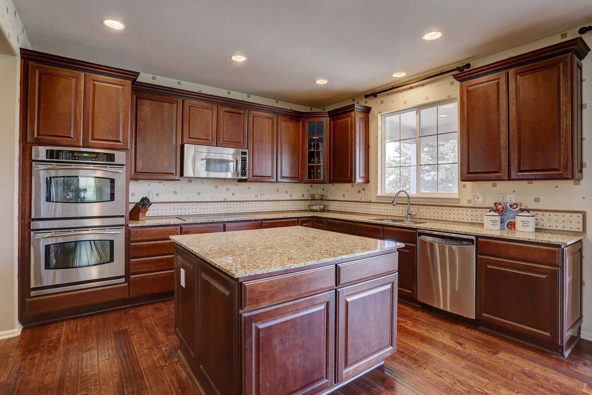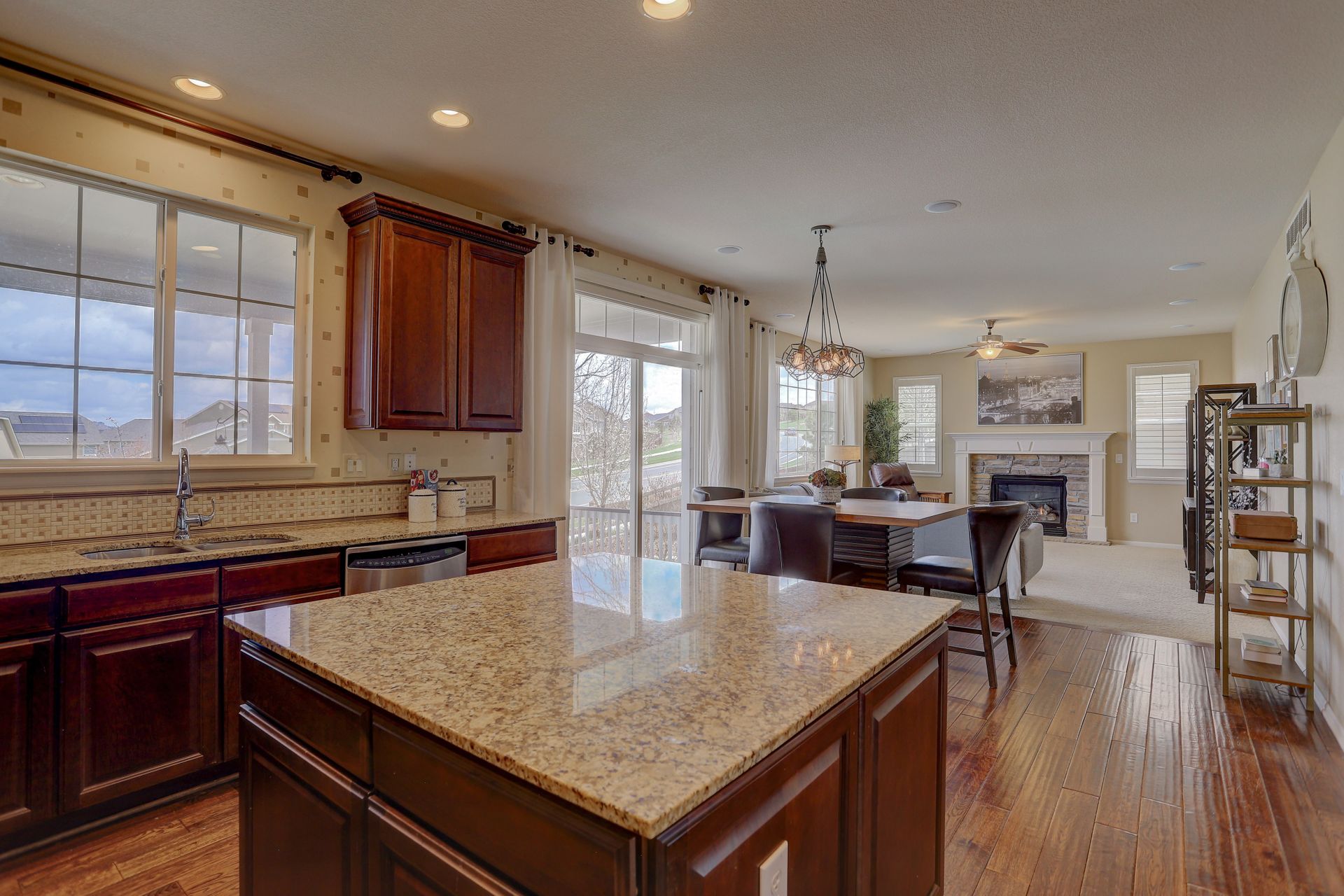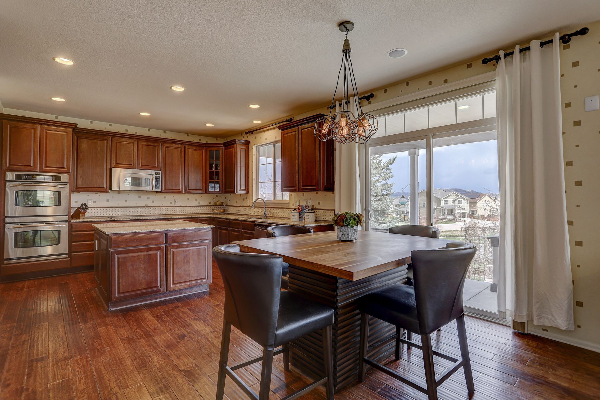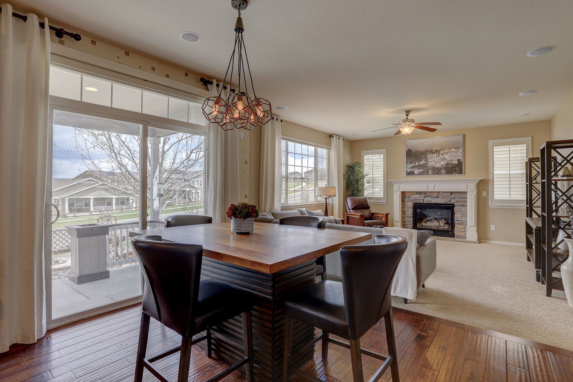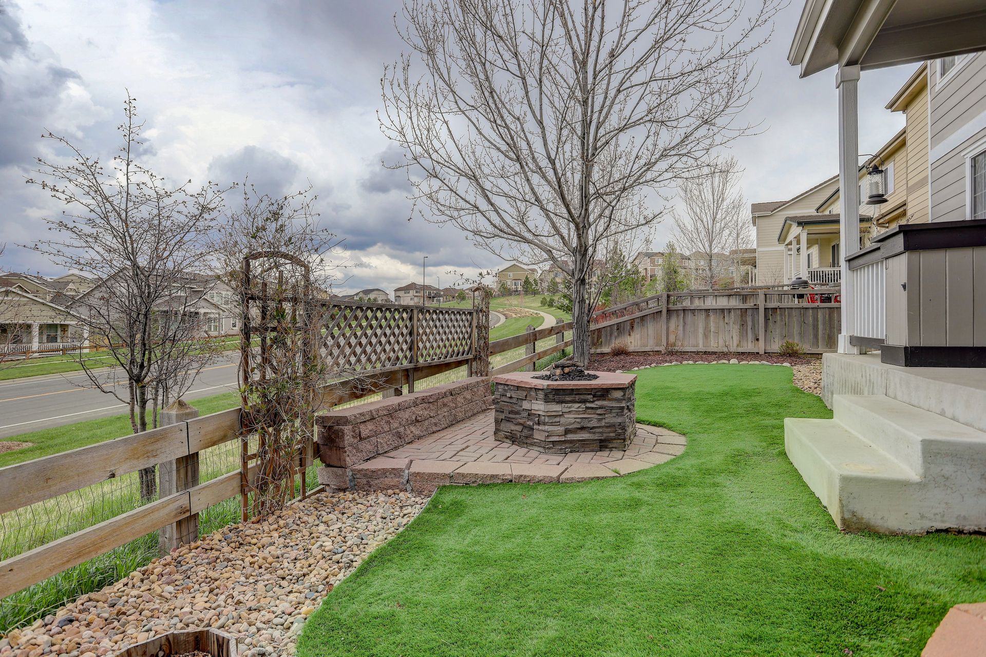 This dazzling home in The Meadows greets you with a charming, covered front porch, designer upgrades, hand-scraped wood floors throughout the main level and an open floor plan. Host dinners in style in this formal dining room featuring a tray ceiling with crown molding, a large bay window and a butler’s pantry that offers a sink, wine storage, walk-in pantry and beverage fridge. The chef’s kitchen features 42-inch cherry cabinets, double ovens, an oversized center island, slab granite and a casual dining area that flows out to the covered back patio. This home features an A-Bus home audio system with speakers and controls in the family room, breakfast area, dining room, office and primary bedroom. Your new home office boasts glass French doors and an entire wall of built-in bookshelves. The upper level offers three bedrooms and a full bathroom along with the primary suite. The primary bedroom has tray ceilings with crown molding and a five-piece en-suite bathroom with soaking tub and glass-enclosed Euro shower with rainfall head accented with marble tile. The basement is ideal for entertaining with a large wet bar with a beverage fridge. Enjoy watching movies or gaming in the comfy recreation room. Your guests will love the luxury of the private fifth bedroom and three-quarter bathroom. There is also a large unfinished room (18.5-foot by 15.5-foot) just waiting to be another bedroom, an exercise room, wine cellar or whatever else you can dream of. You will enjoy sitting around the fire pit or dining under the covered patio in this low-maintenance yard. The park across the street is only the beginning of the amenities you will enjoy in The Meadows. This community offers parks, a pool, trails, community space and events. The Outlets and Promenade at Castle Rock provide all the shopping and restaurants you could wish for. Centrally located between Colorado Springs and Denver makes for a fast commute and quick access to all the recreation the front range provides.