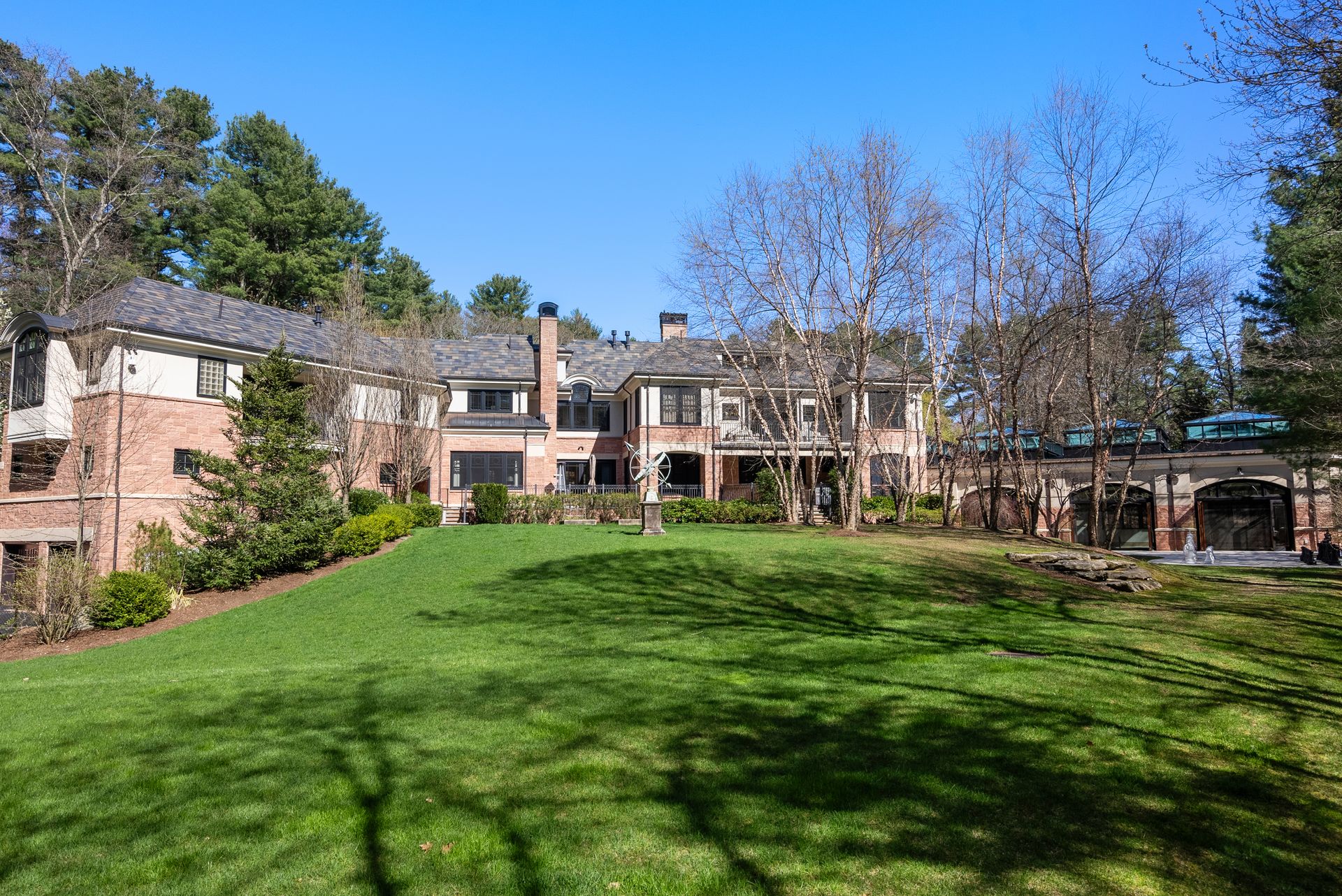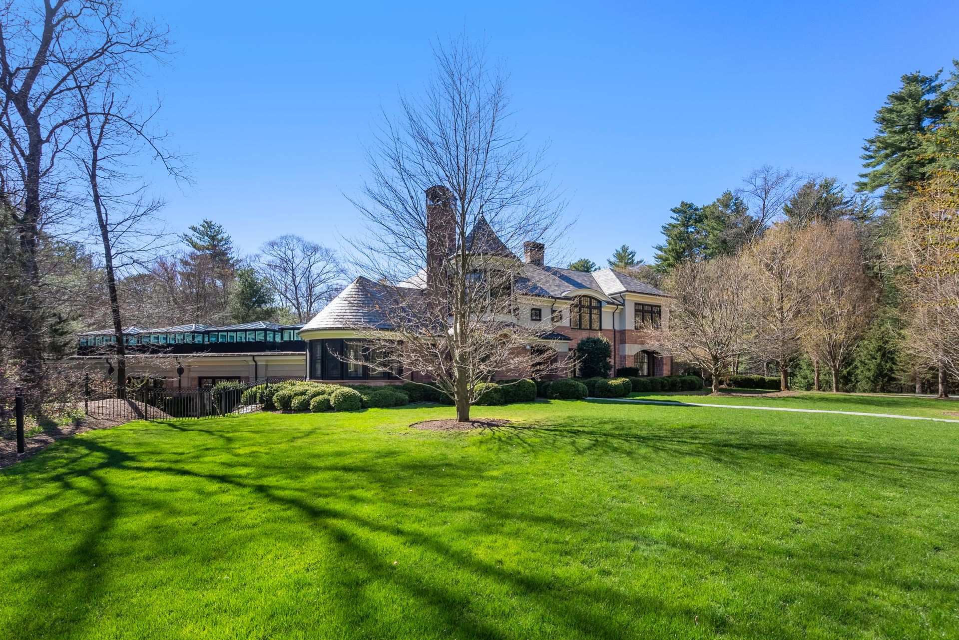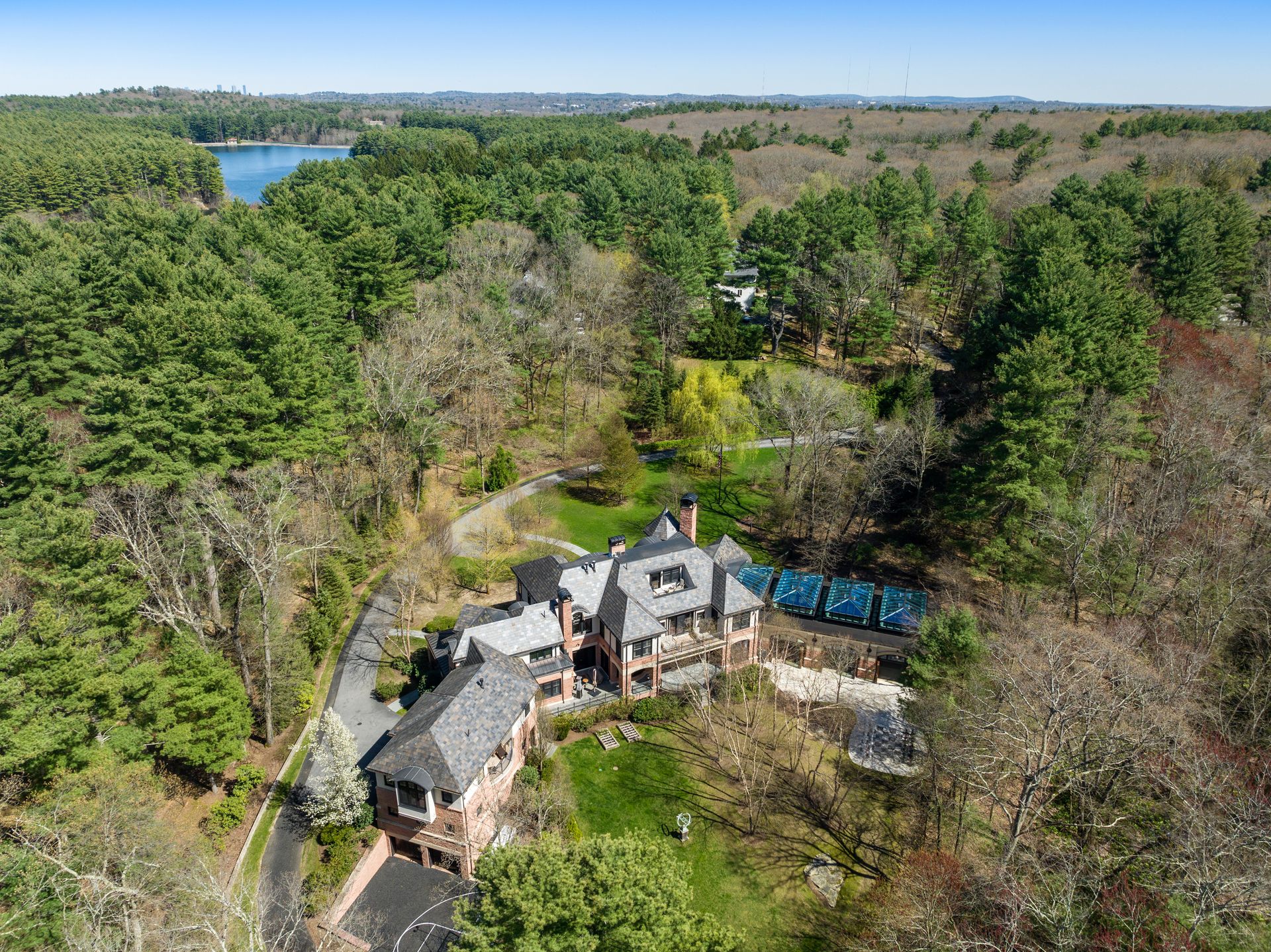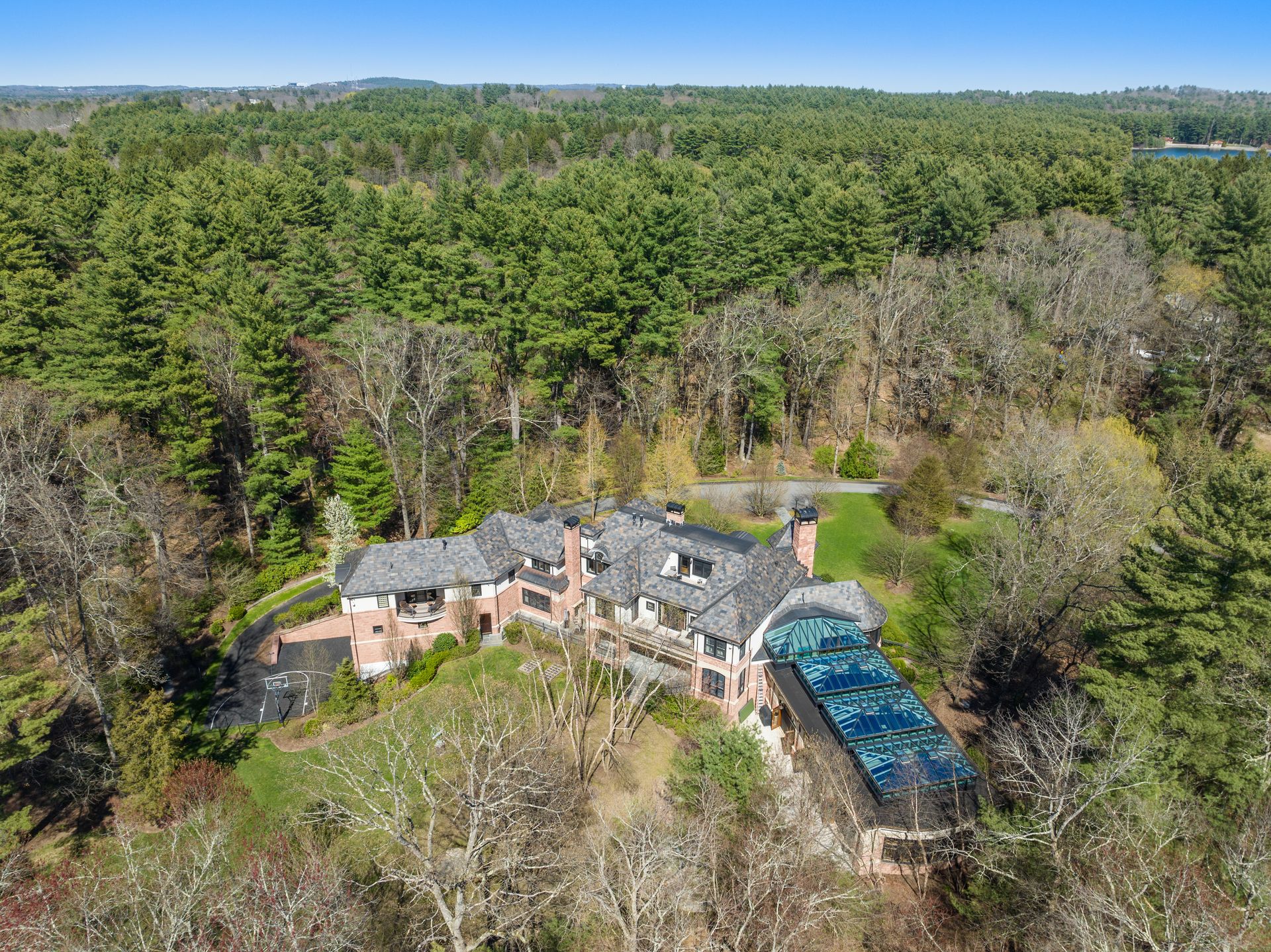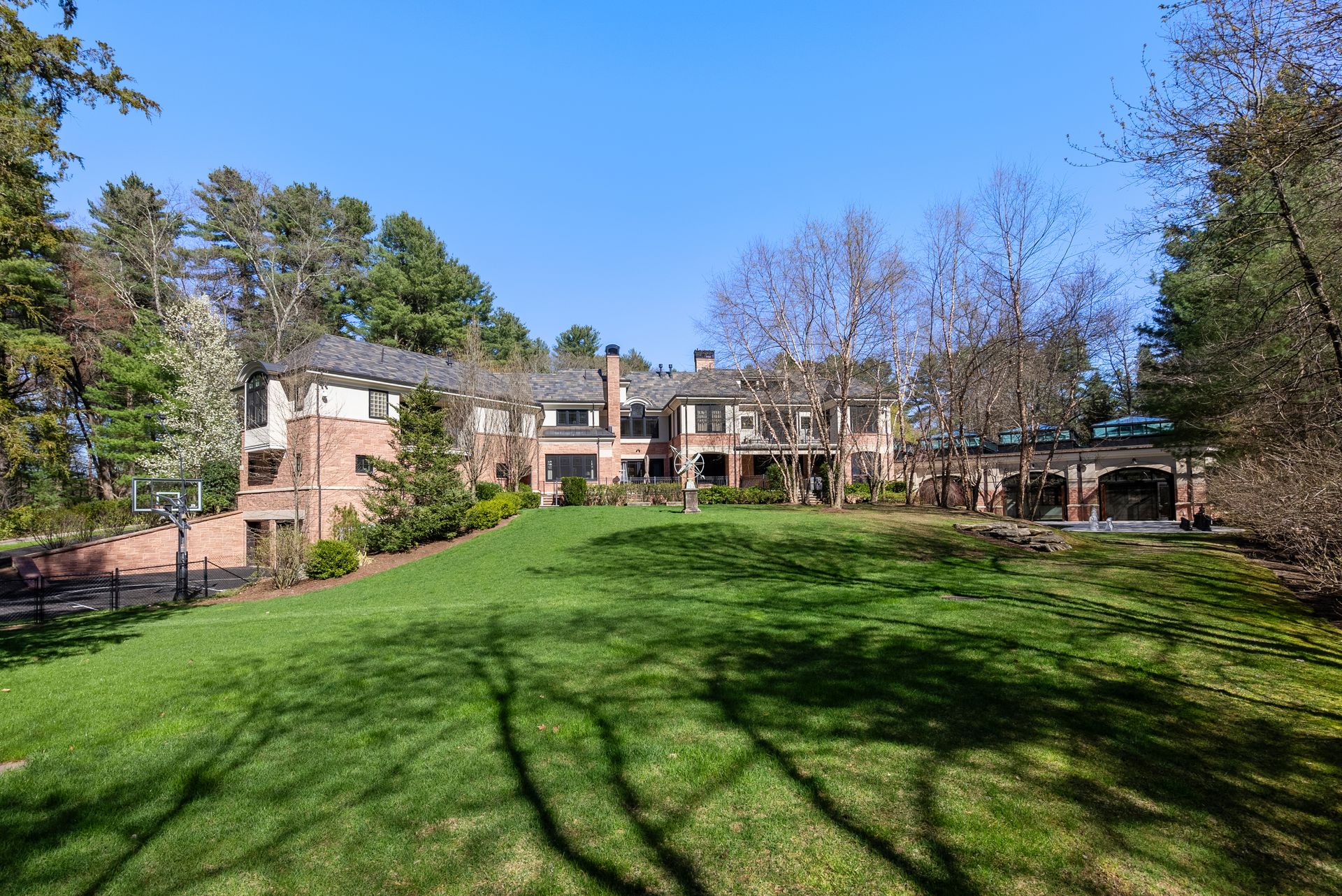 Exceptional gated estate privately sited on 8+ acres abutting conservation in one of Weston's most exclusive south-side neighborhoods. 14,000+ square feet of living space featuring uncompromising design in custom mill and stonework with fabulous amenities for entertaining on a grand scale with the ultimate facilities for sports & leisure. Formal living room with arched doors leads to an expansive formal dining room, Chef’s dream kitchen, and a comfortable family room with a domed ceiling. Private, paneled office and den. Serene primary suite with sitting room, 2 dressing rooms, 5 additional bedrooms with en suite baths. Stunning 3-story foyer, venetian plaster walls, arched doorways, coffered ceilings, elevator, whole house generator. The fantastic entertainment level features a game room with theater, indoor lap pool, indoor basketball court, gym & spa, as well as a bunk bedroom. 7-car heated garage with 4 EV chargers. Expansive lawn and specimen plantings. A rare opportunity for the discerning buyer to own one of the Boston area's finest homes.