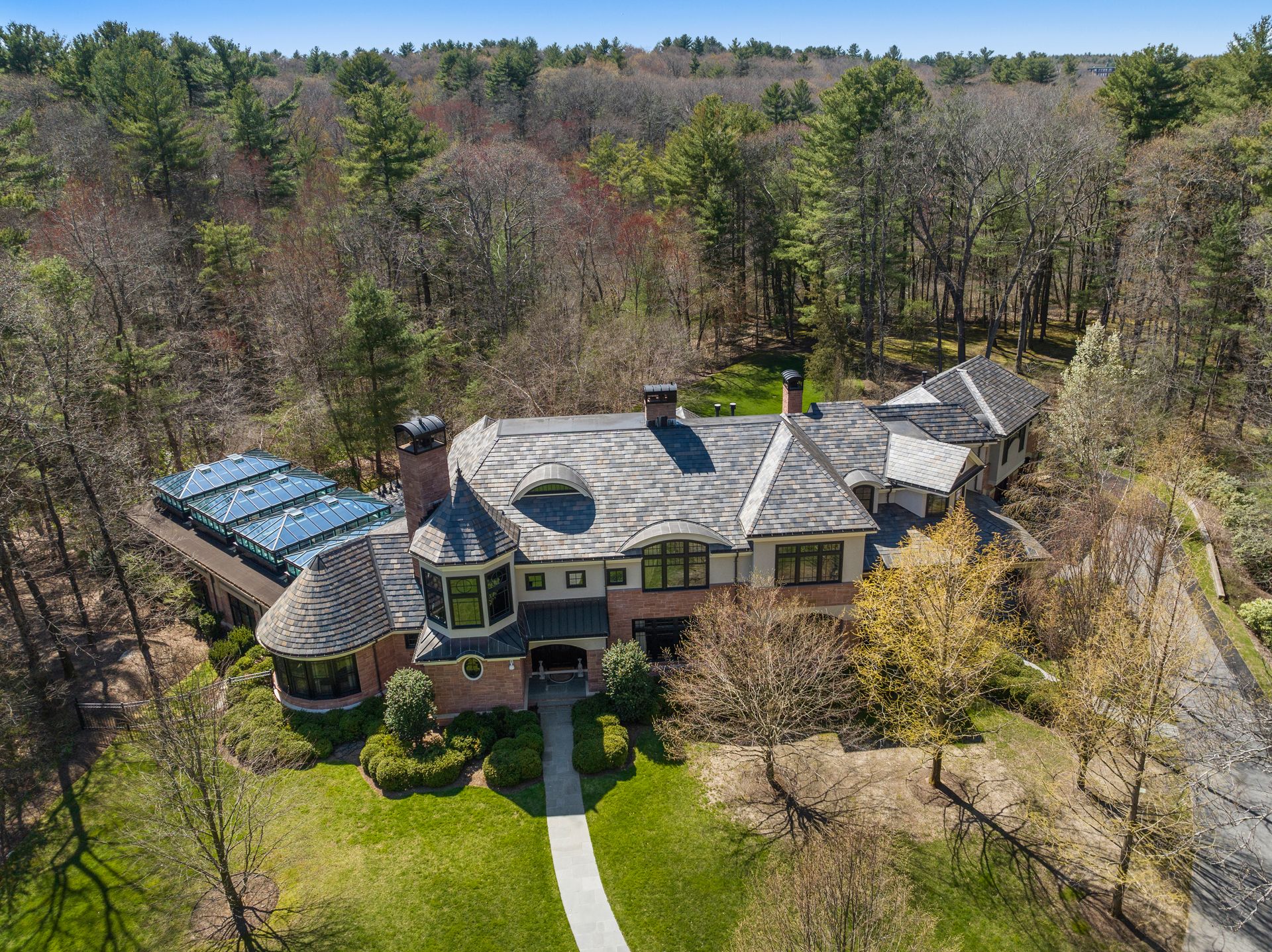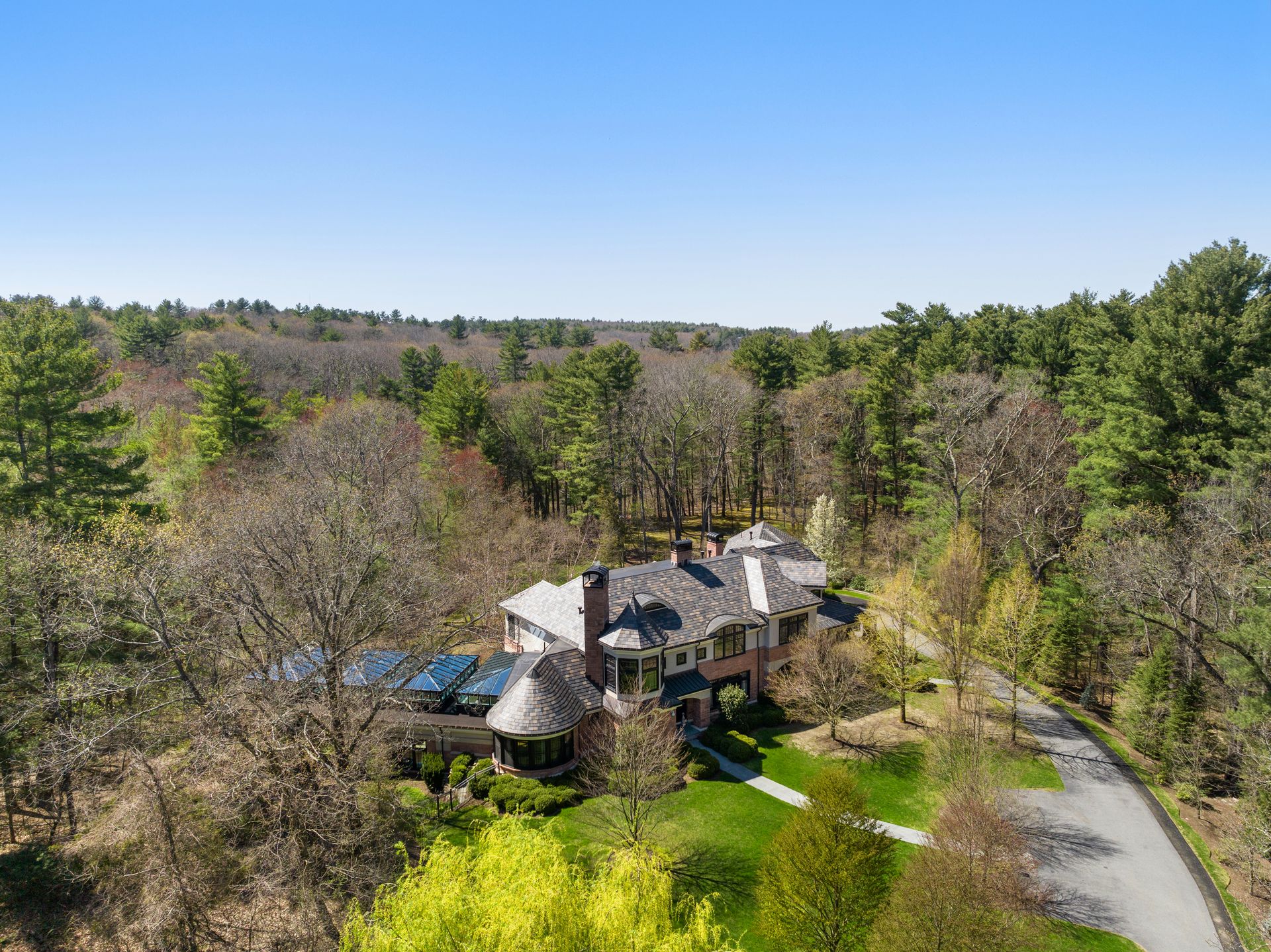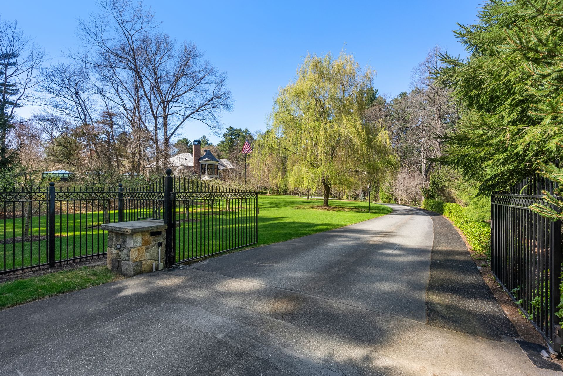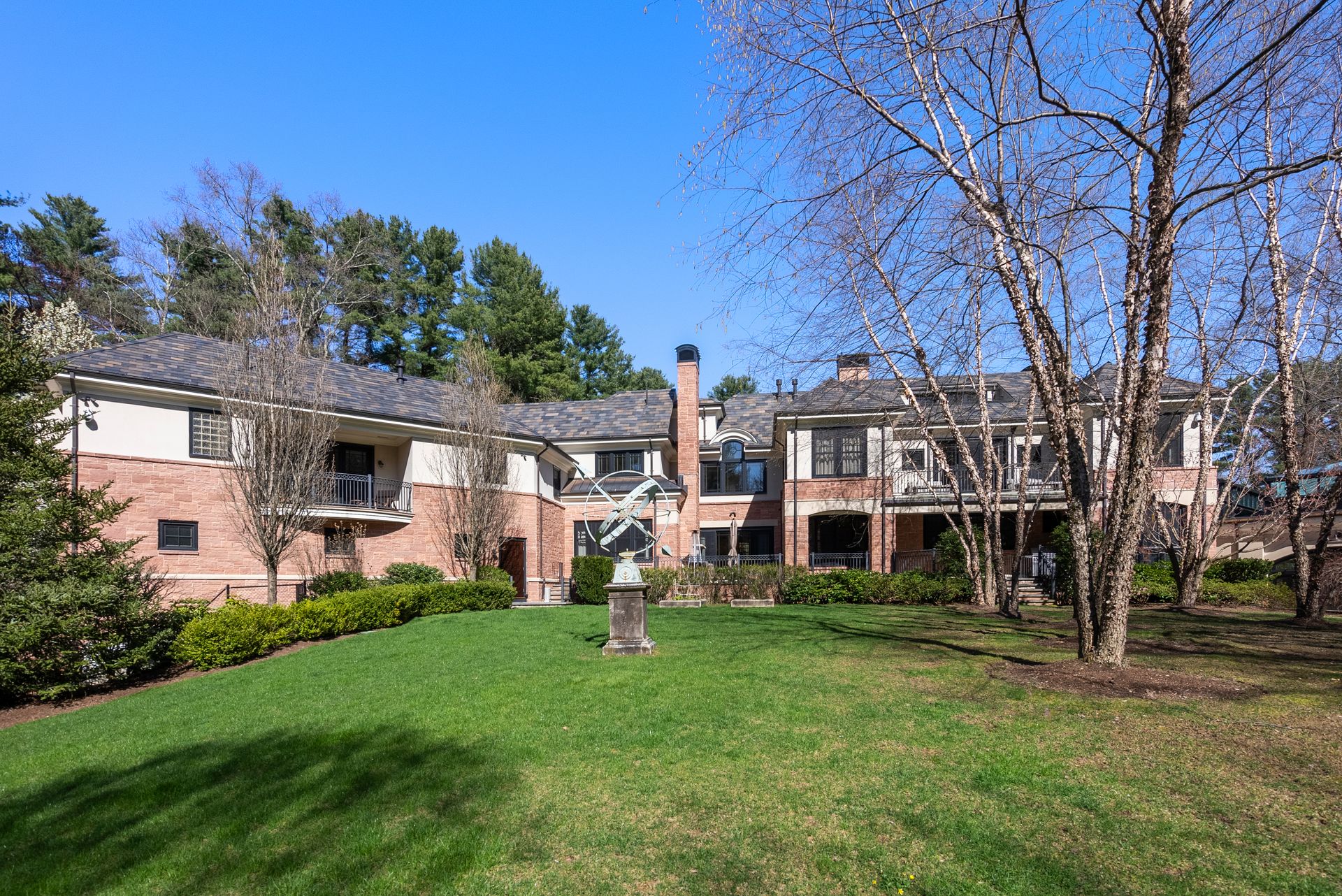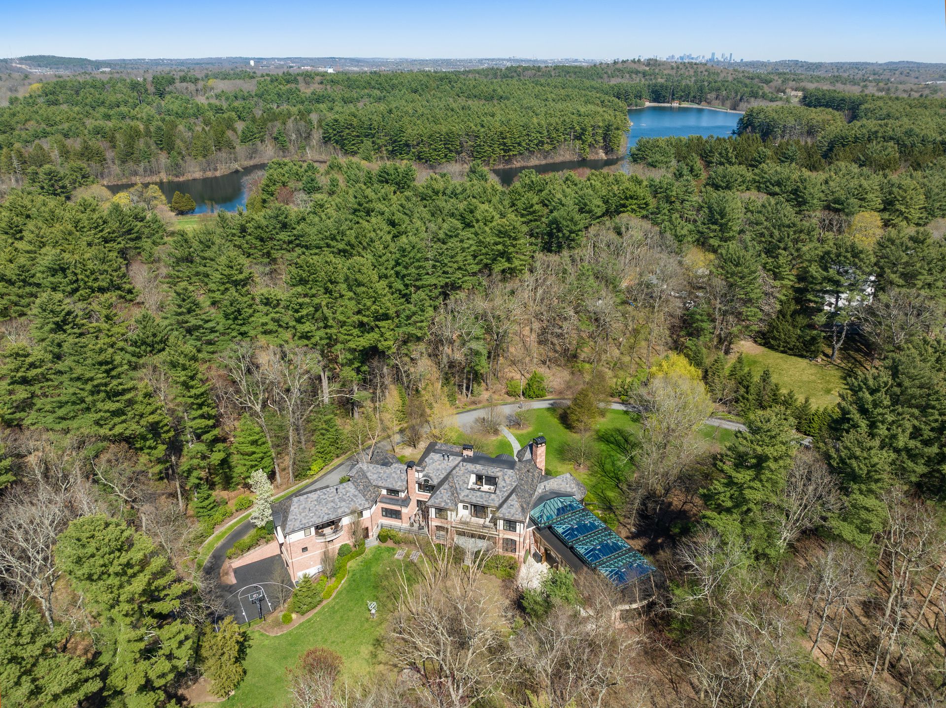 Exceptional gated estate privately sited on 8+ acres abutting conservation in one of Weston's most exclusive south-side neighborhoods. 14,000+ square feet of living space featuring uncompromising design in custom mill and stonework with fabulous amenities for entertaining on a grand scale with the ultimate facilities for sports & leisure. Formal living room with arched doors leads to an expansive formal dining room, Chef’s dream kitchen, and a comfortable family room with a domed ceiling. Private, paneled office and den. Serene primary suite with sitting room, 2 dressing rooms, 5 additional bedrooms with en suite baths. Stunning 3-story foyer, venetian plaster walls, arched doorways, coffered ceilings, elevator, whole house generator. The fantastic entertainment level features a game room with theater, indoor lap pool, indoor basketball court, gym & spa, as well as a bunk bedroom. 7-car heated garage with 4 EV chargers. Expansive lawn and specimen plantings. A rare opportunity for the discerning buyer to own one of the Boston area's finest homes.