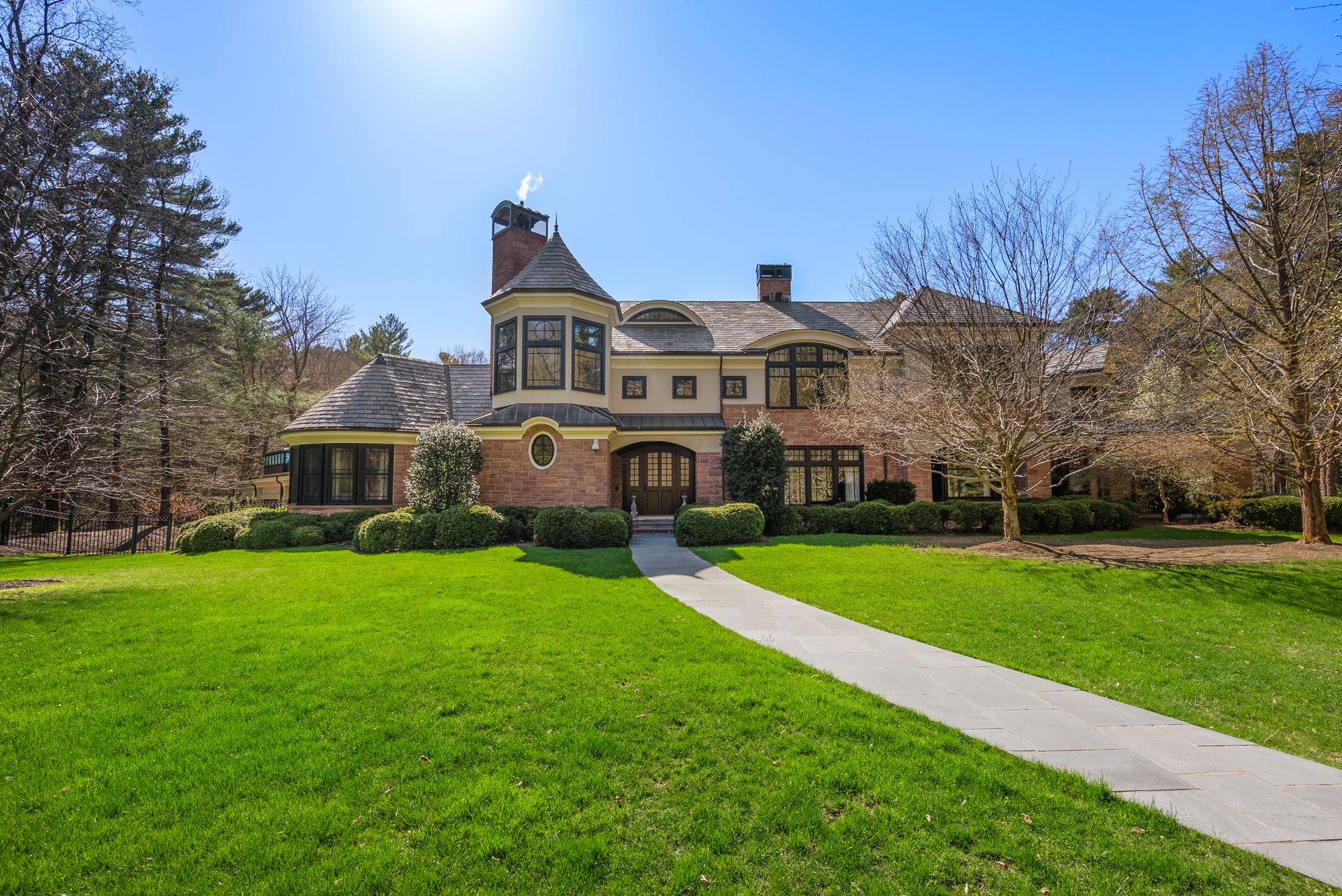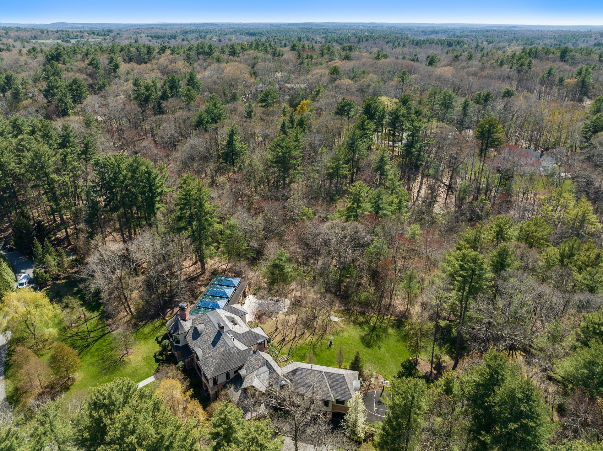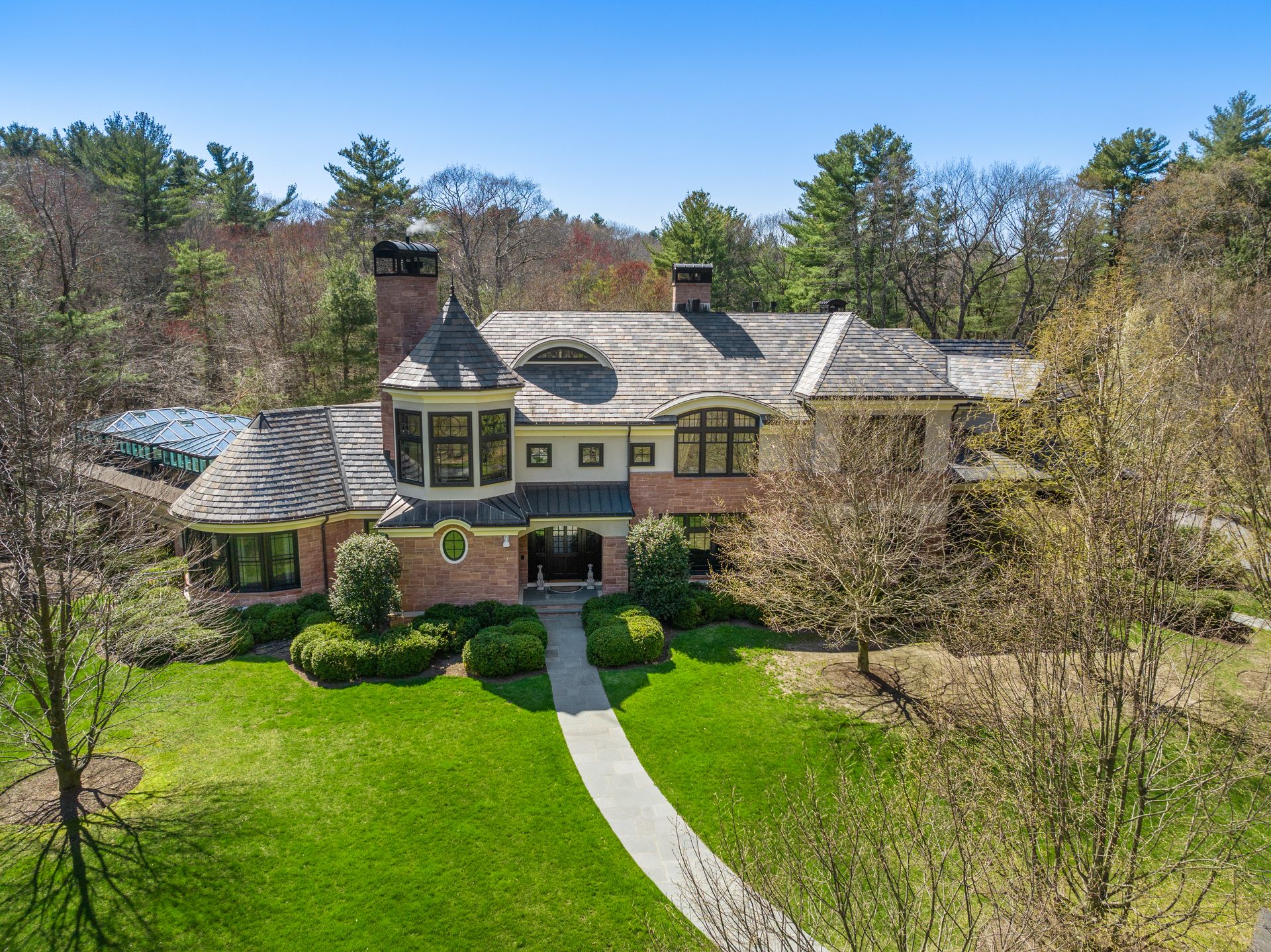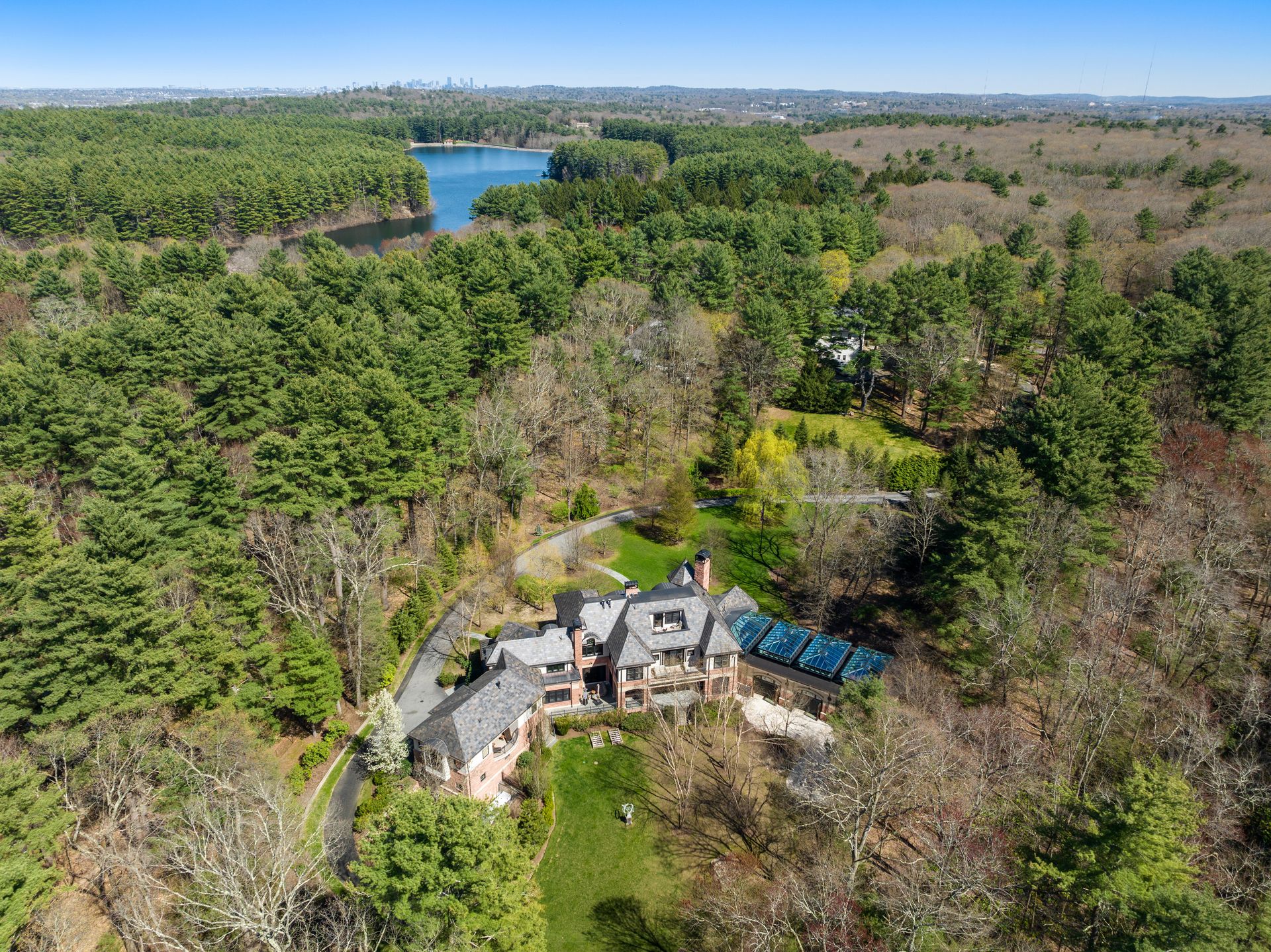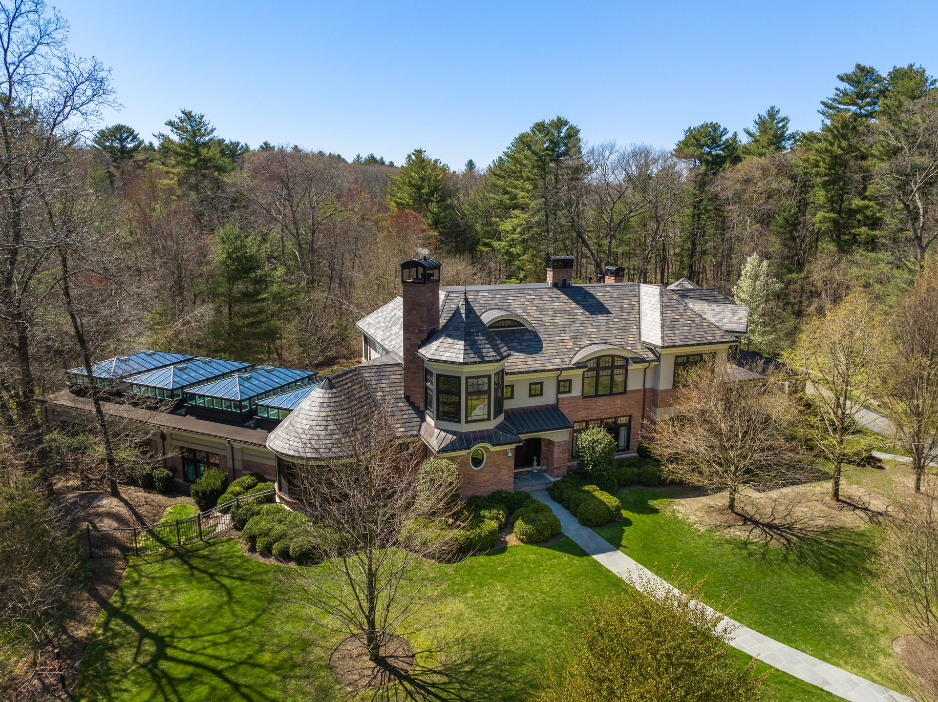 Exceptional gated estate privately sited on 8+ acres abutting conservation in one of Weston's most exclusive south-side neighborhoods. 14,000+ square feet of living space featuring uncompromising design in custom mill and stonework with fabulous amenities for entertaining on a grand scale with the ultimate facilities for sports & leisure. Formal living room with arched doors leads to an expansive formal dining room, Chef’s dream kitchen, and a comfortable family room with a domed ceiling. Private, paneled office and den. Serene primary suite with sitting room, 2 dressing rooms, 5 additional bedrooms with en suite baths. Stunning 3-story foyer, venetian plaster walls, arched doorways, coffered ceilings, elevator, whole house generator. The fantastic entertainment level features a game room with theater, indoor lap pool, indoor basketball court, gym & spa, as well as a bunk bedroom. 7-car heated garage with 4 EV chargers. Expansive lawn and specimen plantings. A rare opportunity for the discerning buyer to own one of the Boston area's finest homes.