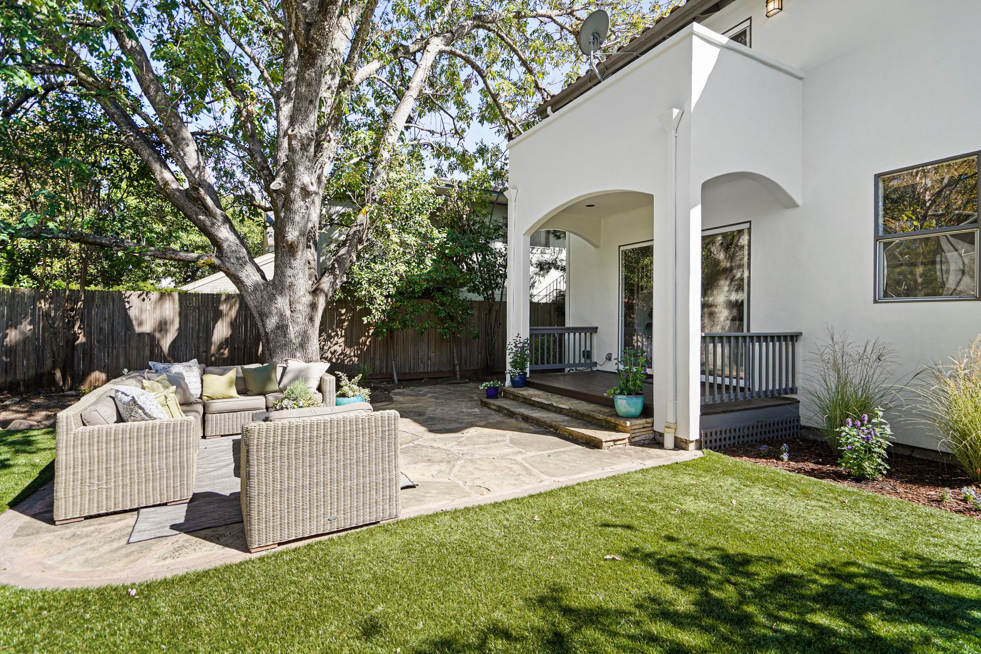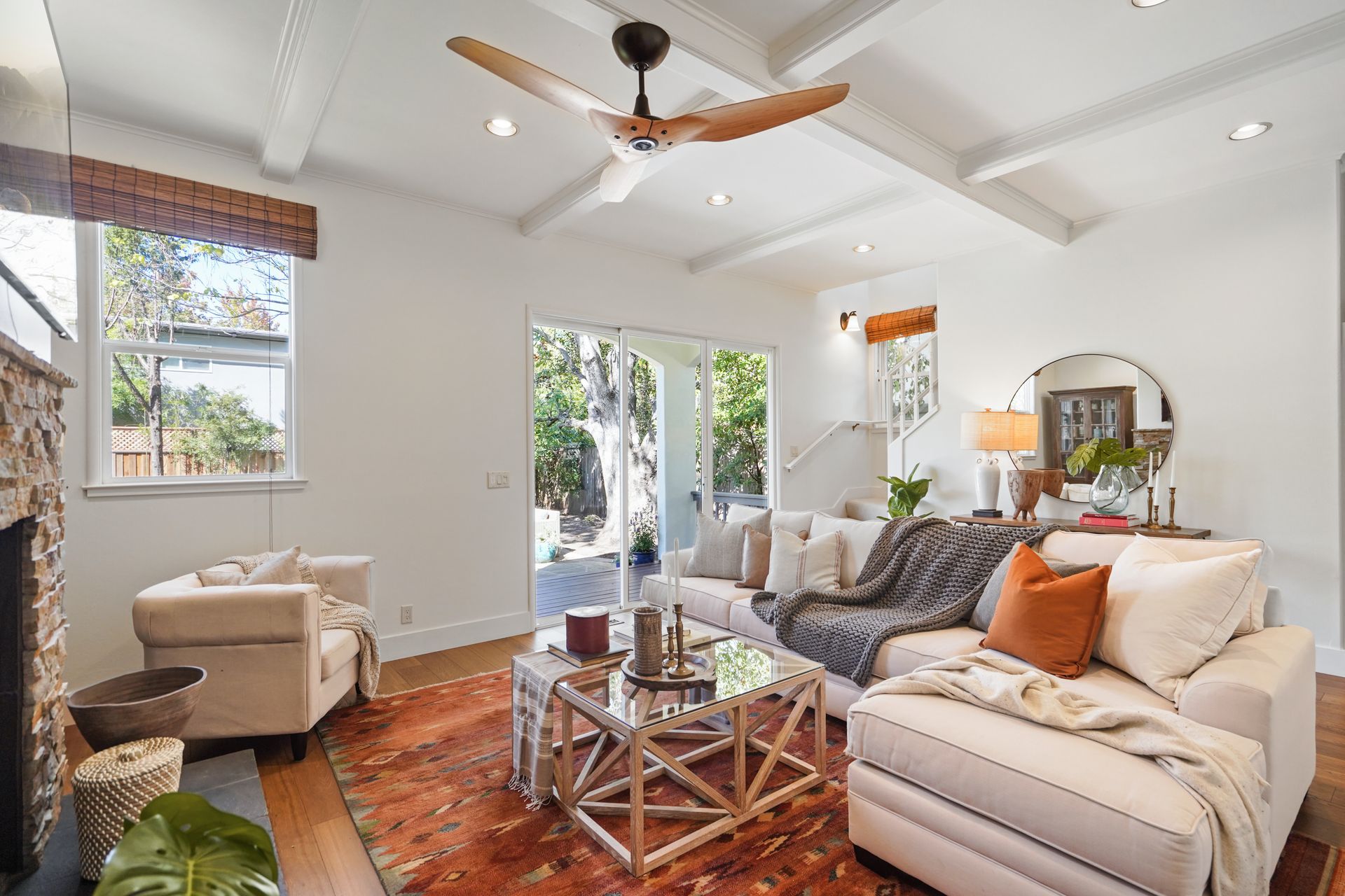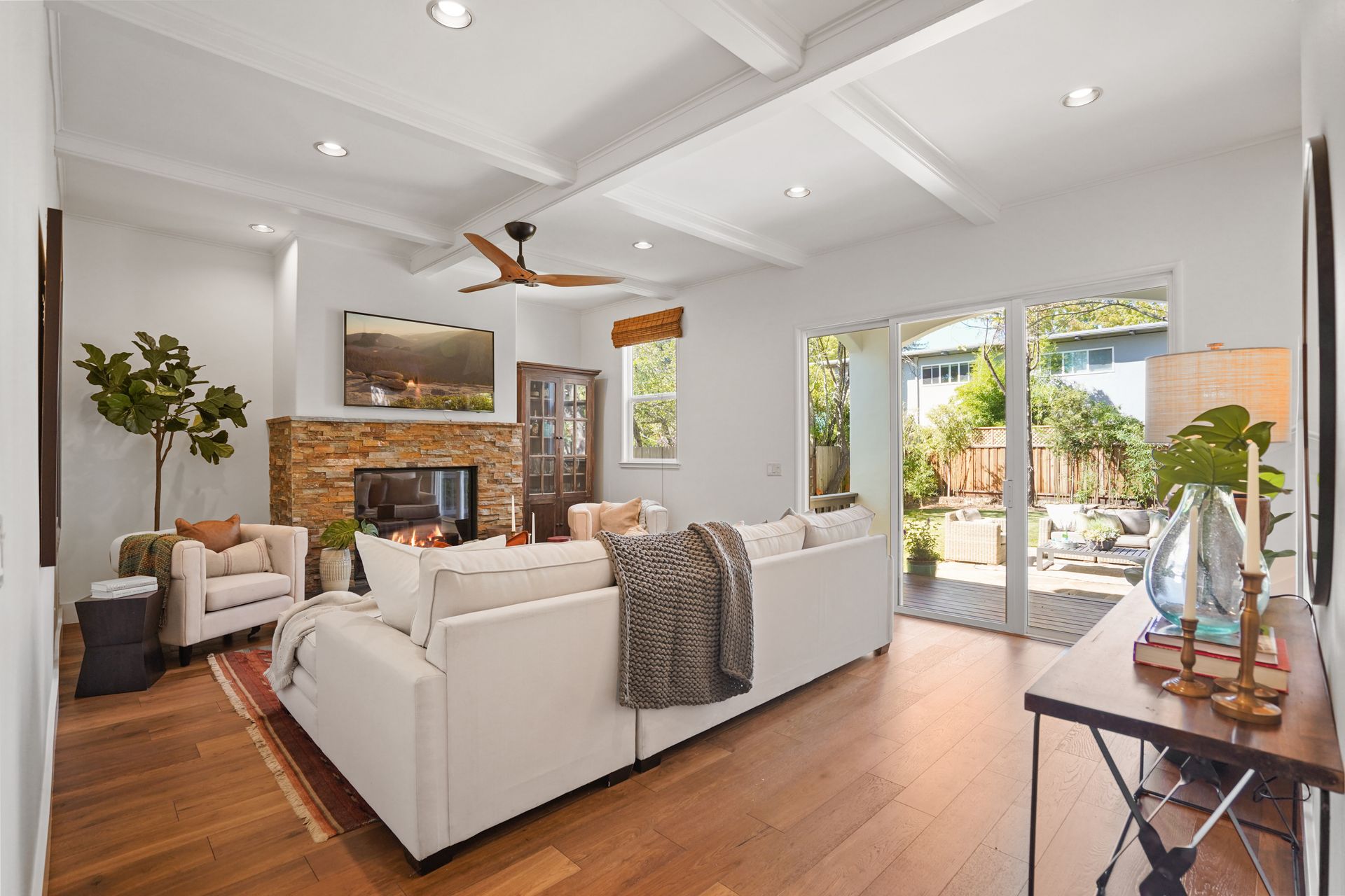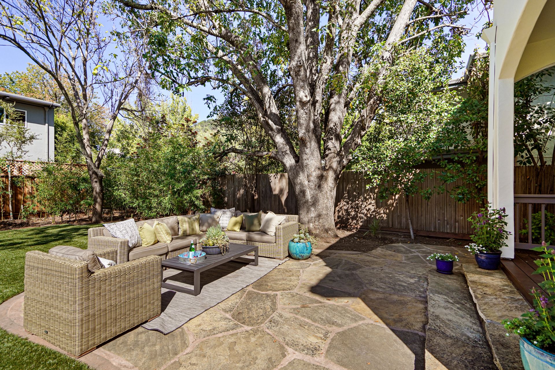 Just minutes to popular downtown San Anselmo's terrific restaurants, eclectic shops, fun community events and Farmers' Market sits this expanded three bedroom, two and one-half bath California Mediterranean offering classic vintage charm and a stylish remodel. Beam ceilings, wood floors and a fireplace in the living room adjoins a delightful dining area. The spacious kitchen with stainless-steel appliances and gas cooktop has plenty of counter space for multiple cooks and entertaining. A fabulous family room off the kitchen with a cozy gas fireplace, beam ceiling and recessed lighting is the central gathering area of the home. Directly off the family room you will enjoy a huge, sunny, level yard with a flagstone patio and eco-friendly lawn, ideal for play and parties. Two well-sized bedrooms downstairs and an impressive primary bedroom upstairs feature a high ceiling, walk-in closet, jetted tub, dual sinks, separate shower and relaxing balcony. Close to top-rated schools as well as world-class hiking and biking trails.