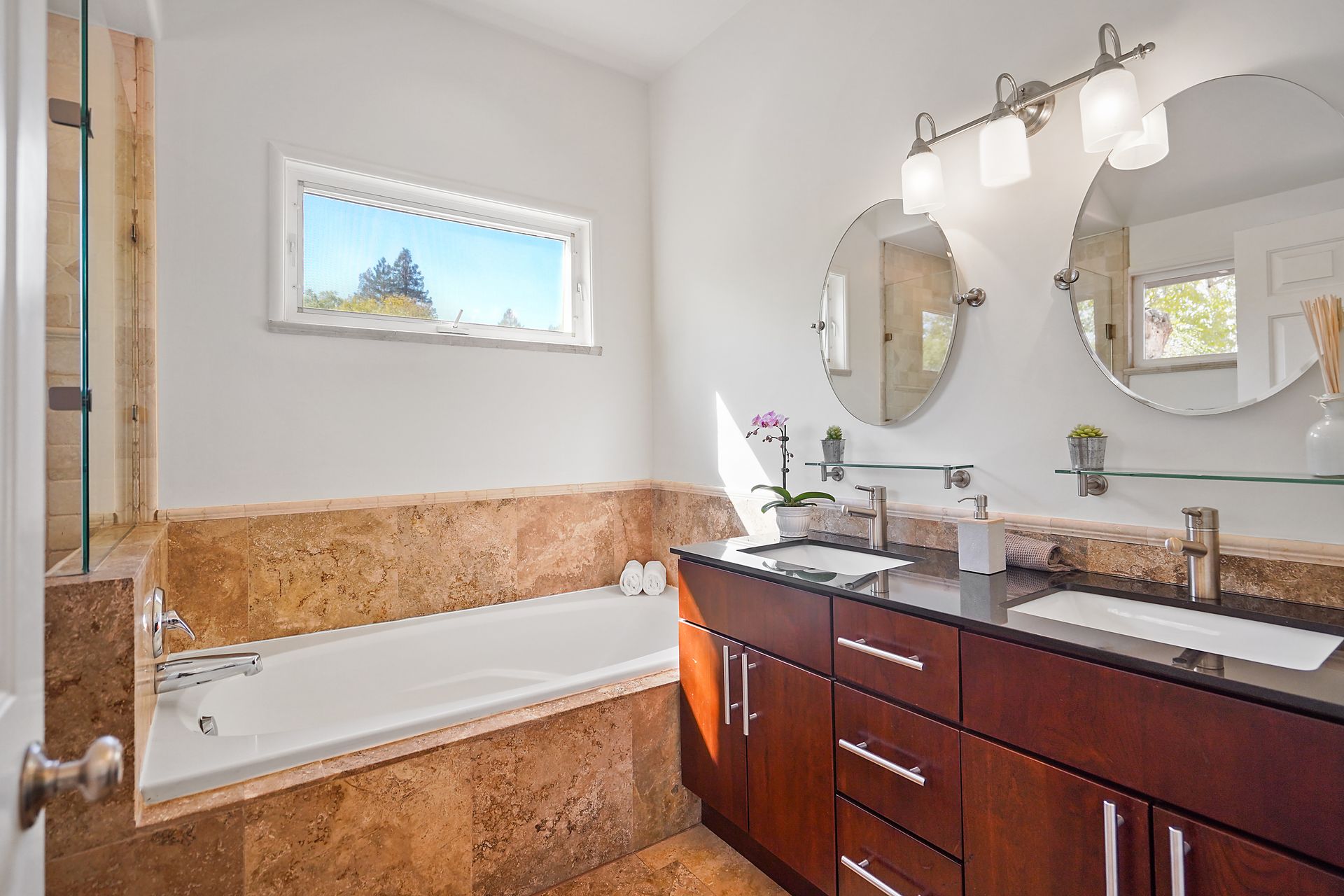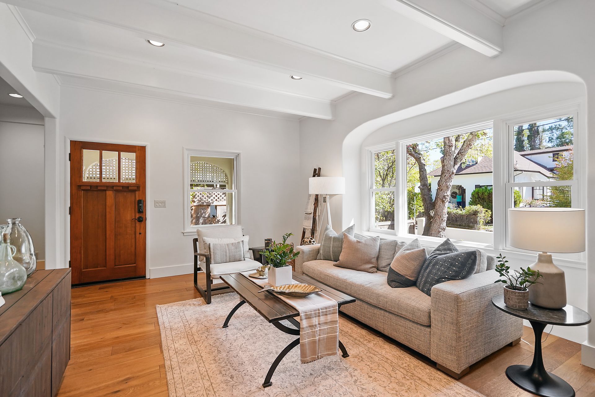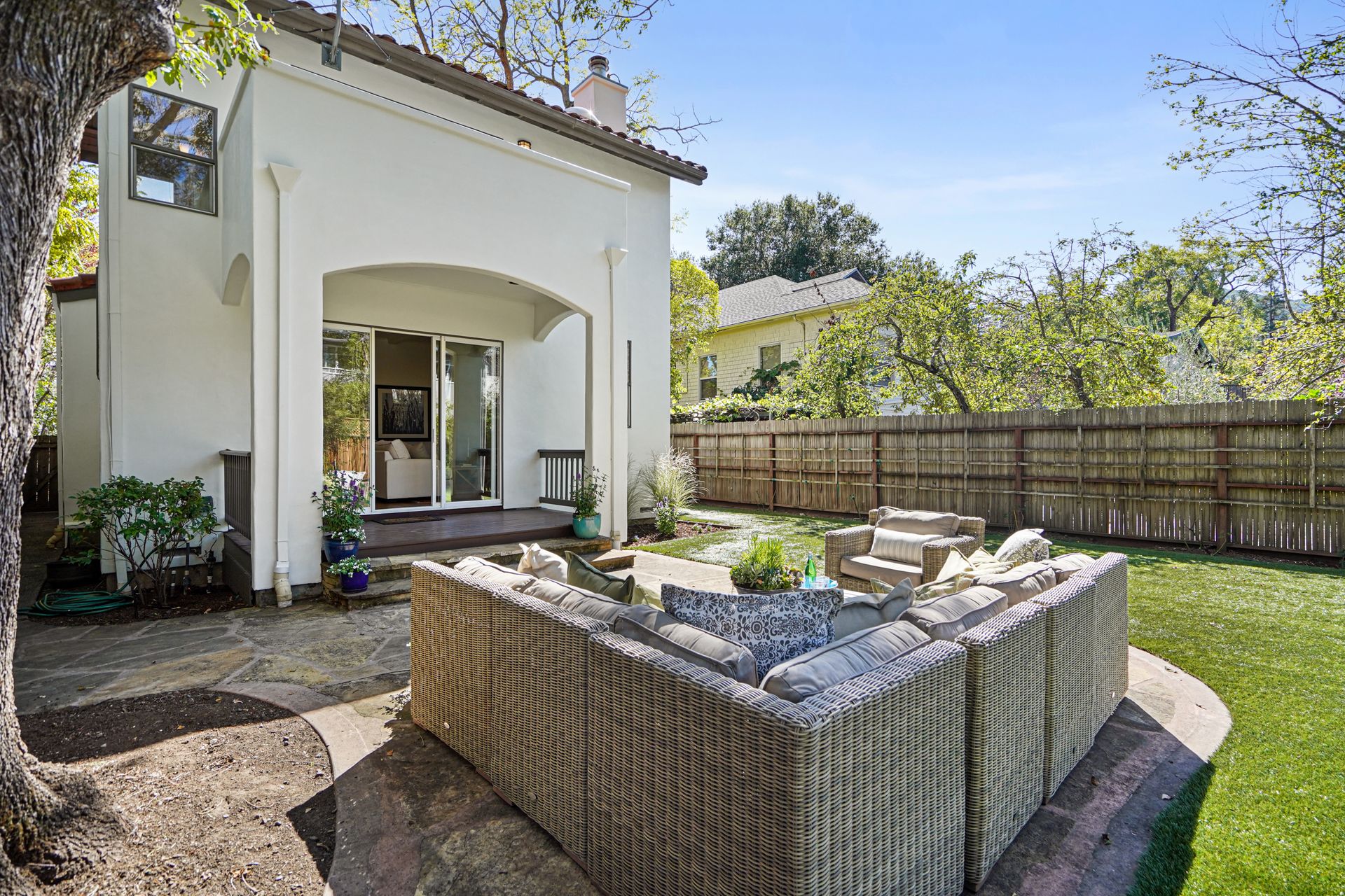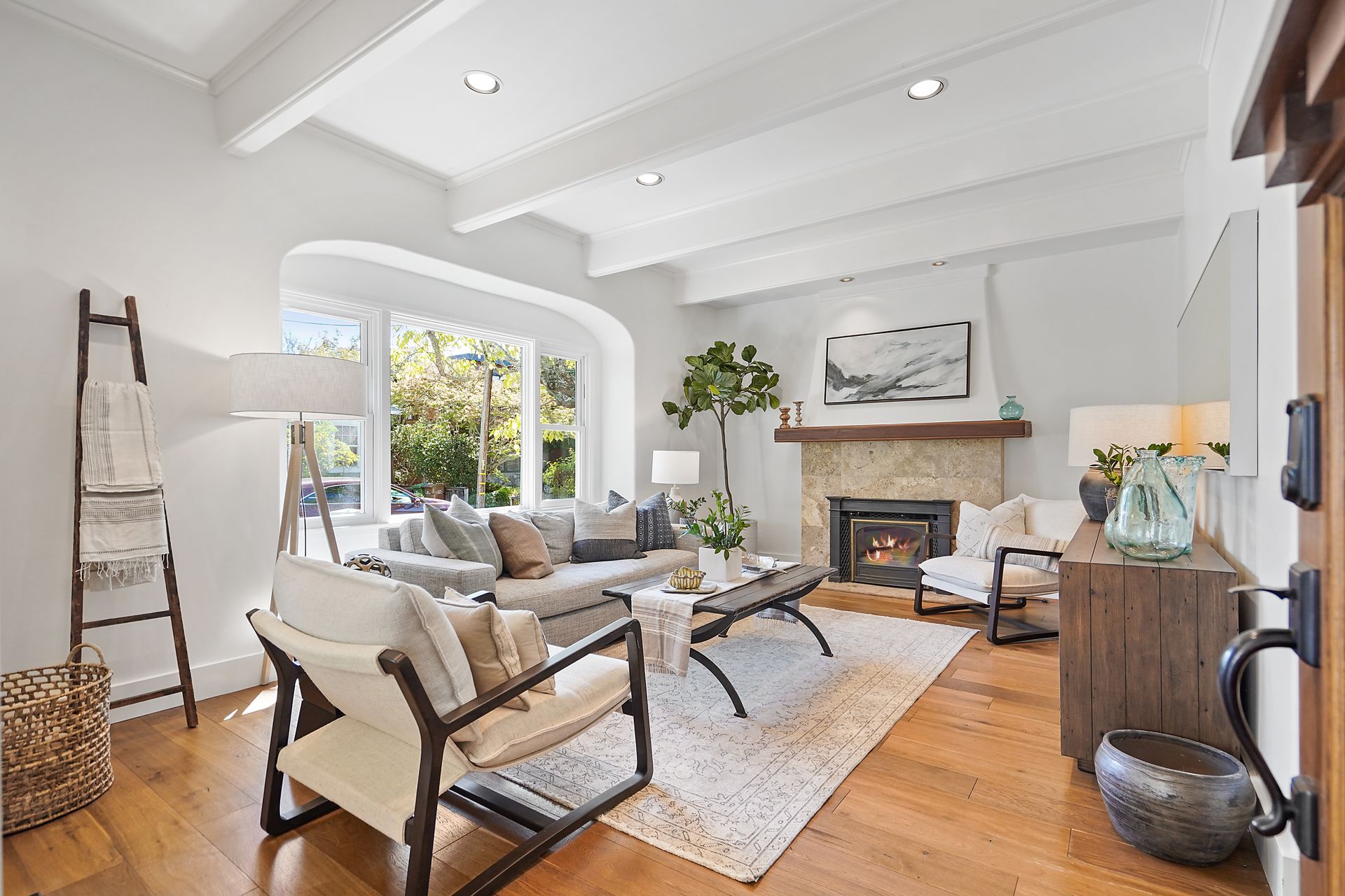 Just minutes to popular downtown San Anselmo's terrific restaurants, eclectic shops, fun community events and Farmers' Market sits this expanded three bedroom, two and one-half bath California Mediterranean offering classic vintage charm and a stylish remodel. Beam ceilings, wood floors and a fireplace in the living room adjoins a delightful dining area. The spacious kitchen with stainless-steel appliances and gas cooktop has plenty of counter space for multiple cooks and entertaining. A fabulous family room off the kitchen with a cozy gas fireplace, beam ceiling and recessed lighting is the central gathering area of the home. Directly off the family room you will enjoy a huge, sunny, level yard with a flagstone patio and eco-friendly lawn, ideal for play and parties. Two well-sized bedrooms downstairs and an impressive primary bedroom upstairs feature a high ceiling, walk-in closet, jetted tub, dual sinks, separate shower and relaxing balcony. Close to top-rated schools as well as world-class hiking and biking trails.