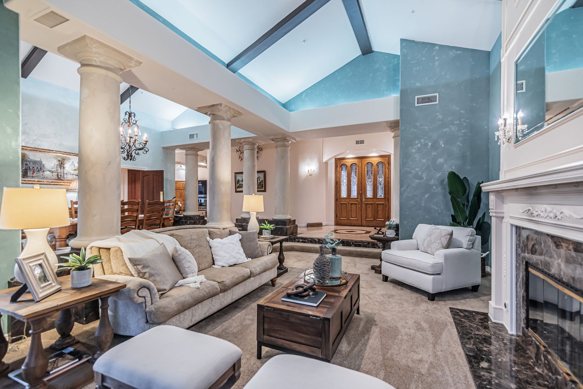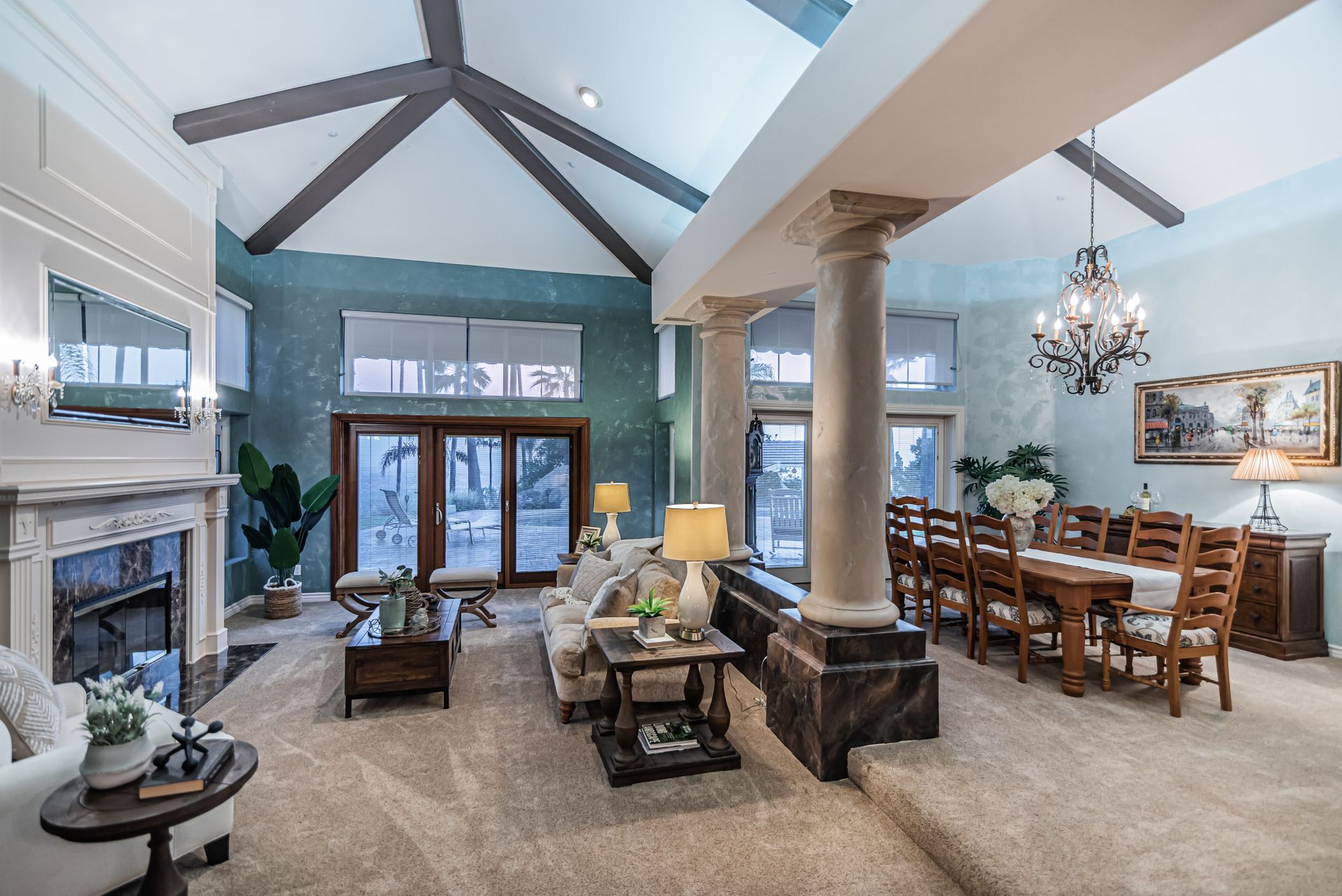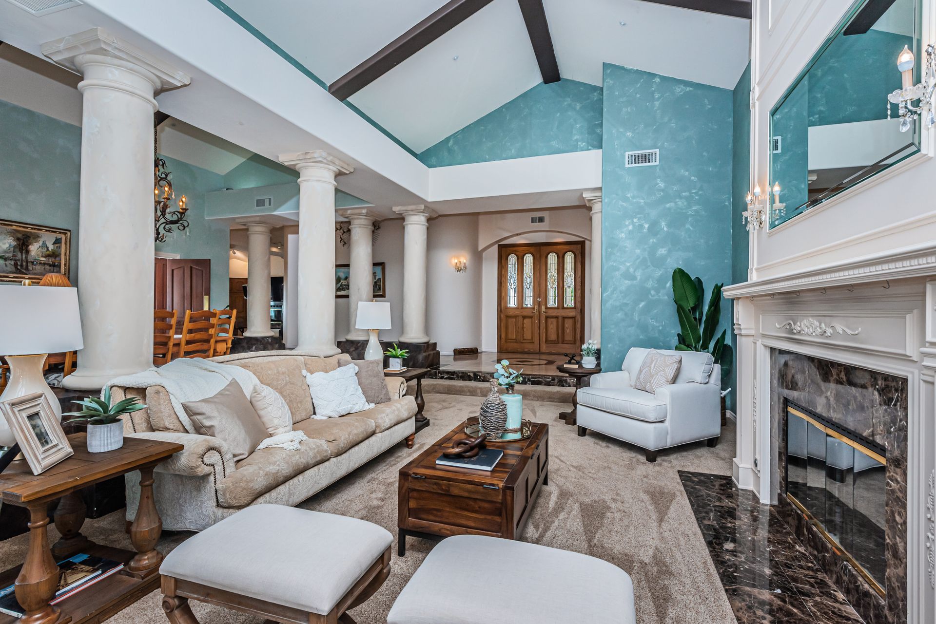 Pass through the kitchen or hallway where you will find the formal living and dining rooms that feature soaring vaulted ceilings, custom paint and architecture, recessed lighting, lush carpet, and huge windows along the entire south side. A gas fireplace with a floor-to-ceiling mantel is the focal point in the sunken living room and there are sliding doors in each room to access the pool/patio.