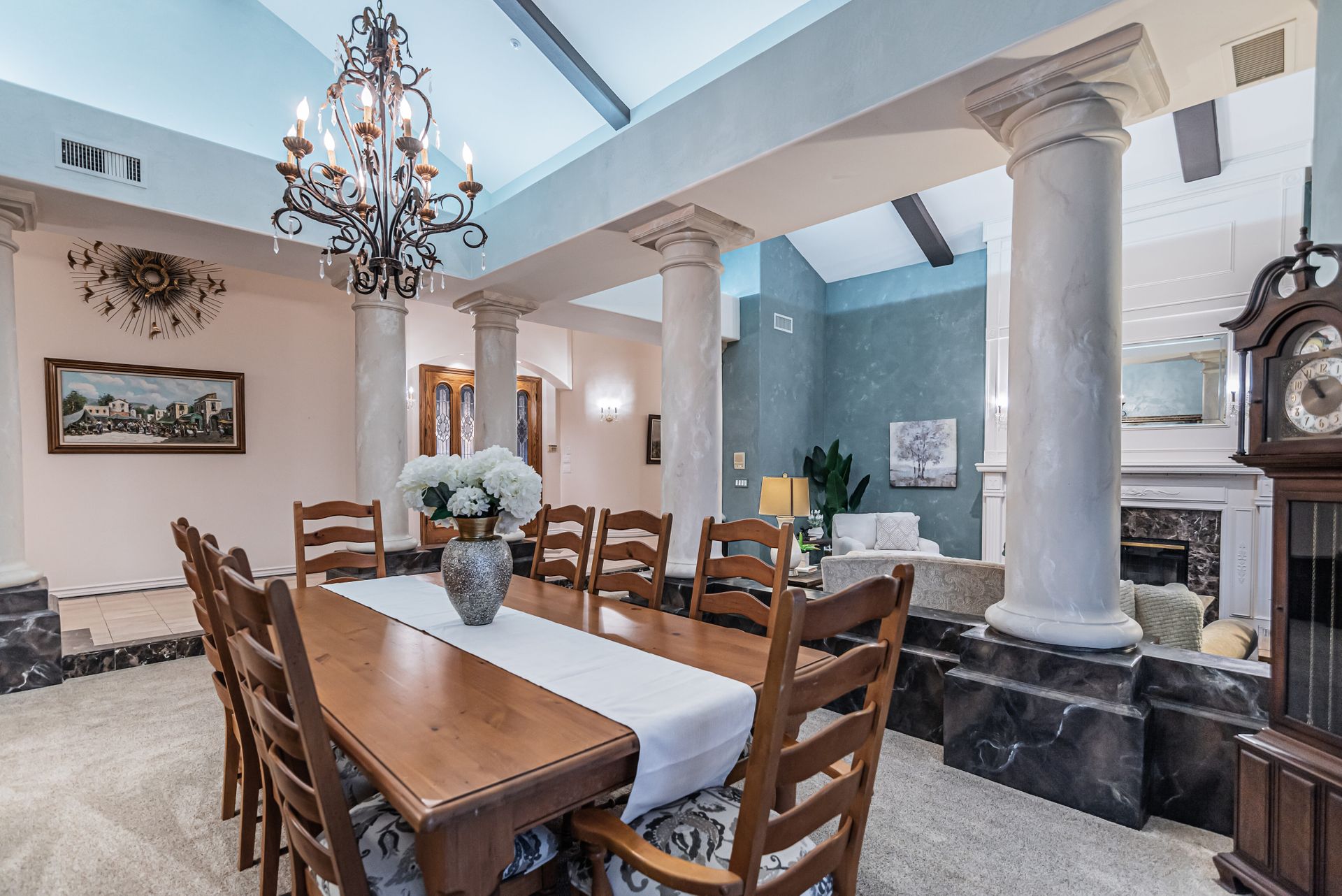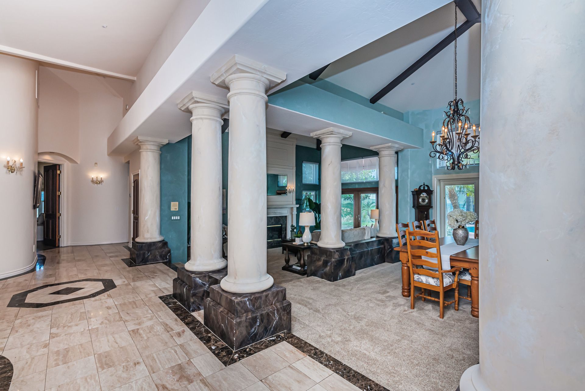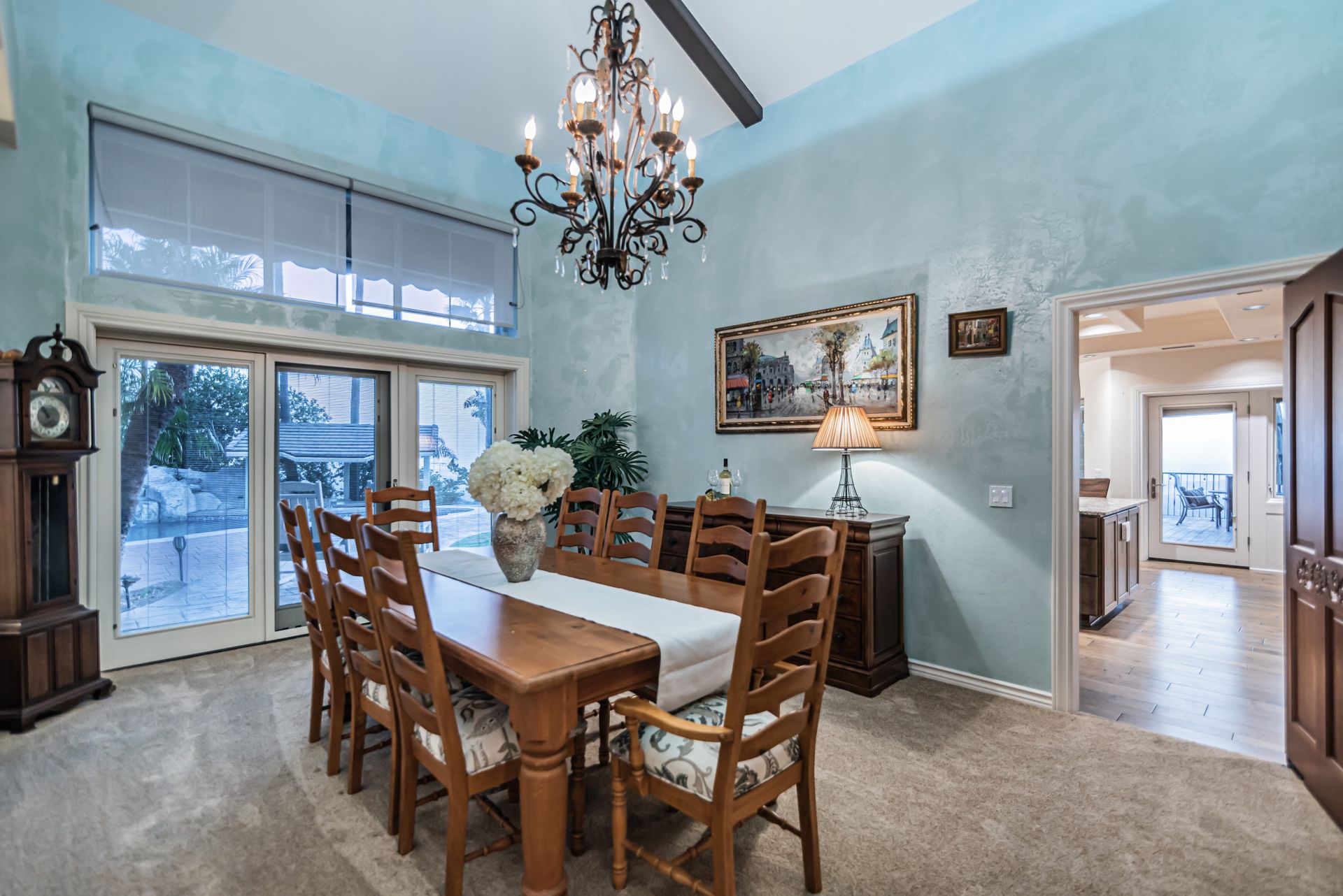 Pass through the kitchen or hallway where you will find the formal living and dining rooms that feature soaring vaulted ceilings, custom paint and architecture, recessed lighting, lush carpet, and huge windows along the entire south side. A gas fireplace with a floor-to-ceiling mantel is the focal point in the sunken living room and there are sliding doors in each room to access the pool/patio.