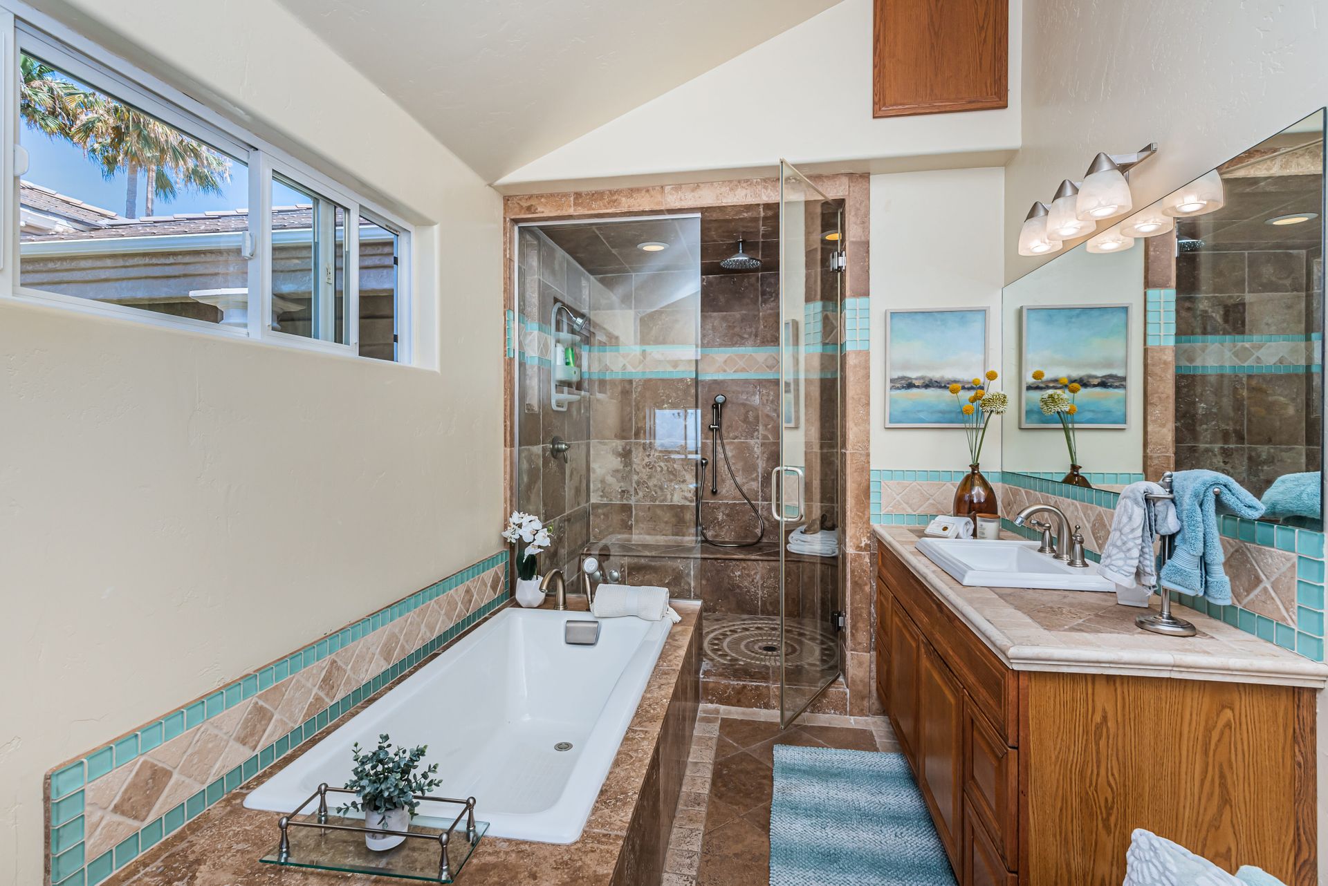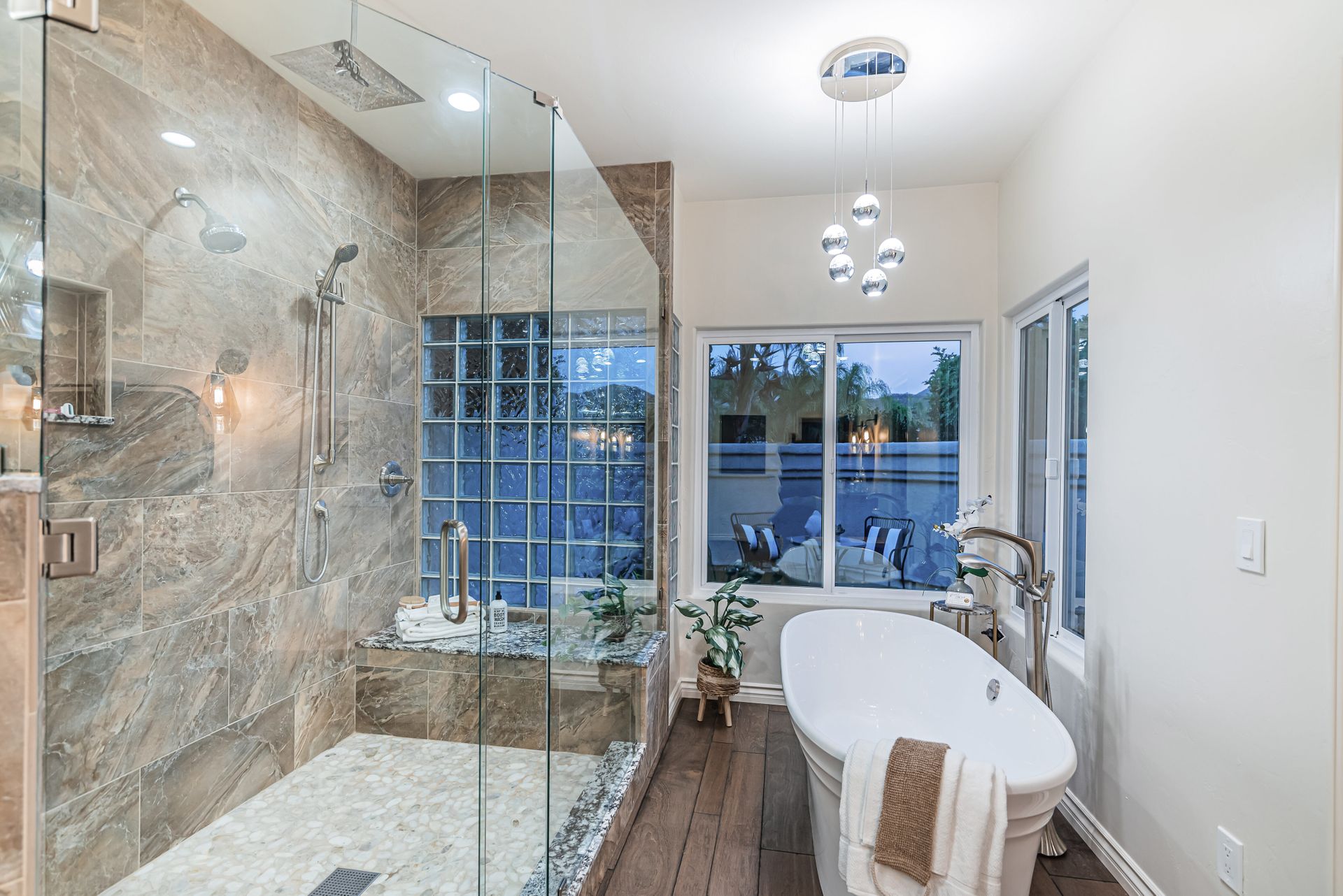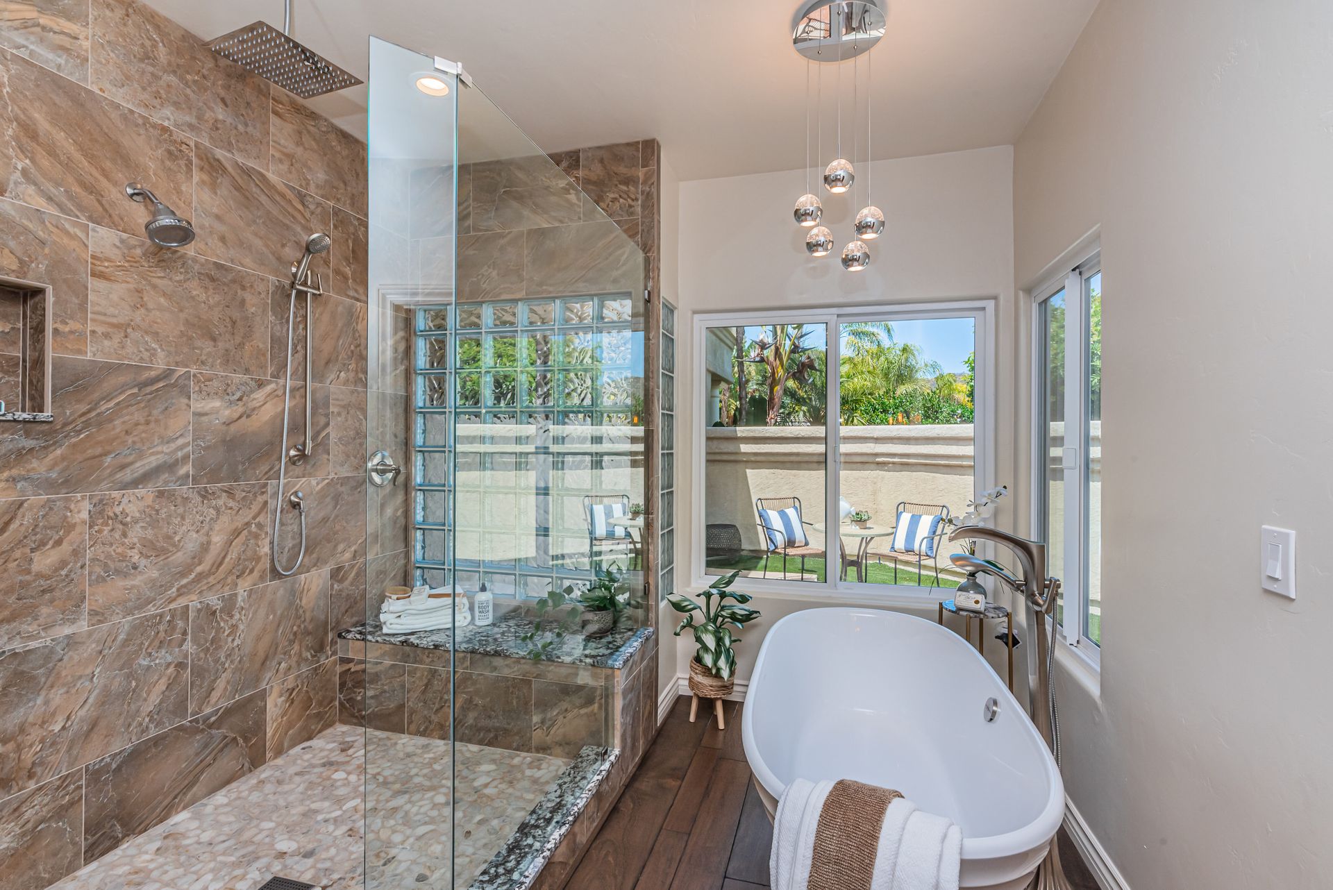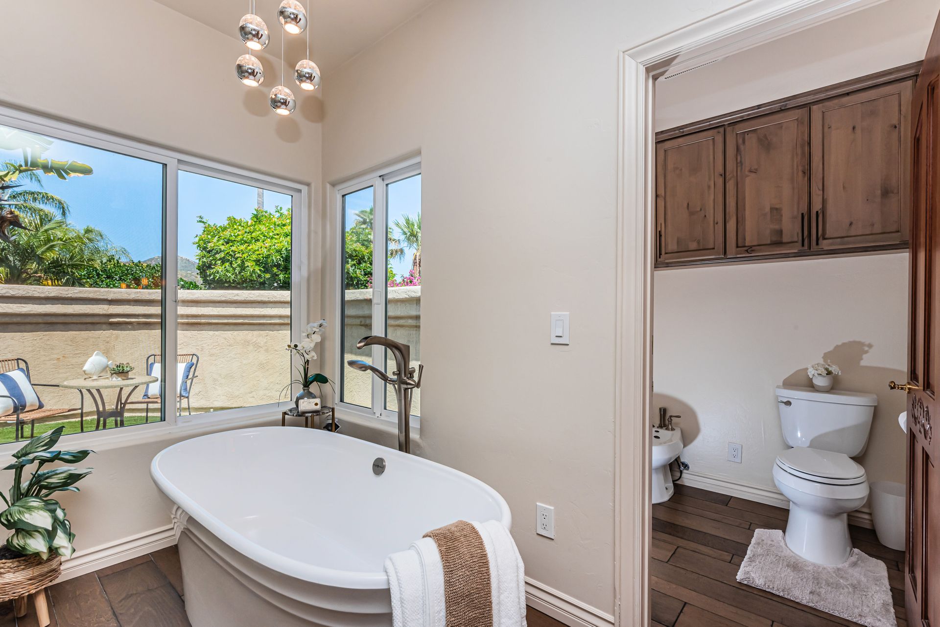 The primary suite and one spare bedroom/home office are located on the south end of the home(very private), the star of which is the recently remodeled Master featuring wood flooring, a vaulted ceiling, custom architecture, a gas fireplace, dual walk-in closets, and a small wall safe. The Master Bath is an updated retreat of its own with tons of custom cabinetry, new countertops, backsplash, fixtures, custom lighting, a heating fan, and a separate toilet with detached bidet. There is also an oversized soaking tub, a walk-in rain shower with a built-in bench and 3 showerheads, plus private access to a slab-patio/artificial turf courtyard.