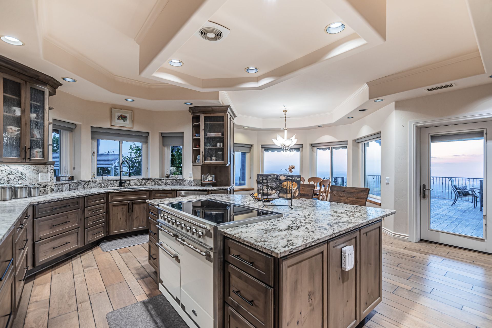 Living space flows in this home with views from every room. Step into the gourmet kitchen with its dual-basin, farm-style sink and large, center island that features an ASA all induction 5-burner cooktop, double oven, and warming drawer. There are extra drawers and cabinets on the island for convenient storage and access, and room for multiple barstools. Leathered, granite-slab counterspace wraps around the perimeter of the kitchen with loads of cabinetry and there is a sizable walk-in pantry to accommodate any household needs. To the west, a quiet sitting/eating area offers big views and breezes perfect for taking a break any time of the day.