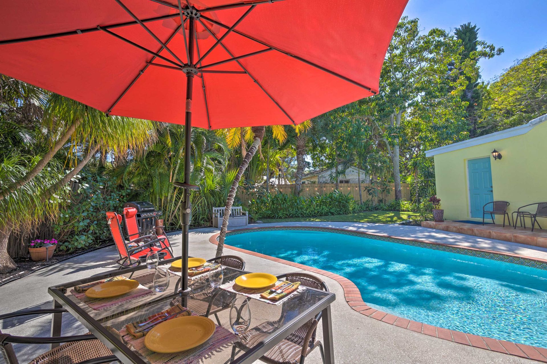 INVESTORS! EMPTY NESTERS! FIRST TIME HOME BUYER'S! Successful vacation rental with great reviews! Unique 'flag' lot nestled in unrestricted Northwood Shores, 5 houses in from Flagler & the ICW. 3 bed, 2 bath solid concrete bungalow on a large lot. The concrete tile roof is certified for 7 years, but it can be removed and additional stories added to the existing home, or demolished to build new. Complete with vital upgrades: new PVC drain pipes, new pool pump & filter, upgraded electric, wired landscape lighting. Move in, build on it, or just sit back and let it provide great income! Amazing location; block to the ICW, less than a mile from Currie Park, minutes to Palm Beach. Leave the stress, come decompress, and LOVE WHERE YOU LIVE!!