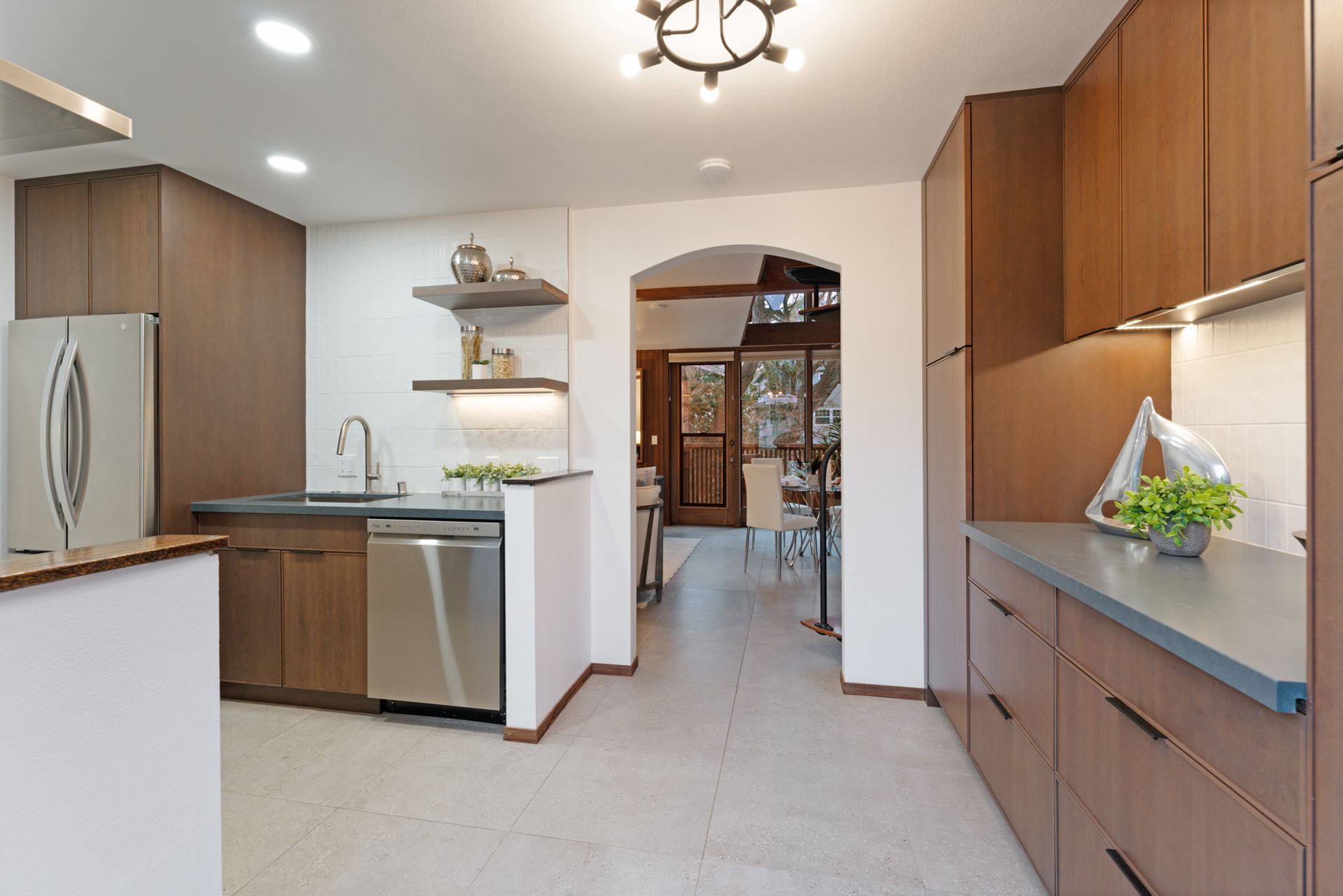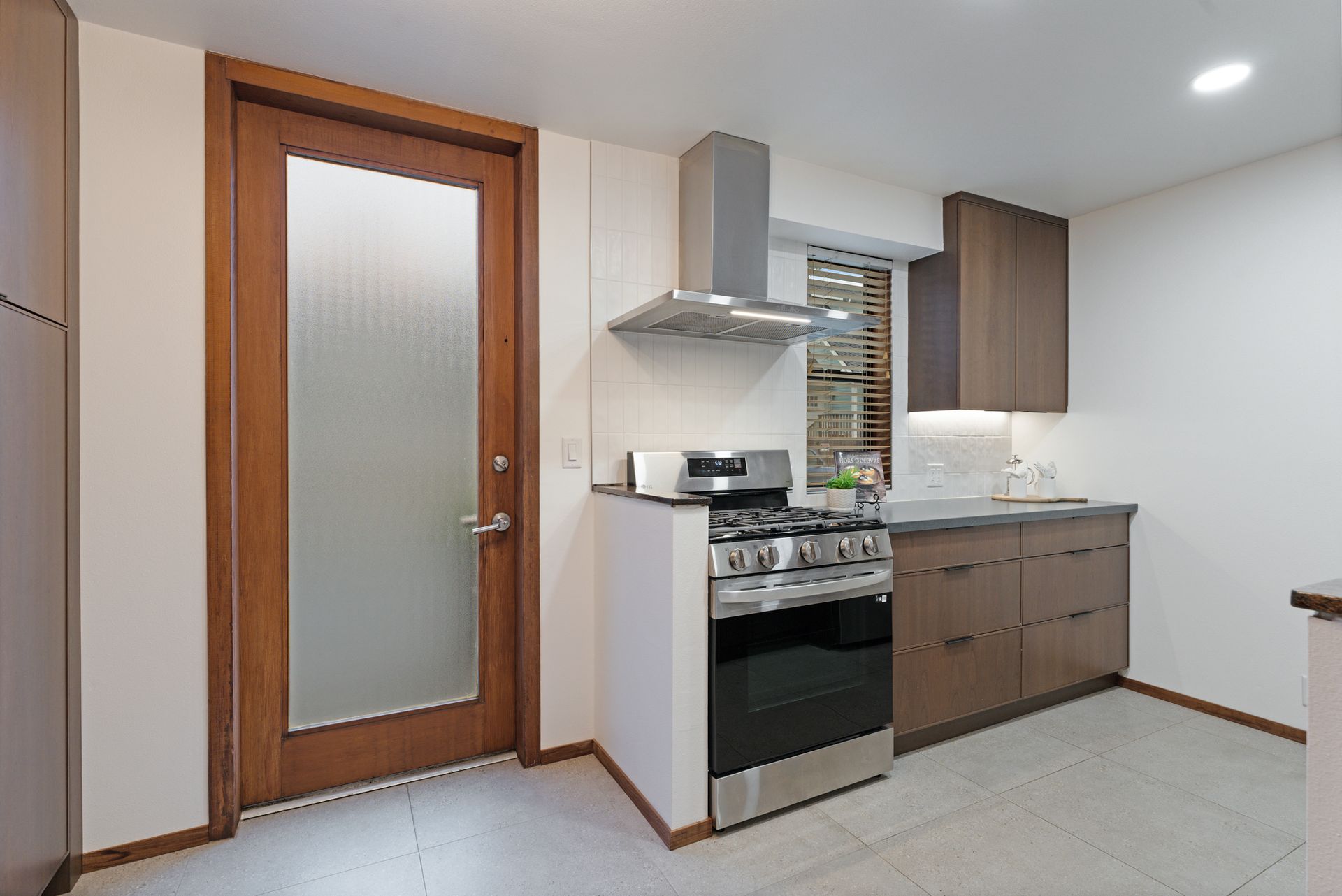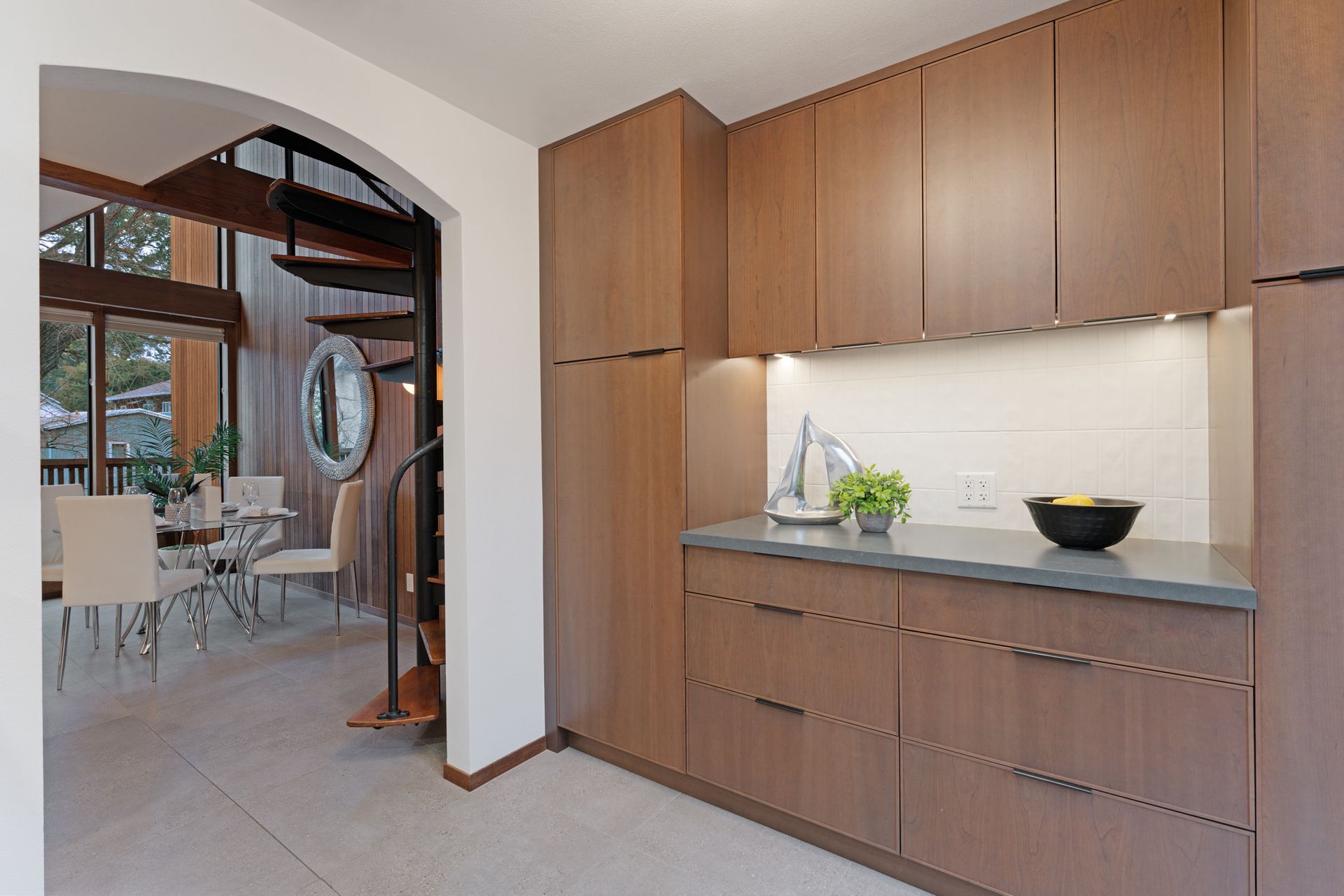 Fabulous home in the heart of Seabright. Recently updated in 2022 with a sleek contemporary kitchen with flat panel cabinetry, designer tile, floating shelves and quartz countertops. It also includes an open concept living area with treetop views and a private rear deck. The main living area has sophisticated tile flooring, crisp white and natural wood lined walls which creates an organic warm environment. The spiral stair case leads to the upstairs area with two bedrooms and a newly updated bathroom. Both bedrooms have built-in closet systems and the windows were replaced throughout the home The private driveway provides access to the unit's one-car garage with additional storage closets. The small six unit complex has a community laundry room with a washer and dryer. In close proximity to some of Santa Cruz's most beautiful beaches, the natural history museum and wonderful restaurants. Welcome home!