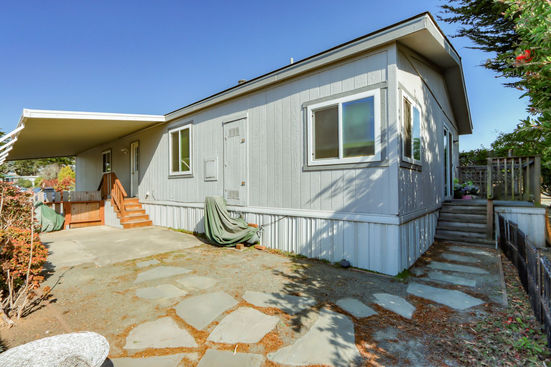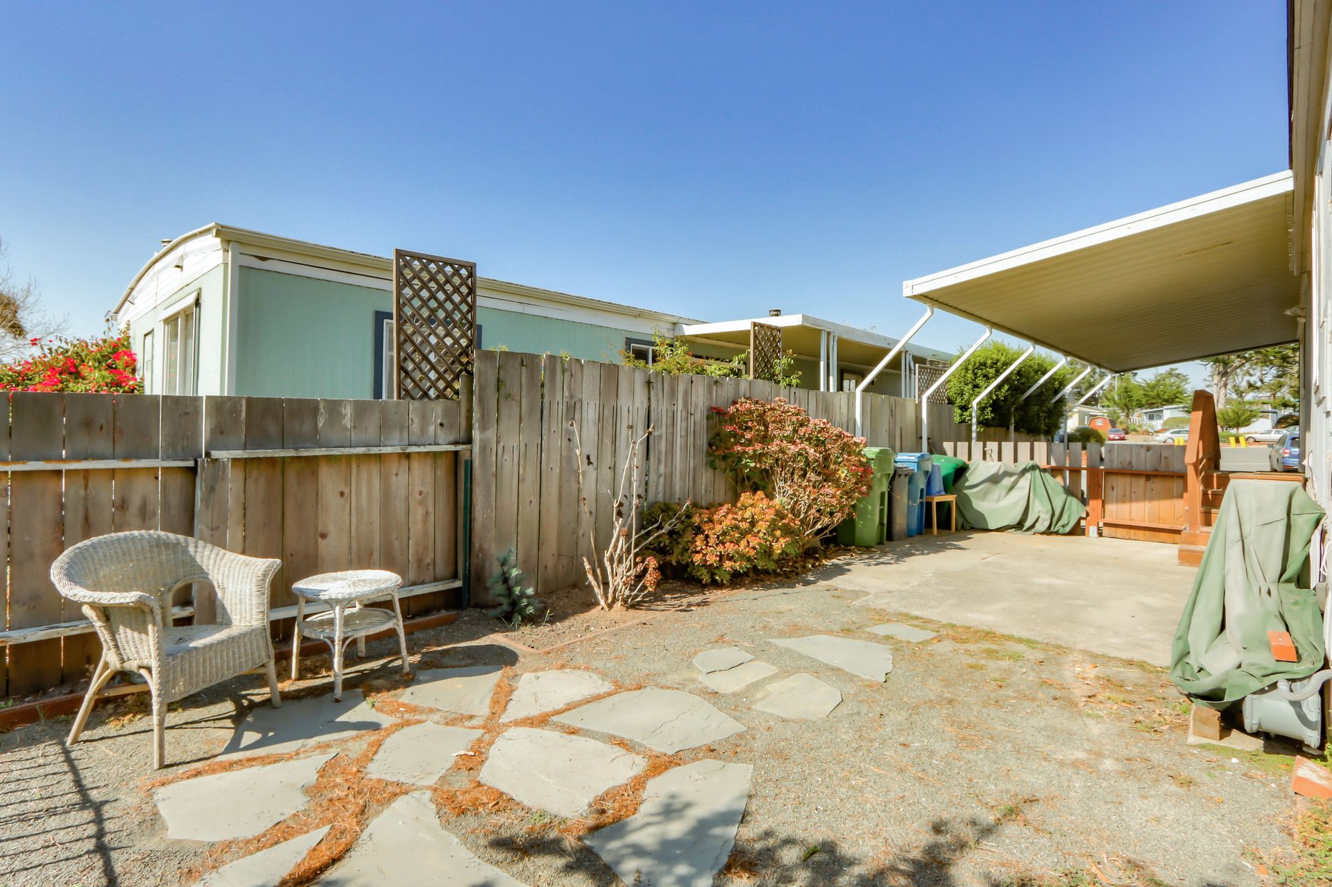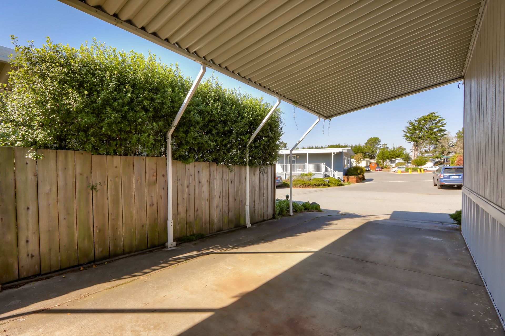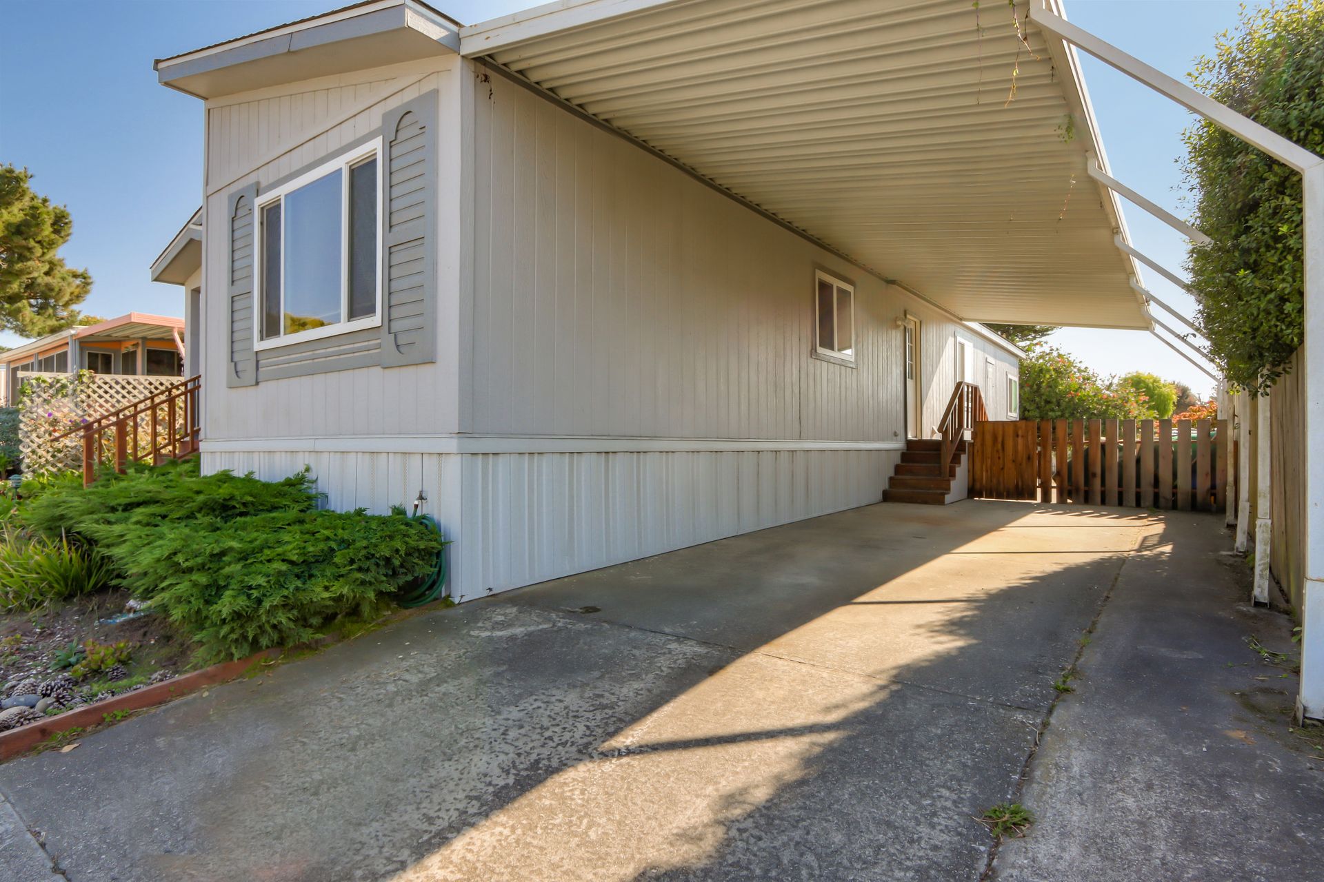 This spacious home with an approximately 28 foot width, has vaulted ceilings, offers finished walls, wood-like flooring and double-pane windows. Living and dining rooms are open, made for gathering. Kitchen has a breakfast bar and features a skylight. The laundry room is next to the kitchen with side entry door from the carport for ease in bringing in groceries. There are three bedrooms and two bathrooms. Hall bathroom has a tub with shower. The master suite has a large walk-in closet. The master bath has both a tub and stall shower, with linen closet. A sliding door from the master bedroom opens to a deck and private backyard with bushes, trees and stone culvert adding separation. Two-car covered carport provides tandem parking. Located in the much sought after 55+ Community of Canada Cove, near beaches, golf, trail, south downtown Half Moon Bay. Home is on leased land, Park approval required for purchase. Feel the sea breeze and enjoy living by the sea!!