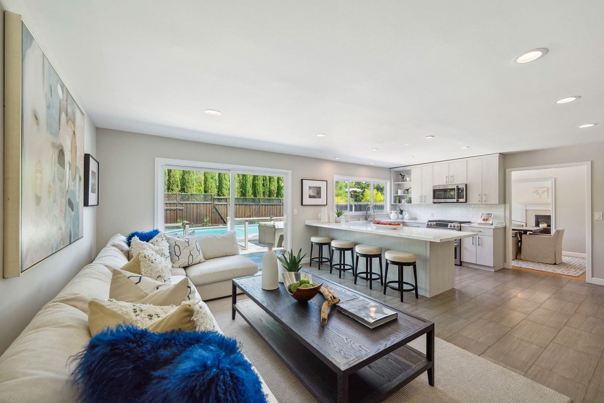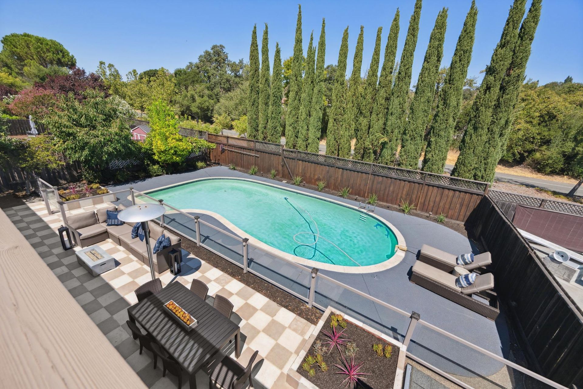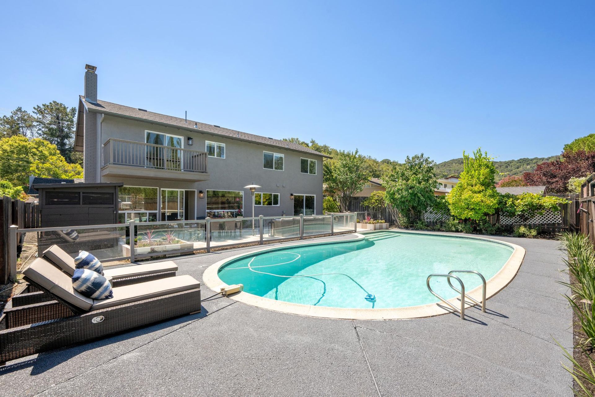 - Private backyard retreat with swimming pool, large patio and lush greenery
