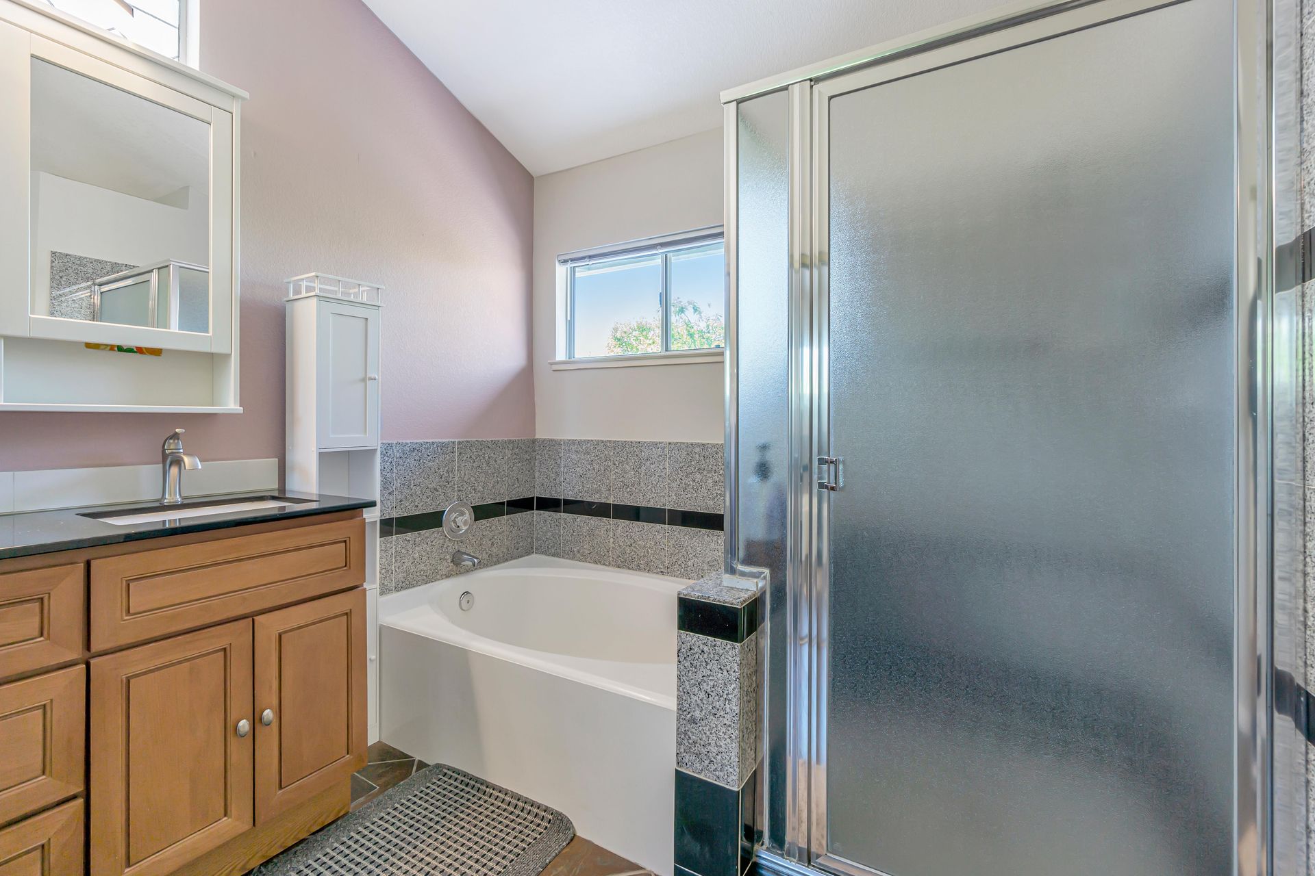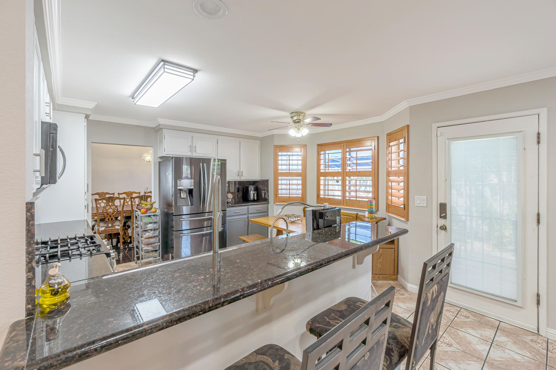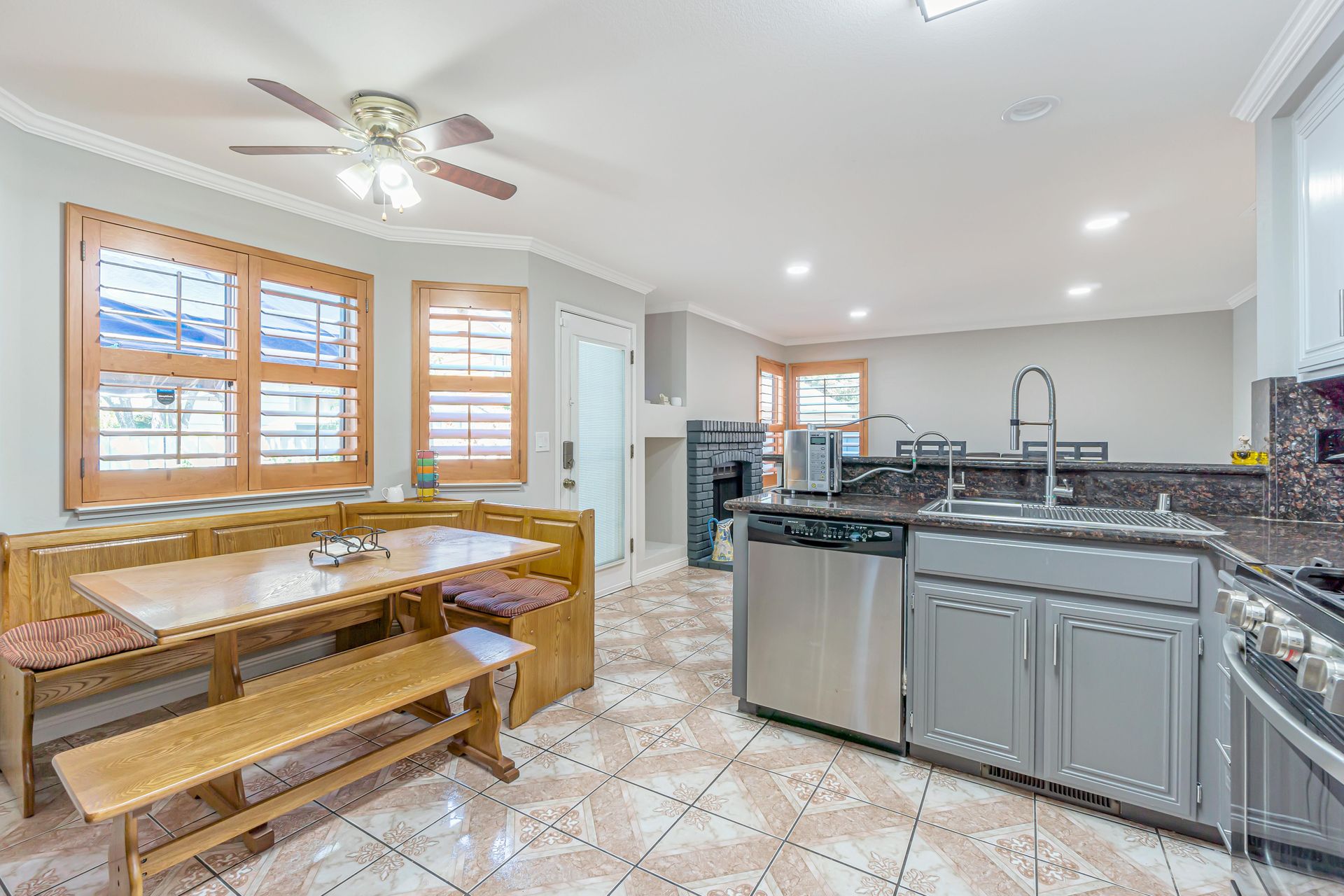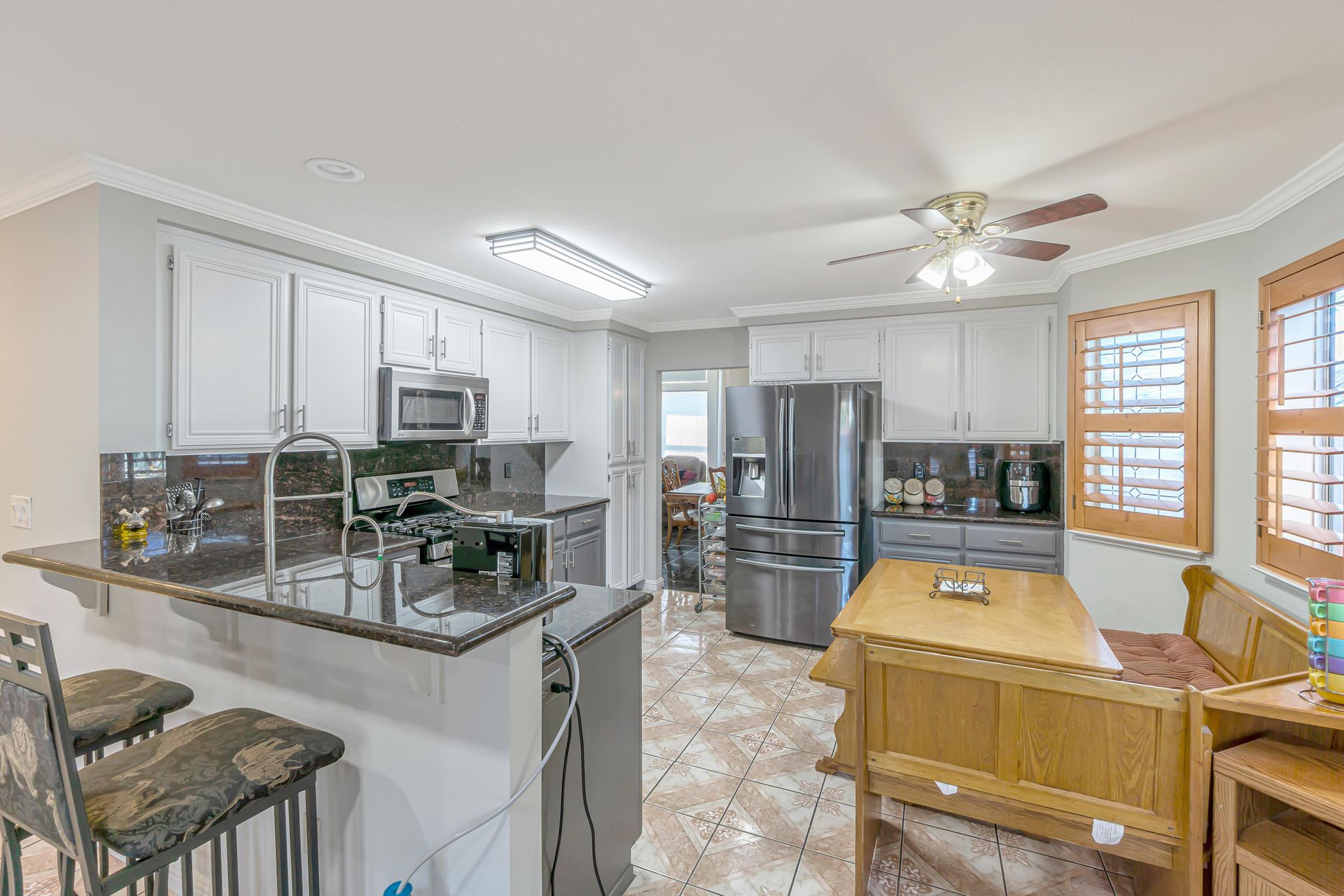 Remodeled, the kitchen features a breakfast bar and breakfast nook, because what party does not start in the kitchen. Additionally, the freshly painted cabinets make this kitchen shine! There is a downstairs bedroom and full bathroom and three bedrooms upstairs. Two bedrooms share a dual entrance bath and the primary bathroom includes a soaking tub, shower and walk-in closet. All closet doors throughout the home are upgraded to mirror doors, adding to the light in the home. Downstairs is a tiled in kitchen, family room and living room. The downstairs bedroom has engineered wood flooring while the stairs and upstairs bedrooms all have beautiful laminate floors. This home is move-in ready.