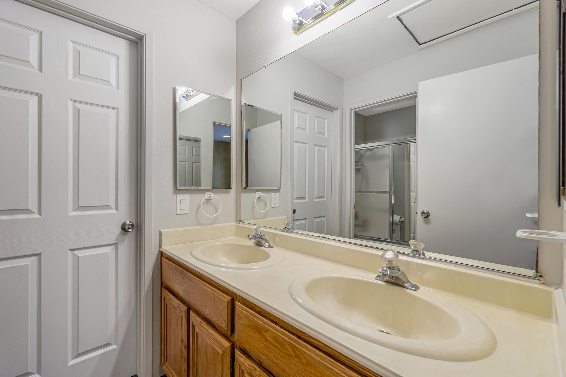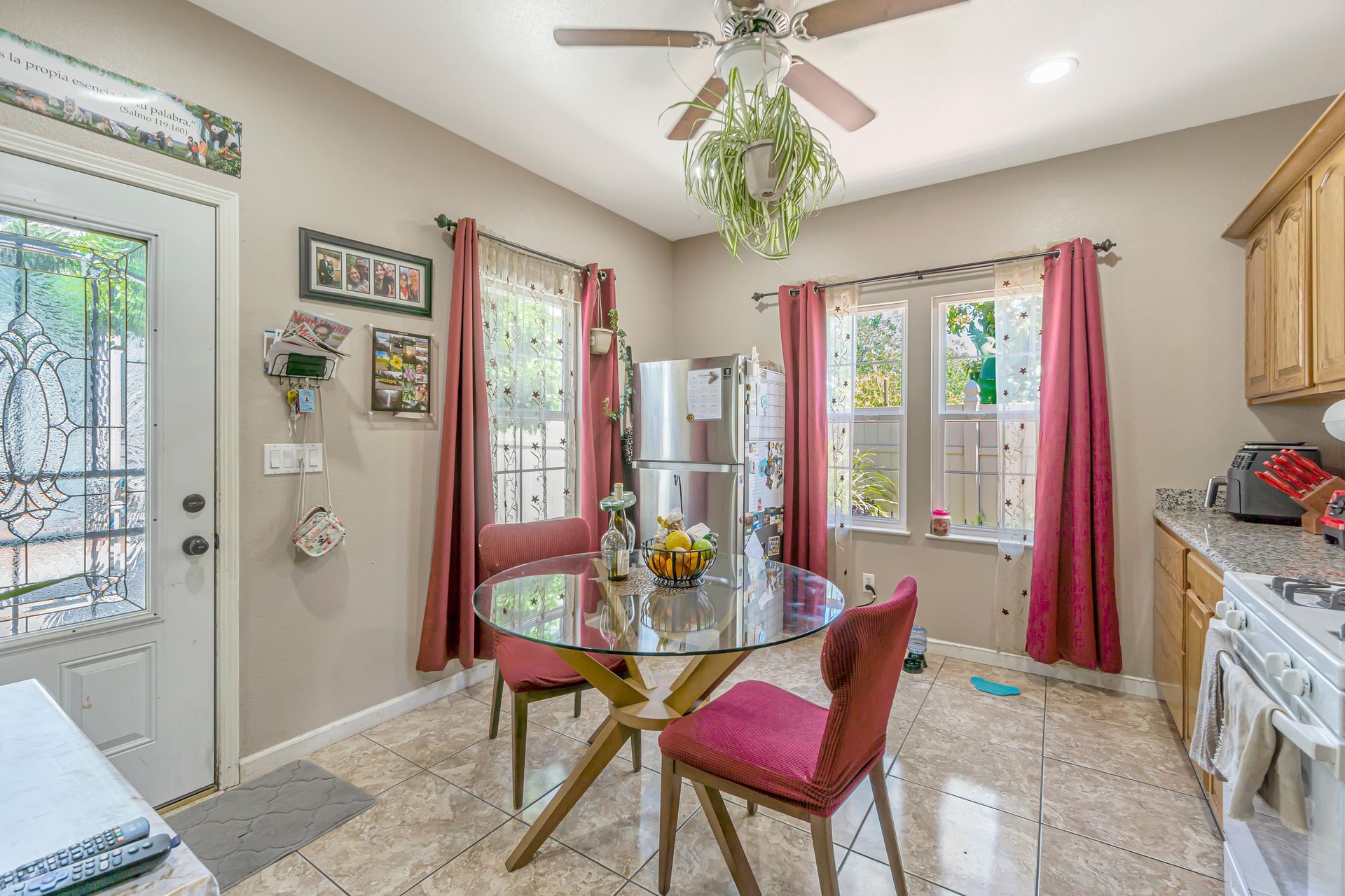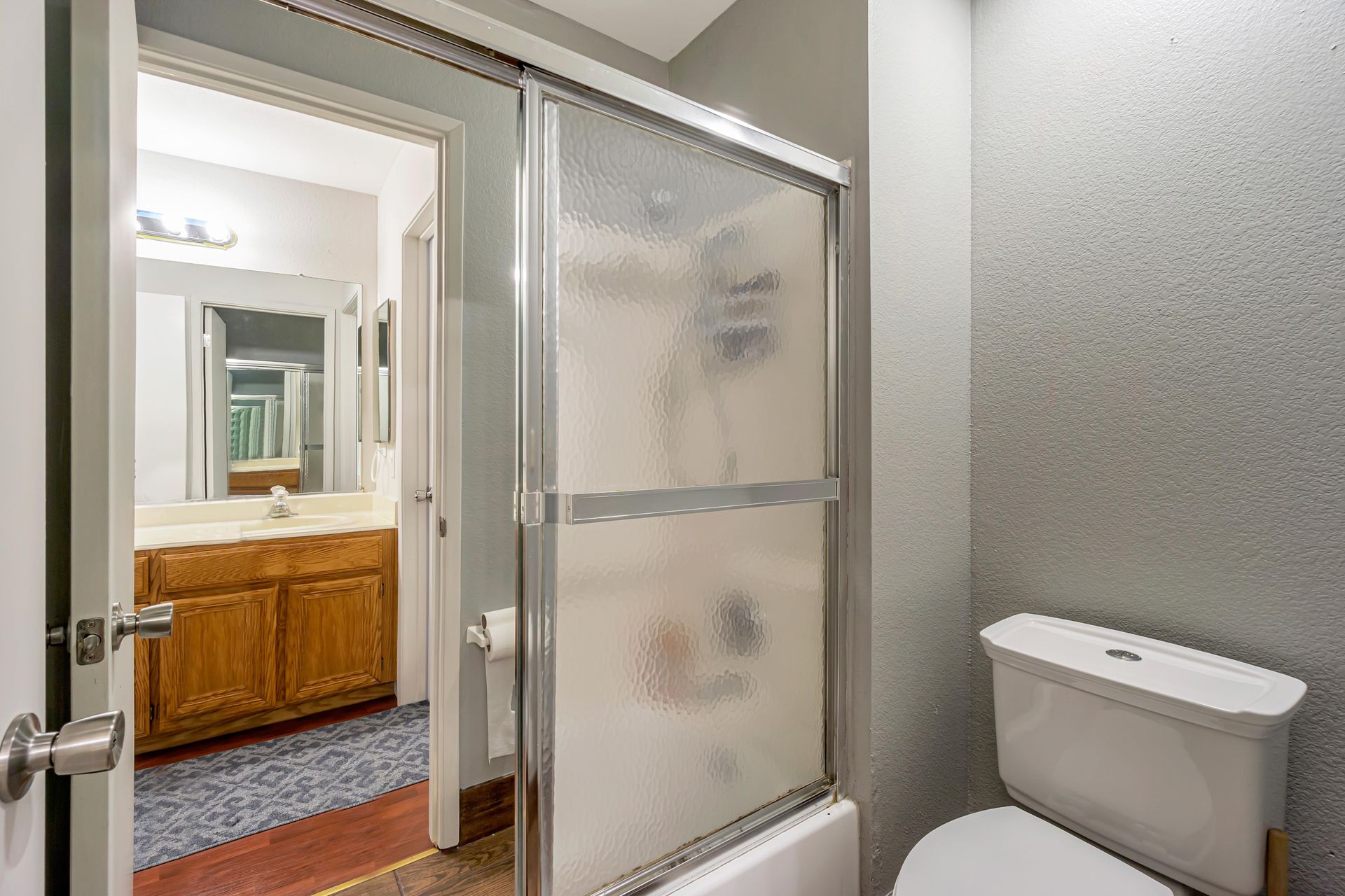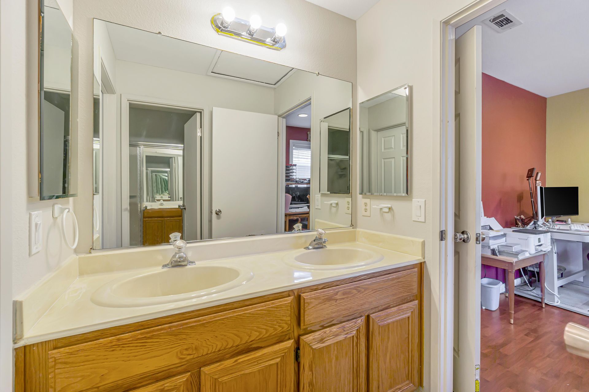 Remodeled, the kitchen features a breakfast bar and breakfast nook, because what party does not start in the kitchen. Additionally, the freshly painted cabinets make this kitchen shine! There is a downstairs bedroom and full bathroom and three bedrooms upstairs. Two bedrooms share a dual entrance bath and the primary bathroom includes a soaking tub, shower and walk-in closet. All closet doors throughout the home are upgraded to mirror doors, adding to the light in the home. Downstairs is a tiled in kitchen, family room and living room. The downstairs bedroom has engineered wood flooring while the stairs and upstairs bedrooms all have beautiful laminate floors. This home is move-in ready.