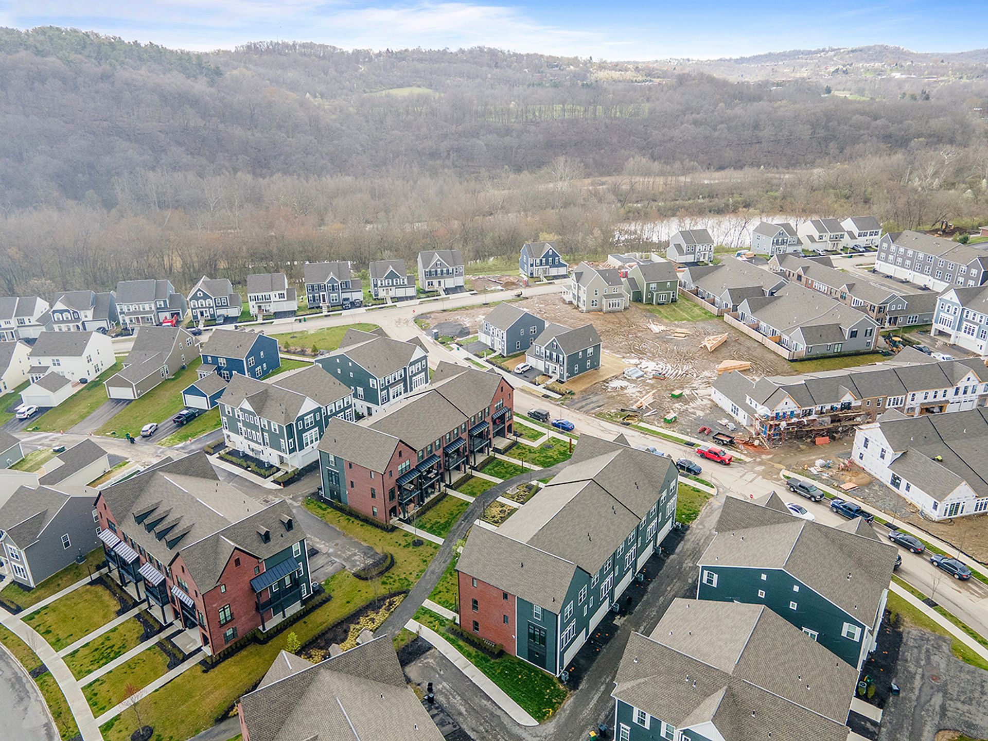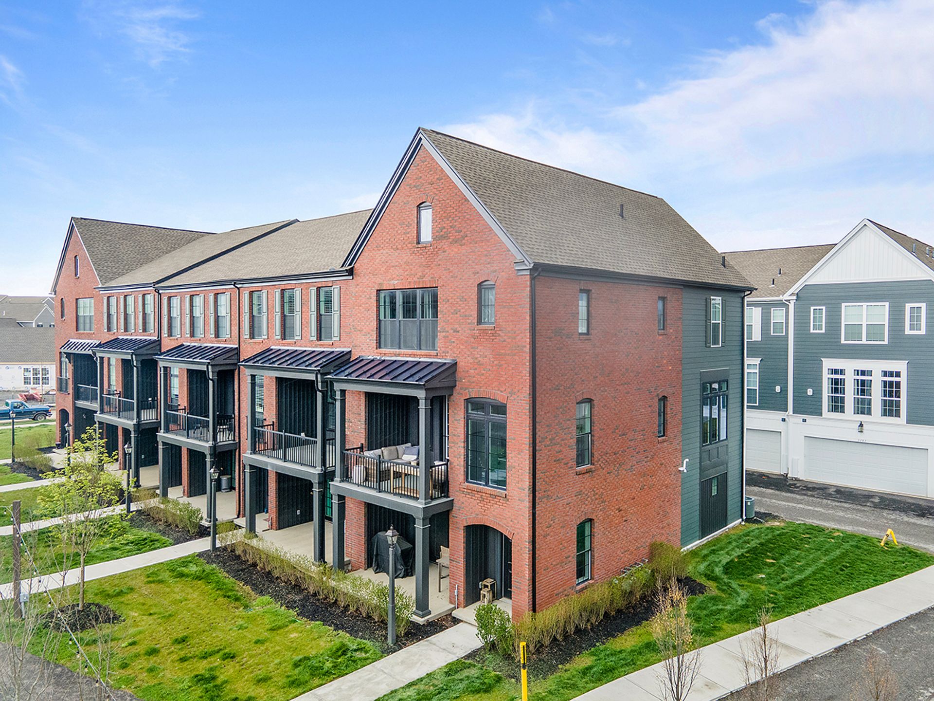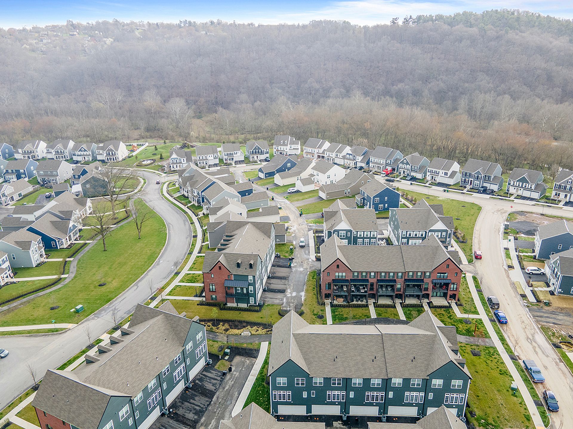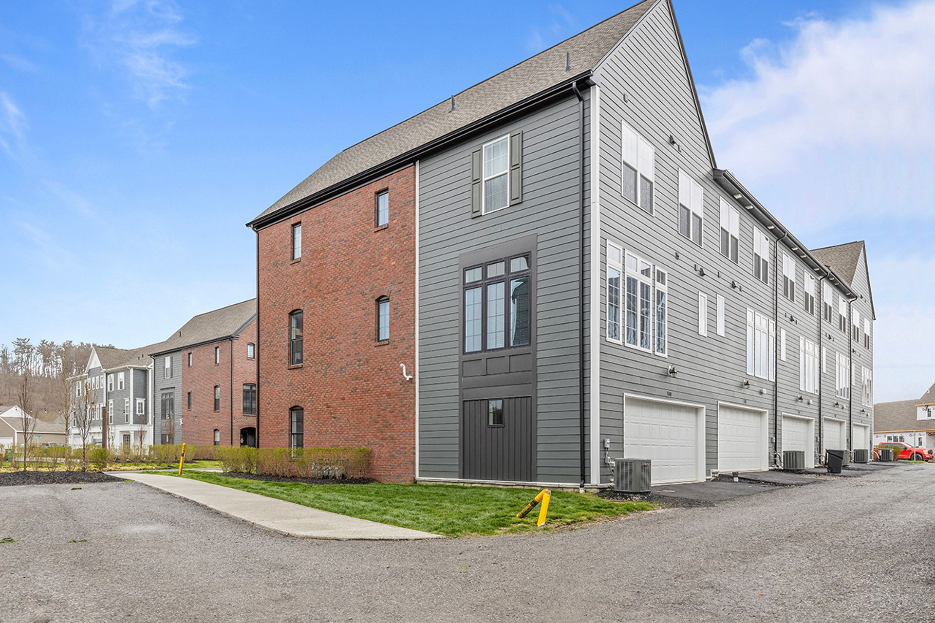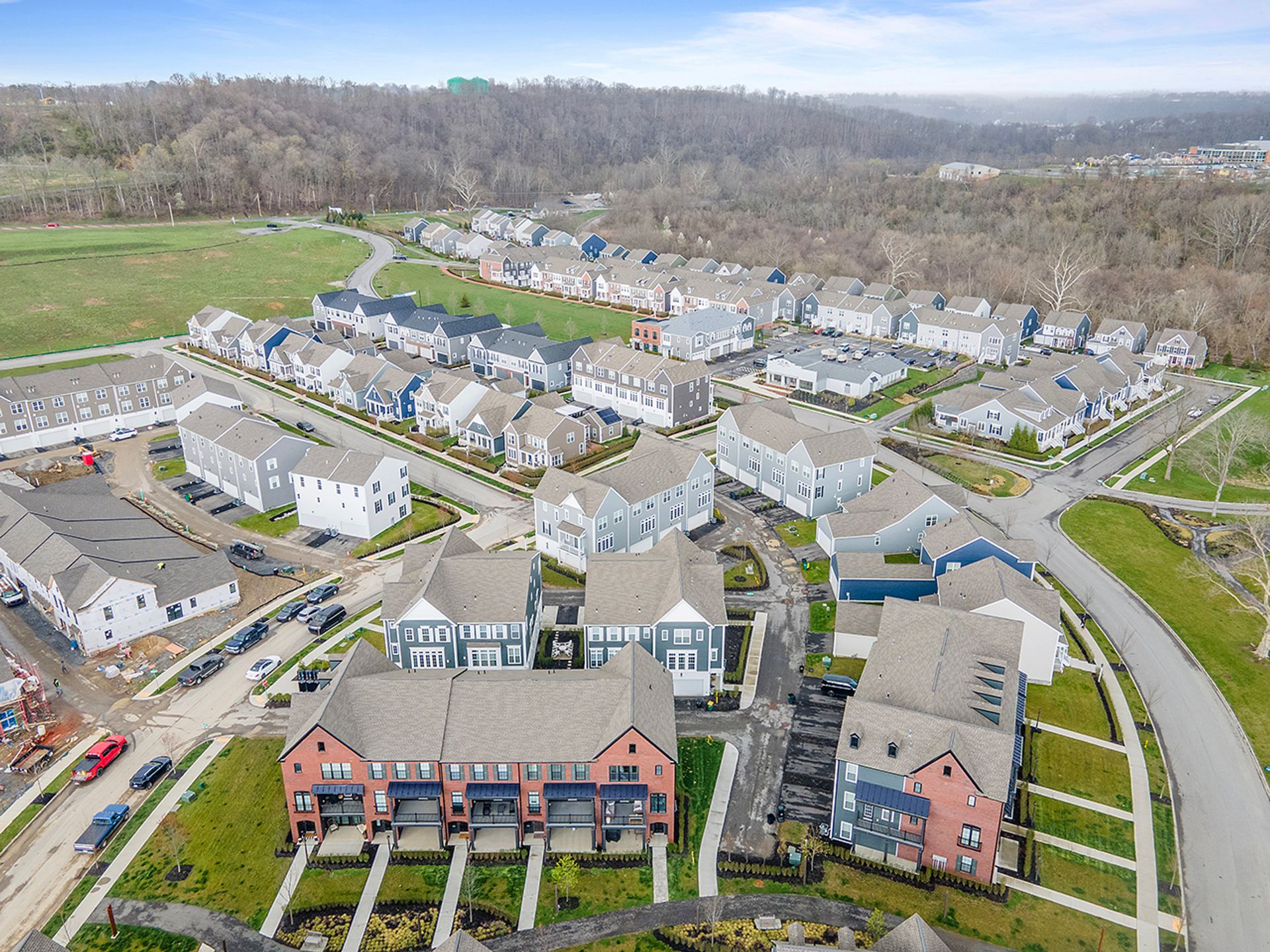 This END UNIT Brownstone offers tons of curb appeal, two covered outdoor spaces, a side yard and an immense amount of natural light. The home is located in the sought-after community of Hastings offering a brewery, restaurant, salon, coffee/juice shop, yoga studio, veterinary clinic, scenic trails, playgrounds and is 30 minutes to Downtown Pittsburgh! This end unit is loaded with upgrades and offers one of the more modern floor plans in the community. It boasts not only three bedrooms, but also a bright office with a glass door on the main floor, and the half bath is tucked down a separate hallway as opposed to other units where it is right in the living space. The first floor was upgraded with a finished bonus room option and a wet bar, quartz and beverage fridge. The kitchen boasts quartz counters, sleek appliances, a hood vent and spacious pantry. The dining room has two massive picture windows and plenty of room for a large table. Additional features include an inviting covered porch, eight-foot doors on the main floor, laundry on the bedroom level and a luxurious primary suite with a walk-in closet.