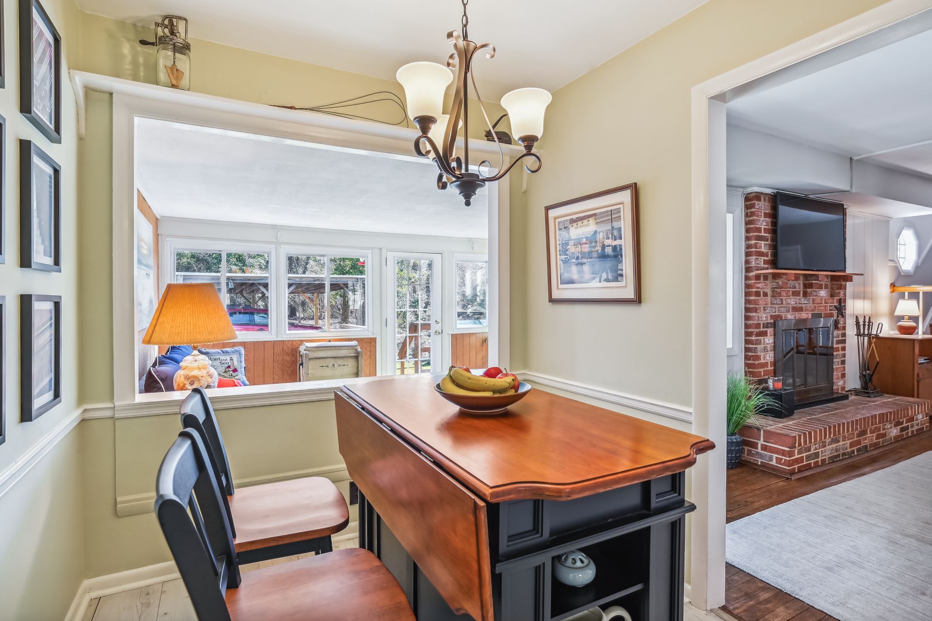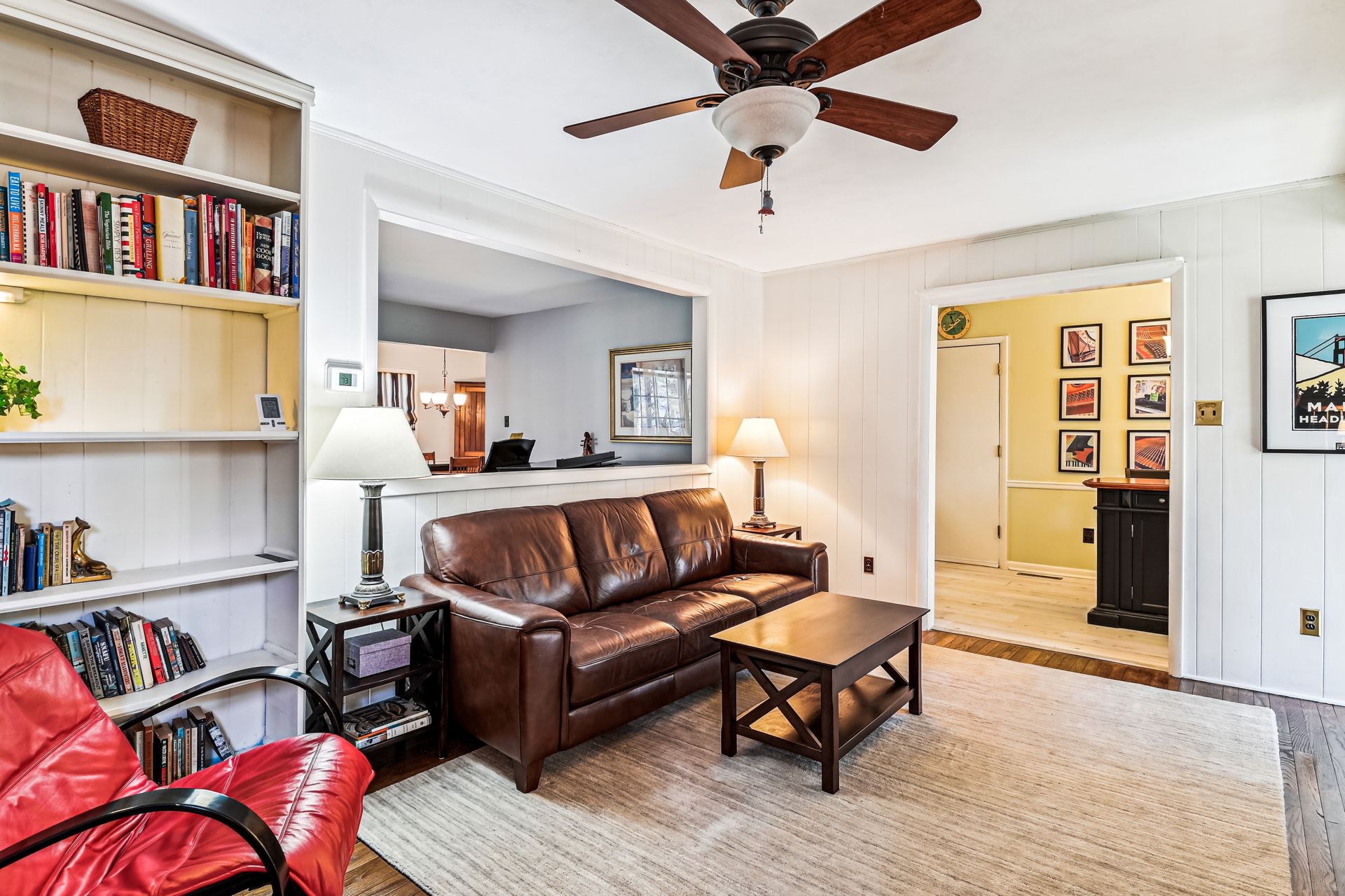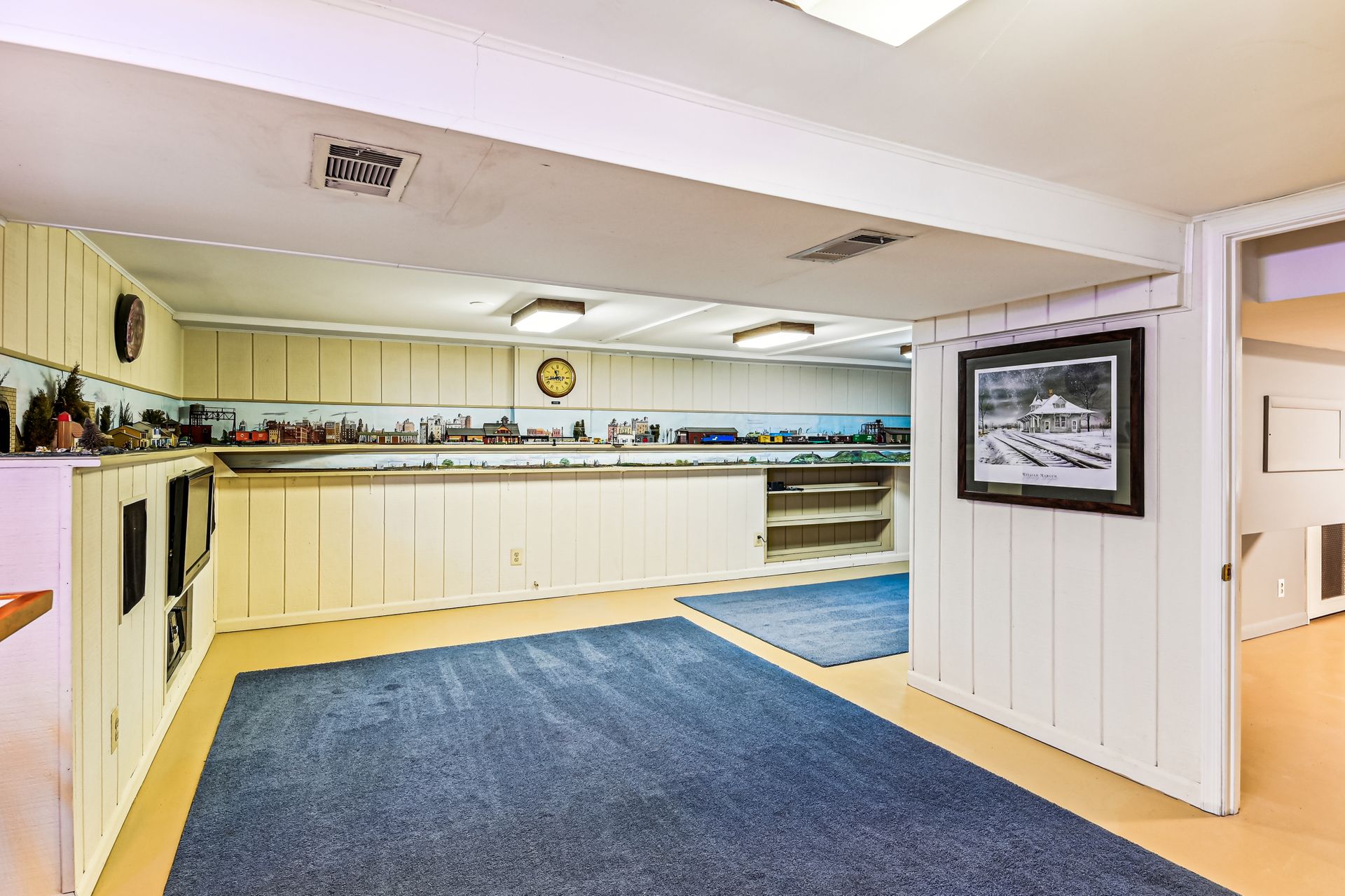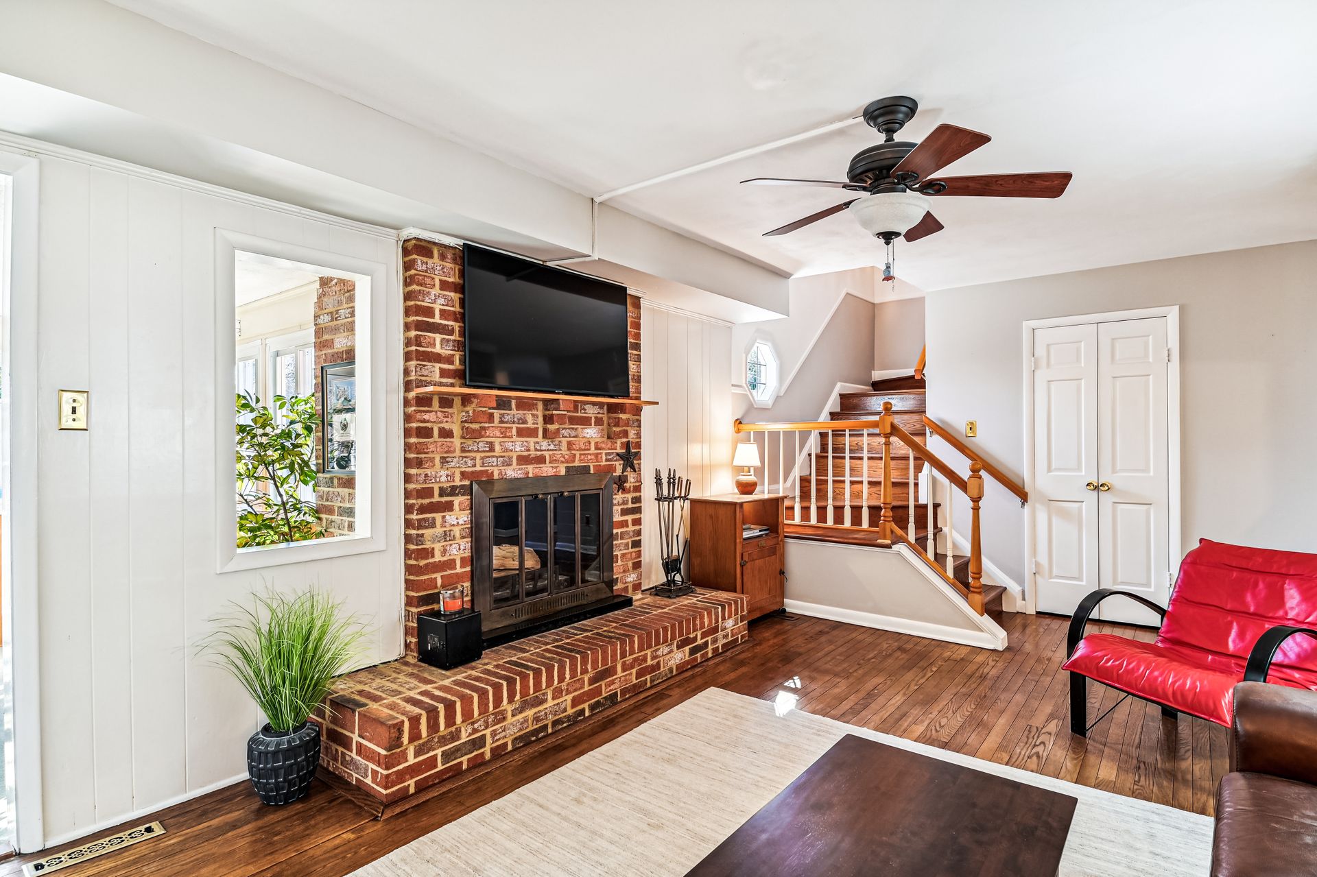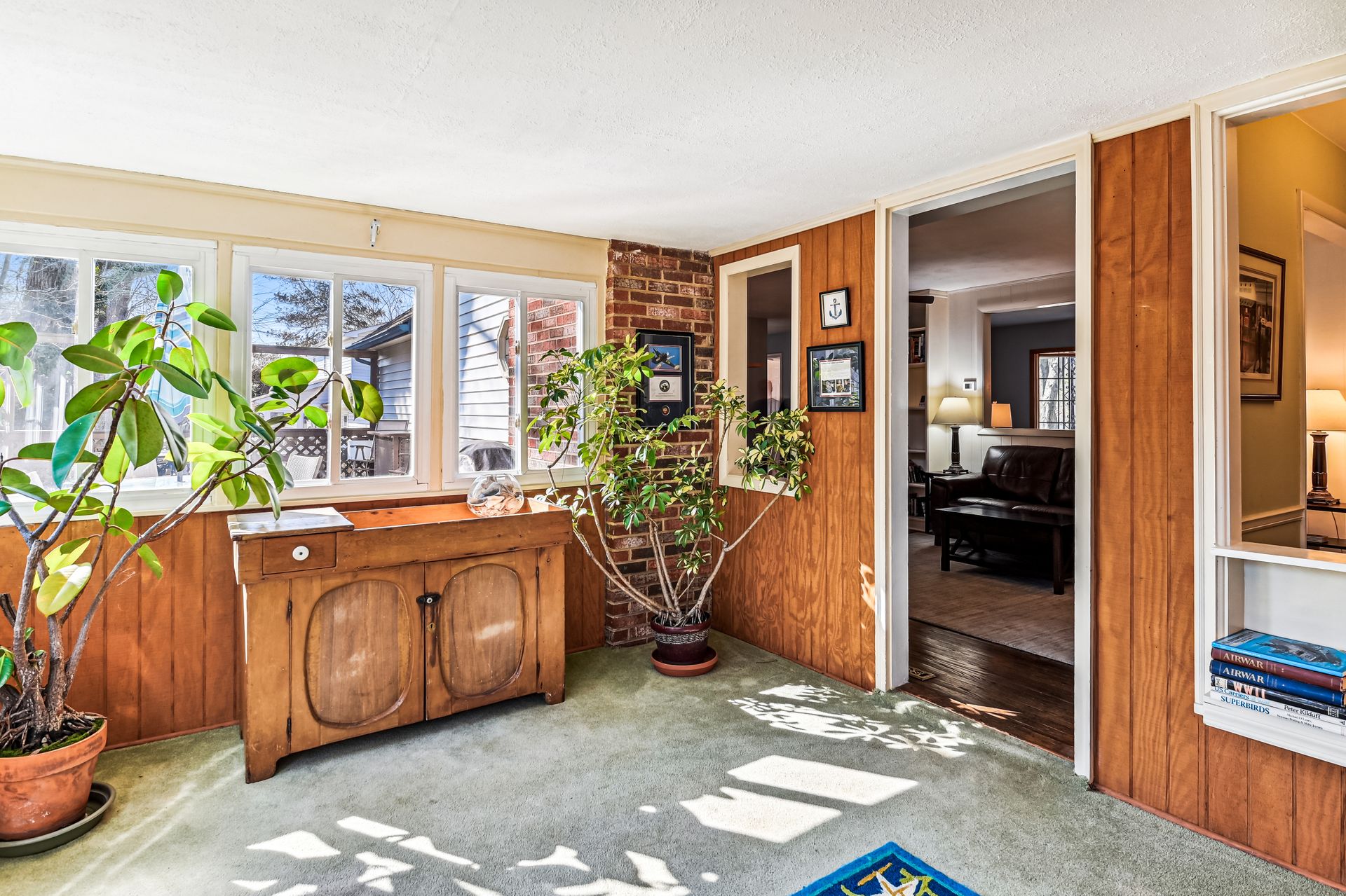 Inside you'll find a well-designed floor plan that seamlessly blends functionality with comfort. A main level bedroom or office, two full bathrooms, a formal dining room, a living room, family room with a brick woodburning fireplace, a three-season porch overlooking an adjoining outside deck, a galley kitchen and adjoining breakfast area. Throughout the home, you'll find original hardwood floors and charming details that add warmth and character to the interior. Additional bedrooms upstairs. The club basement includes a working model train layout, a work or hobby room, and a bar. There's a one-car rear entrance garage and a two-car carport out back connected to a large, paved driveway.