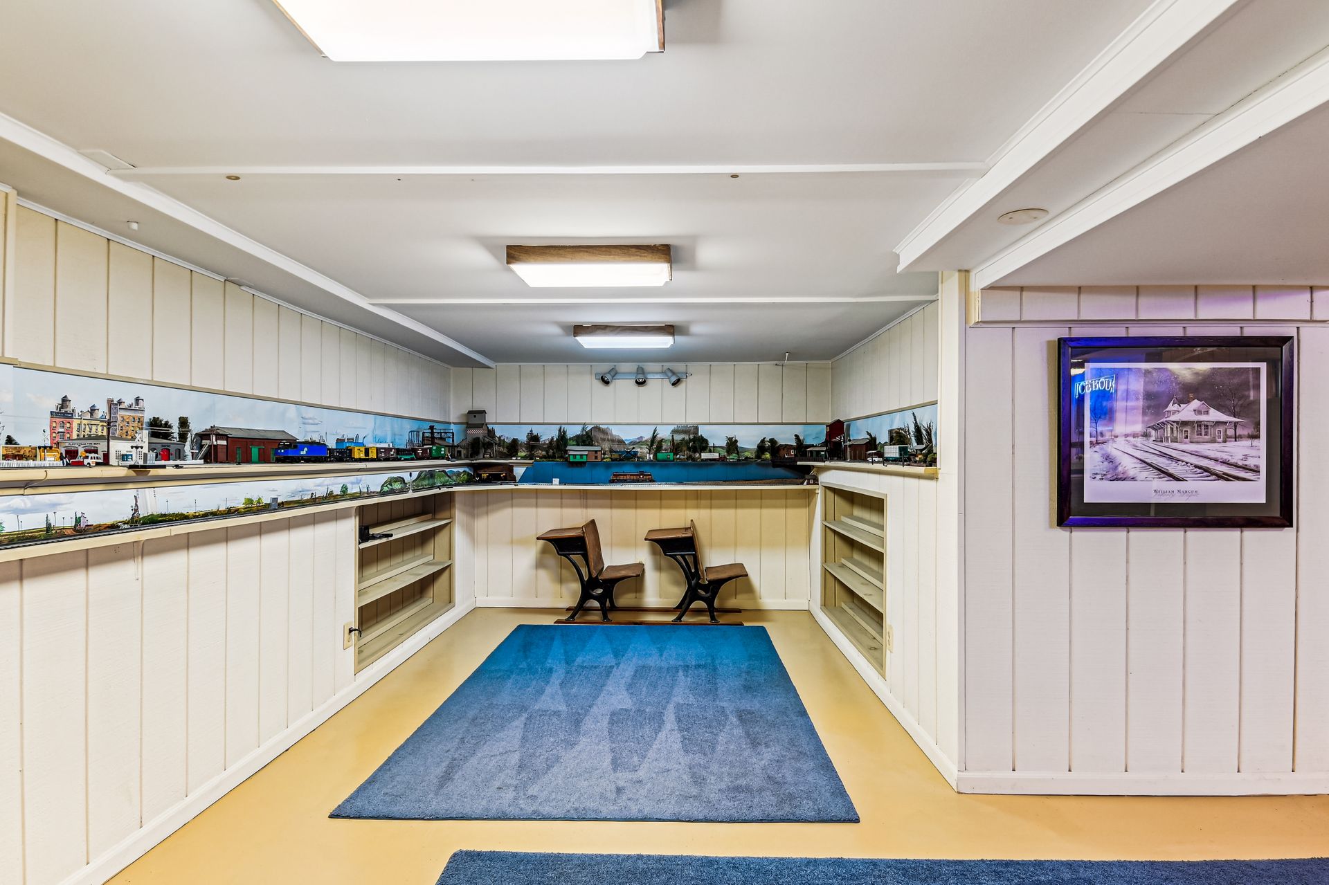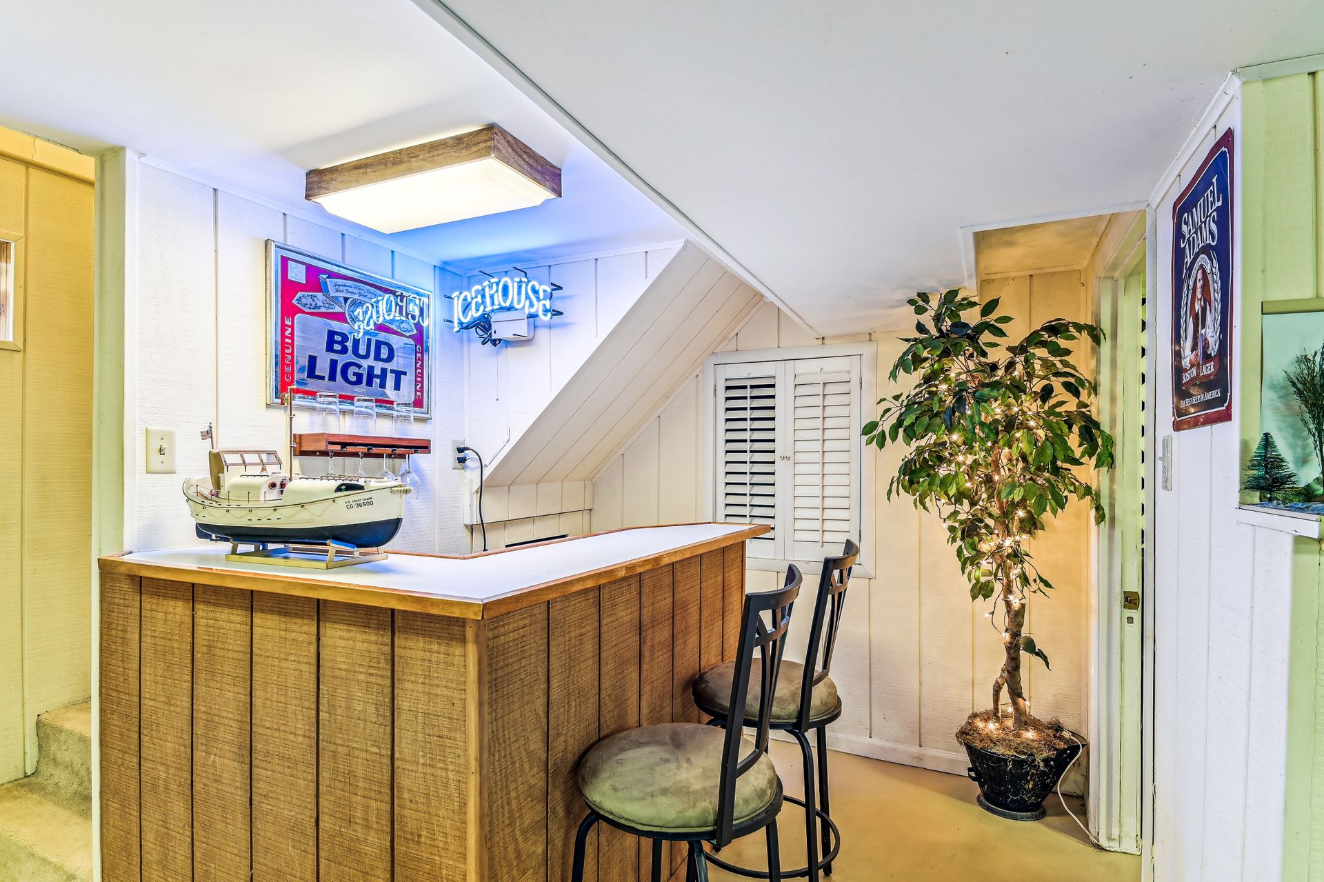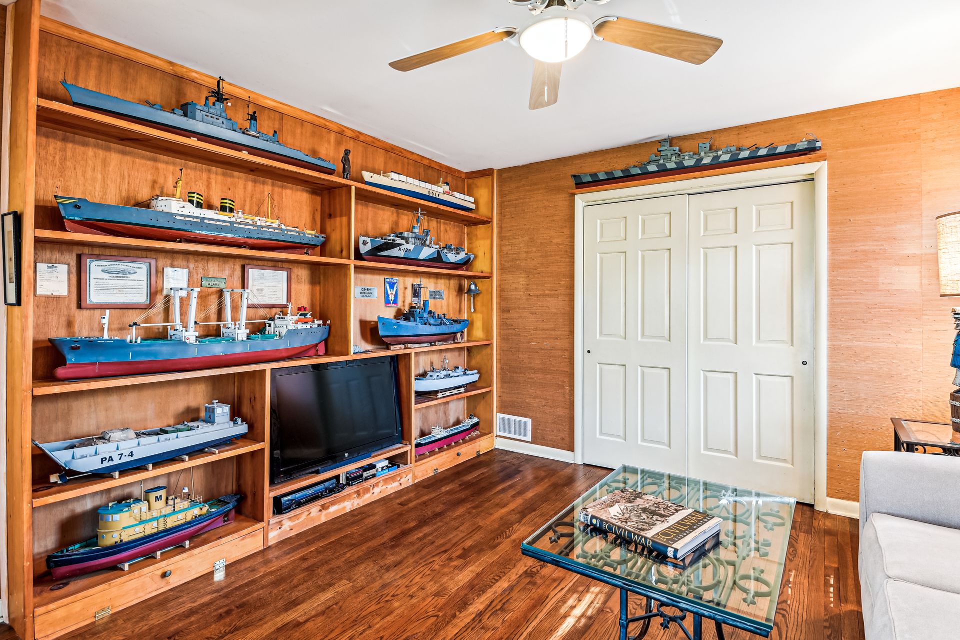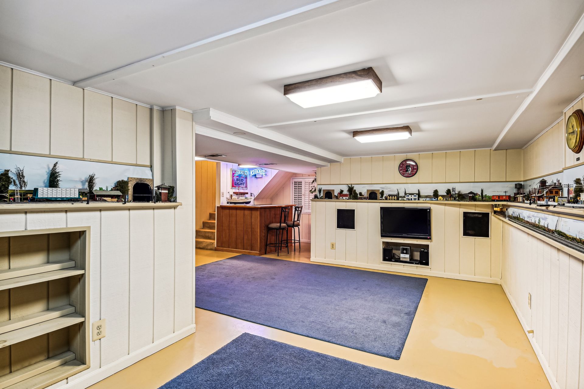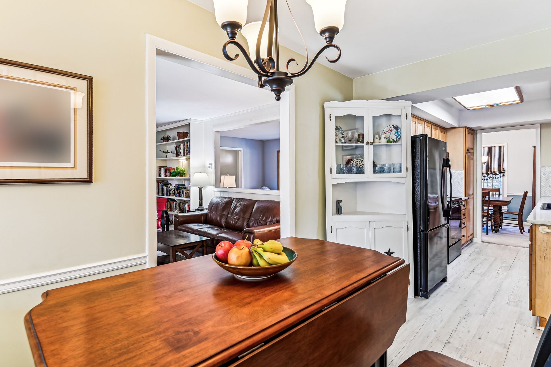 Inside you'll find a well-designed floor plan that seamlessly blends functionality with comfort. A main level bedroom or office, two full bathrooms, a formal dining room, a living room, family room with a brick woodburning fireplace, a three-season porch overlooking an adjoining outside deck, a galley kitchen and adjoining breakfast area. Throughout the home, you'll find original hardwood floors and charming details that add warmth and character to the interior. Additional bedrooms upstairs. The club basement includes a working model train layout, a work or hobby room, and a bar. There's a one-car rear entrance garage and a two-car carport out back connected to a large, paved driveway.