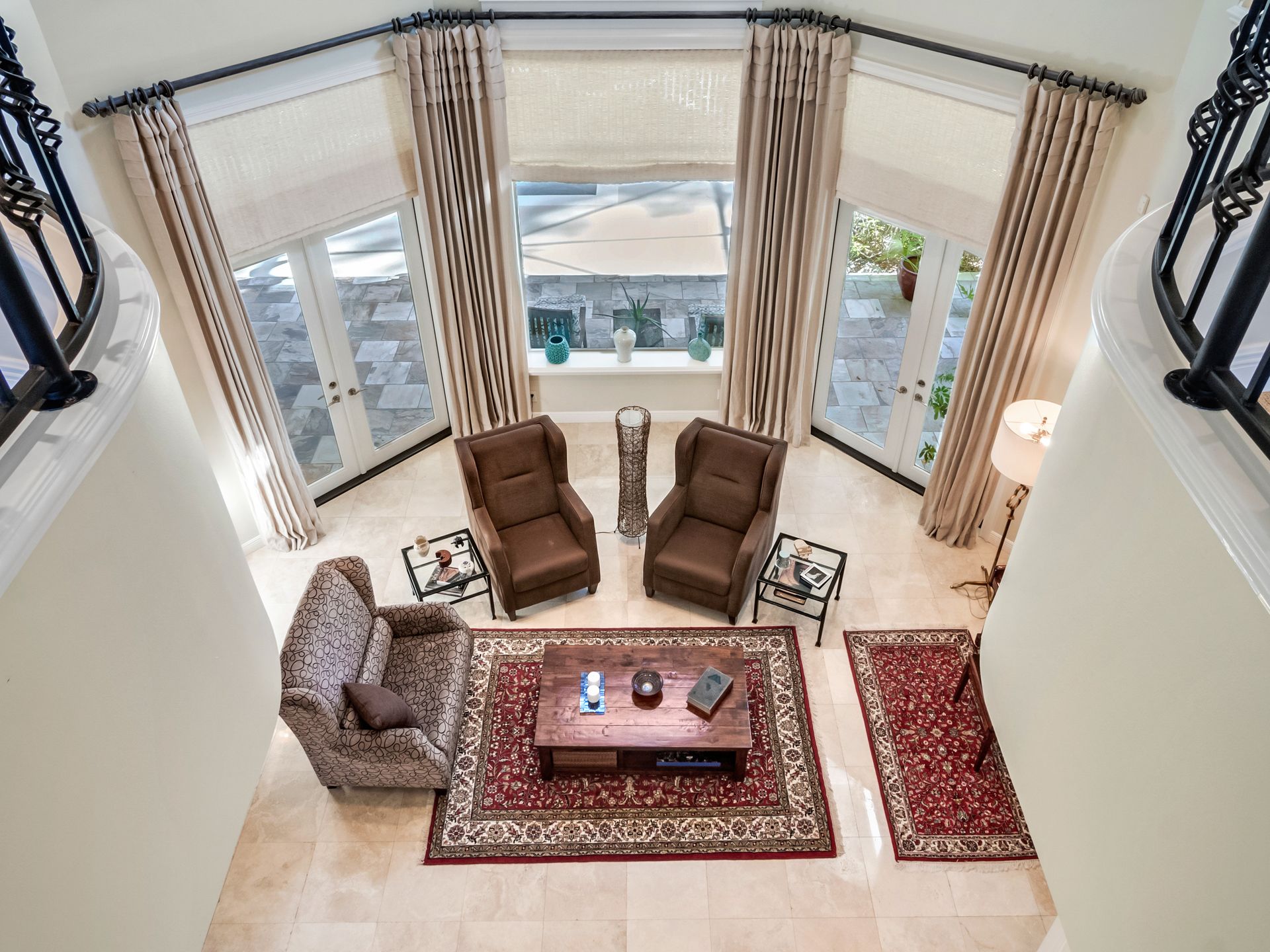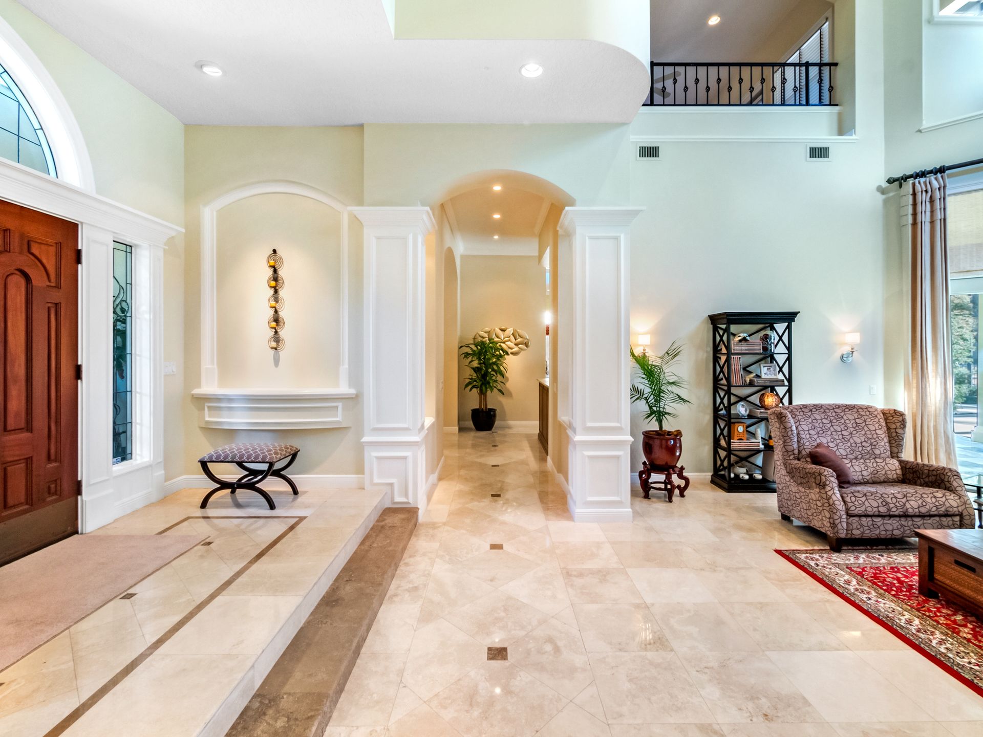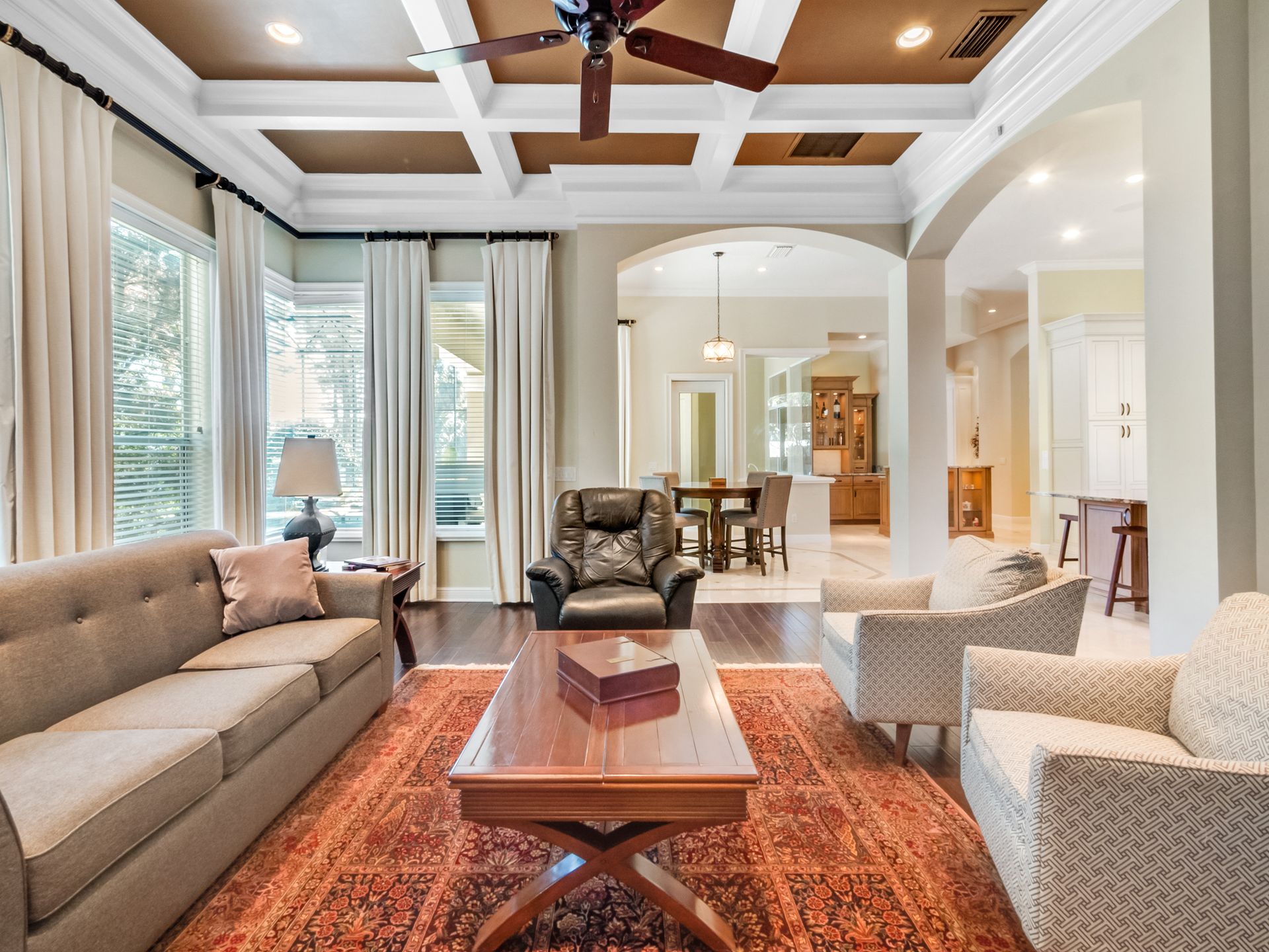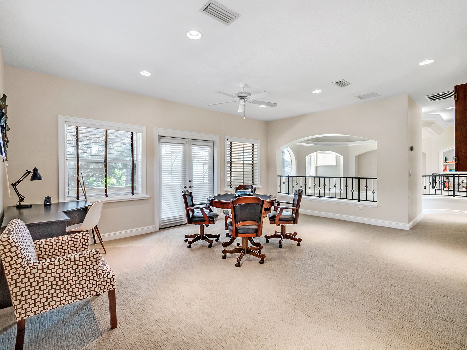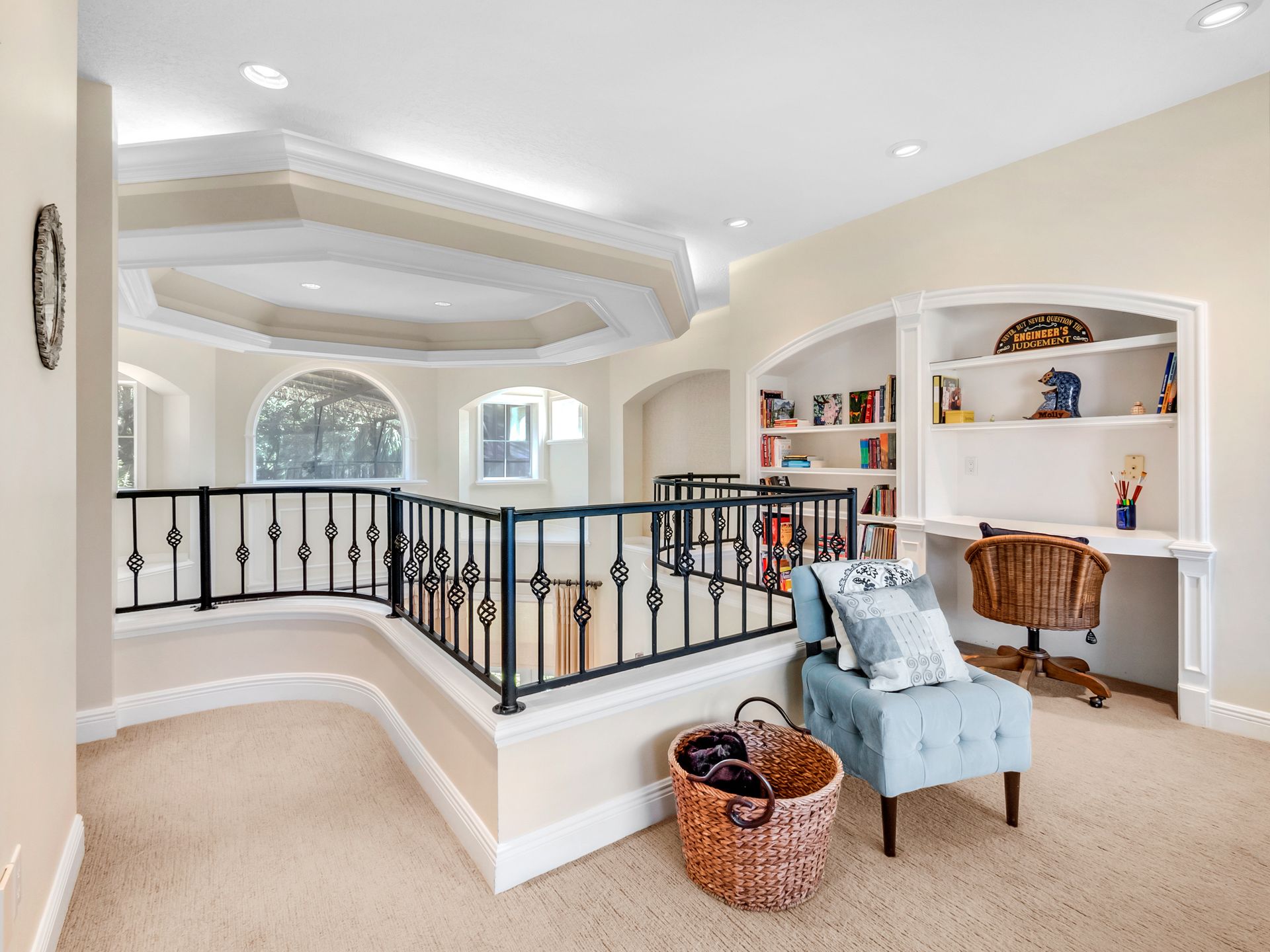 Impeccable golf course estate in Alaqua. This fine home has received loving and meticulous care and is ready for you to settle right in. The custom designed floor plan caters to the entertainer with soaring coffered ceilings, open spaces, formal dining room, wet bar and expansive pool and spa nestled on the 16th fairway. The first floor owners retreat offers luxurious privacy, expansive double closets with tremendous cabinetry and wardrobe organization. The additional bedroom on the first floor has a private entry from the exterior, creating the opportunity for very comfortable guests. The home office also enjoys its own private entrance to the right of the front door, perfect for at-home business meetings. The gourmet kitchen is outfitted with luxury appliances and gas cooking, antique white cabinets in pristine condition that surround the beautiful and dramatic granite island. Upstairs, you'll find two generous bedrooms, each with private bath. Media room provides space for casual entertainment and relaxation as well as a loft area opening to a balcony with pool and golf views. Alaqua owners enjoy the luxurious amenities of this prestigious community including a 24 hour manned entry gate, tennis, community park and the opportunity to join Alaqua Country Club. Wekiwa Springs State Park, tremendous shopping and dining, the highways and major employers are all within easy access. Alaqua is situated a short drive from Orlando area theme parks as well as New Smyrna and Daytona beaches.