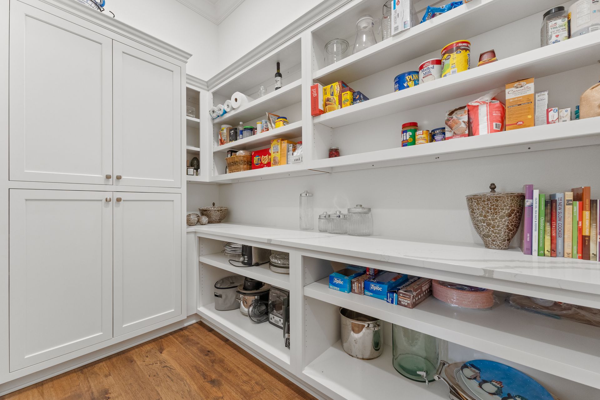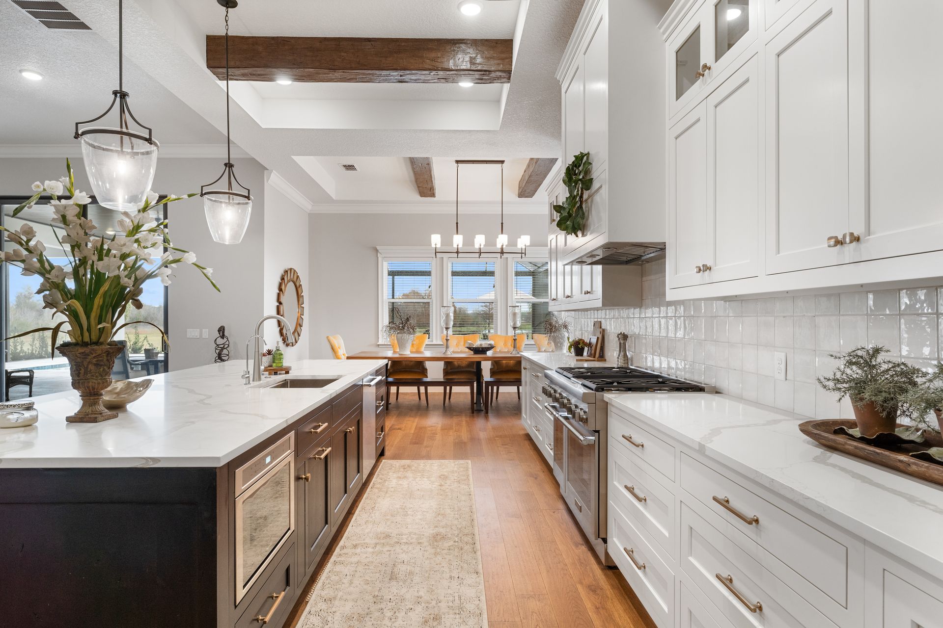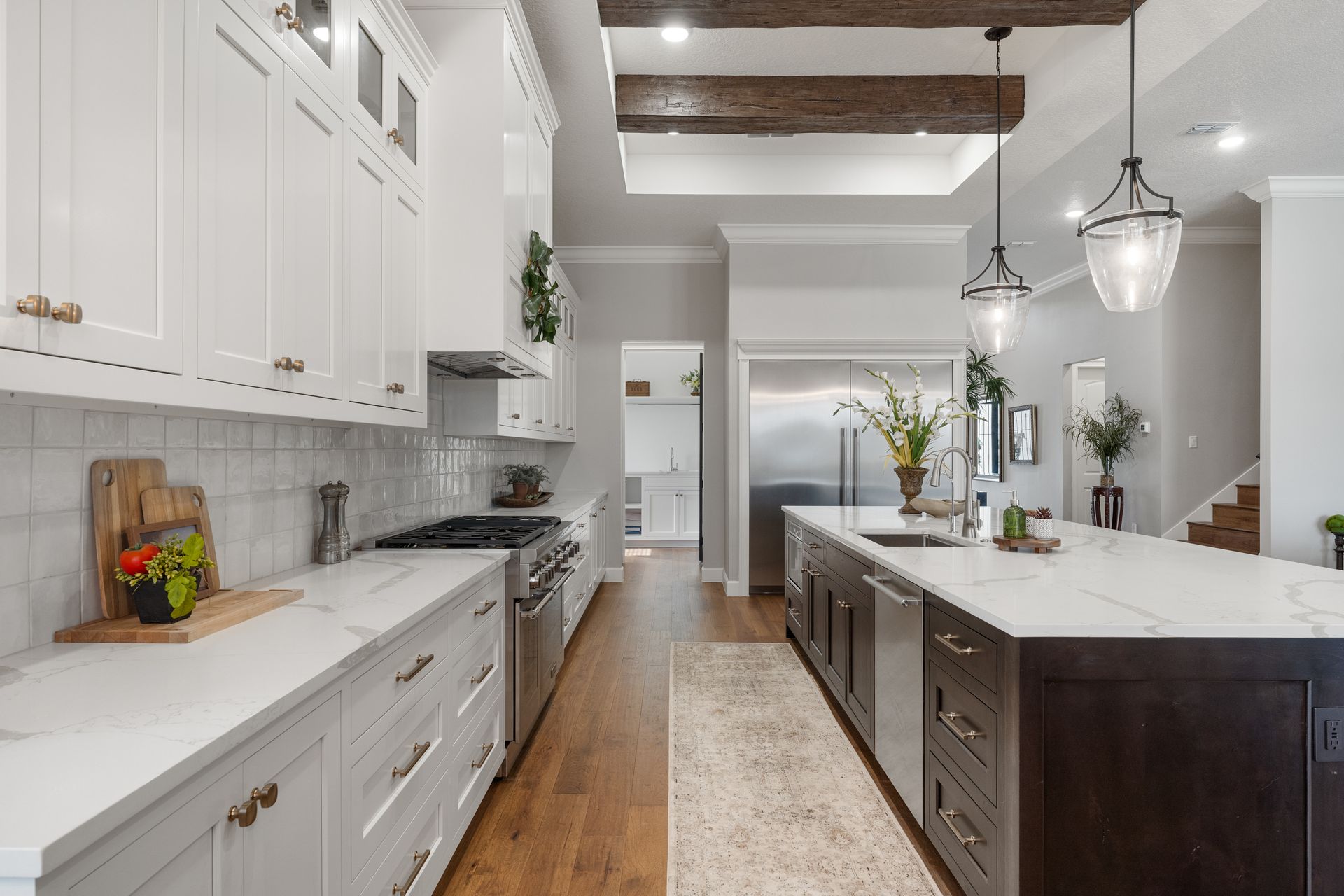 The open floor plan features 12-foot ceilings downstairs and 10-foot ceilings upstairs, filling every room with natural light. Custom cabinetry graces every space, adding elegance and function, while hardwood floors flow throughout the living areas and bedrooms. The elevator offers easy access to both levels, elevating the luxury experience. The chef’s kitchen is a masterpiece with quartz countertops, a striking backsplash, and state-of-the-art appliances, including a custom fridge and commercial-grade gas stove. It’s perfect for both culinary creations and entertaining.