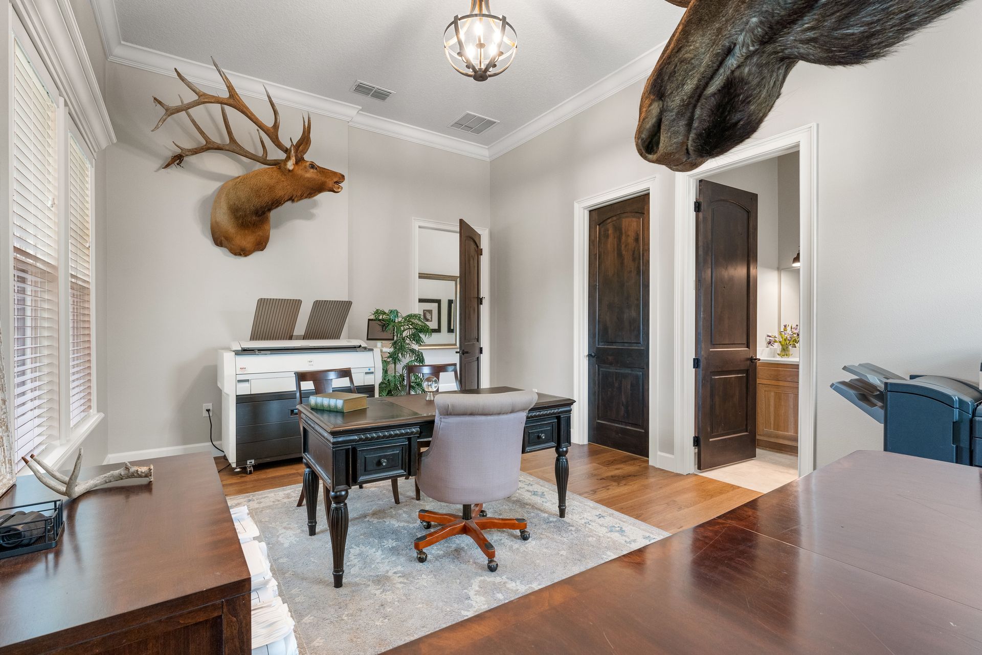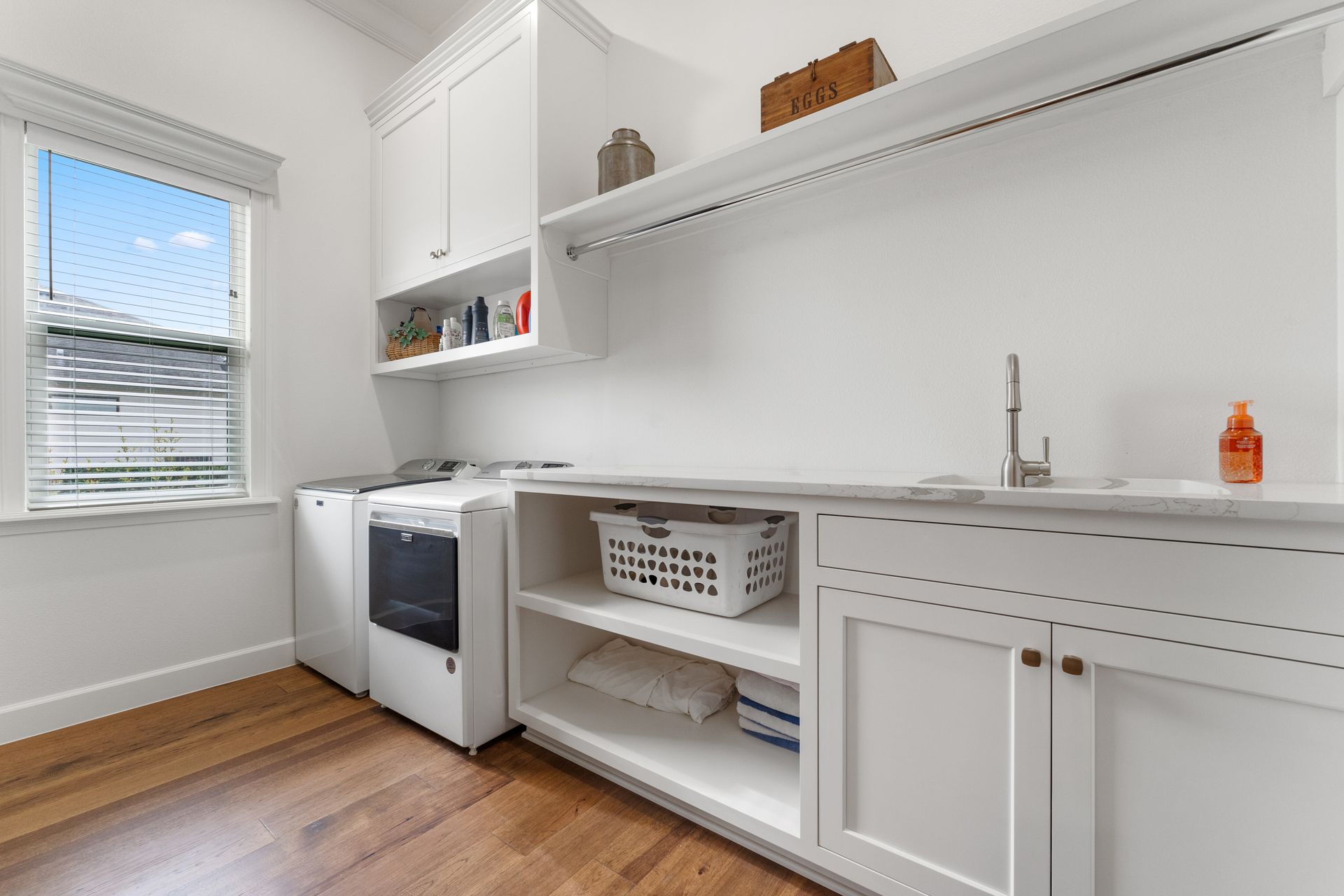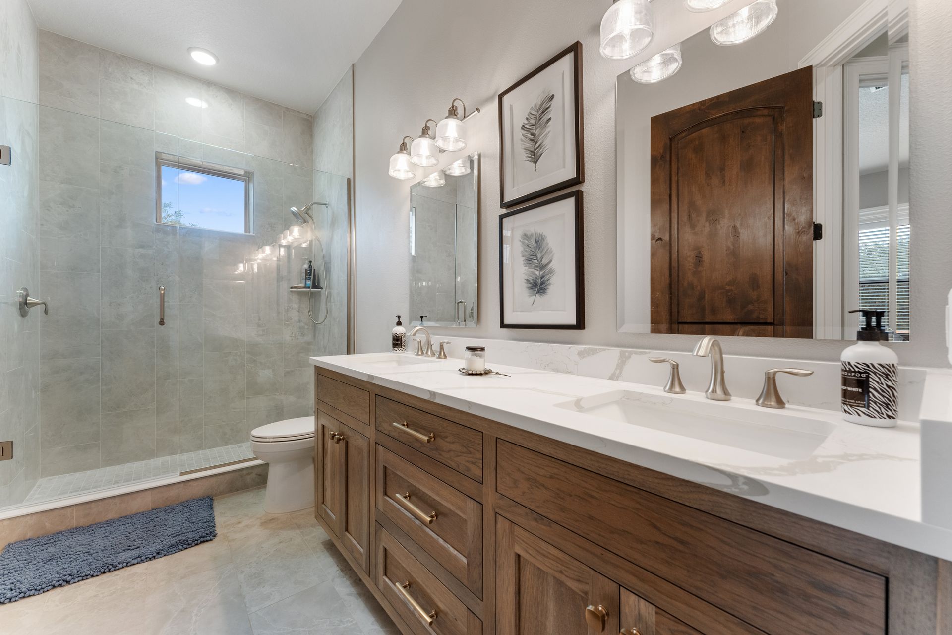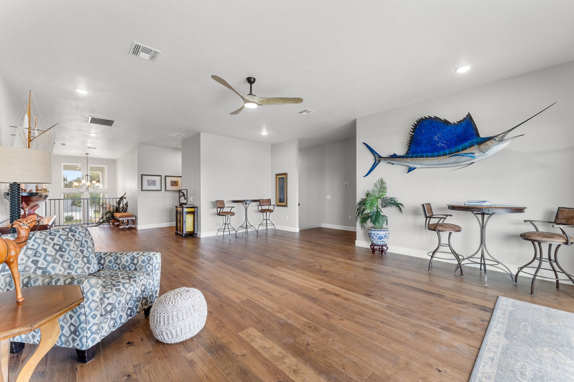 The open floor plan features 12-foot ceilings downstairs and 10-foot ceilings upstairs, filling every room with natural light. Custom cabinetry graces every space, adding elegance and function, while hardwood floors flow throughout the living areas and bedrooms. The elevator offers easy access to both levels, elevating the luxury experience. The chef’s kitchen is a masterpiece with quartz countertops, a striking backsplash, and state-of-the-art appliances, including a custom fridge and commercial-grade gas stove. It’s perfect for both culinary creations and entertaining.