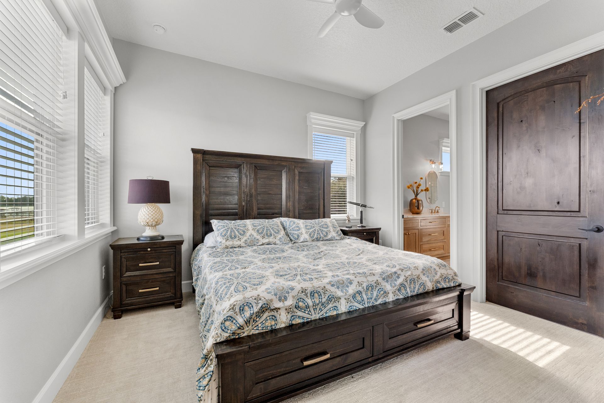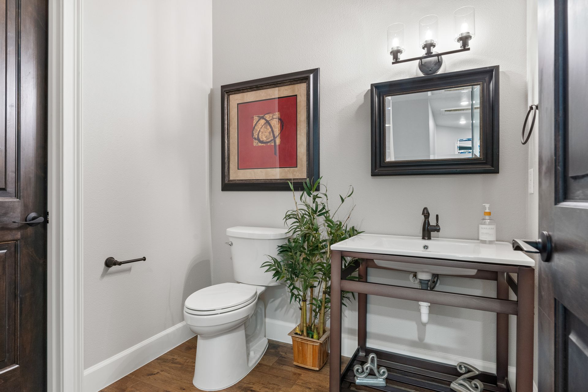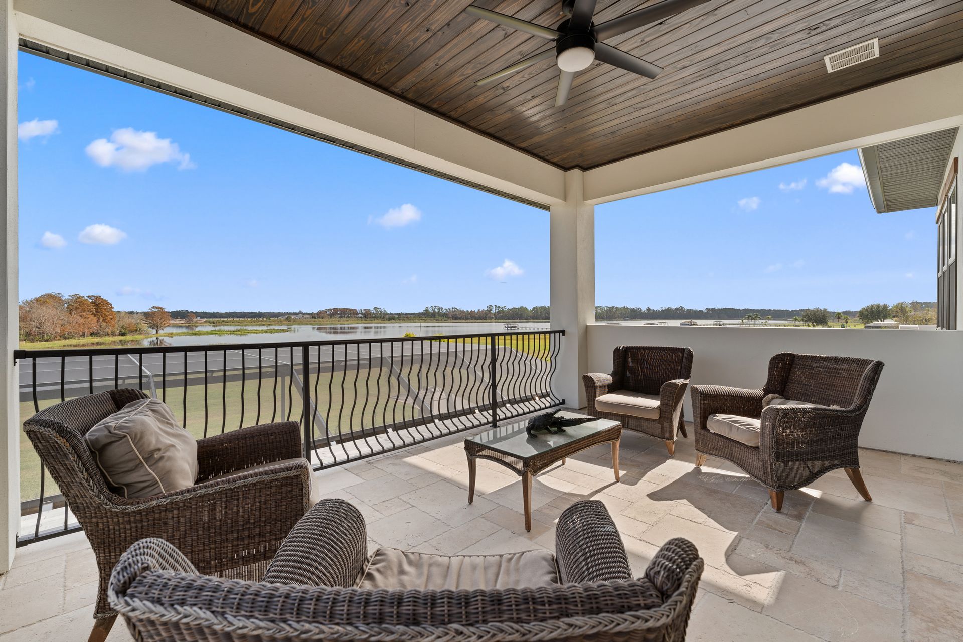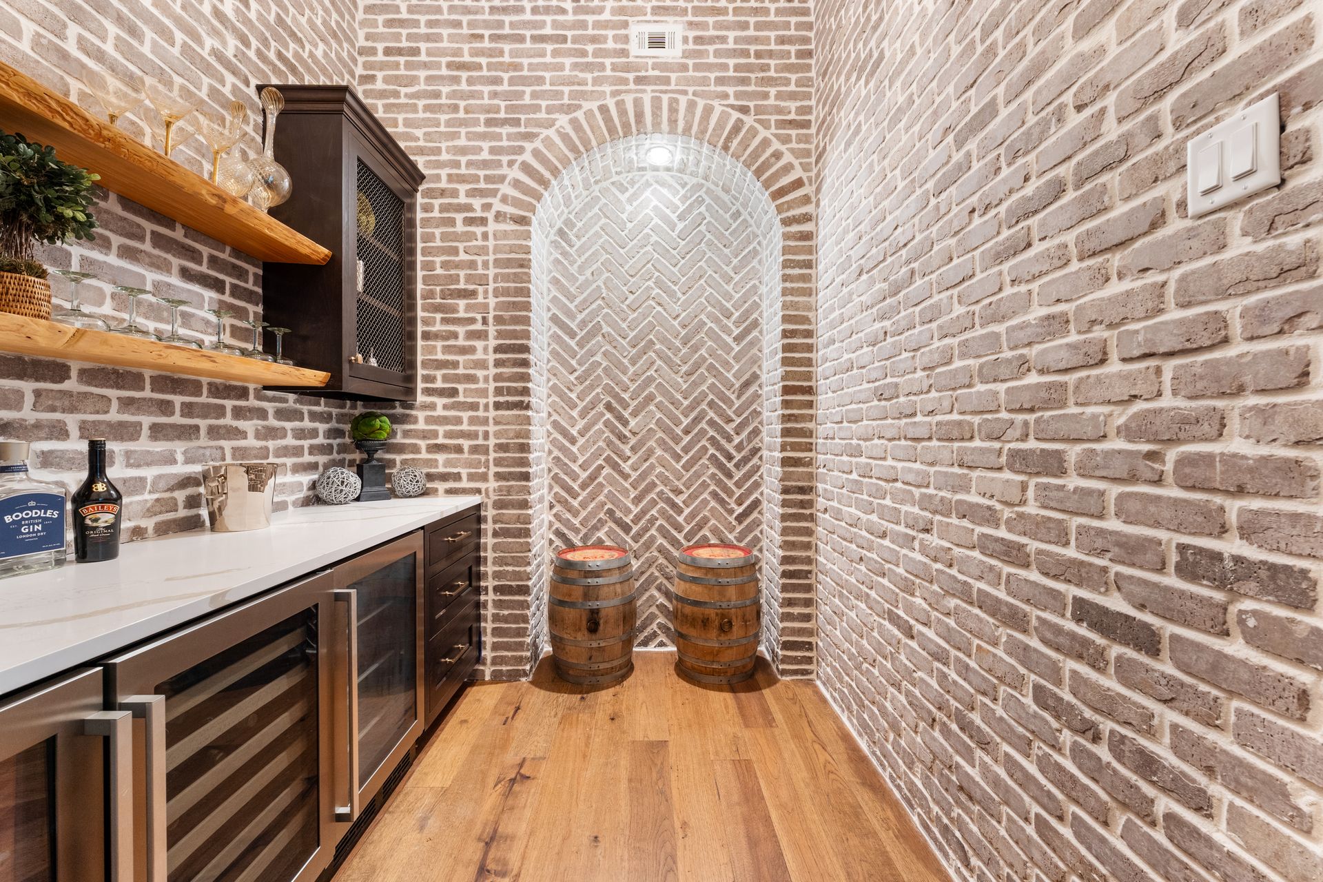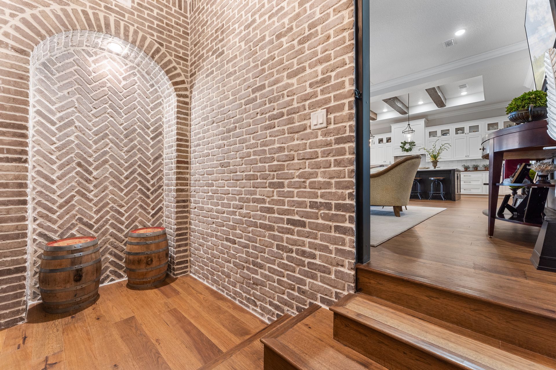 The primary suite boasts lake and pool views and a spa-like ensuite with a stand-alone tub, walk-in shower, and enormous walk-in closet. Nearby, a white-washed brick wine cellar sets the perfect atmosphere for your finest collection. The home also features a theater room, ideal for movie nights with plush seating and stylish décor. The additional bedroom with ensuite on the main floor, along with the loft and balcony upstairs, offers panoramic views of the pool and lake.