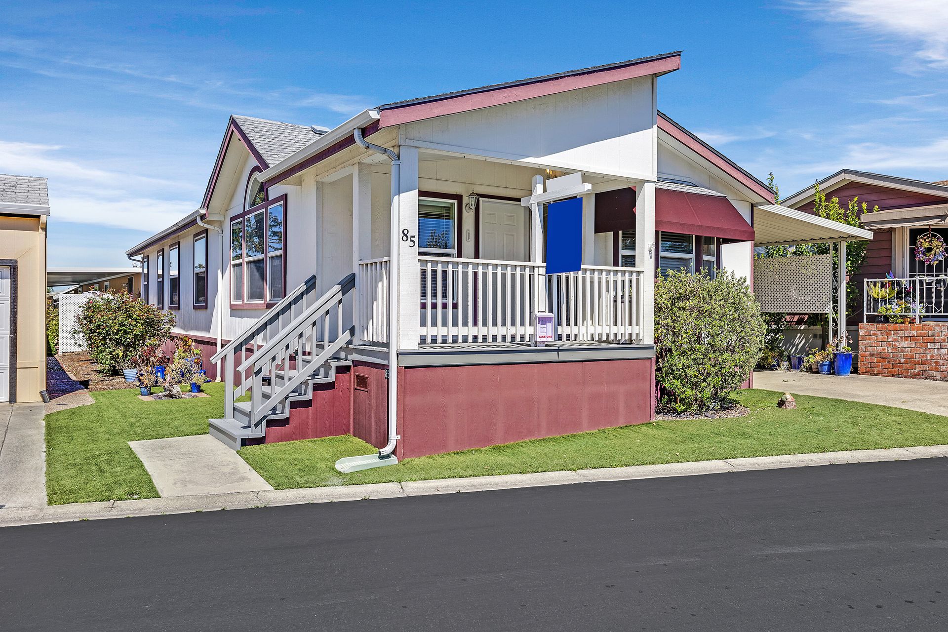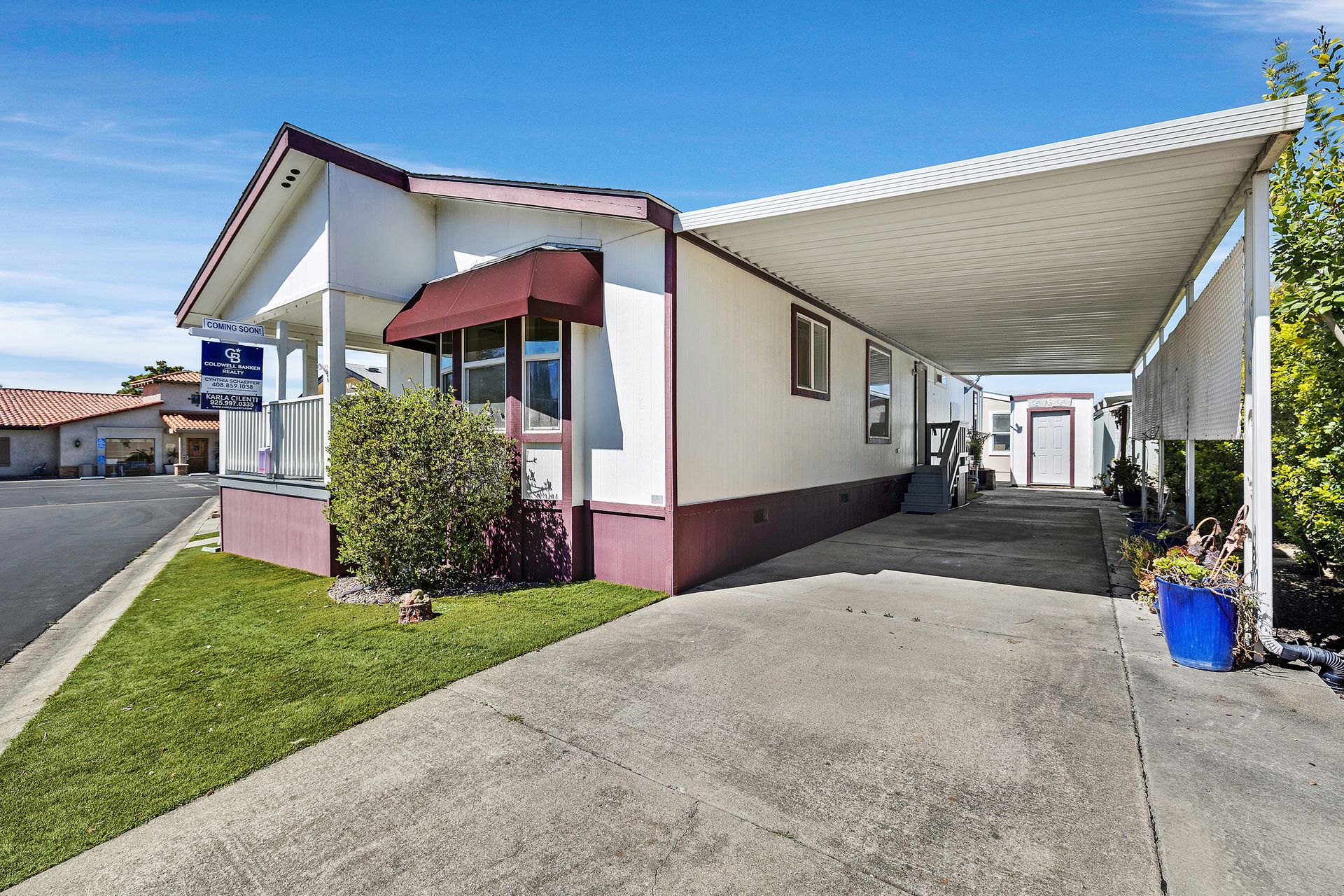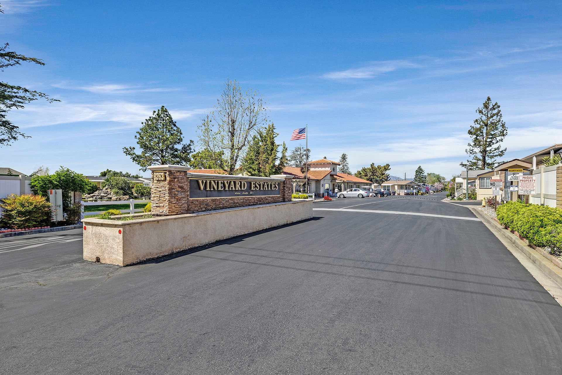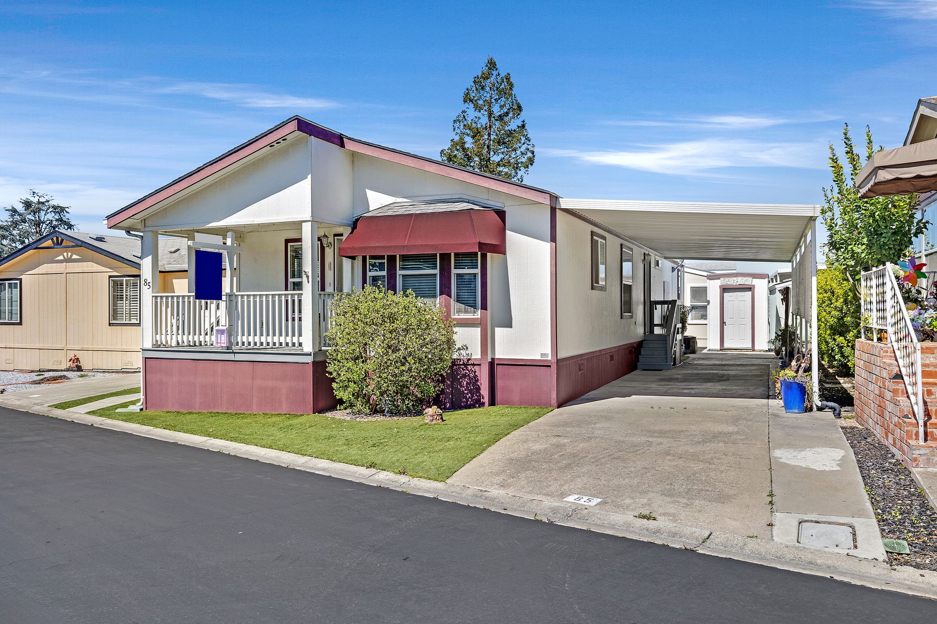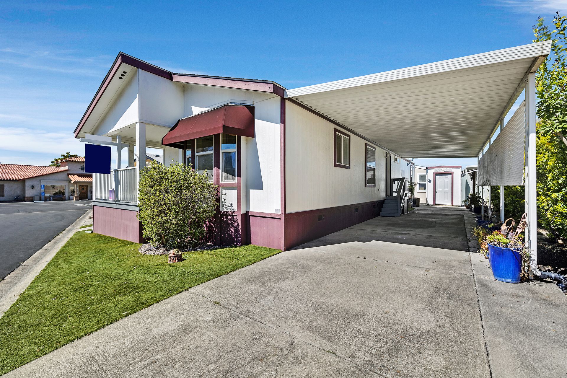 Located in desirable Vineyard Estates (senior 55+ park), this home beckons you with its timeless charm and modern conveniences. Built in 2003, this "Karsten" home offers approximately 1,308 square feet, with an inviting covered porch, spacious living room/dining room, a kitchen with a gas range and lots of cabinets and a space for a table to enjoy your morning coffee or tea. The home has high ceilings and dual-paned windows throughout, complemented by wood-look vinyl flooring that adds both elegance and durability. The three bedrooms have newer carpeting and the entire home has been freshly painted. In the primary suite, luxuriate in the spa-like ambiance of the soaking tub, accompanied by dual sinks and a stall shower, ideal for unwinding after a long day. The walk-in closet provides ample storage space. Enjoy an inside laundry with cabinetry and access to the carport with tandem parking. The park offers pool/spa, walking trails by a lovely pond and a clubhouse with places to relax, enjoy a game of pool or ping pong or read.