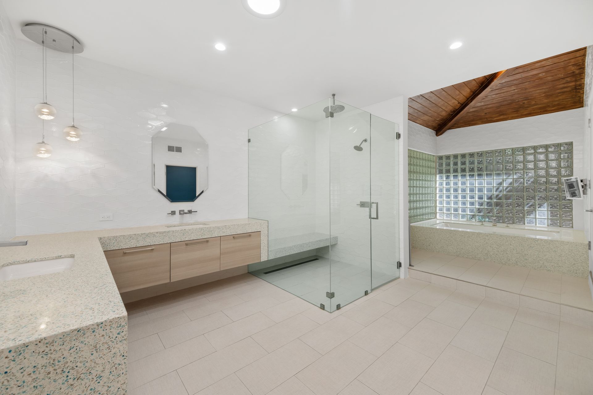 The huge (1,500 sq.ft.) primary suite is a romantic retreat with a fireplace, separate sitting area, view balcony, room-sized walk-in closet, and an all-new modern bath complete with dry sauna and soaking tub. The property is completely gated and private with controlled access, including an elevator from the three-car garage to the main living space.