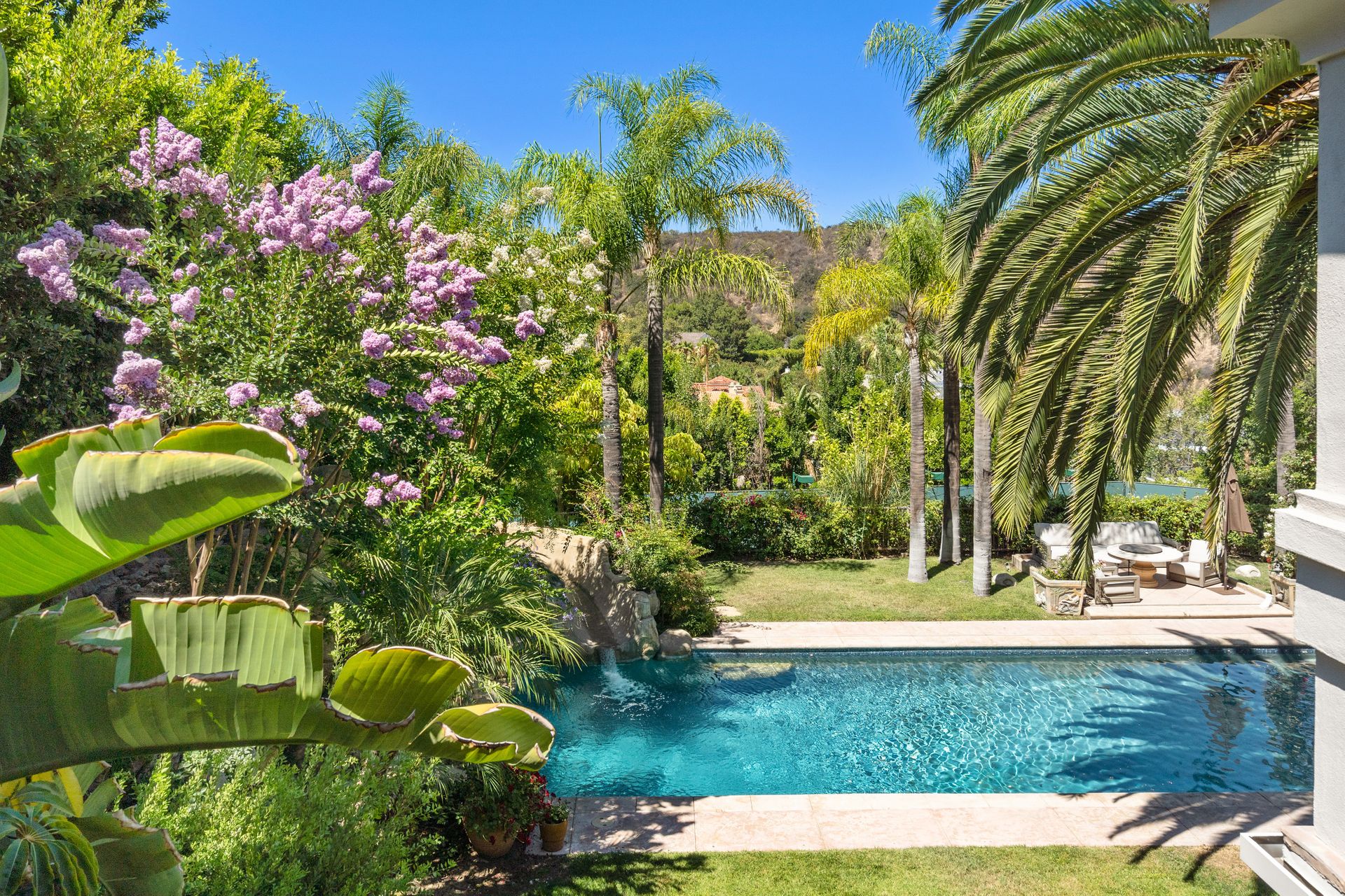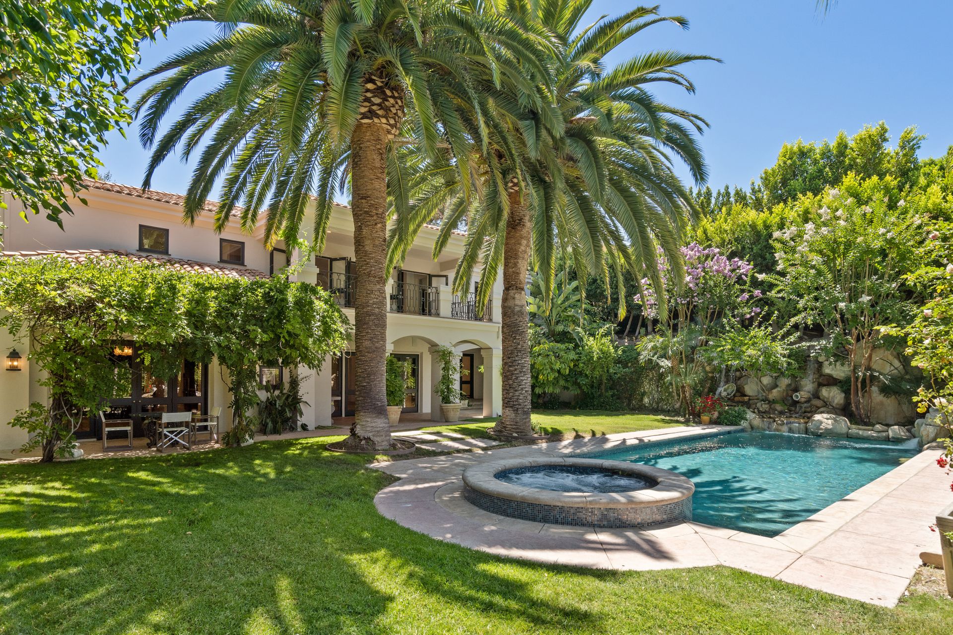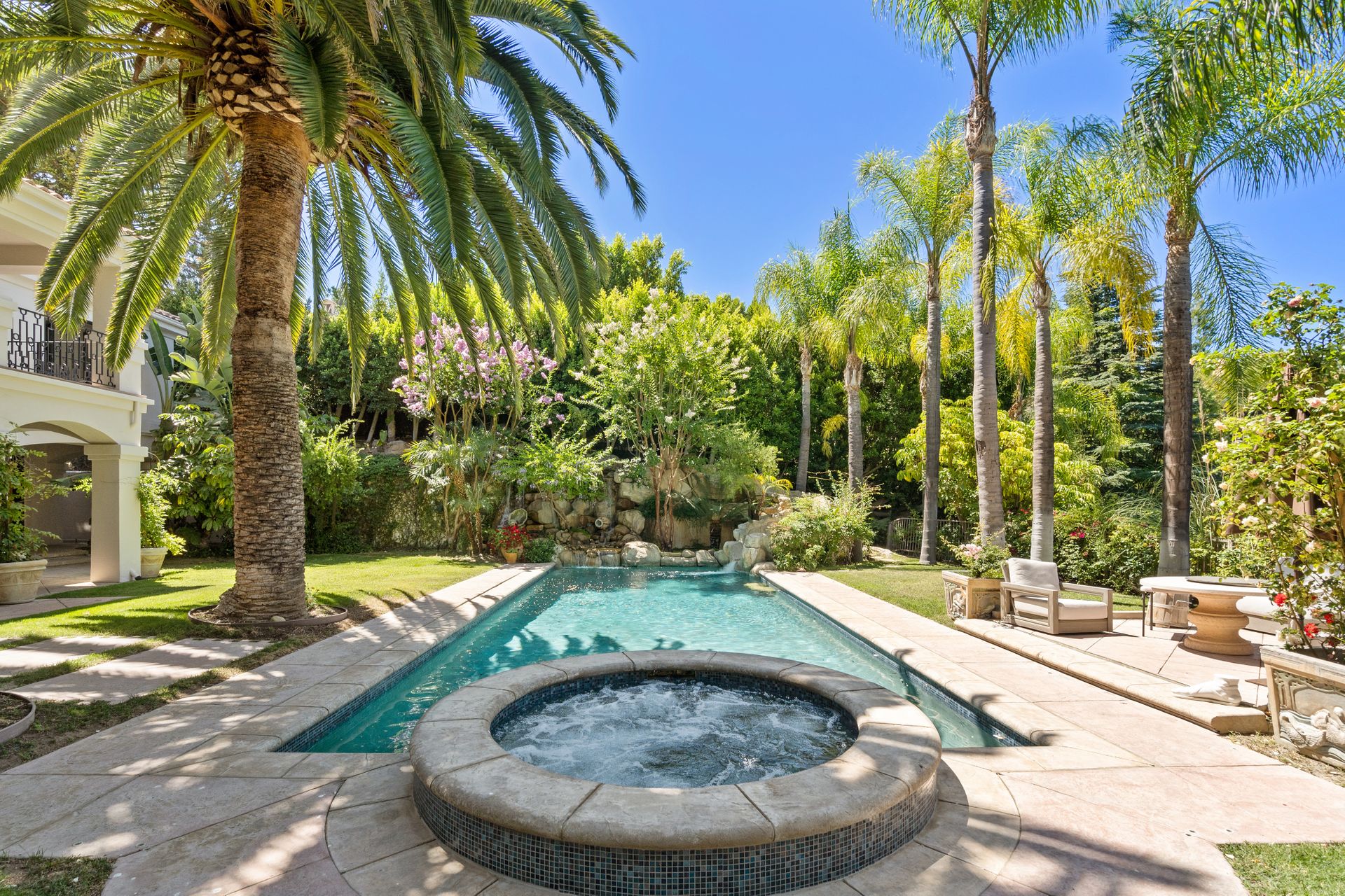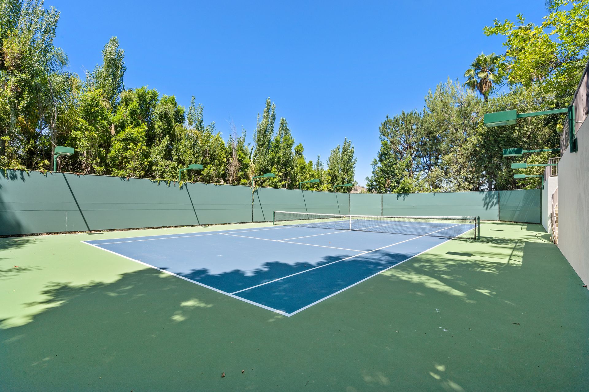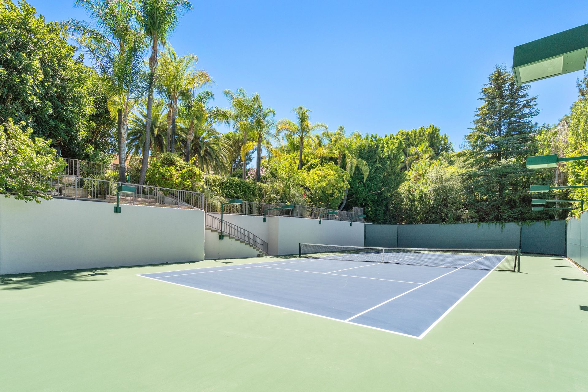 Luxurious six-bedroom, seven-bathroom estate for lease in the coveted Mulholland Estates. Set privately behind a 24/7 security-monitored gate, this home has 6,965 sf of living space on a 26,165 sf lot with a pool and private tennis court positioned from North to South. Mediterranean in design, the ground floor includes a large formal living room and fireplace, a formal dining room with seating for 12, a butler's pantry, a built-in wet bar, a generously sized family room that includes a fireplace, a maid's room with an en-suite bathroom, an office, and a powder room. The grand kitchen is outfitted with a large stone island, professional-grade Wolf range and grill, and plenty of space for breakfast seating. The master suite is located upstairs with a large fireplace and french doors opening to the balcony overlooking a beautiful and private yard. Dual en-suite bathrooms with walk-in closets flank the master bedroom and include amenities such as a soaking tub, steam shower, spacious vanities, industrial-grade safe and water closets. Three additional guest bedrooms complete the second floor with en-suite baths and a library. High ceilings and newly refinished hardwood floors create a warm and inviting experience throughout the home. A gorgeous and tranquil backyard is complete with a pool, hot tub, water slide, and waterfall. The private tennis court has recently been resurfaced and upgraded. Three-car garage. Mulholland Estates offers additional tennis courts, pickle, basketball, squash, and racquetball courts, as well as a playground and community center.
