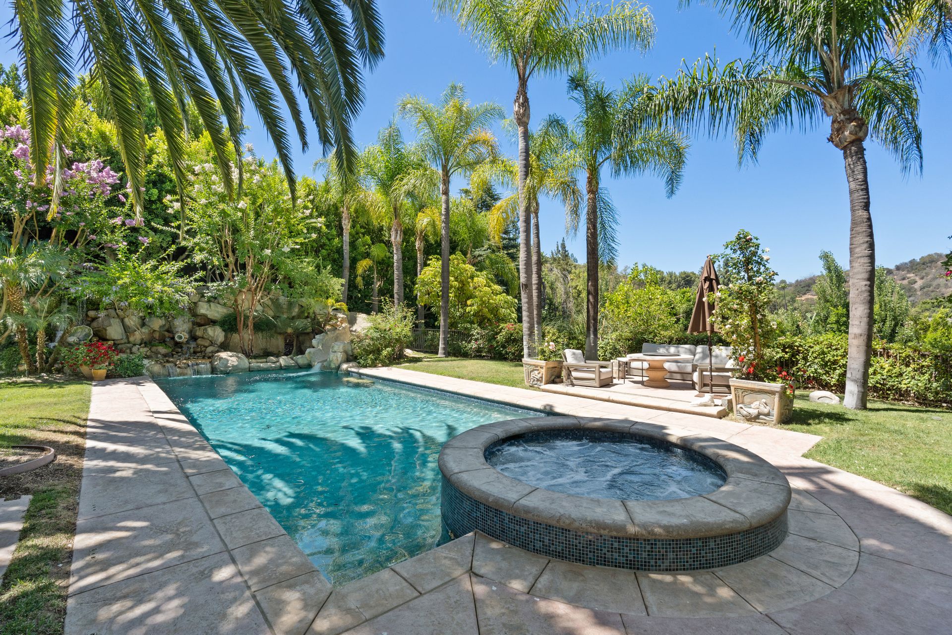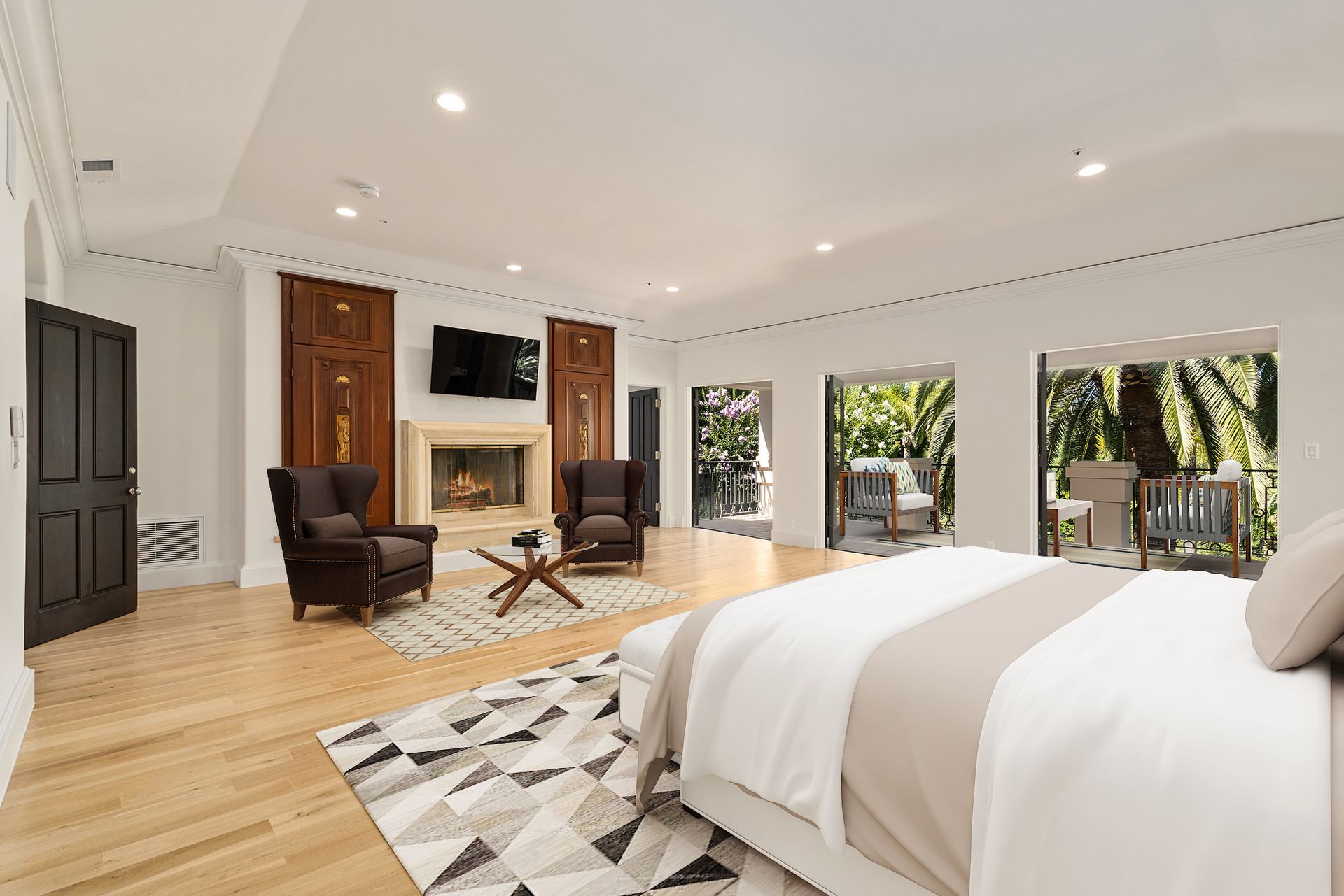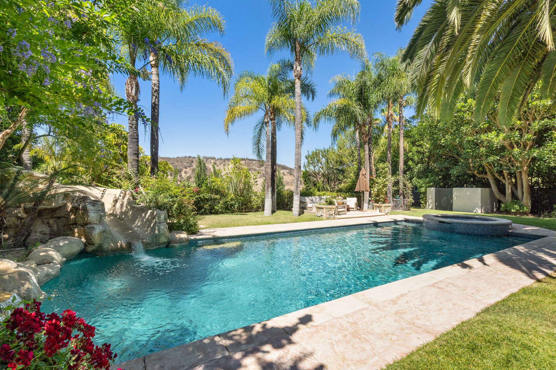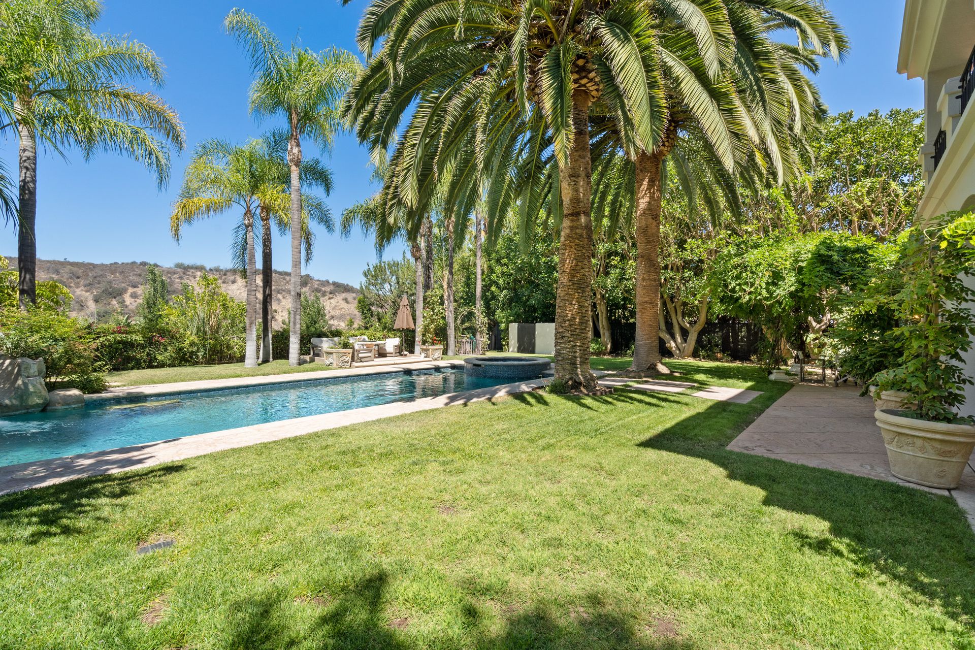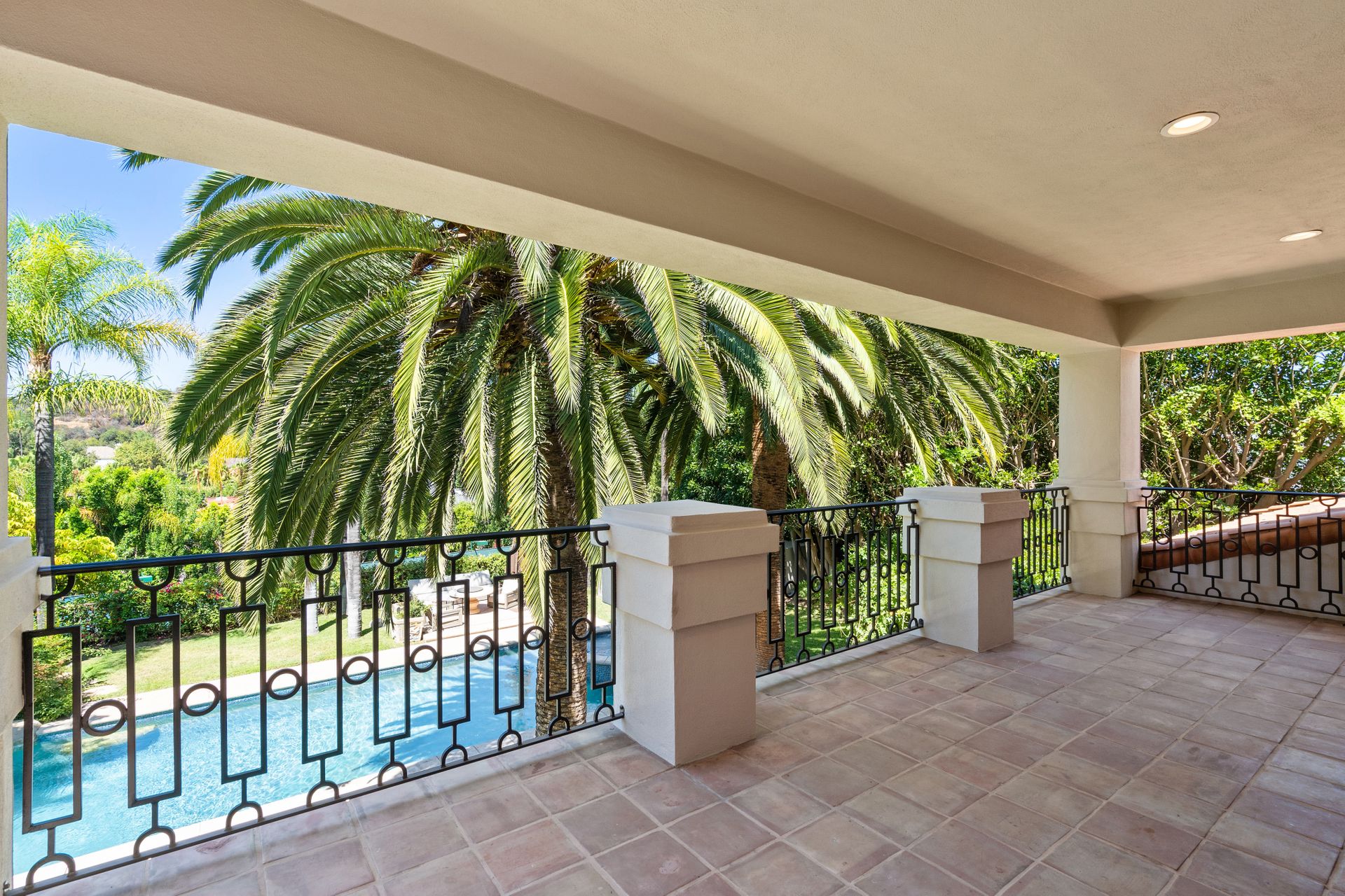 Luxurious six-bedroom, seven-bathroom estate for lease in the coveted Mulholland Estates. Set privately behind a 24/7 security-monitored gate, this home has 6,965 sf of living space on a 26,165 sf lot with a pool and private tennis court positioned from North to South. Mediterranean in design, the ground floor includes a large formal living room and fireplace, a formal dining room with seating for 12, a butler's pantry, a built-in wet bar, a generously sized family room that includes a fireplace, a maid's room with an en-suite bathroom, an office, and a powder room. The grand kitchen is outfitted with a large stone island, professional-grade Wolf range and grill, and plenty of space for breakfast seating. The master suite is located upstairs with a large fireplace and french doors opening to the balcony overlooking a beautiful and private yard. Dual en-suite bathrooms with walk-in closets flank the master bedroom and include amenities such as a soaking tub, steam shower, spacious vanities, industrial-grade safe and water closets. Three additional guest bedrooms complete the second floor with en-suite baths and a library. High ceilings and newly refinished hardwood floors create a warm and inviting experience throughout the home. A gorgeous and tranquil backyard is complete with a pool, hot tub, water slide, and waterfall. The private tennis court has recently been resurfaced and upgraded. Three-car garage. Mulholland Estates offers additional tennis courts, pickle, basketball, squash, and racquetball courts, as well as a playground and community center.