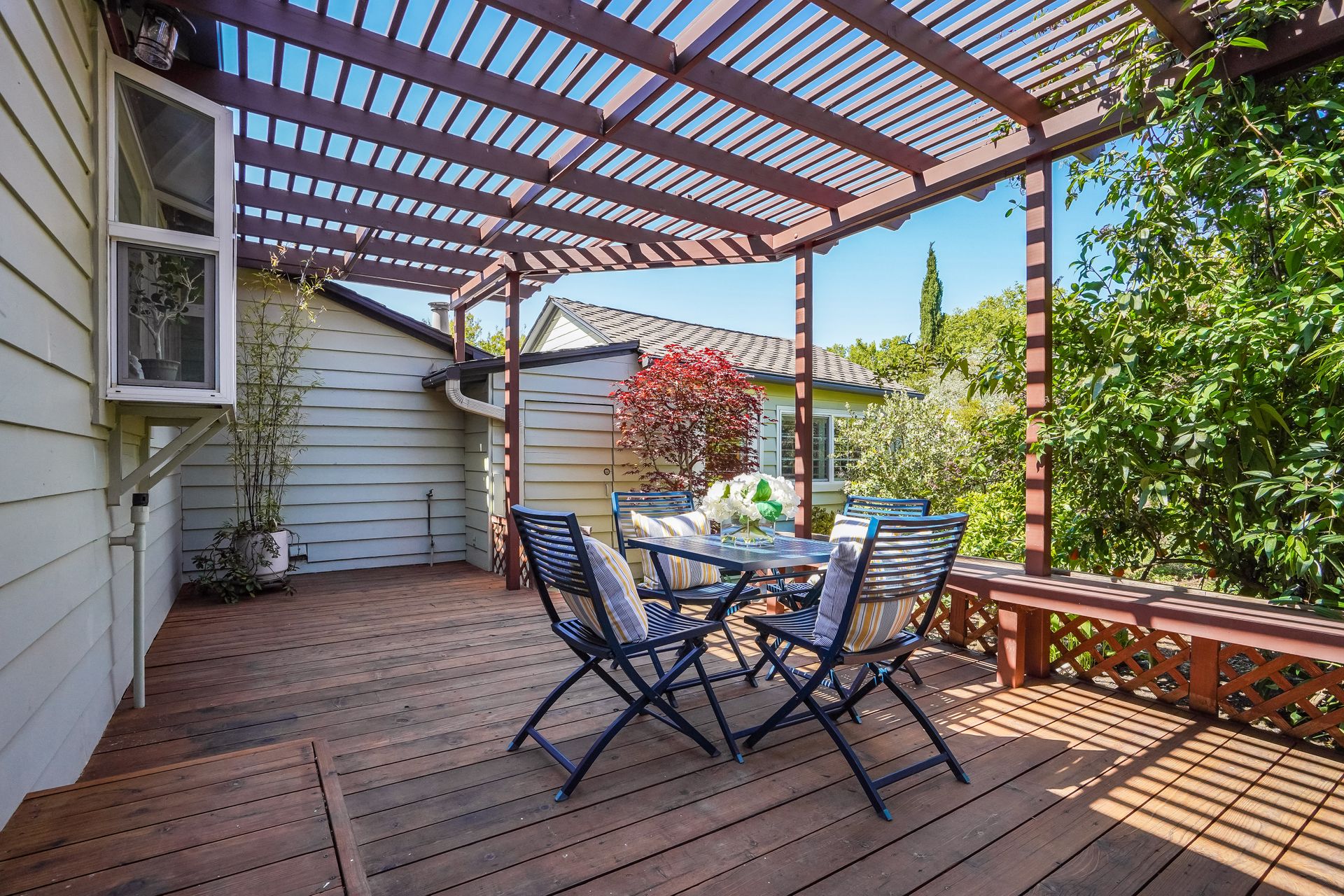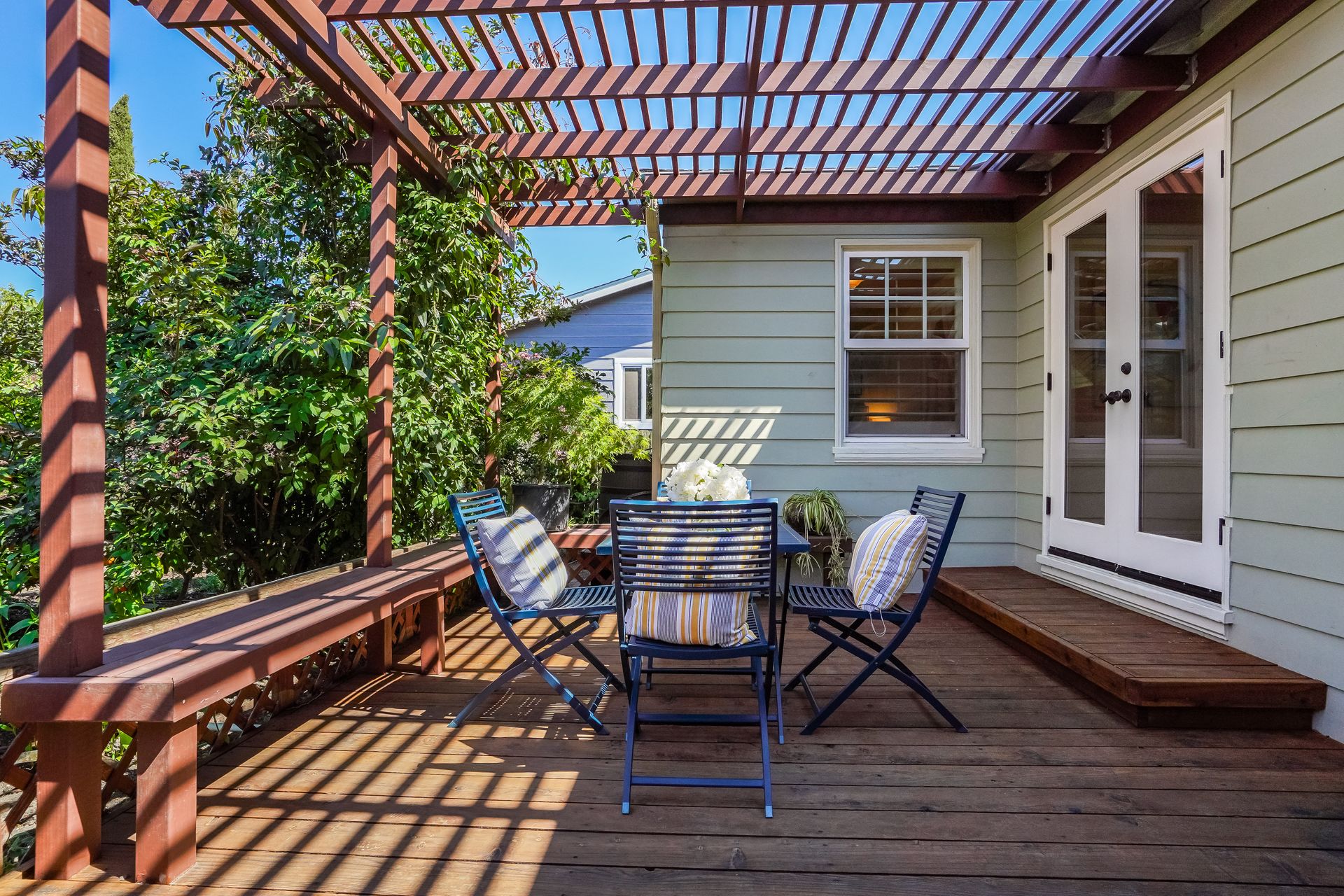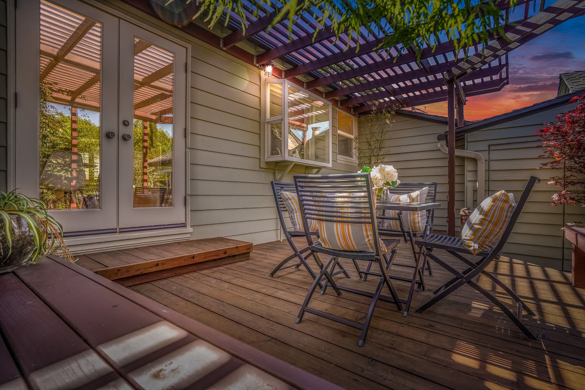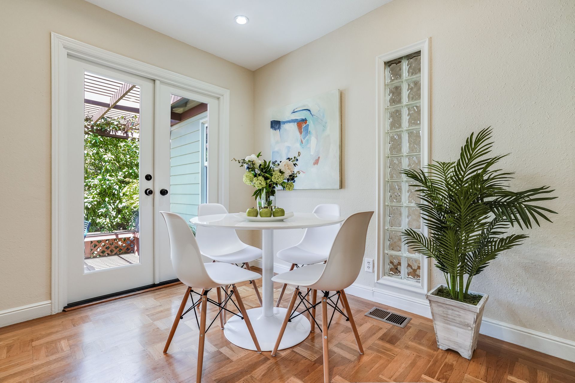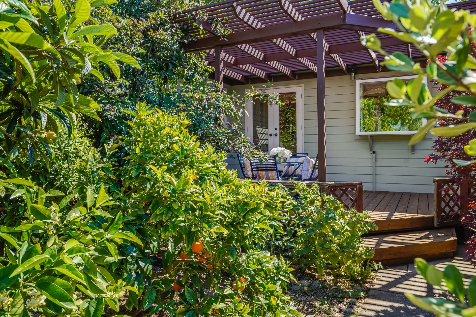 The formal dining room has French doors that lead out to a deck overlooking the private and peaceful backyard with fruit trees. You'll find a bay window overlooking the front yard in the master bedroom. The bathrooms are tastefully upgraded, featuring Italian Porcelanosa tile.
