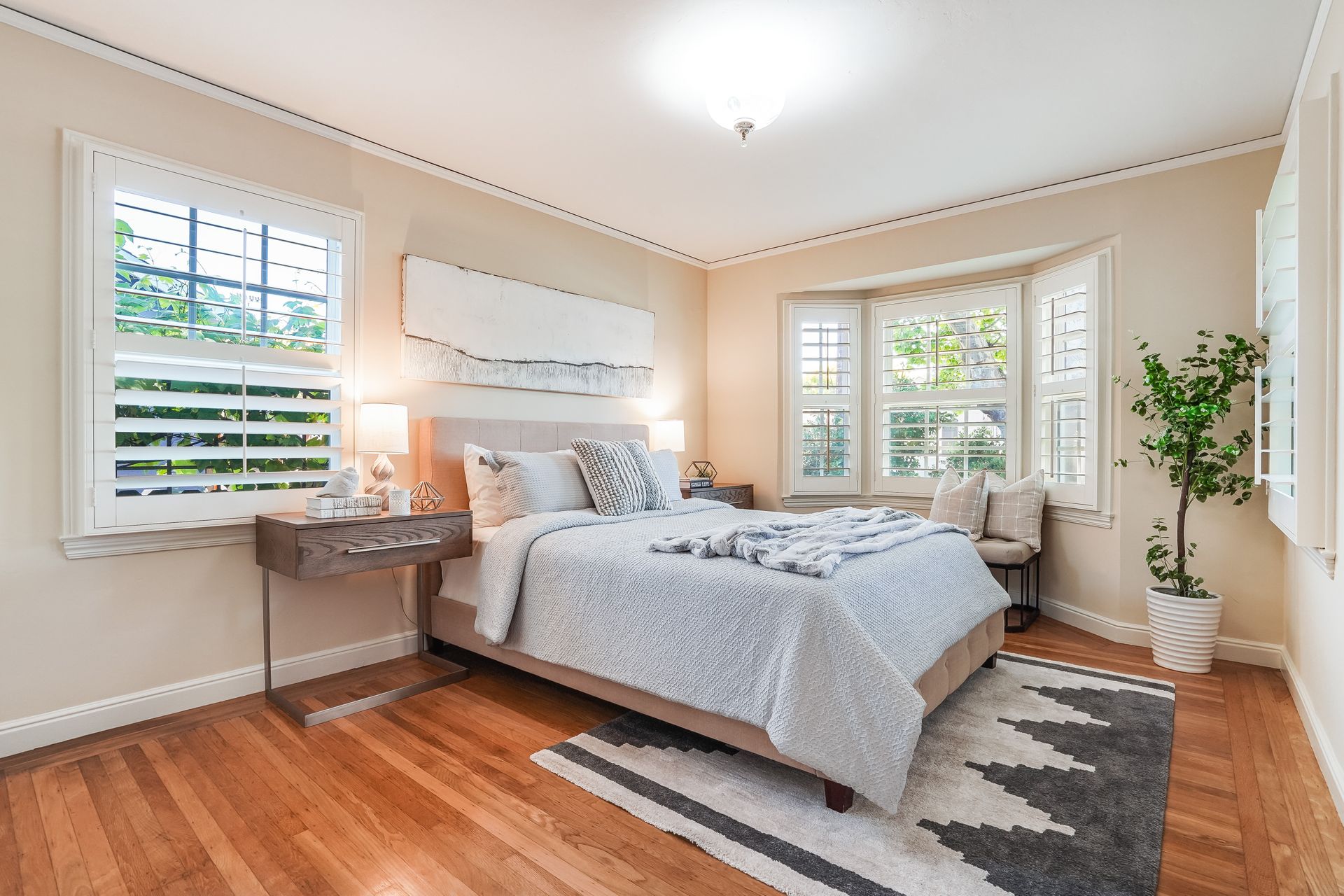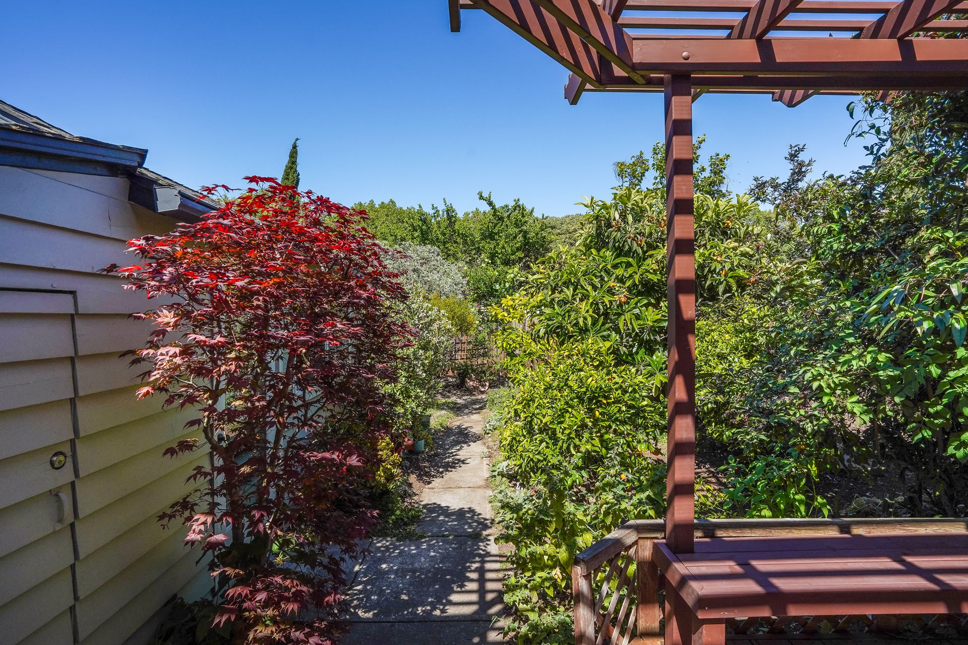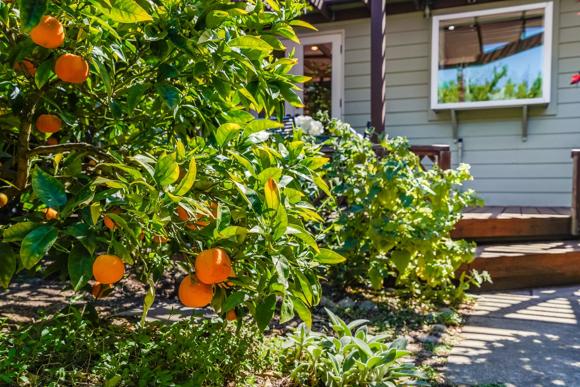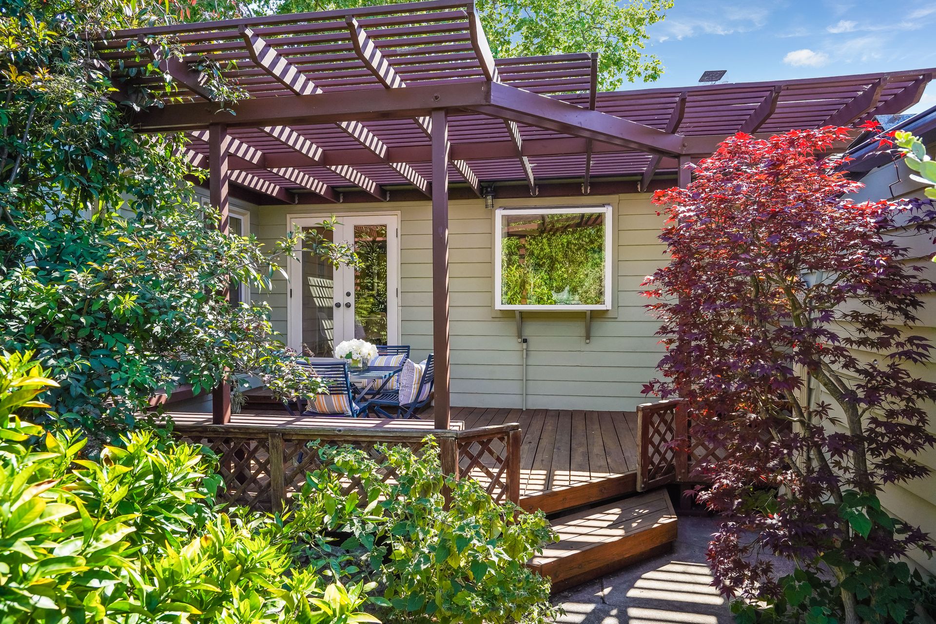 The formal dining room has French doors that lead out to a deck overlooking the private and peaceful backyard with fruit trees. You'll find a bay window overlooking the front yard in the master bedroom. The bathrooms are tastefully upgraded, featuring Italian Porcelanosa tile.