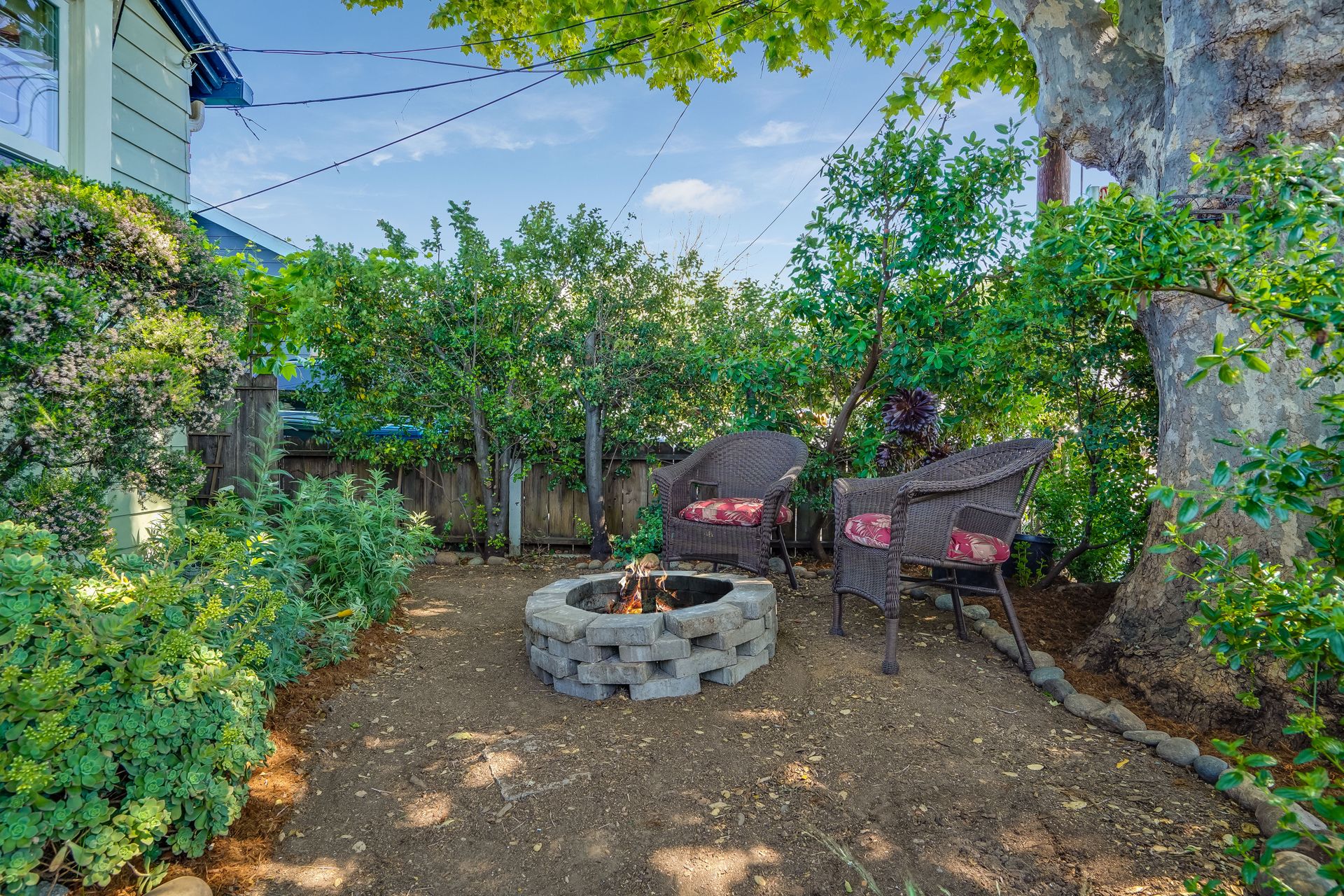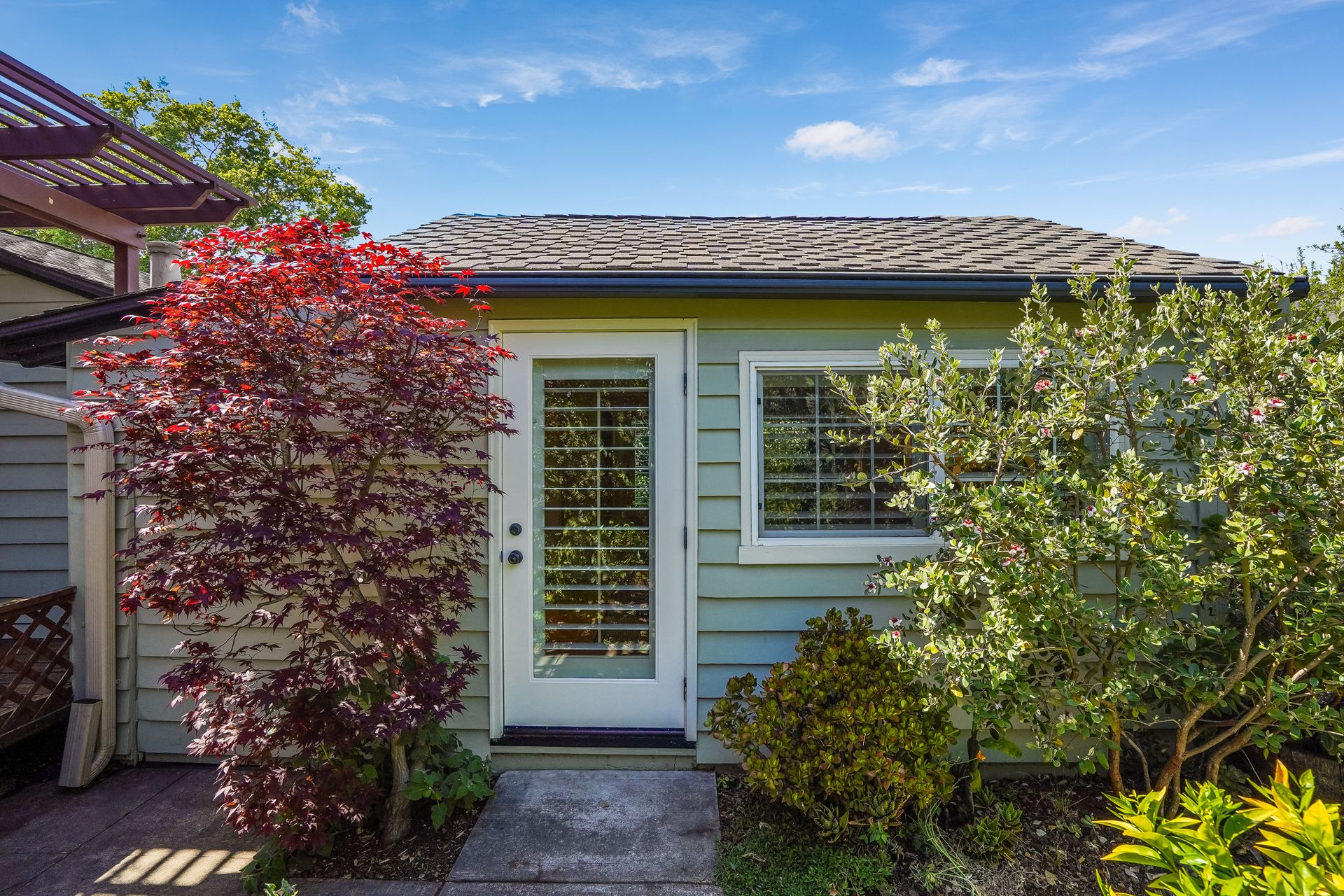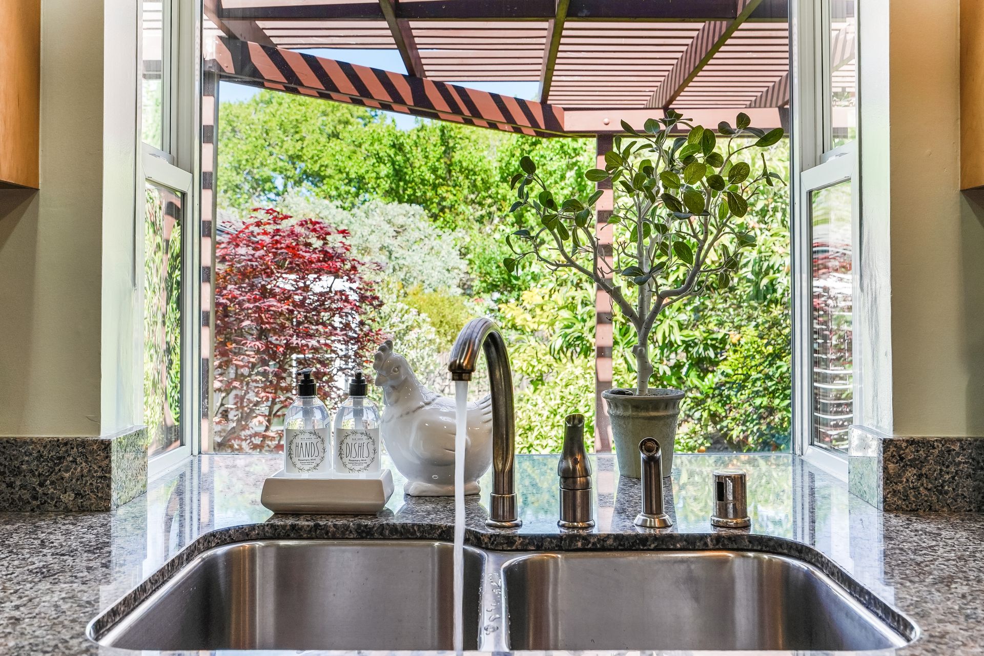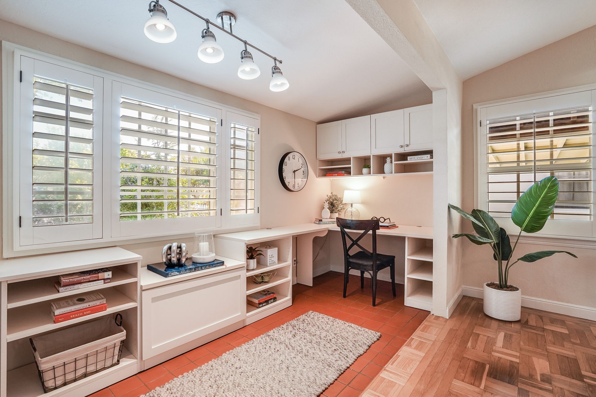 Enter into the large living room featuring vaulted ceilings and a corner wood-burning fireplace. There's a convenient office nook with built-ins off the living room. The kitchen features granite counters, stainless steel appliances and a garden window overlooking the lush backyard.