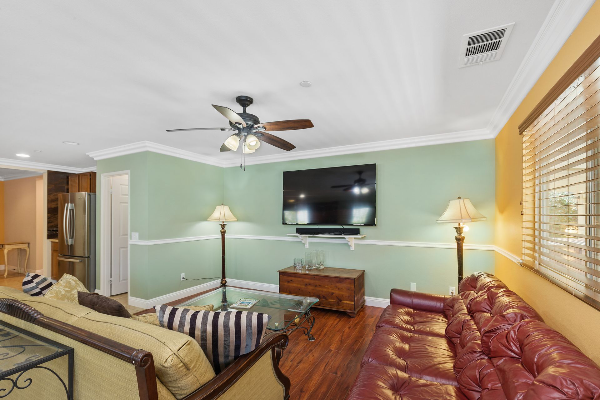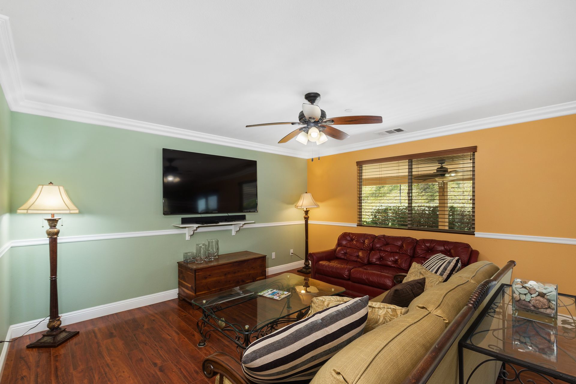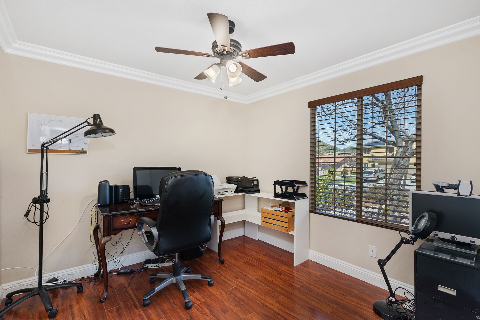 The primary bedroom features a spacious walk-in closet and en-suite bathroom, including a separate tub and shower. There are ceiling fans in each room, an indoor laundry room and crown molding throughout. The three-car finished garage is ideal for storage or make part of it an at-home gym!